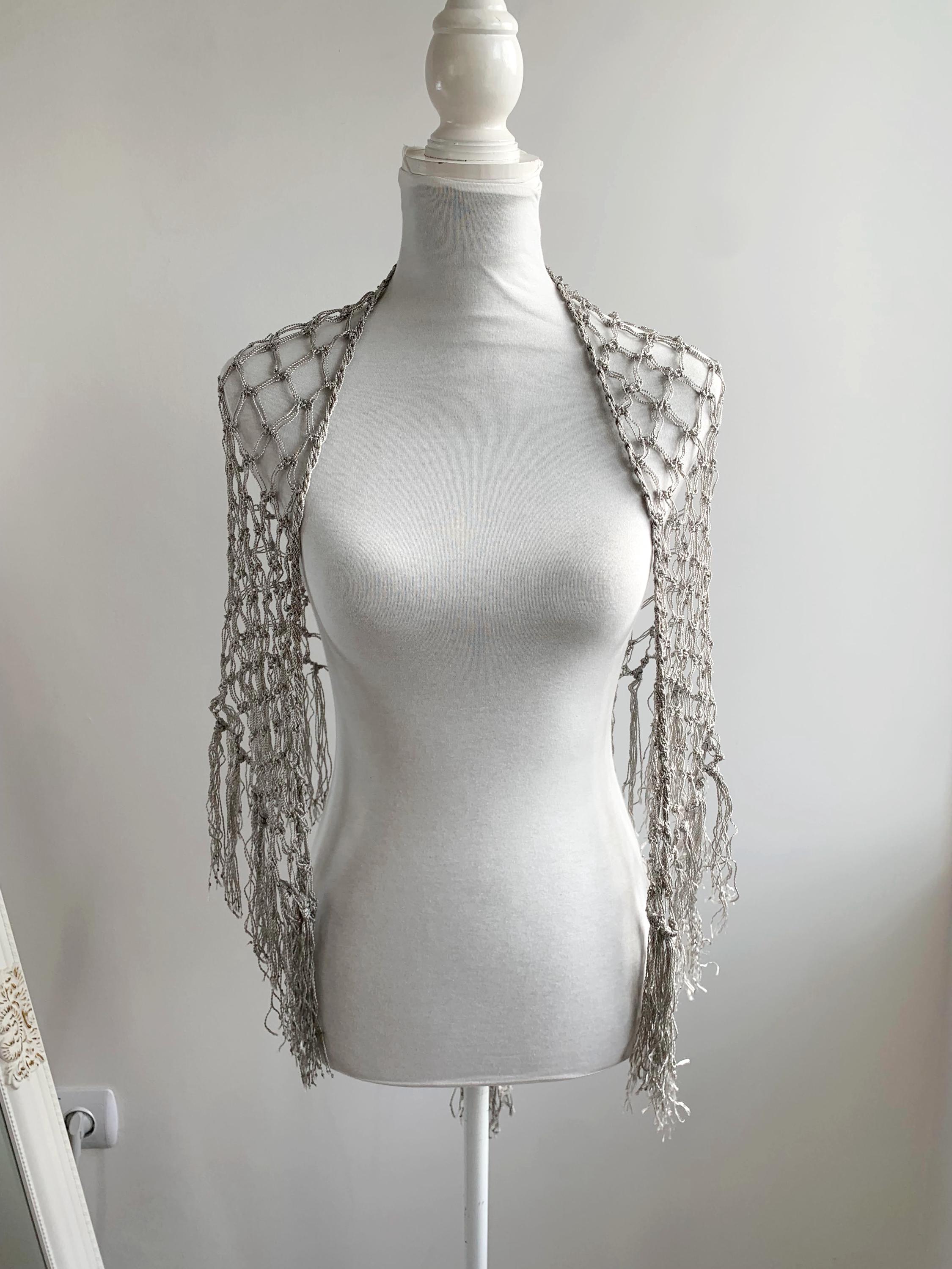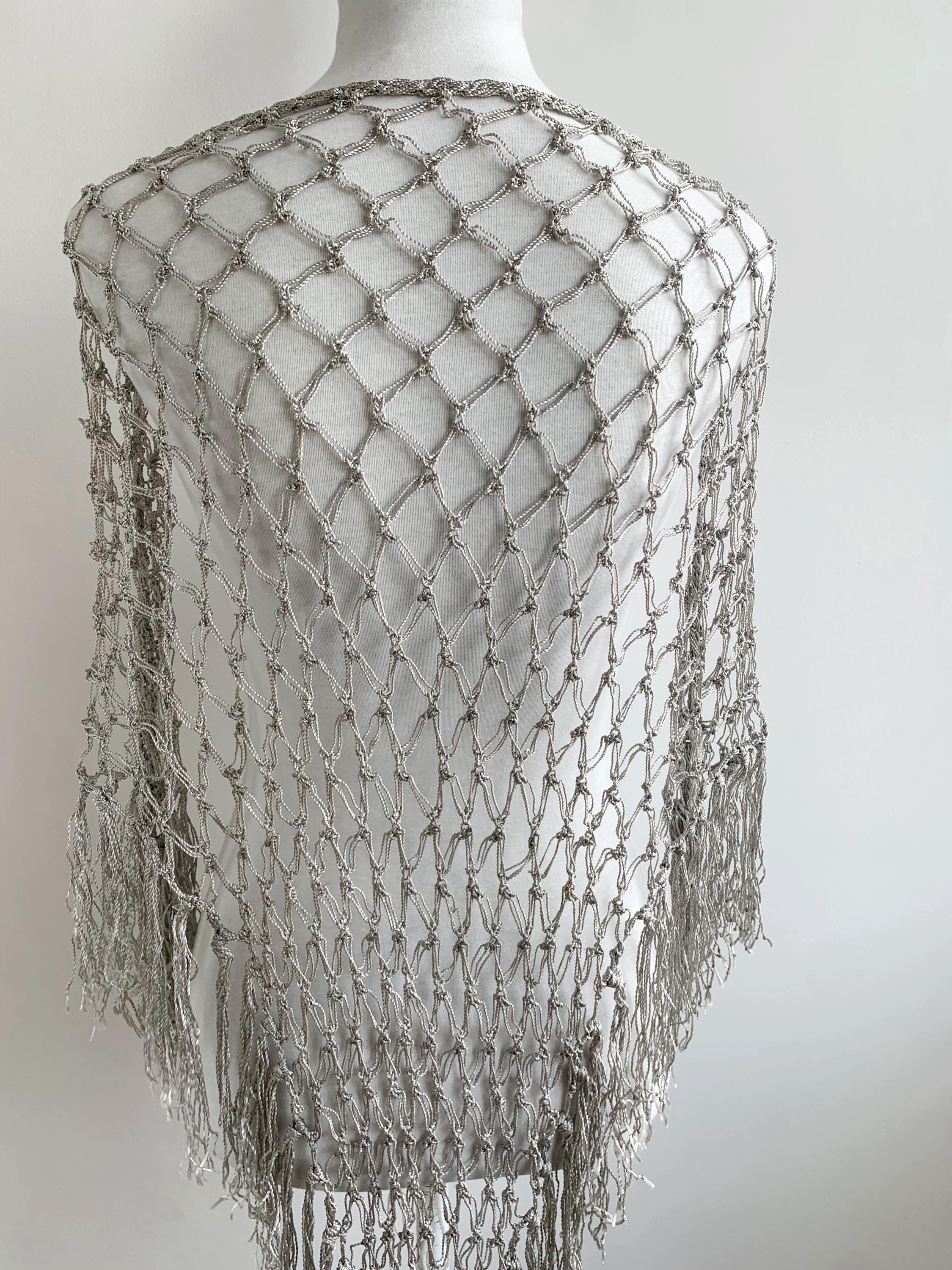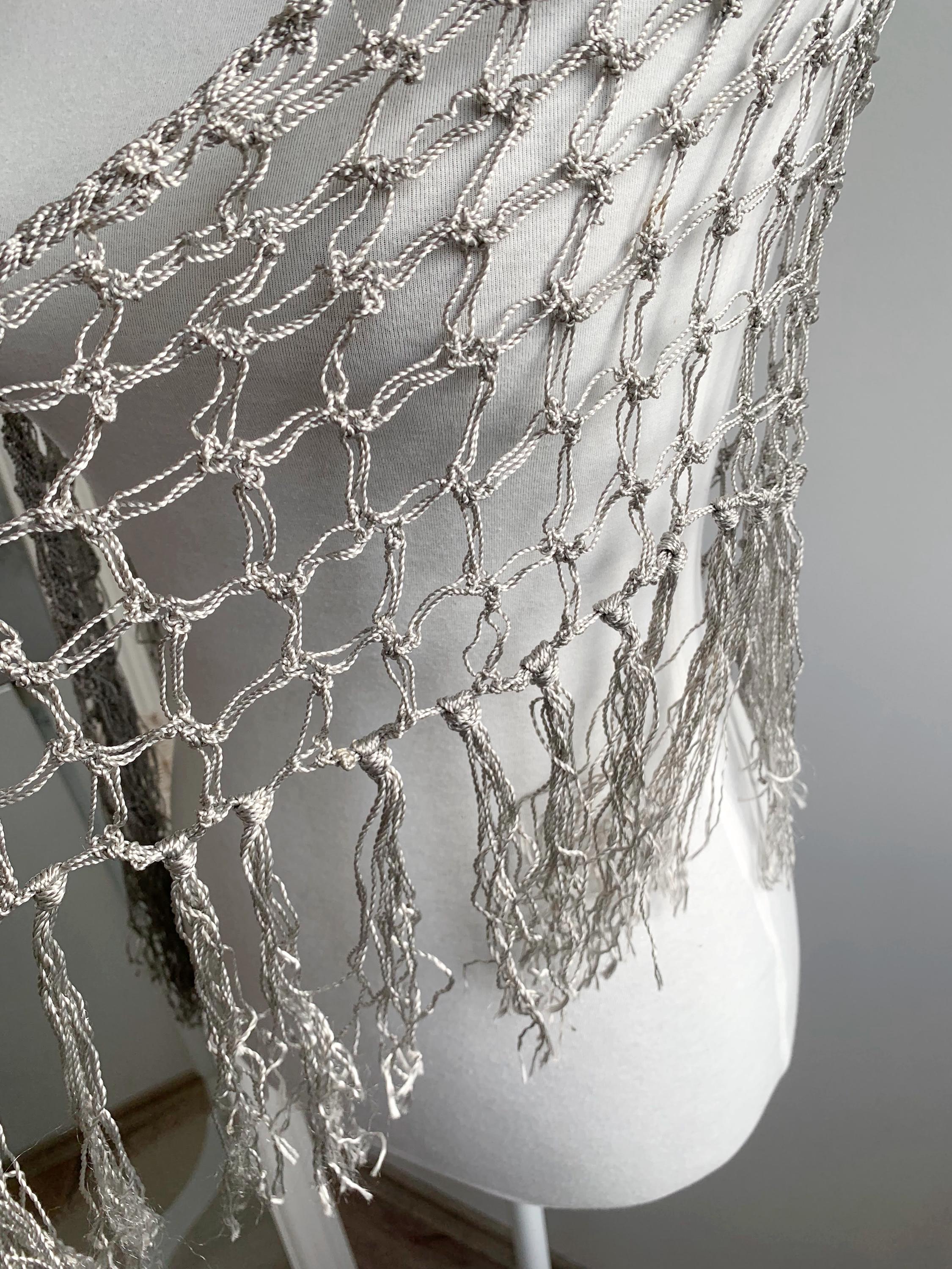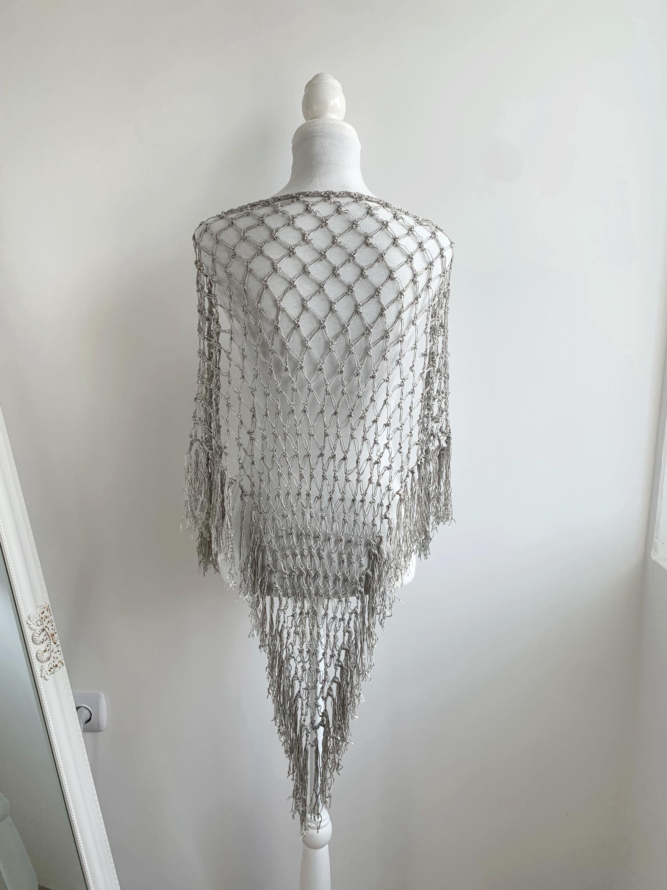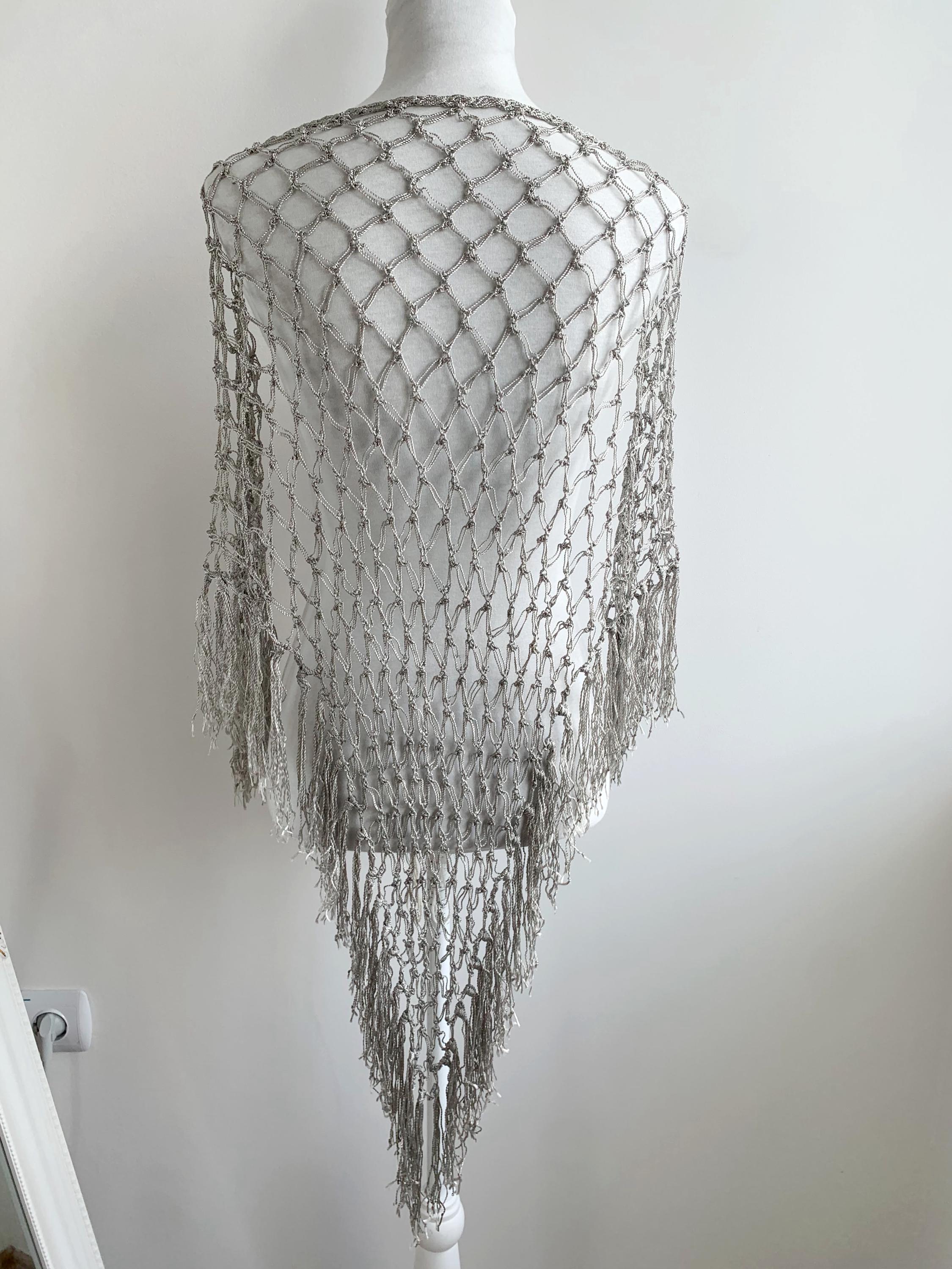 Beautiful 20's style silver grey shiny viscose silk solomon's knot crochet shawl with tassels. This lovely elegant silky shawl is perfect for a Great Gatsby party outfit or as a part of your wedding guest outfit. This fringed lace crochet shawl has delicate shine when exposed to light. It is made of silky shiny viscose thread in silver grey color which perfectly catches the light. Beautiful silver net shawl for a perfect vintage look.