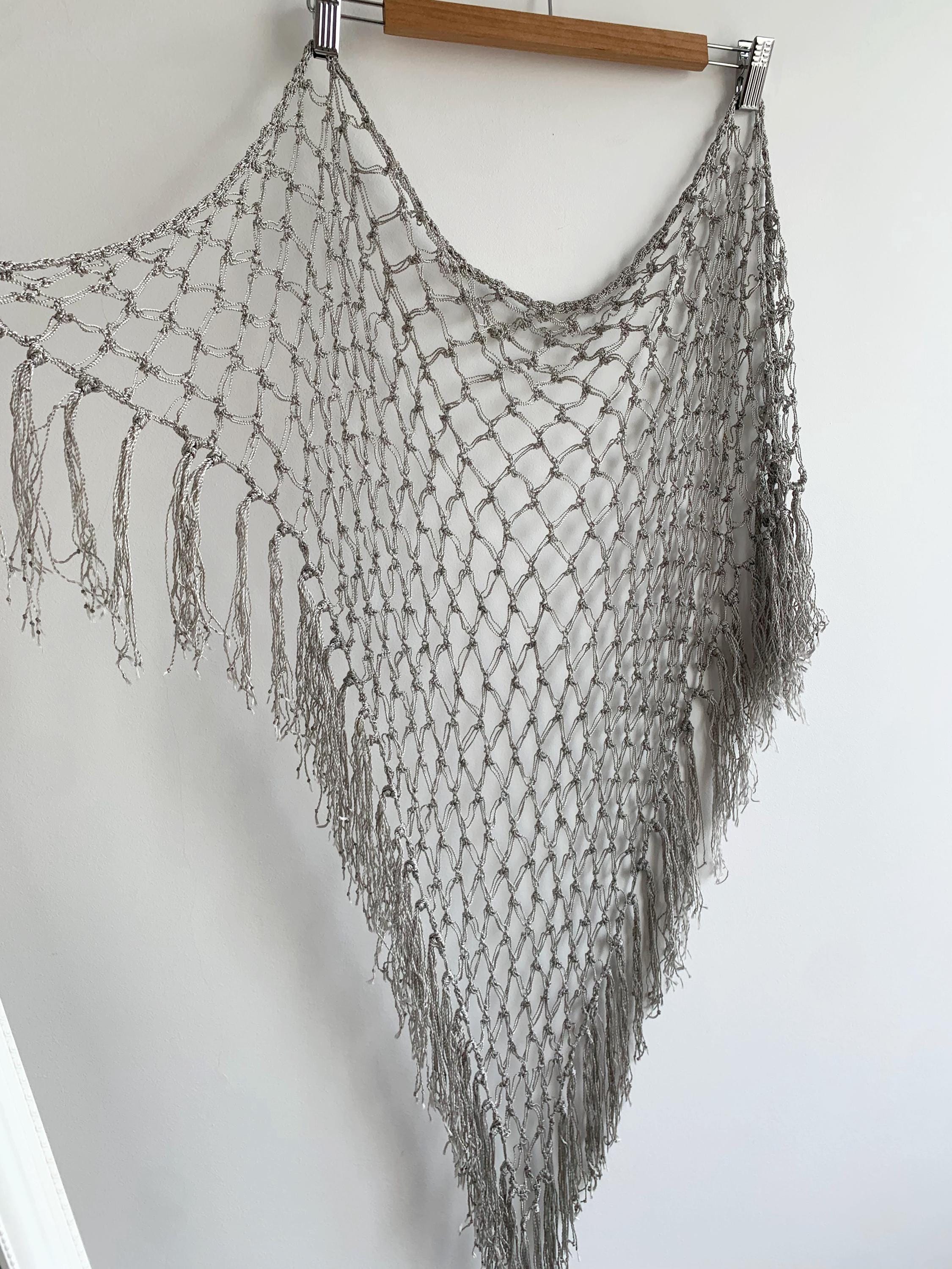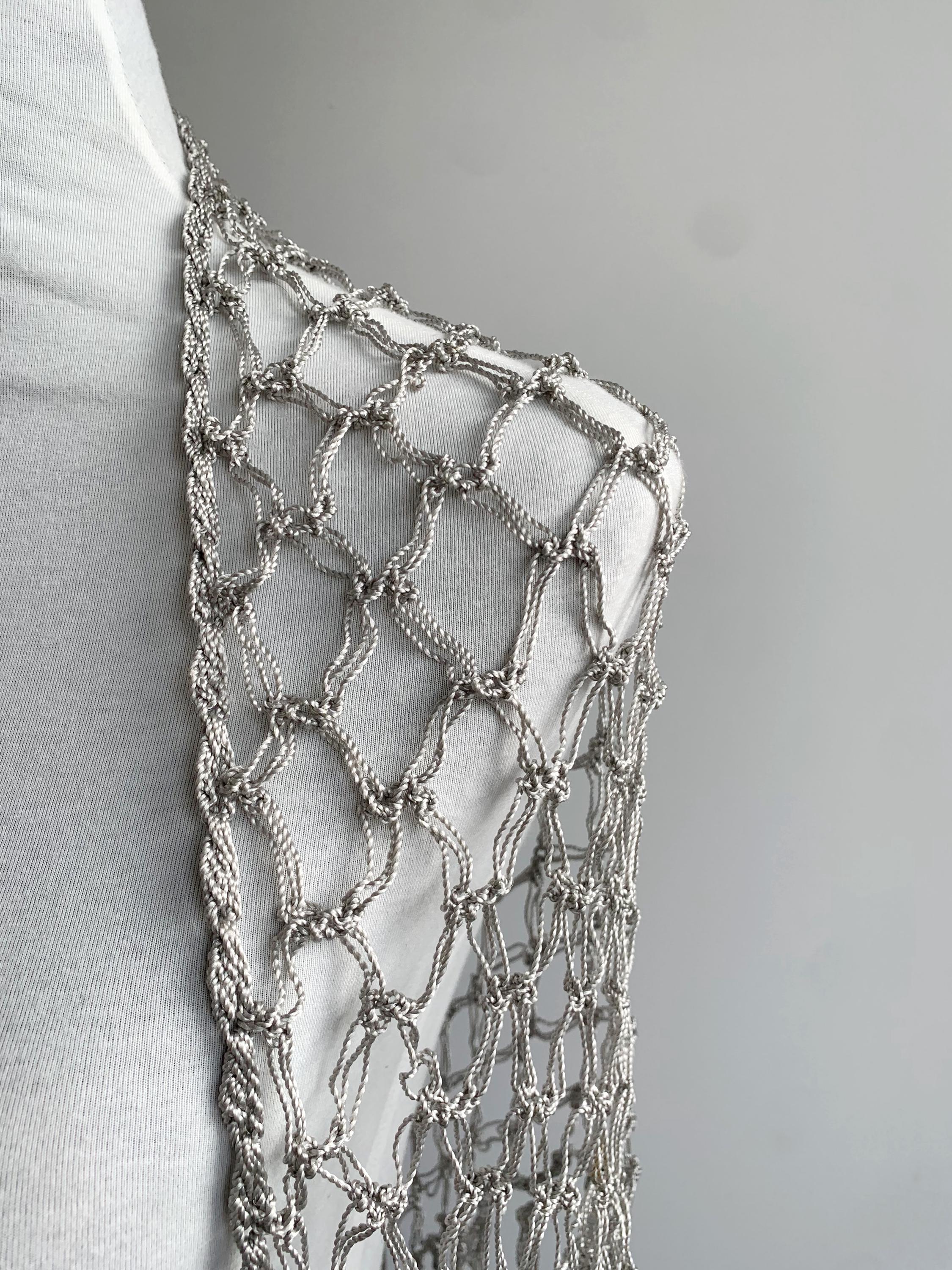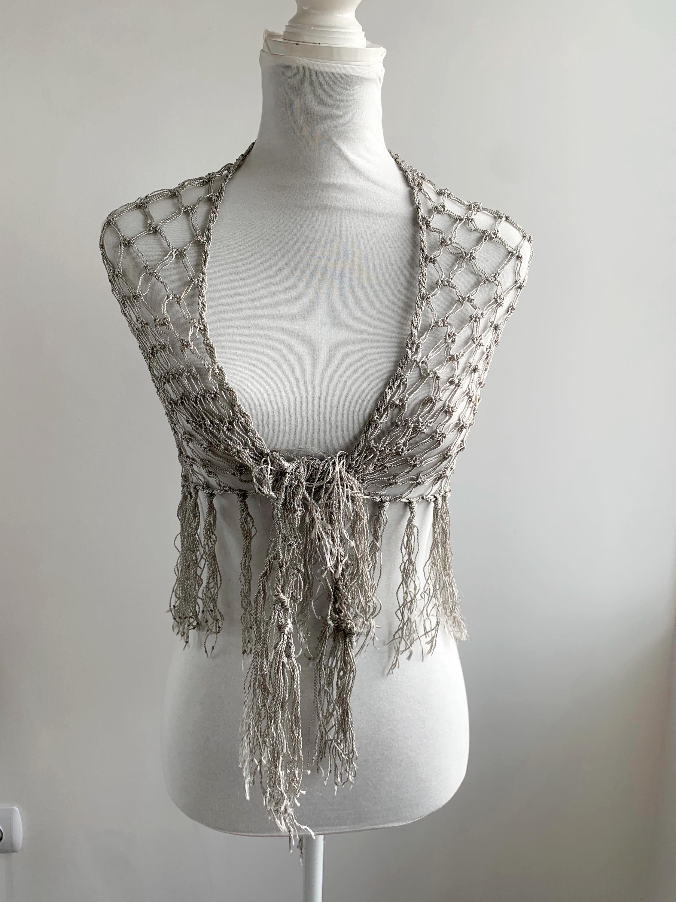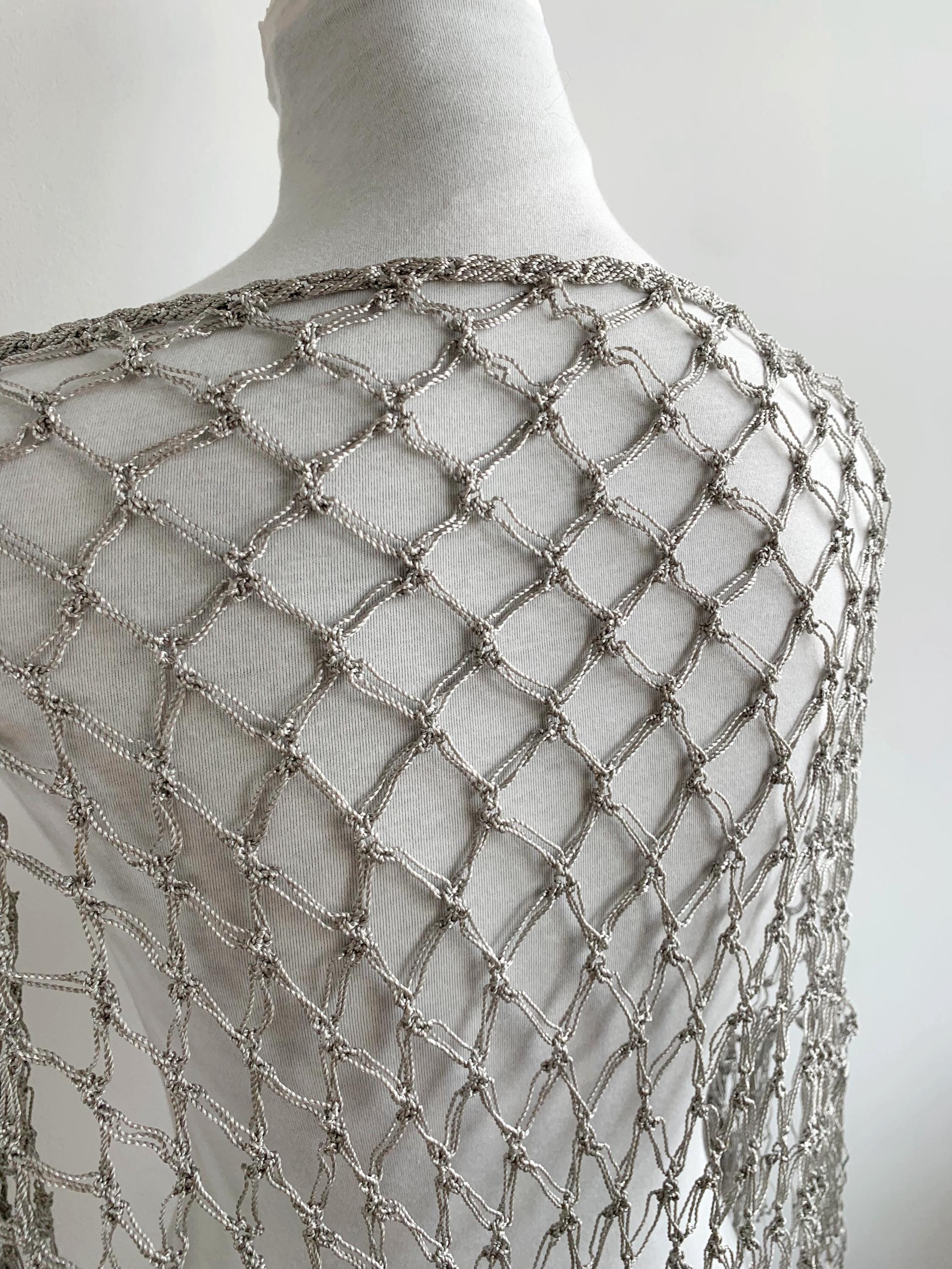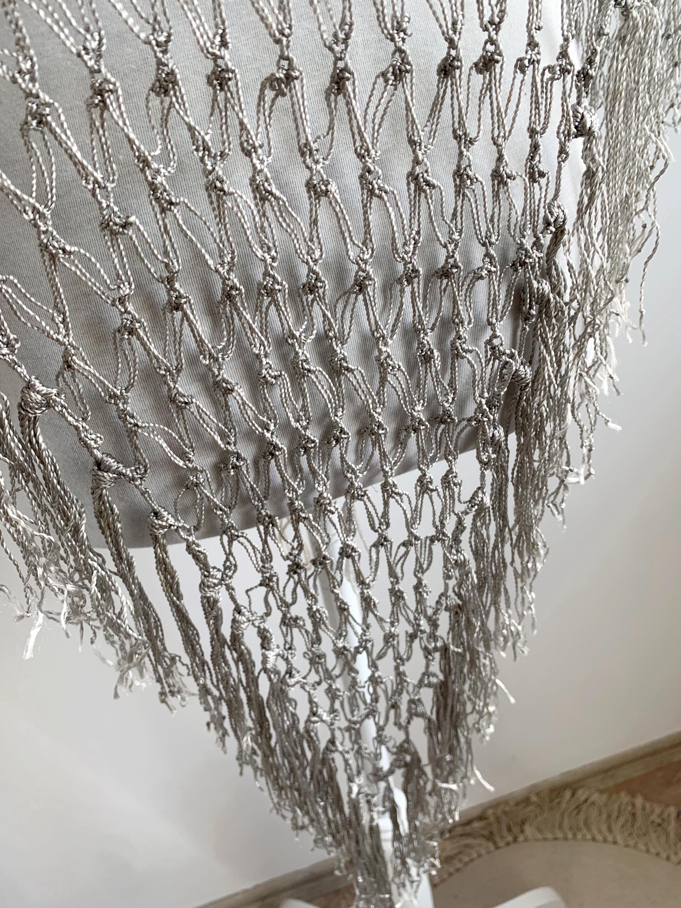 Beautiful 20's style silver grey shiny viscose silk solomon's knot crochet shawl with tassels. This lovely elegant silky shawl is perfect for a Great Gatsby party outfit or as a part of your wedding guest outfit. This fringed lace crochet shawl has delicate shine when exposed to light. It is made of silky shiny viscose thread in silver grey color which perfectly catches the light. Beautiful silver net shawl for a perfect vintage look.