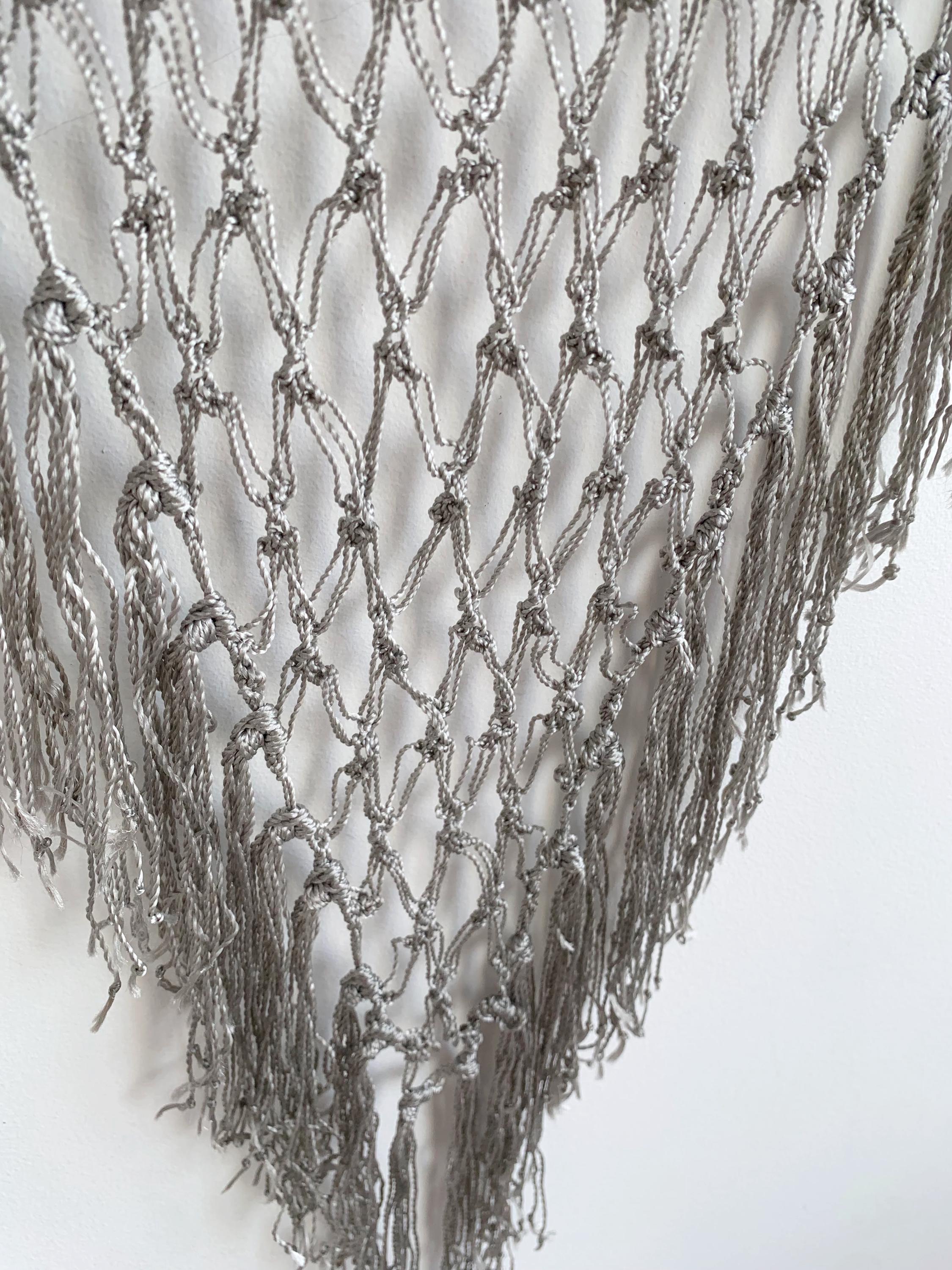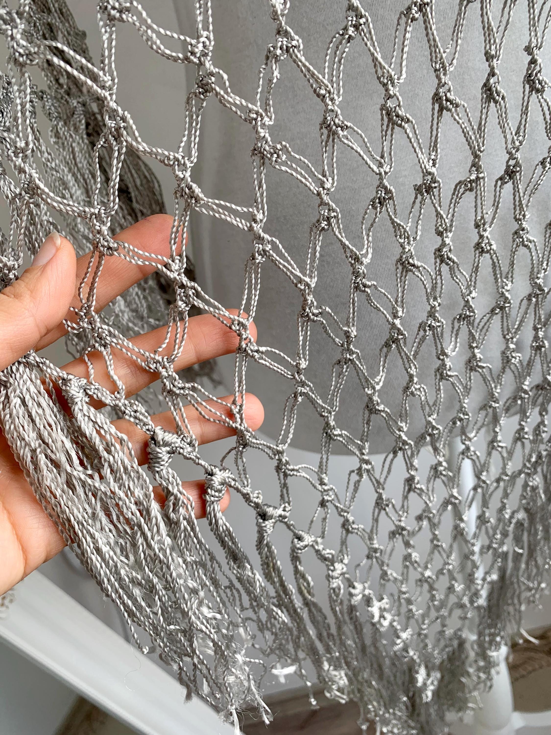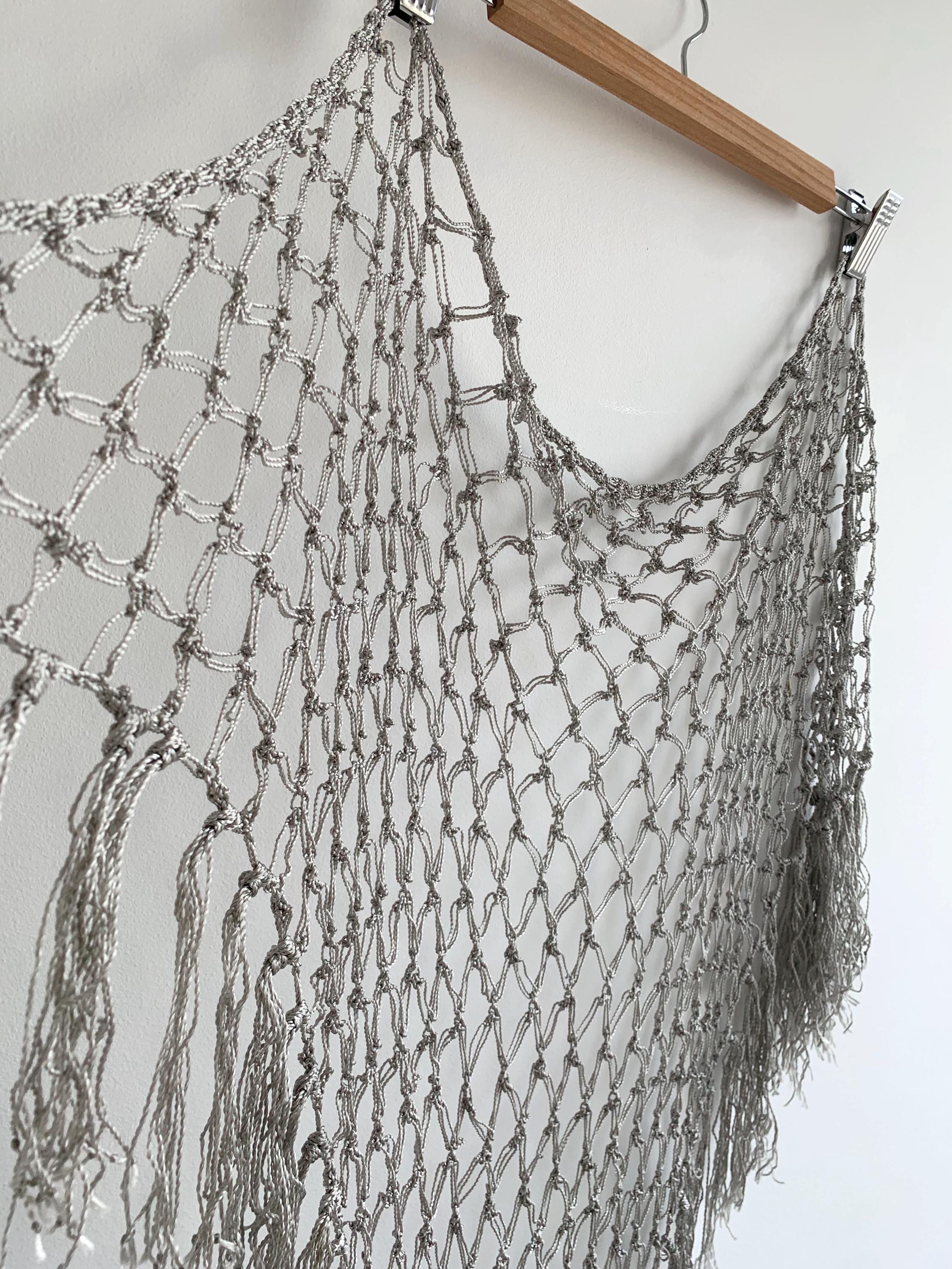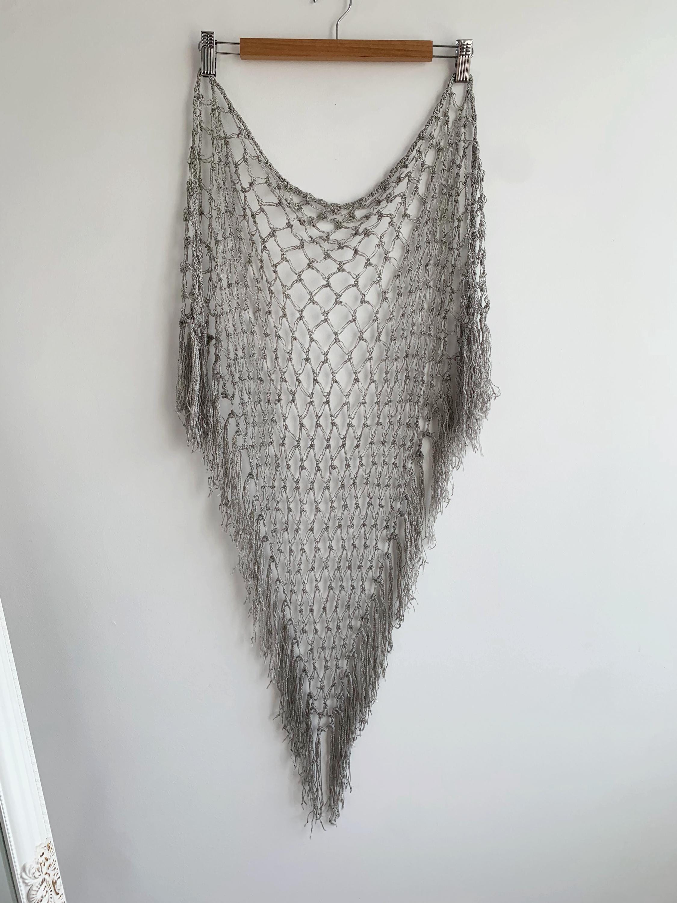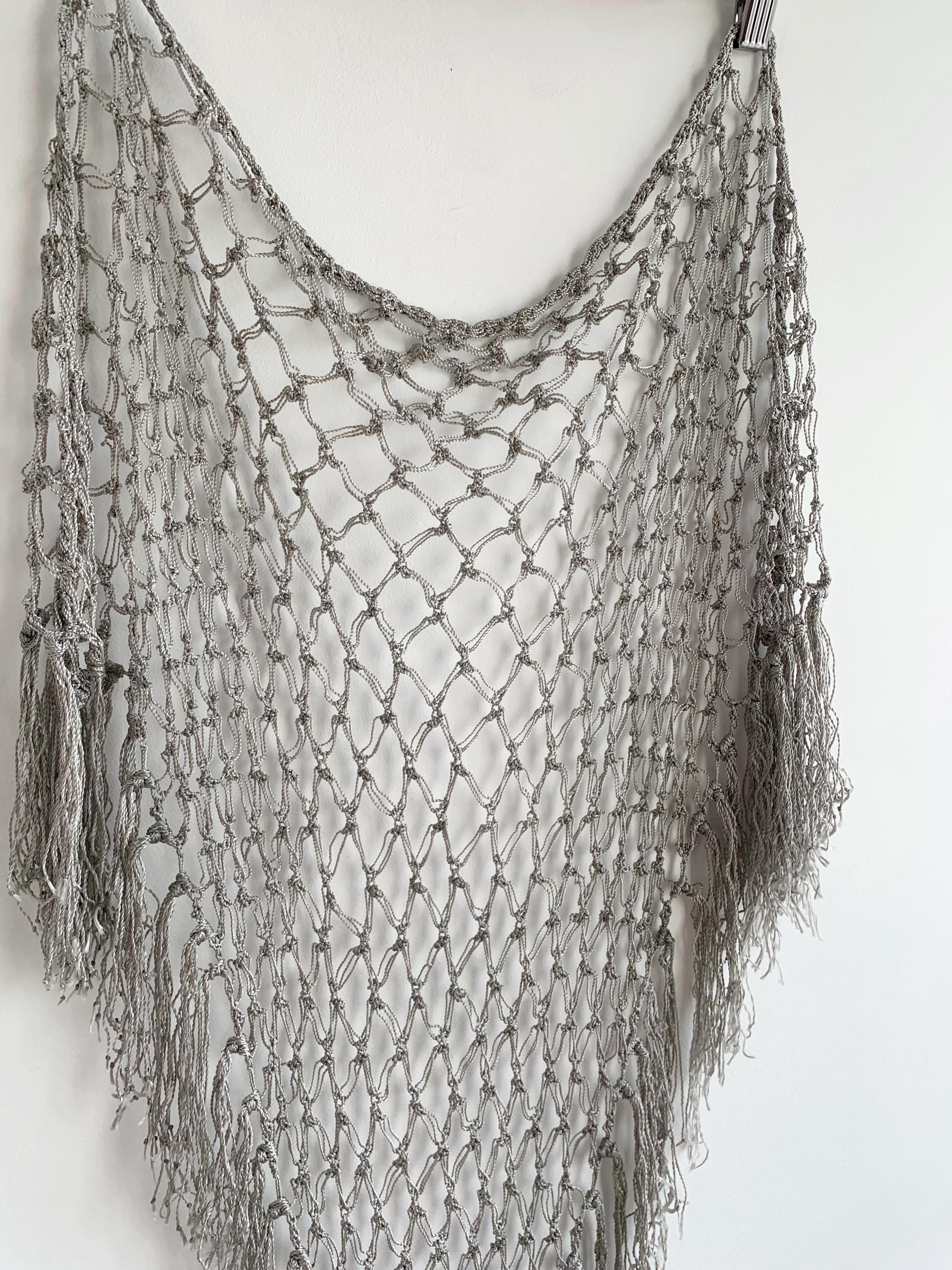 Beautiful 20's style silver grey shiny viscose silk solomon's knot crochet shawl with tassels. This lovely elegant silky shawl is perfect for a Great Gatsby party outfit or as a part of your wedding guest outfit. This fringed lace crochet shawl has delicate shine when exposed to light. It is made of silky shiny viscose thread in silver grey color which perfectly catches the light. Beautiful silver net shawl for a perfect vintage look.