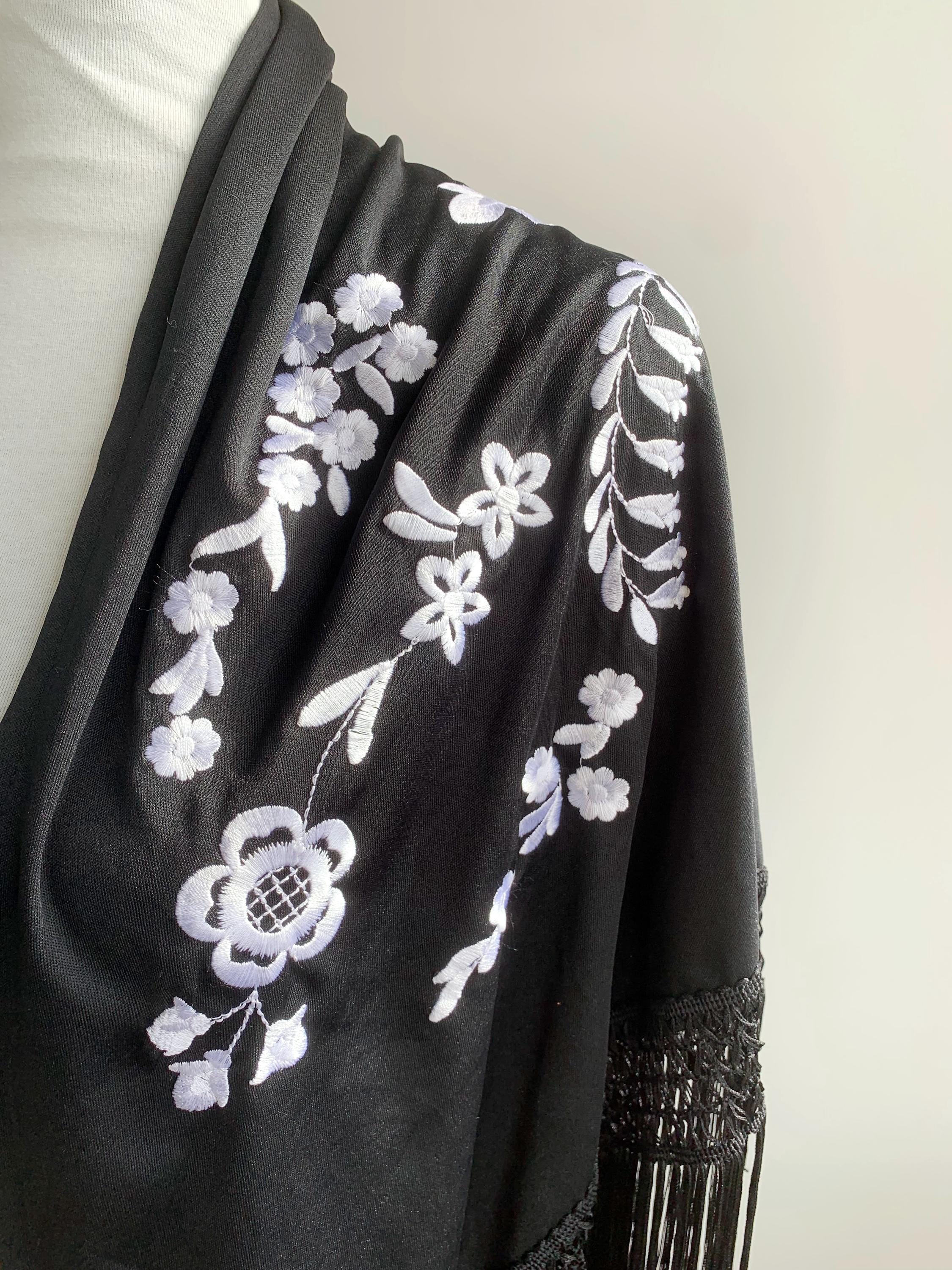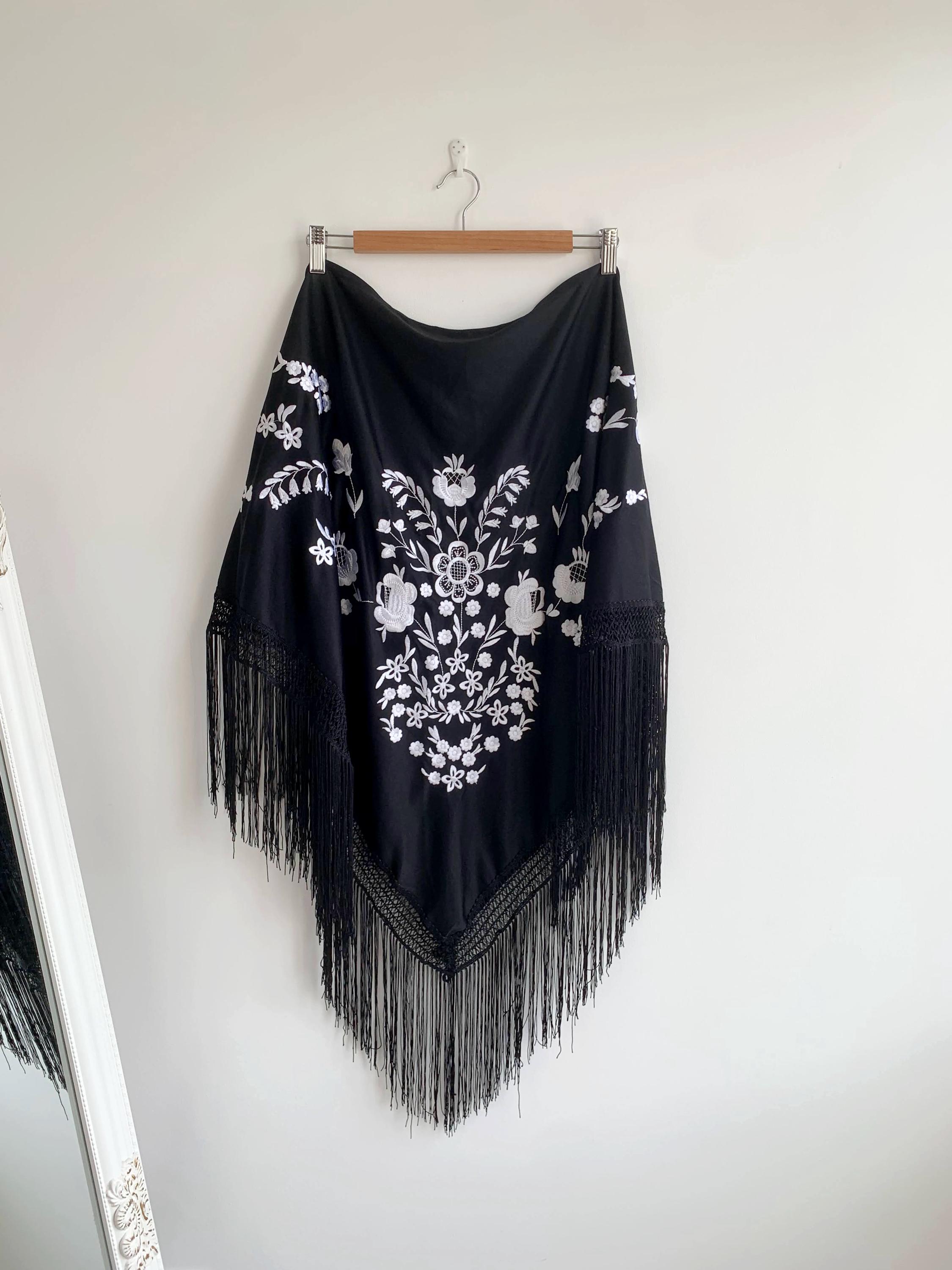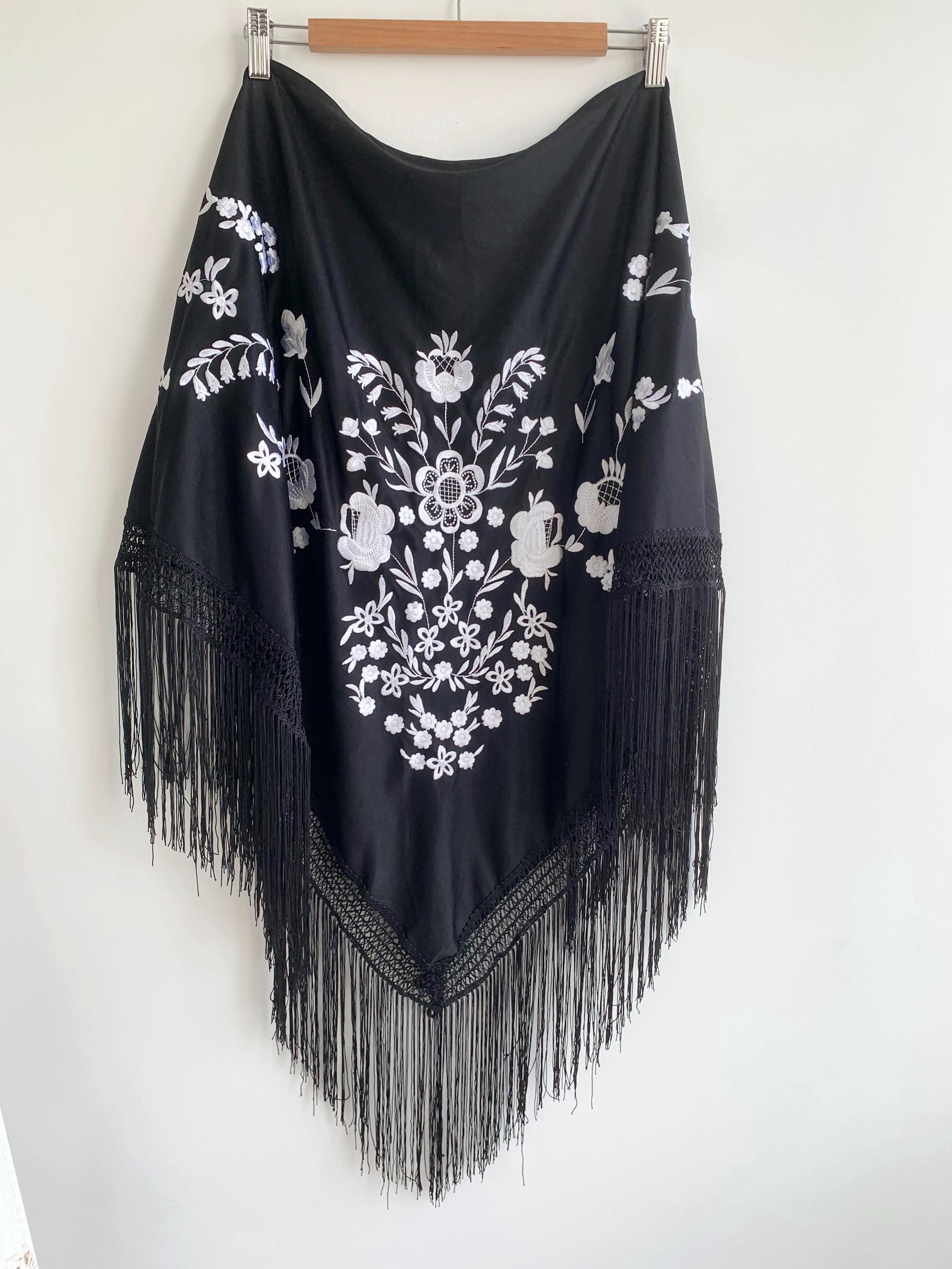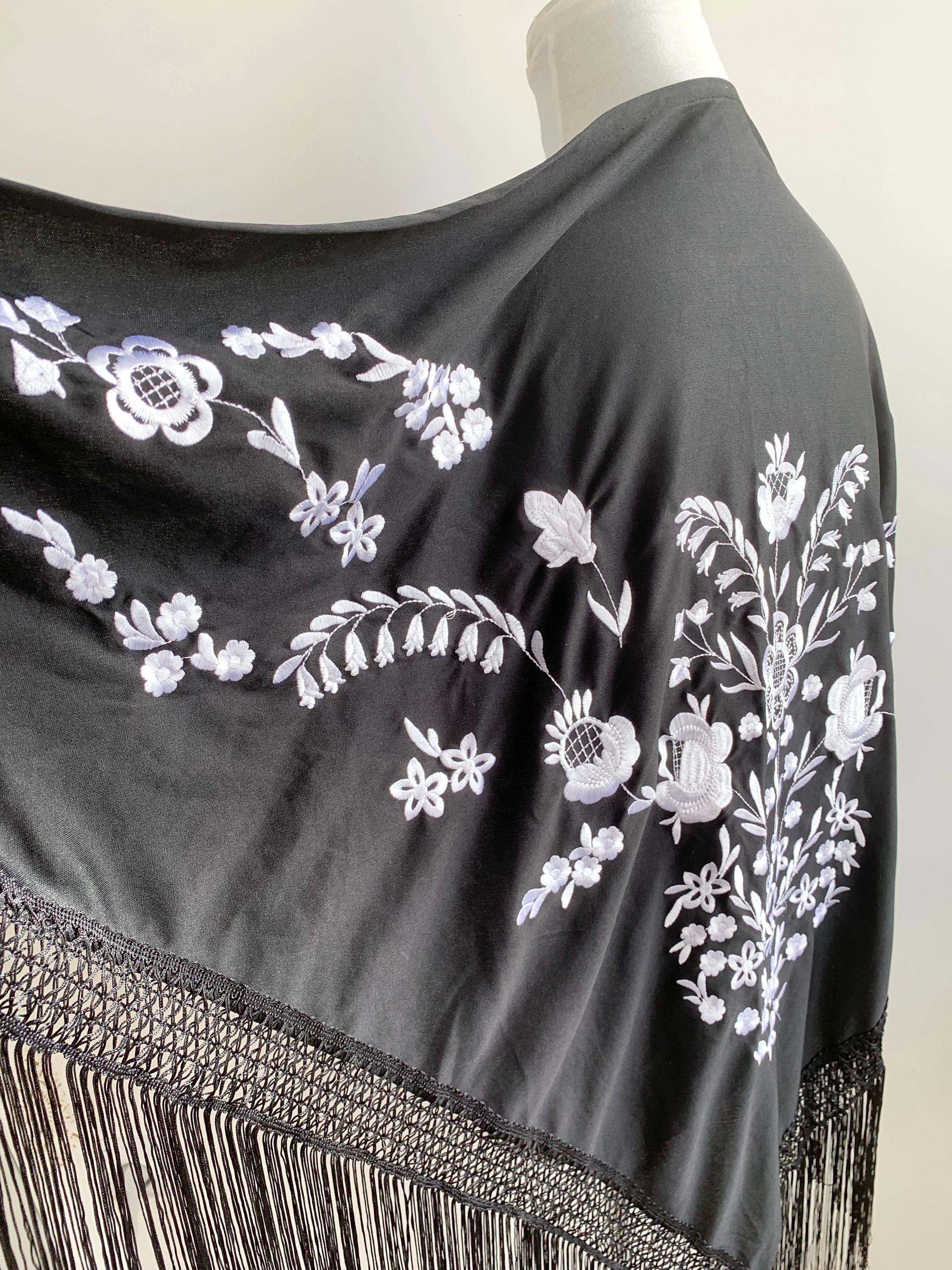 Beautiful vintage black triangle piano shawl with white embroidered flowers and tassels, perfect boho cover up to keep you warm and add some boho chic look to your outfit. This bohemian fringed shawl has adorable floral machine embroidery in delicate white color.