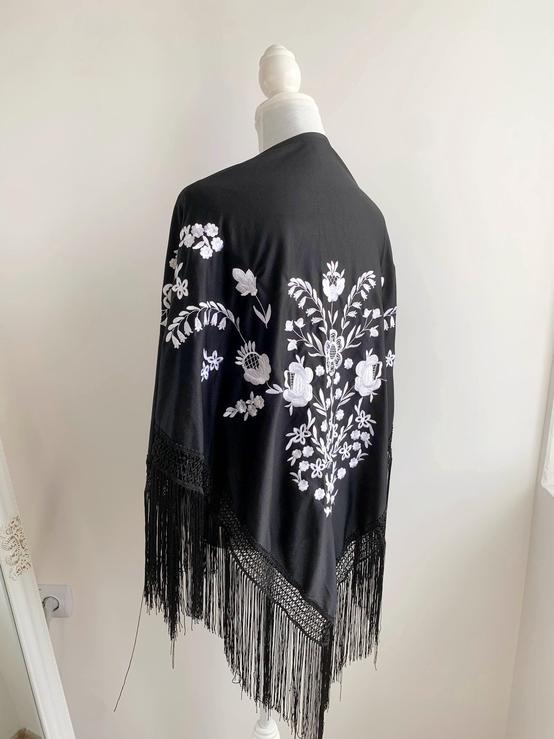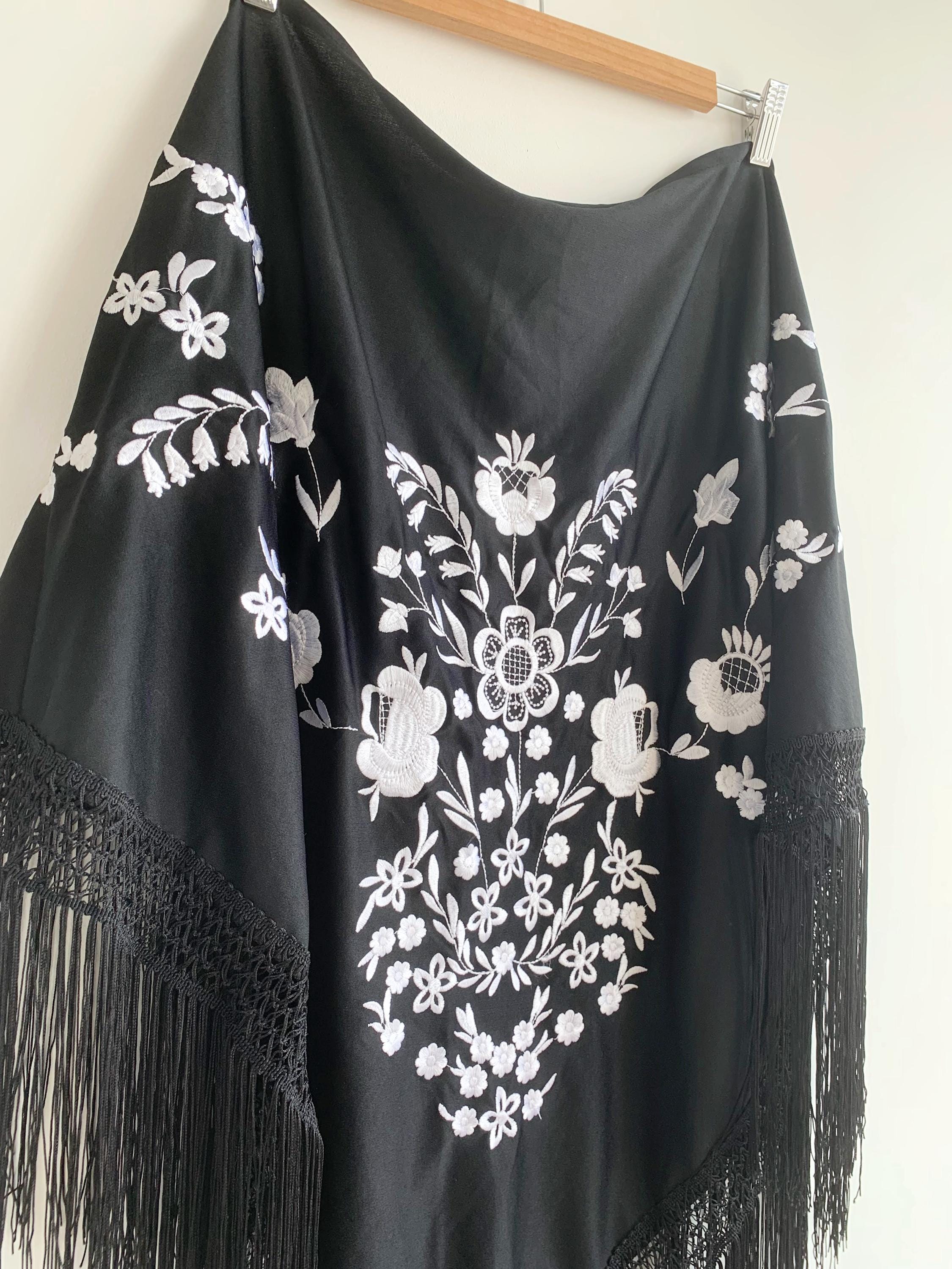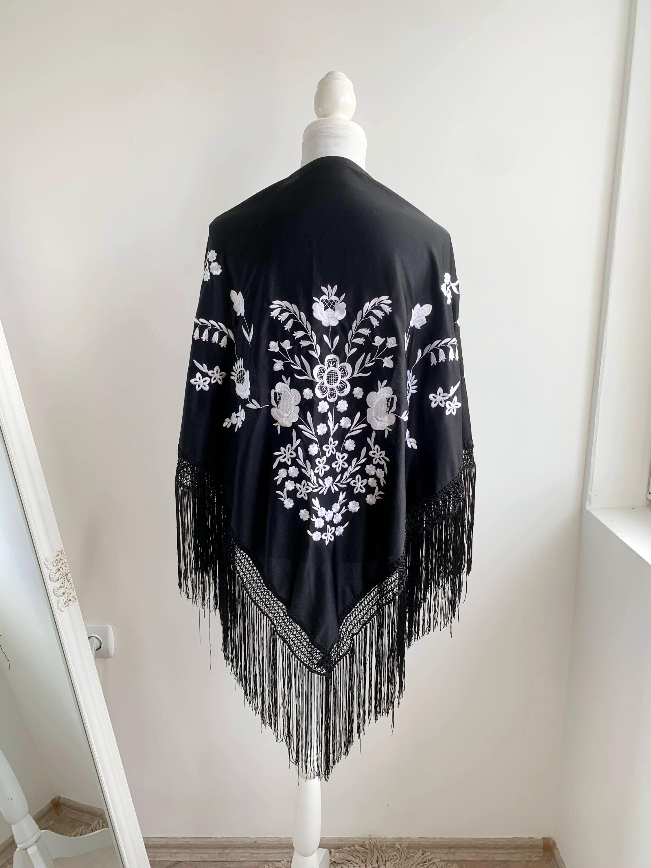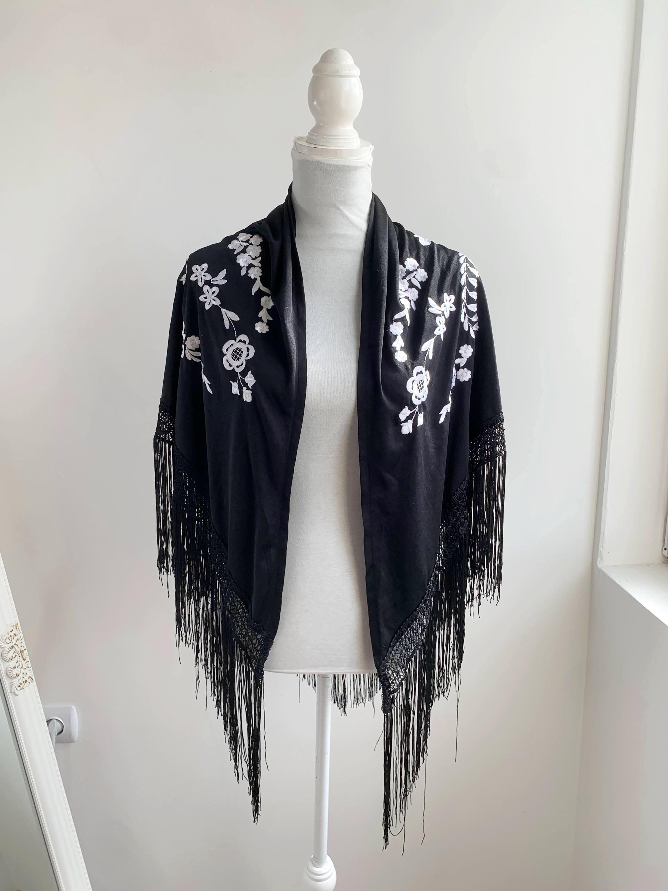 Beautiful vintage black triangle piano shawl with white embroidered flowers and tassels, perfect boho cover up to keep you warm and add some boho chic look to your outfit. This bohemian fringed shawl has adorable floral machine embroidery in delicate white color.