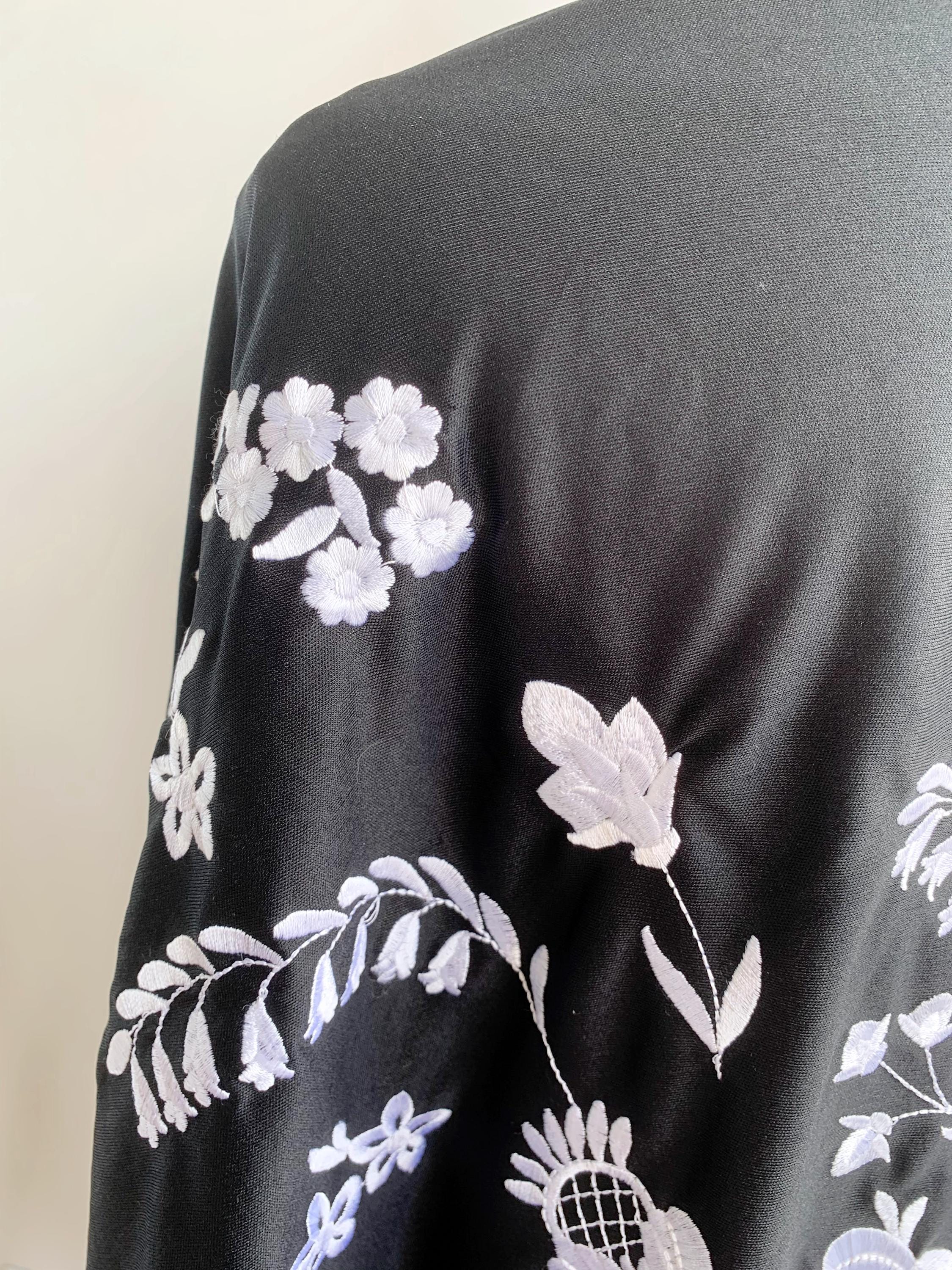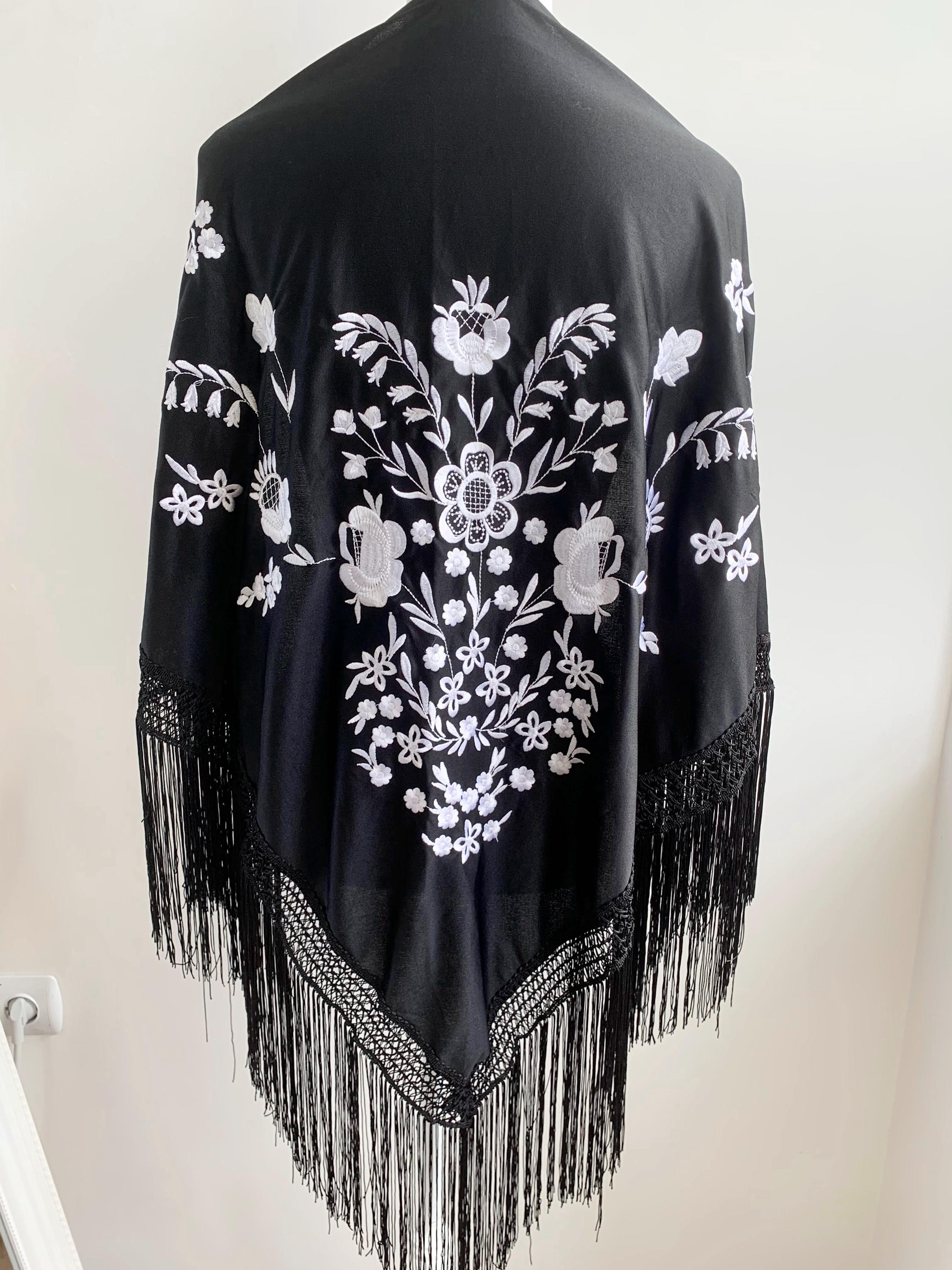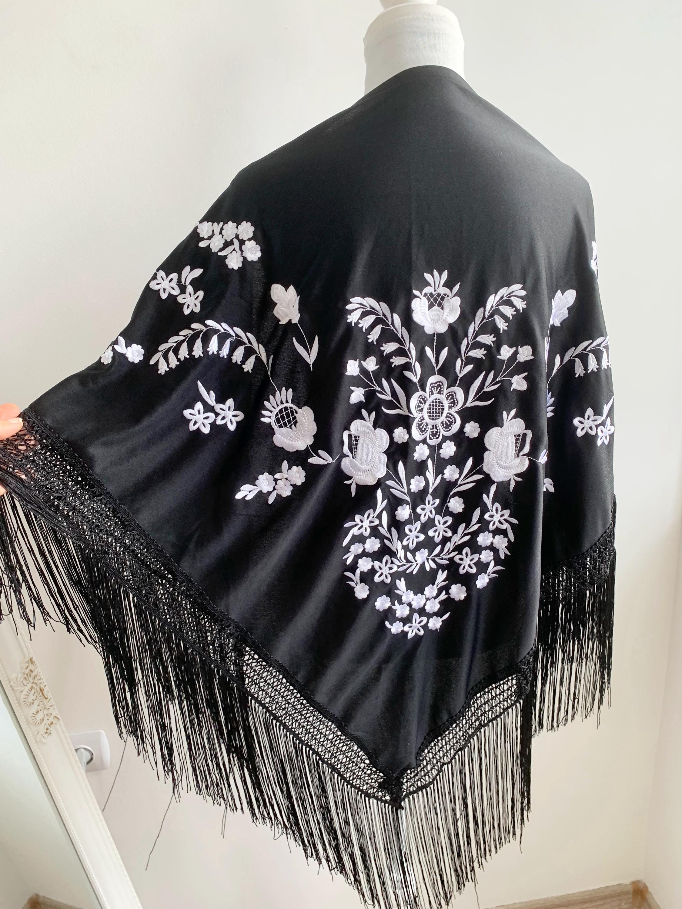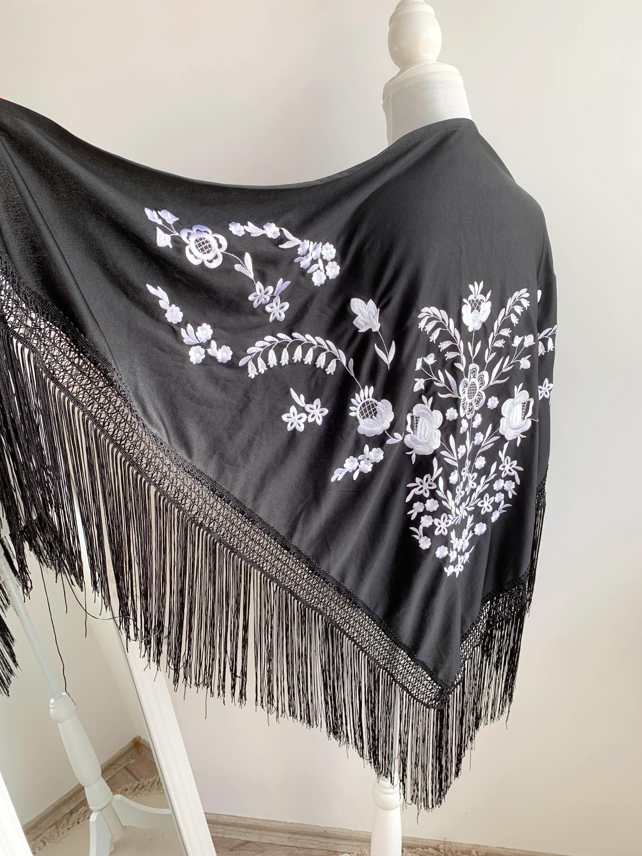 Beautiful vintage black triangle piano shawl with white embroidered flowers and tassels, perfect boho cover up to keep you warm and add some boho chic look to your outfit. This bohemian fringed shawl has adorable floral machine embroidery in delicate white color.