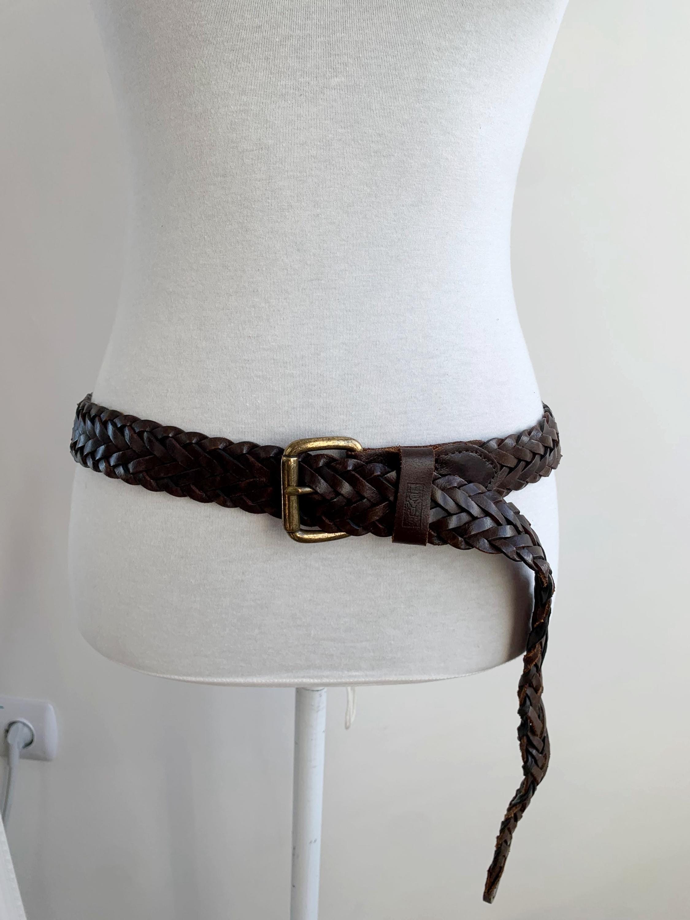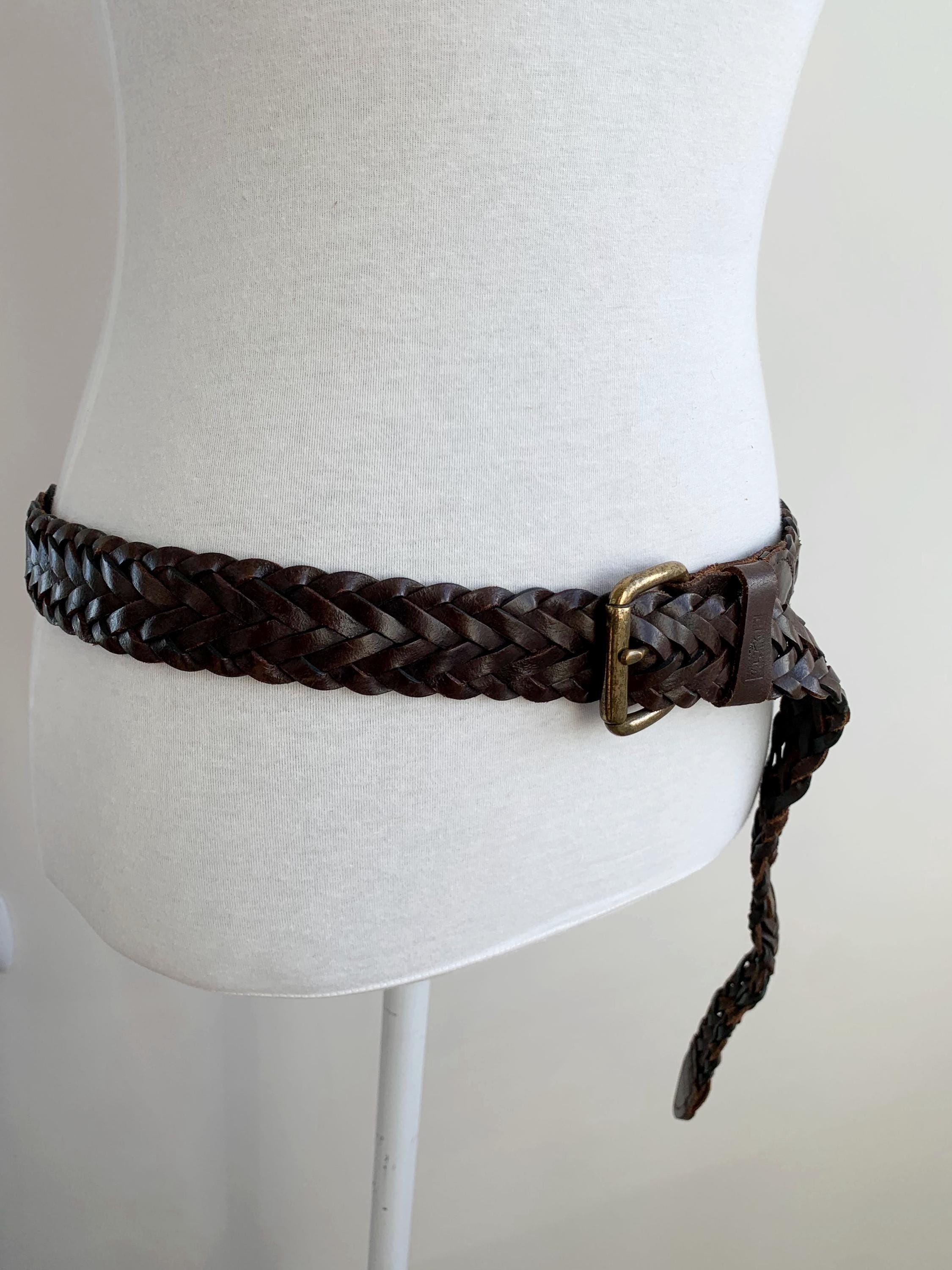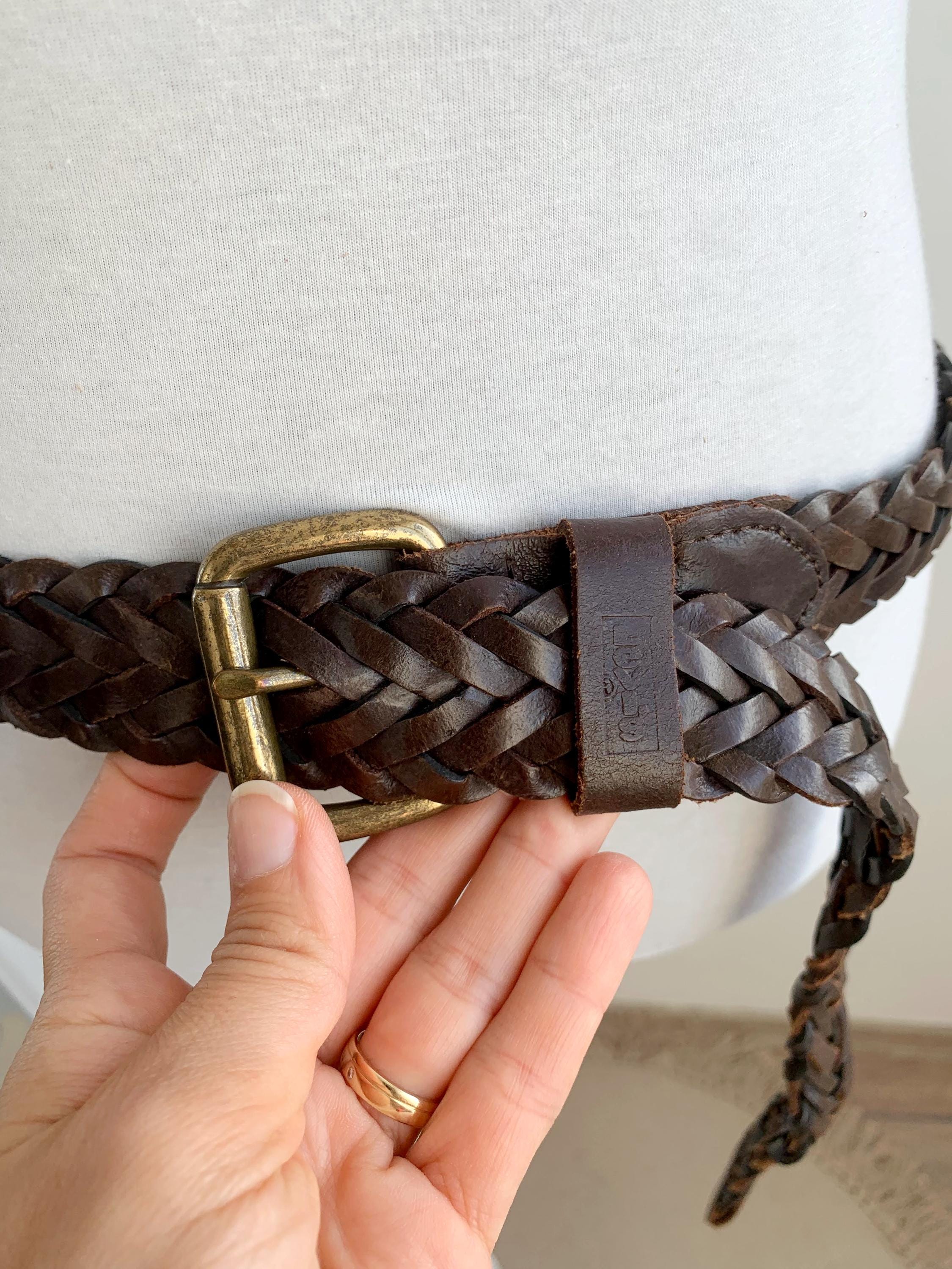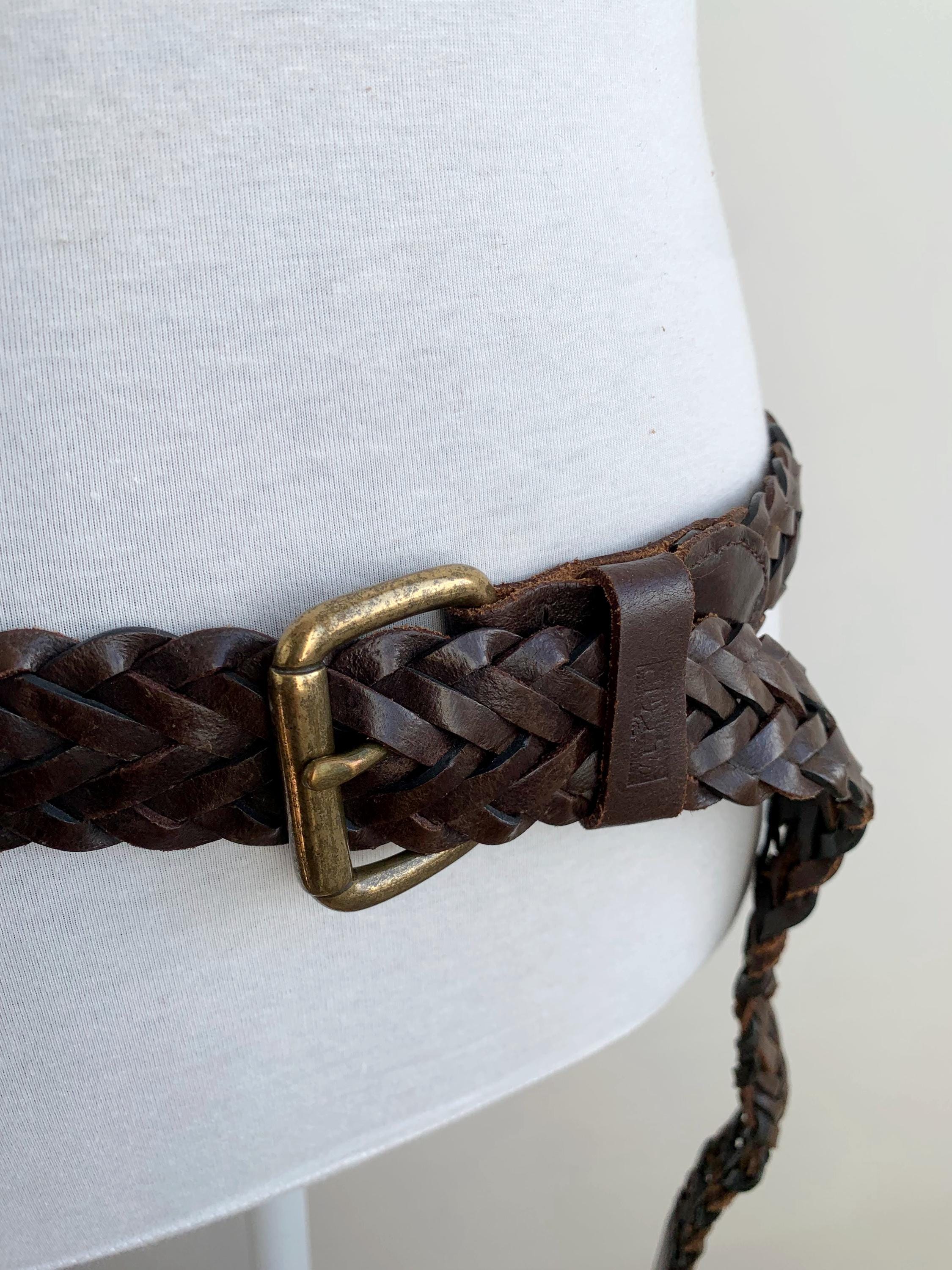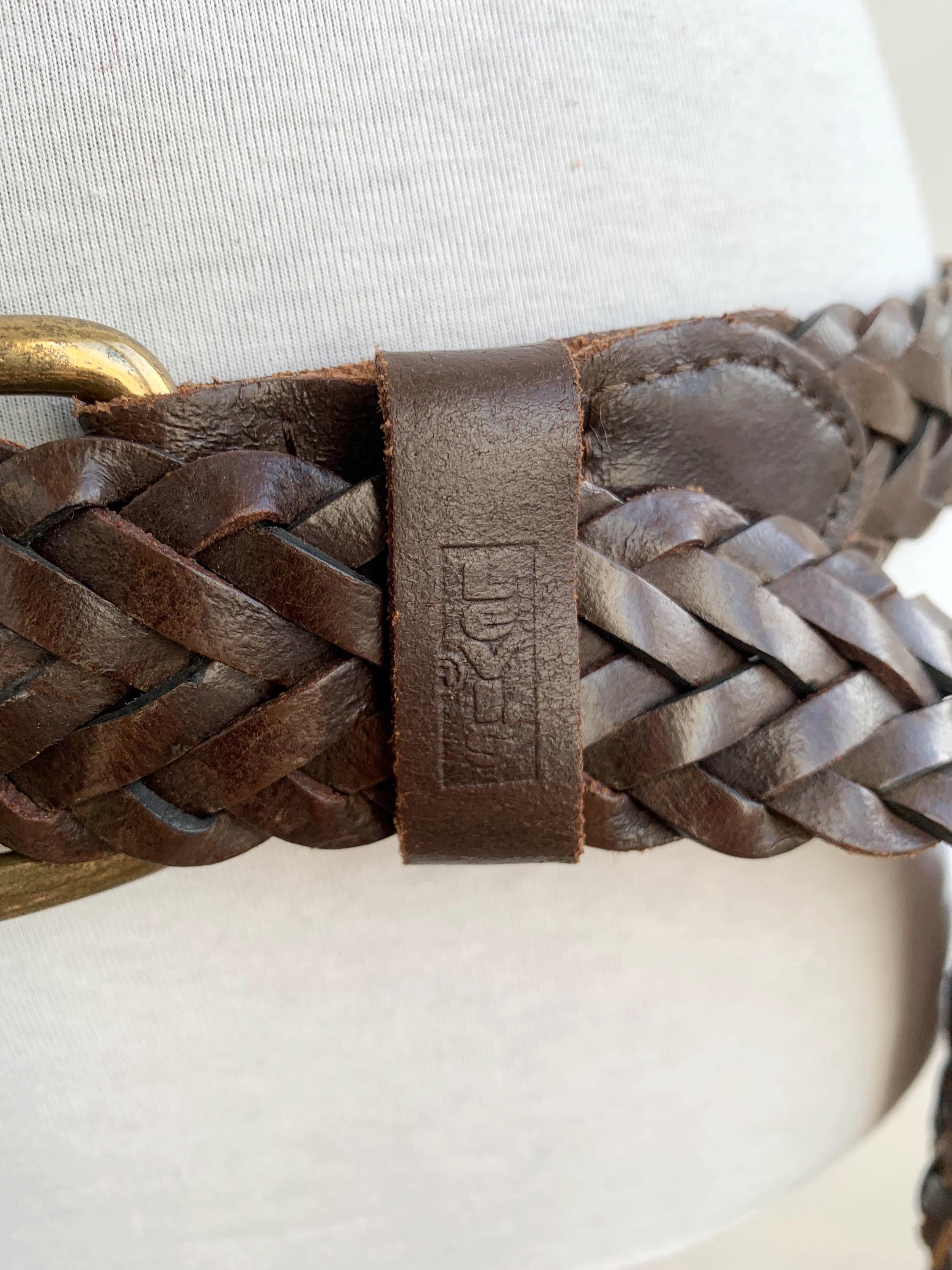 Add a touch of bohemian texture to any outfit with this classic vintage dark brown braided leather belt by Levi's in size 40" / 100 cm. This long, wide, woven belt is crafted from genuine, high-quality leather and features a warm, antiqued brass buckle. The continuous braid means the belt is completely adjustable, allowing the buckle pin to fasten anywhere along its length, which makes it incredibly versatile—it can be worn cinched high around a dress for a boho look, or looped low on the hips with jeans. It's the perfect everyday accessory for anyone who loves hippie style, rustic Western wear, or simply appreciates durable, timeless genuine leather goods. A fantastic find to elevate your vintage wardrobe!