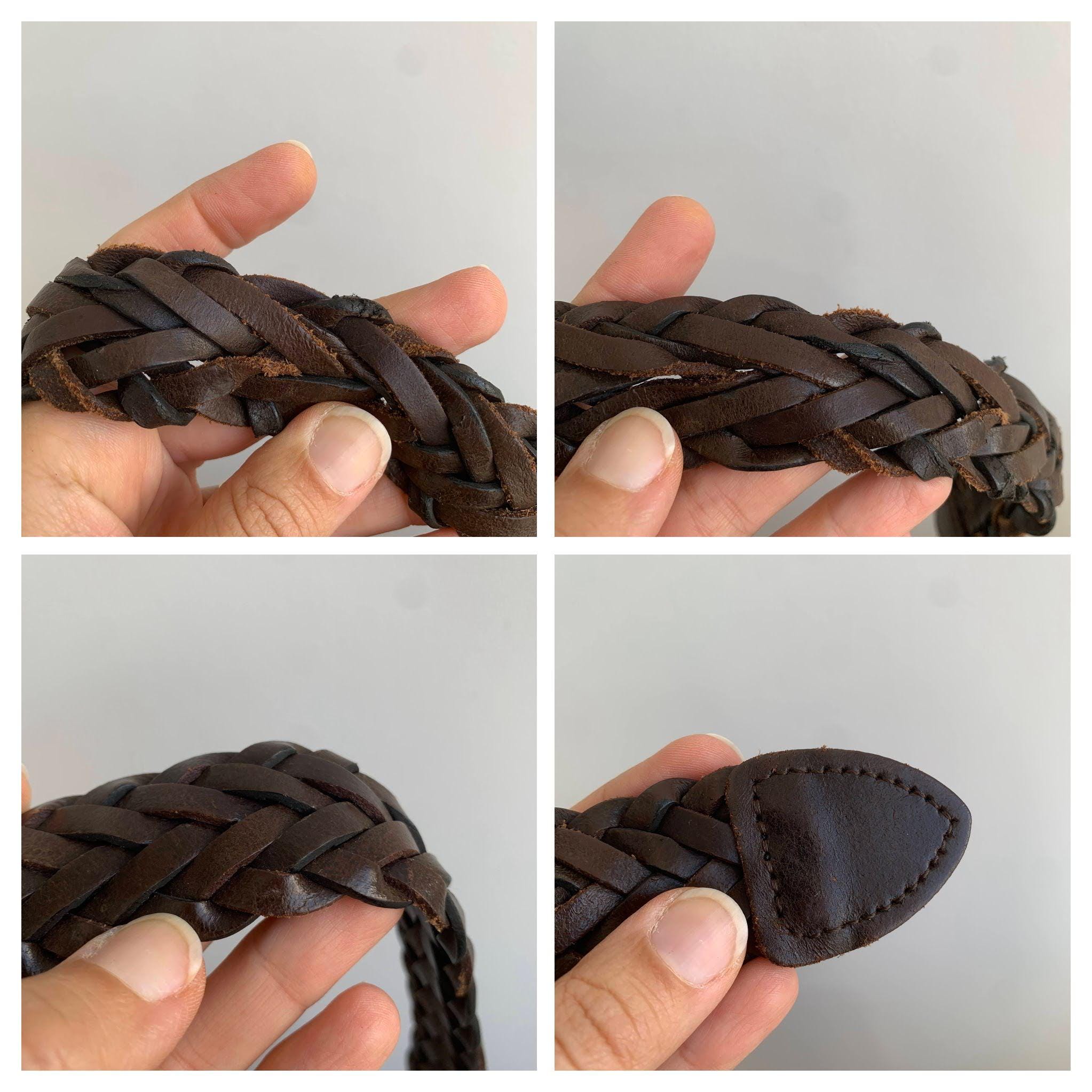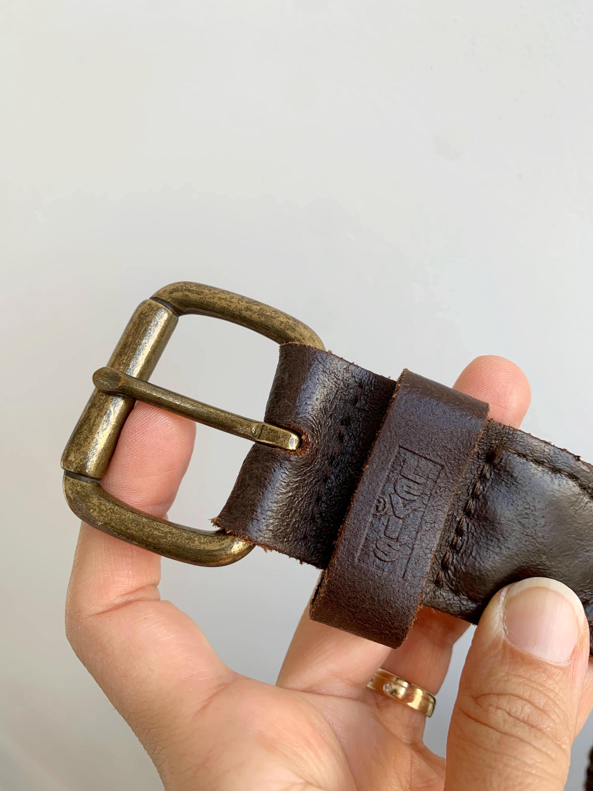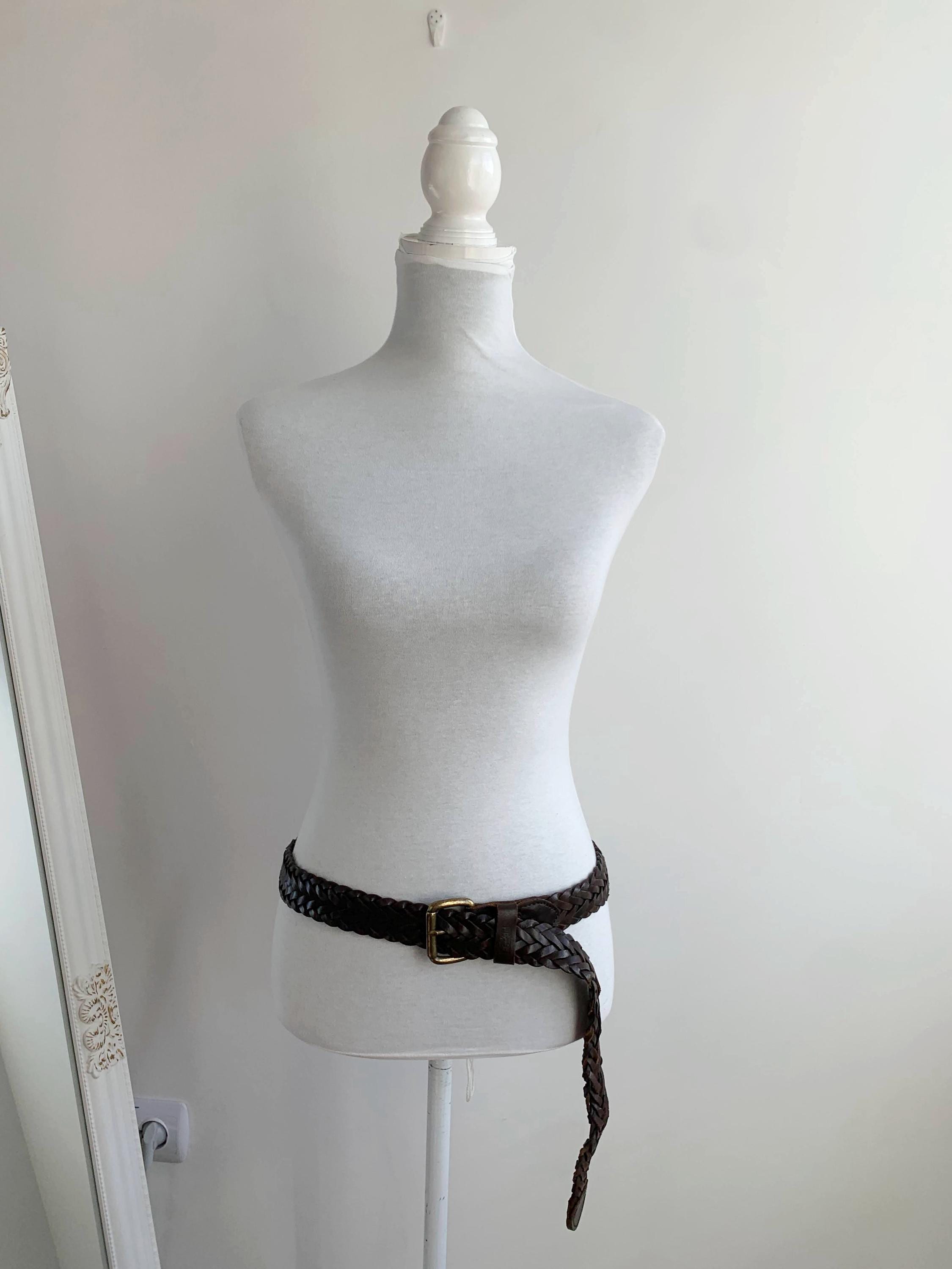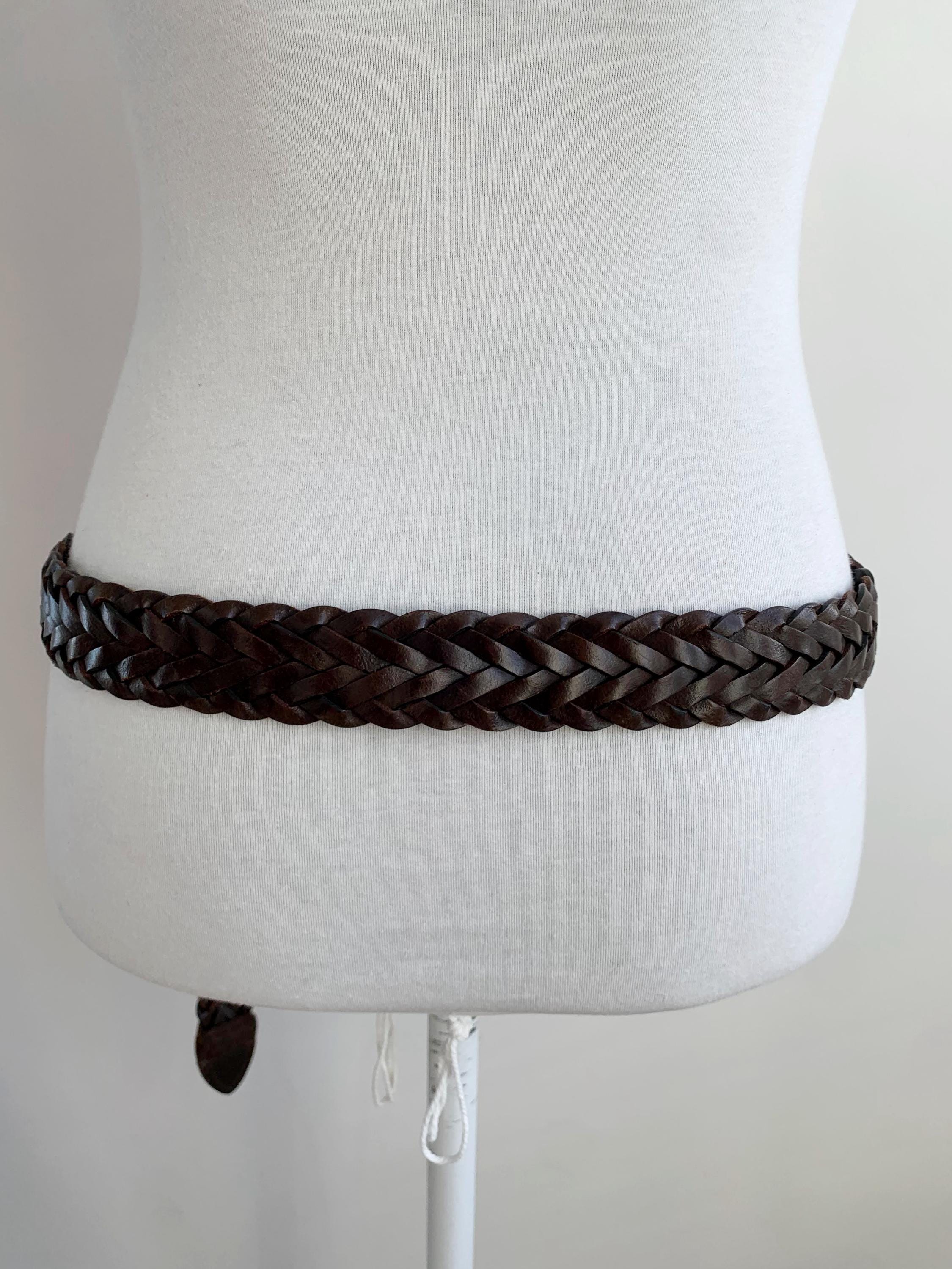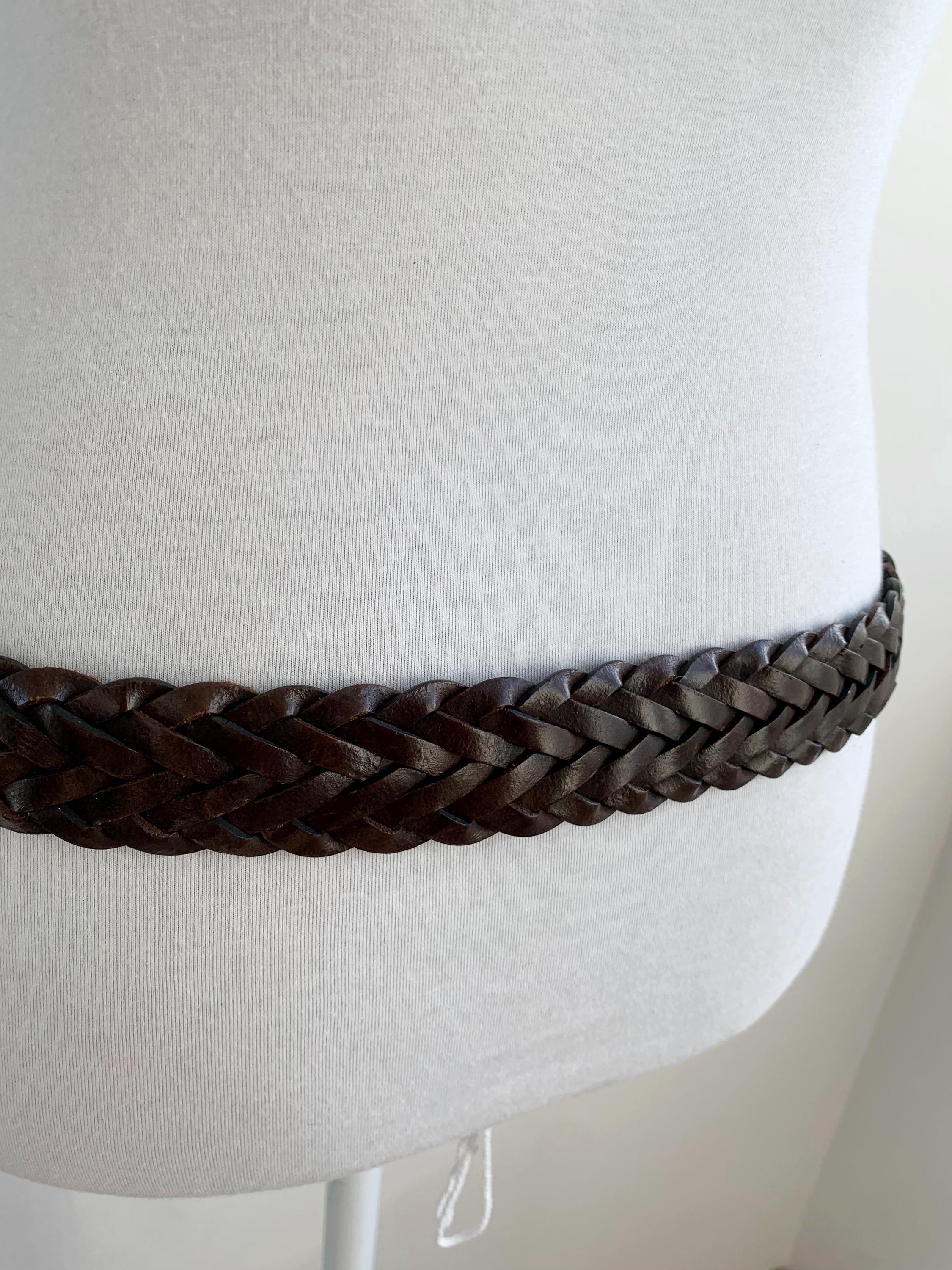 Add a touch of bohemian texture to any outfit with this classic vintage dark brown braided leather belt by Levi's in size 40" / 100 cm. This long, wide, woven belt is crafted from genuine, high-quality leather and features a warm, antiqued brass buckle. The continuous braid means the belt is completely adjustable, allowing the buckle pin to fasten anywhere along its length, which makes it incredibly versatile—it can be worn cinched high around a dress for a boho look, or looped low on the hips with jeans. It's the perfect everyday accessory for anyone who loves hippie style, rustic Western wear, or simply appreciates durable, timeless genuine leather goods. A fantastic find to elevate your vintage wardrobe!
