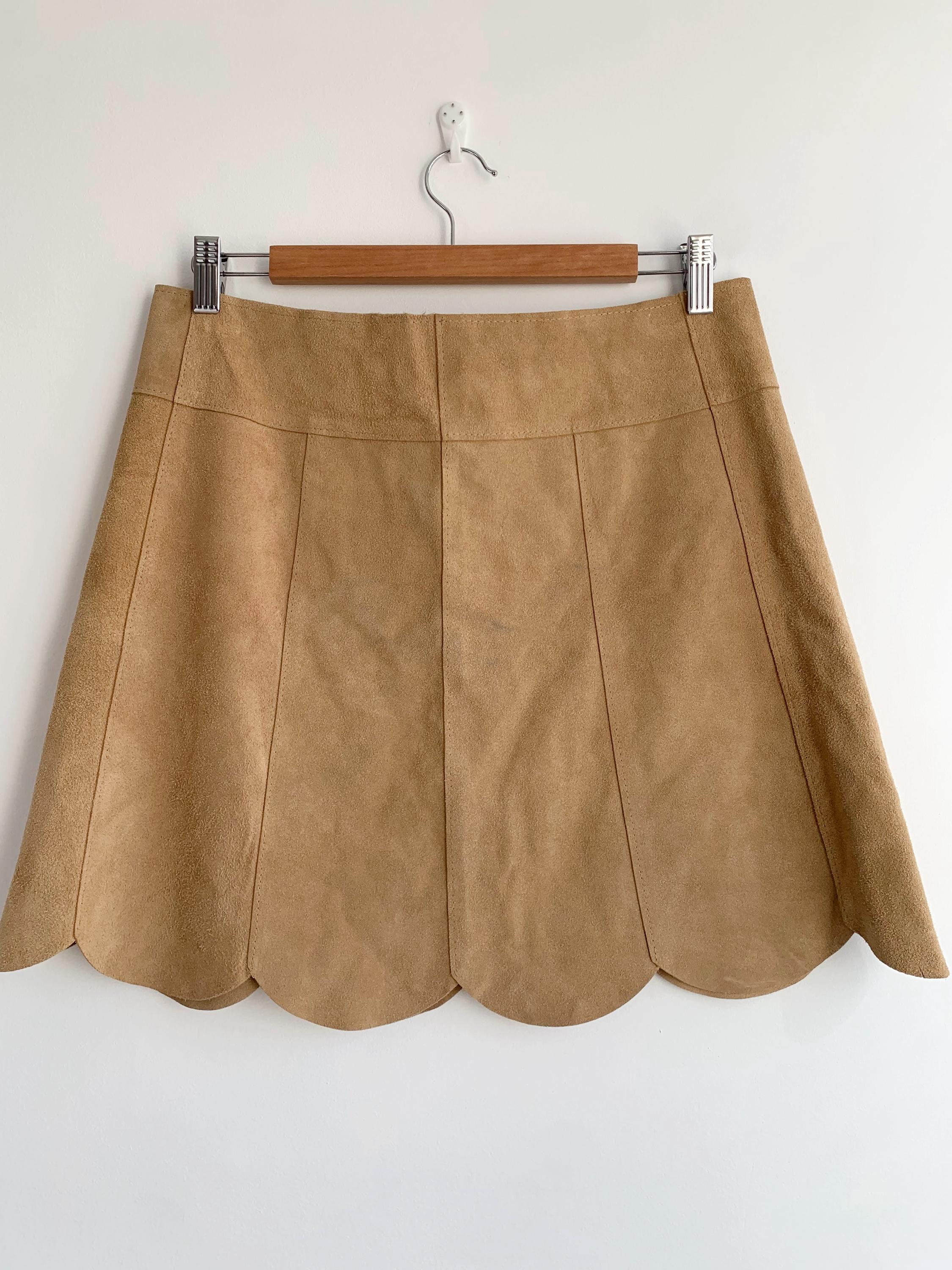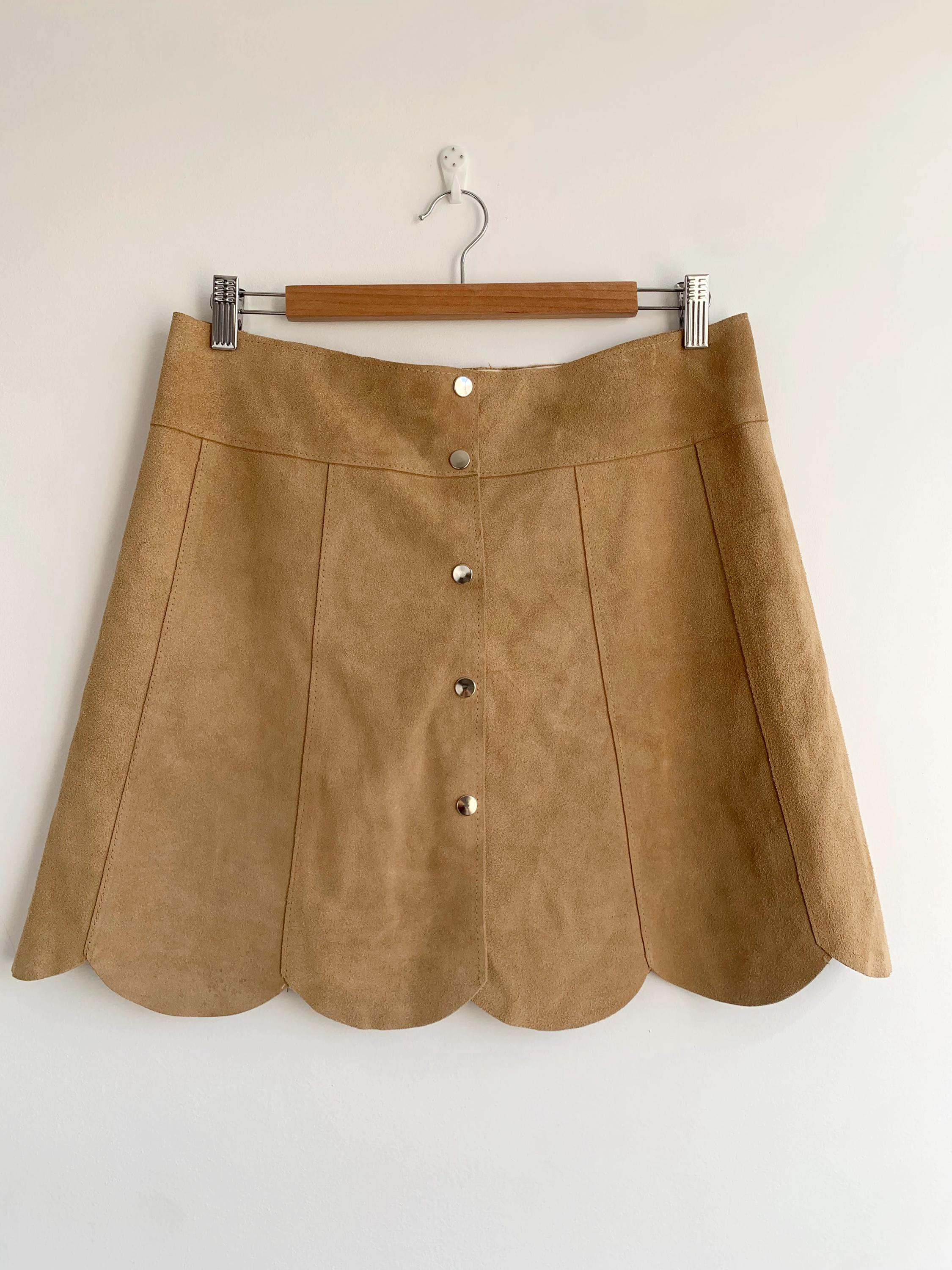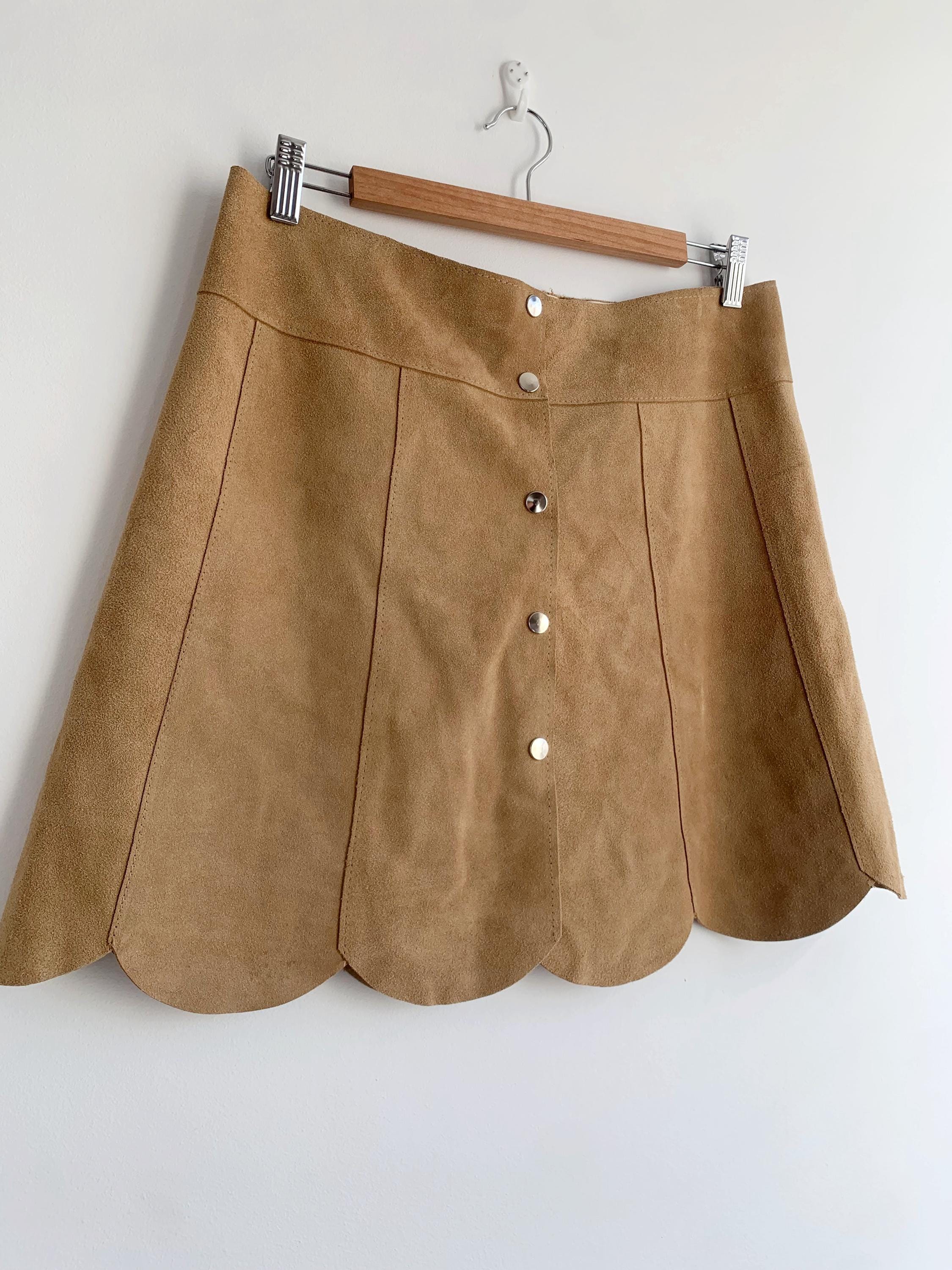 Step into authentic vintage style with this gorgeous real suede leather mini skirt in tan beige/ light camel brown color. This piece perfectly captures the luxurious texture and free-spirited feel of 70s bohemian fashion, while its flattering A-line silhouette and high waist keep it perfectly on-trend for a modern wardrobe. The rich, natural tan suede is beautifully accented by a charming scallop hem detail, offering a unique and feminine touch that sets it apart from typical retro skirts.