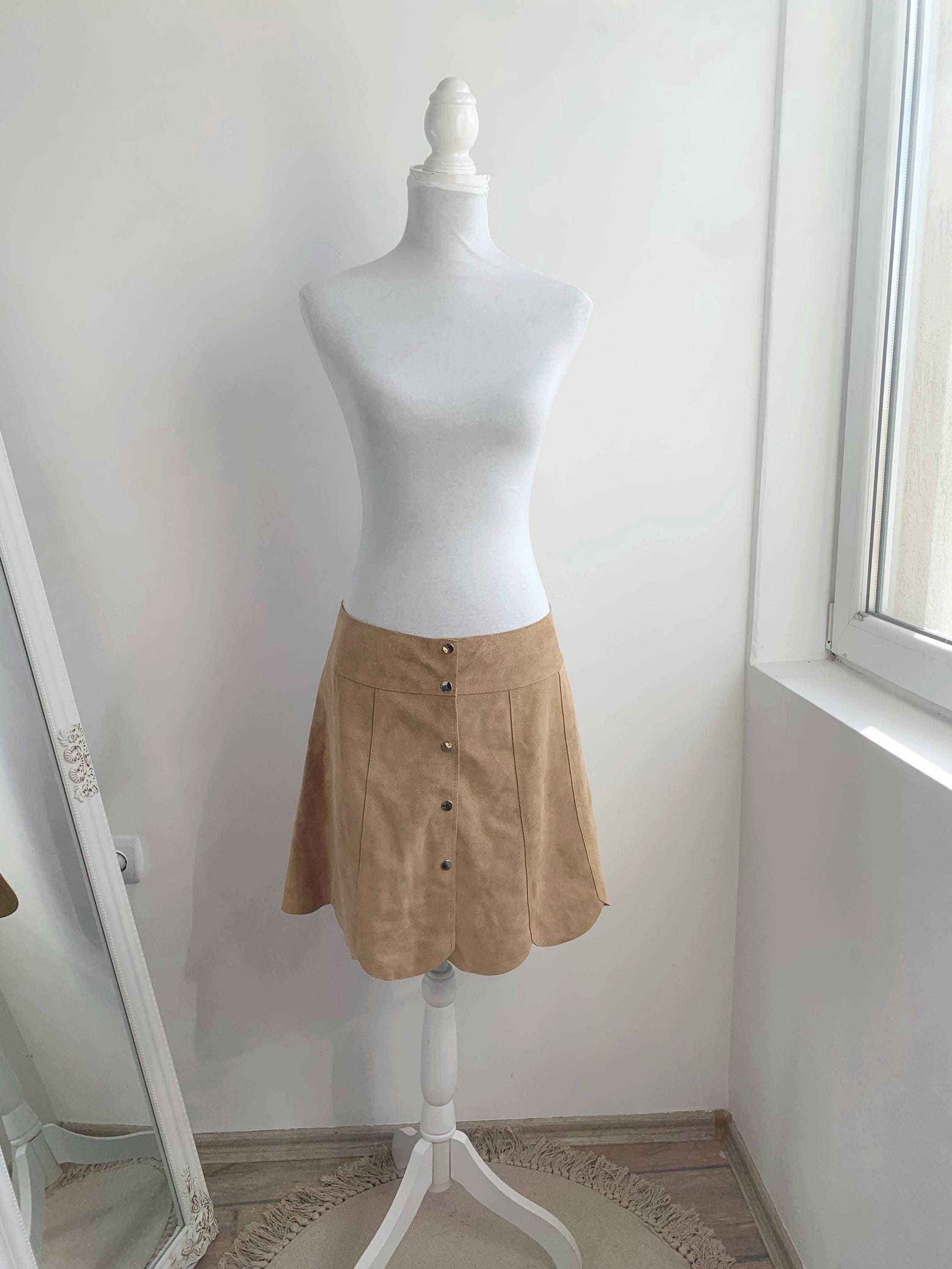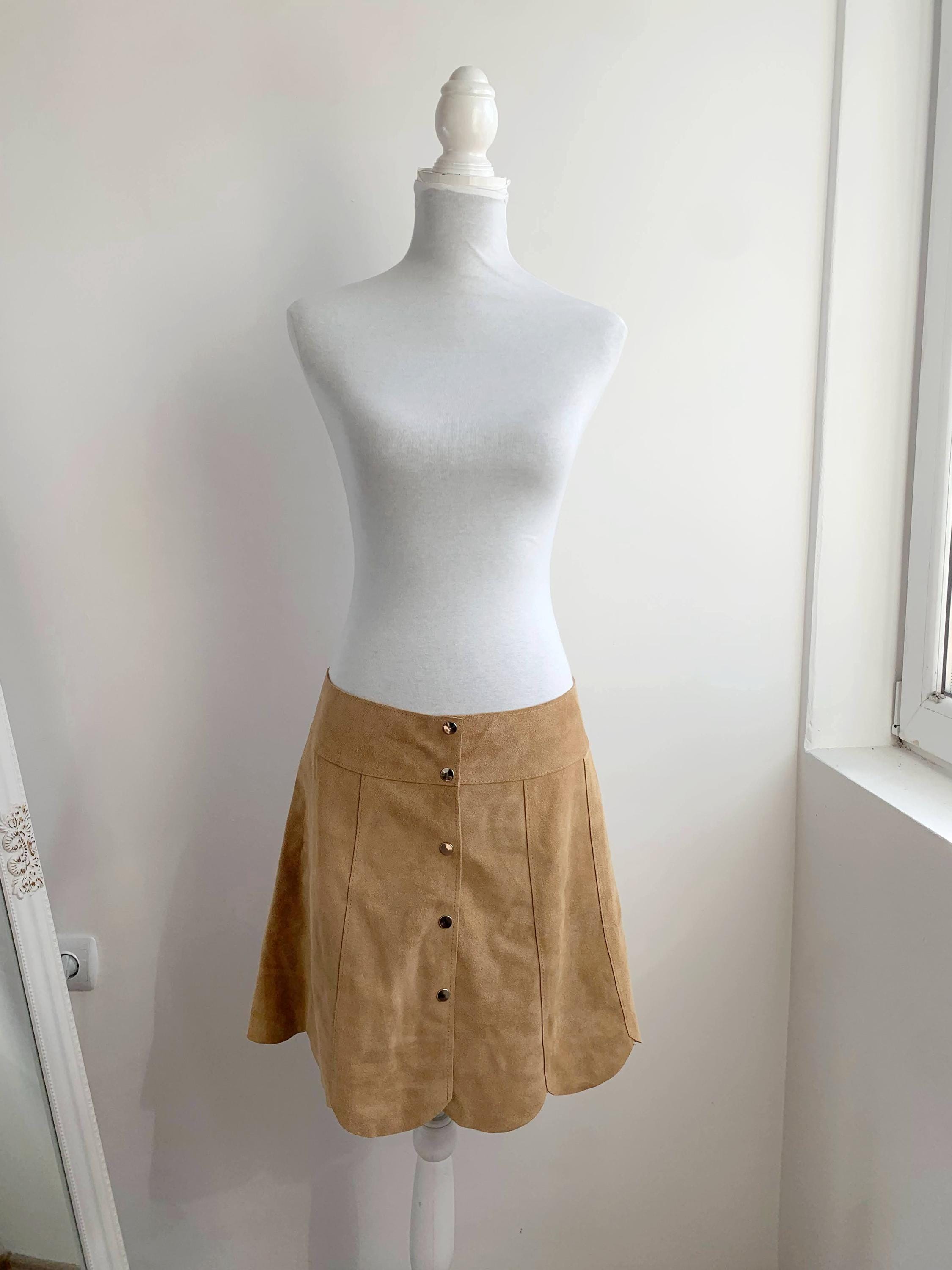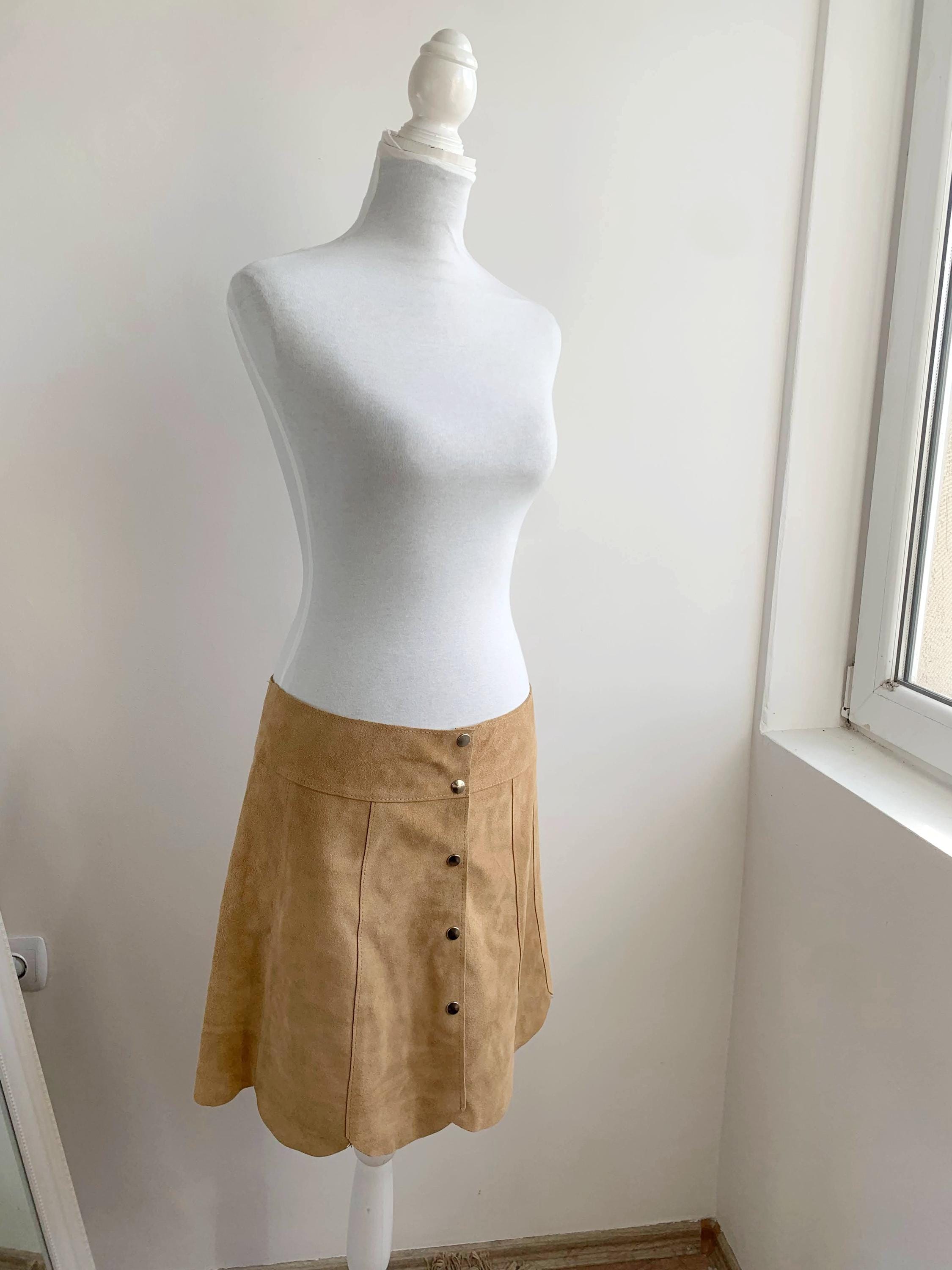 Step into authentic vintage style with this gorgeous real suede leather mini skirt in tan beige/ light camel brown color. This piece perfectly captures the luxurious texture and free-spirited feel of 70s bohemian fashion, while its flattering A-line silhouette and high waist keep it perfectly on-trend for a modern wardrobe. The rich, natural tan suede is beautifully accented by a charming scallop hem detail, offering a unique and feminine touch that sets it apart from typical retro skirts.
