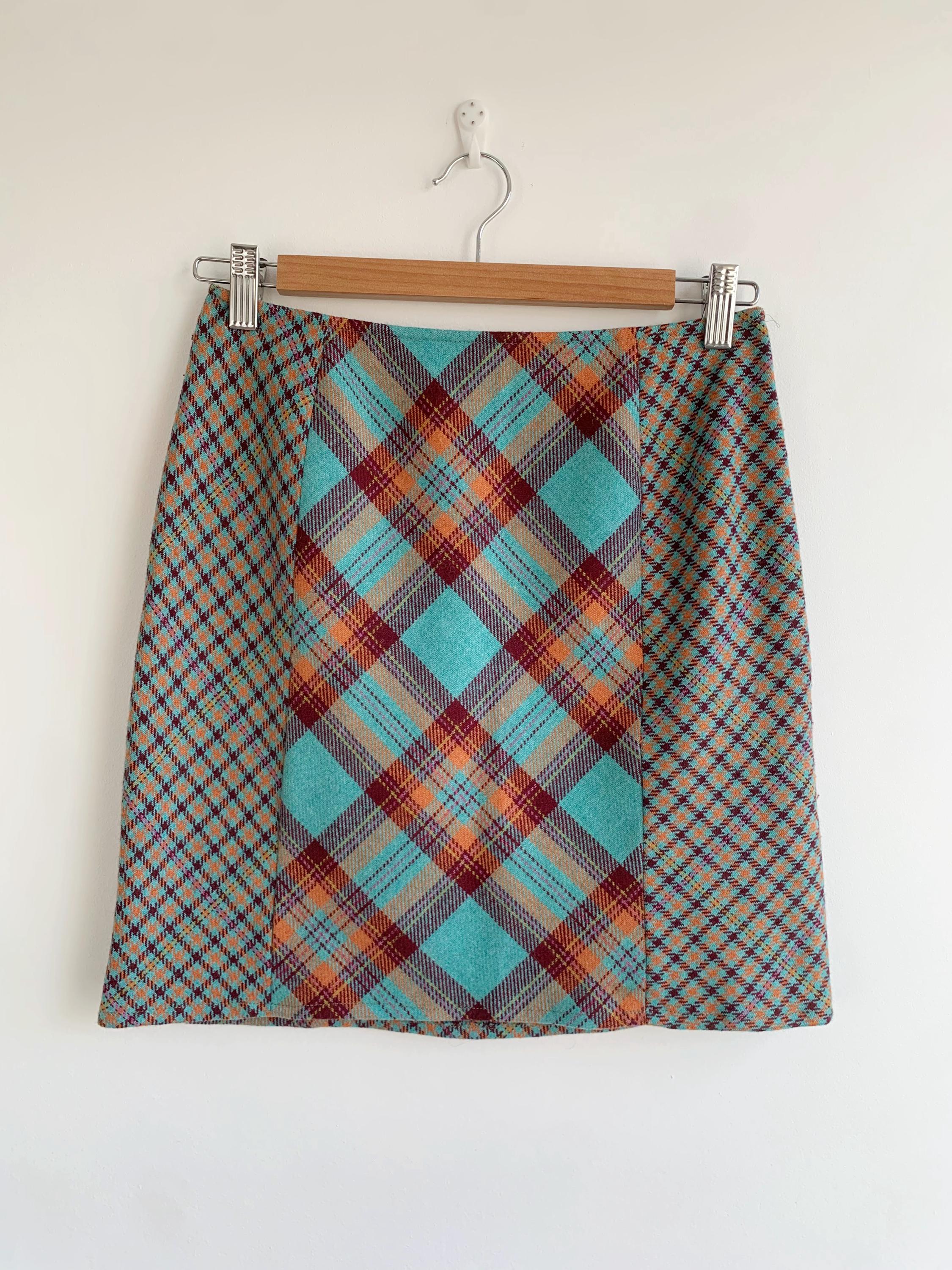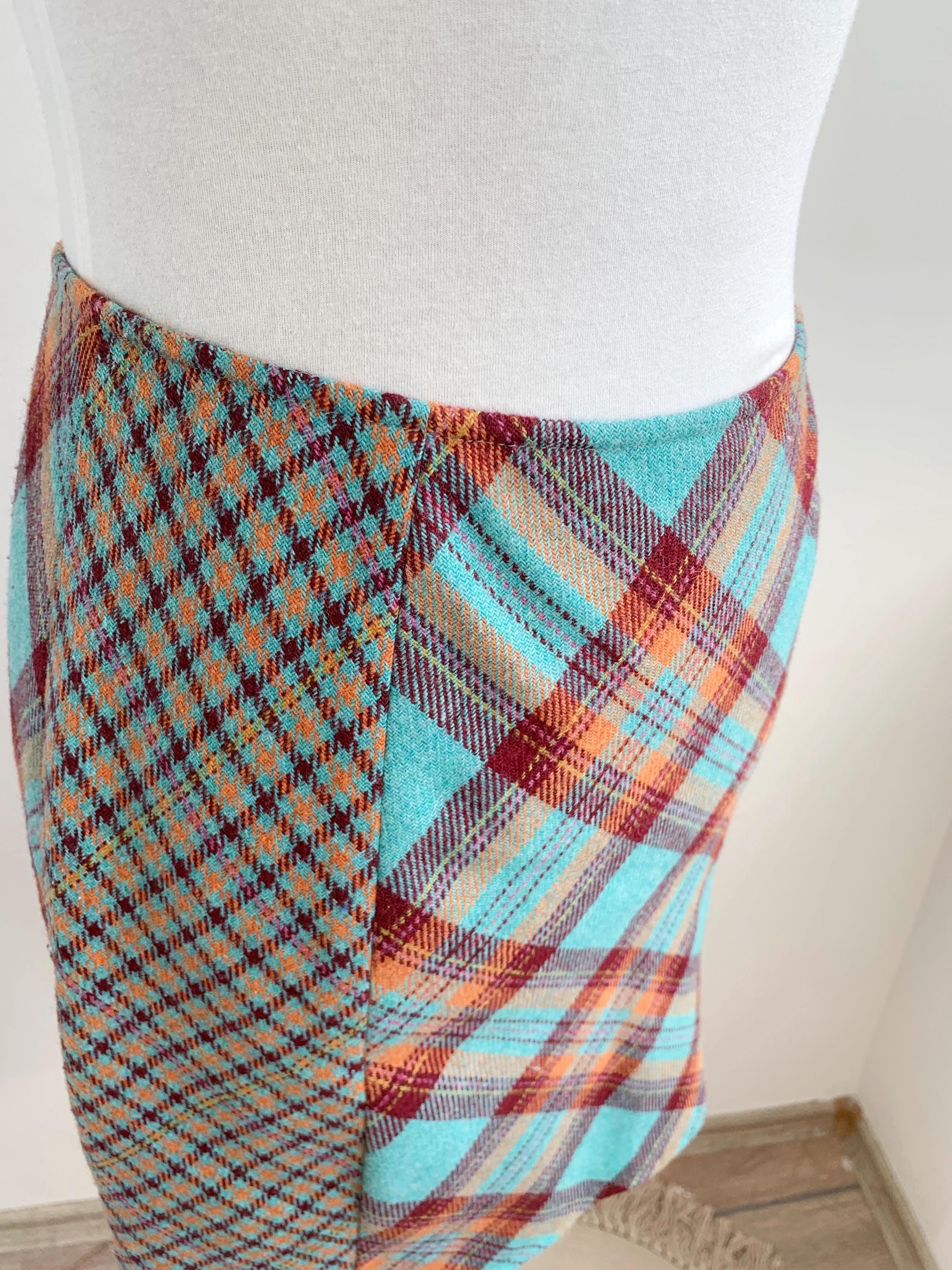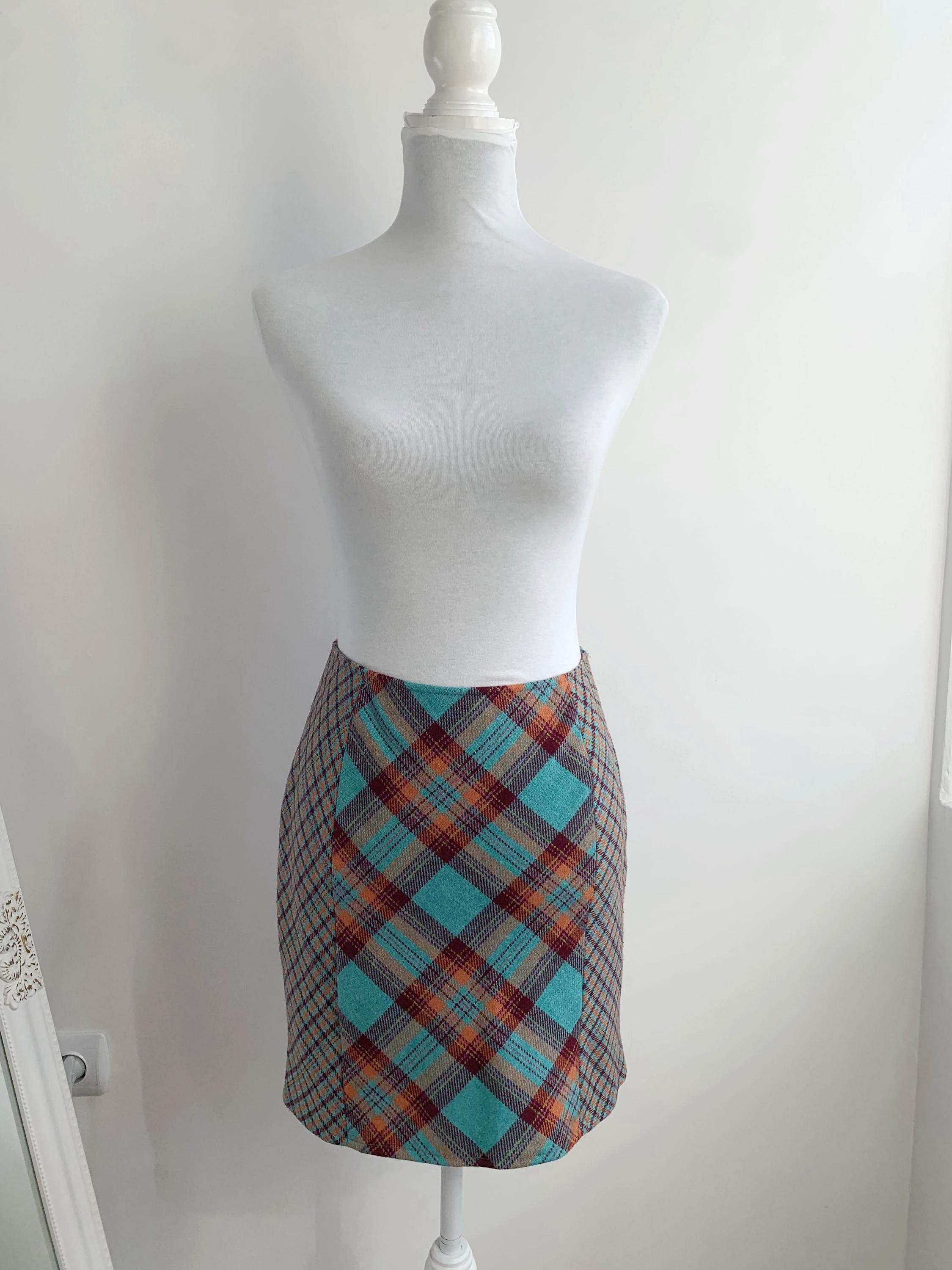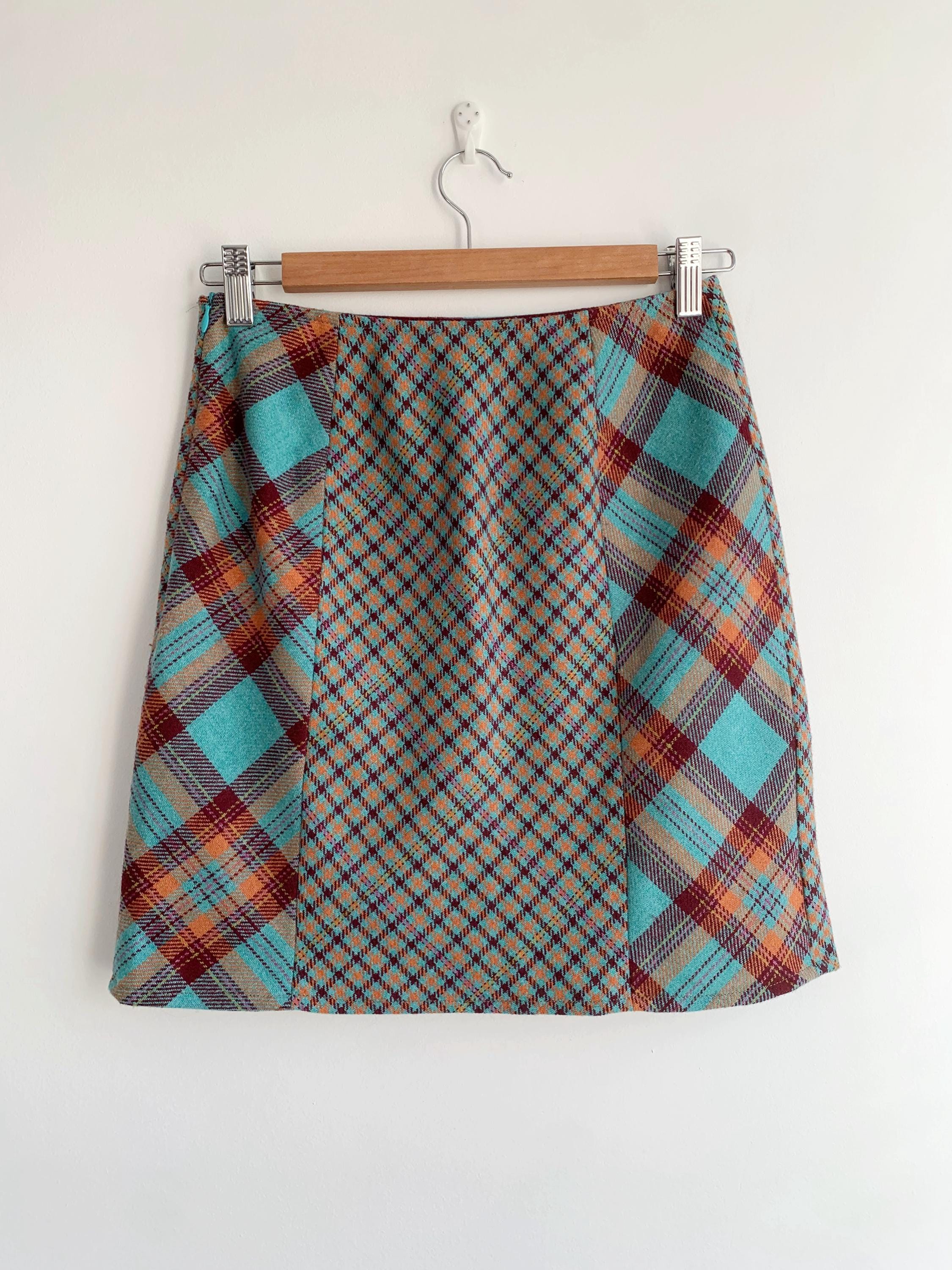 This tartan mini skirt features a vibrant and unusual multi-color plaid pattern, blending bold teal and orange with deep burgundy and neutral tones in a clever patchwork/paneled design. The contrasting center panel uses a tighter check pattern, offering a unique visual interest. Crafted in an ultra-flattering, slightly-fitted A-line silhouette, this high-waisted mini skirt closes with a concealed side zipper. It’s perfect for layering with tights, chunky boots, and an oversized knit for a cozy, stylish fall or winter look, or pairing with a fitted top for a true retro vibe. An authentic piece of vintage Kookai apparel that’s ready to become the statement piece of your sustainable wardrobe! Please ensure you check the precise measurements below for the best fit.
