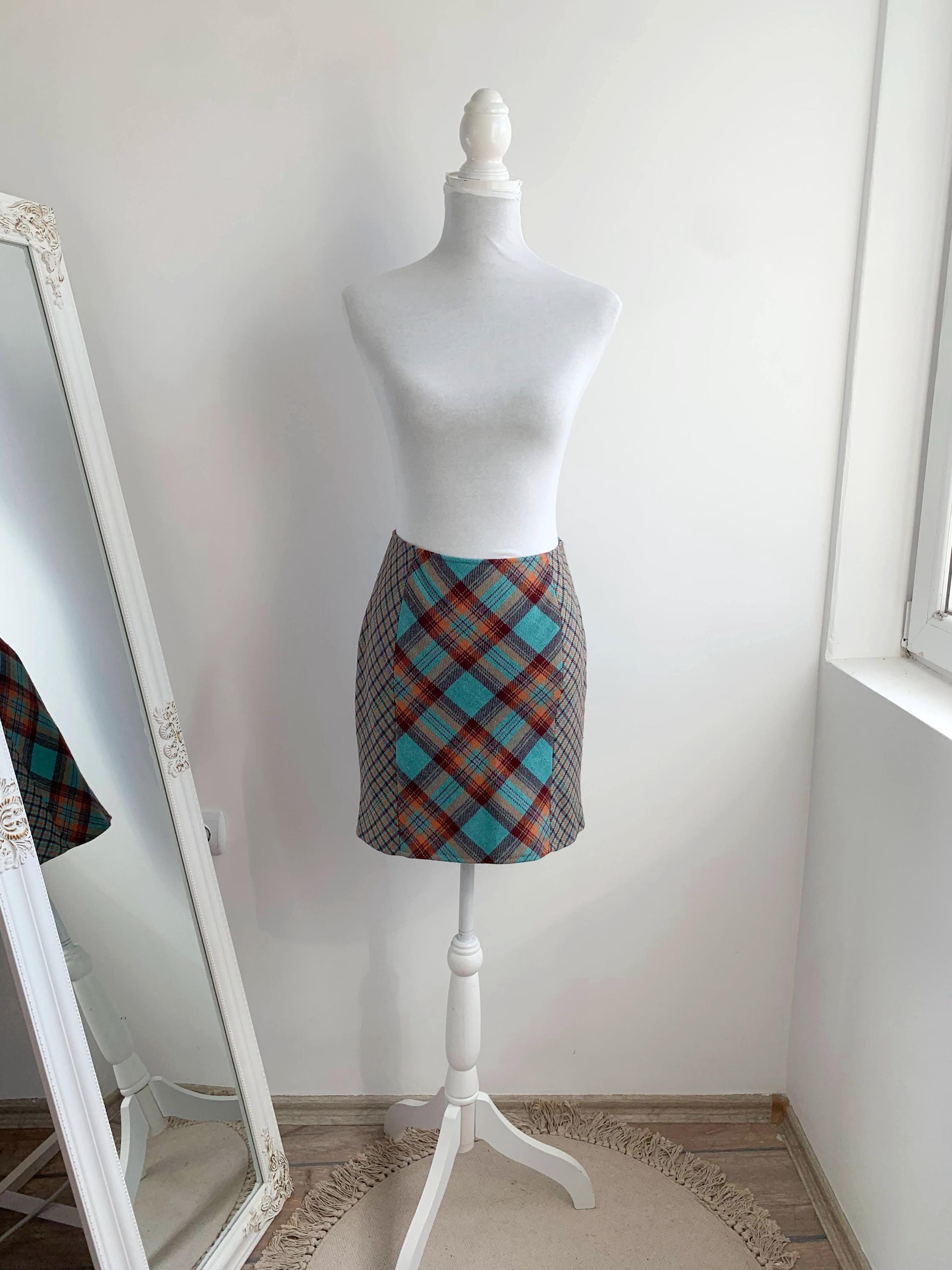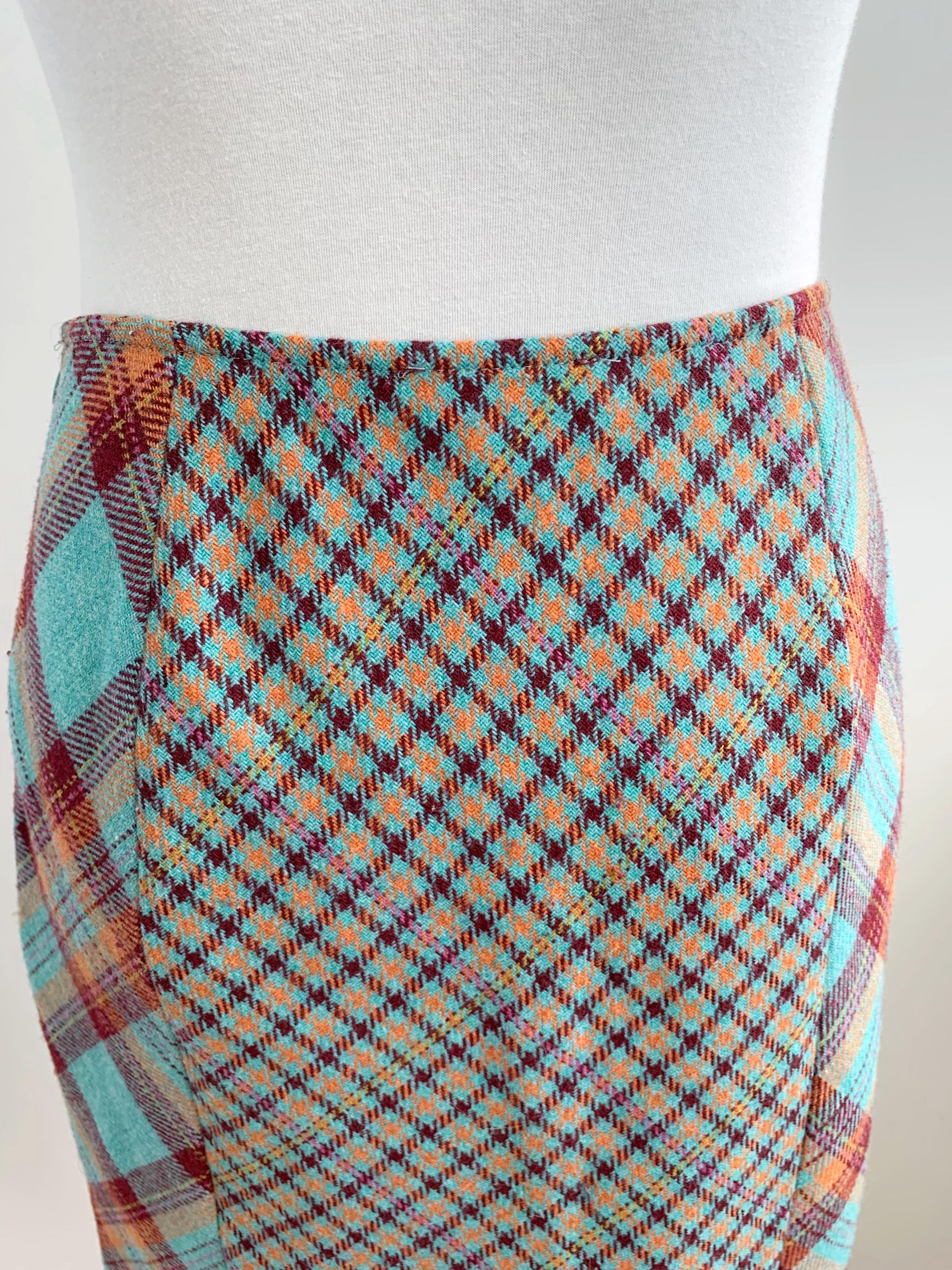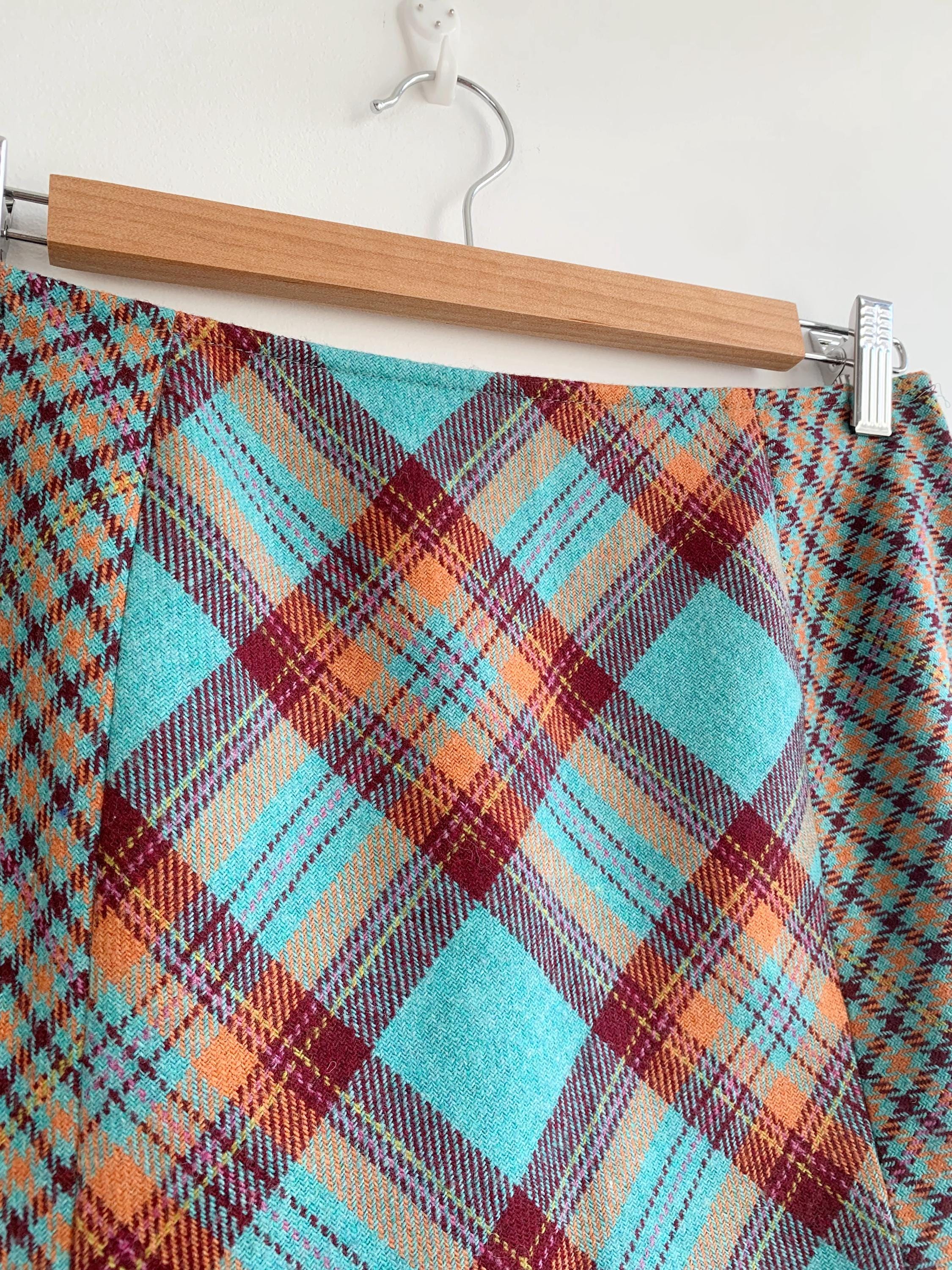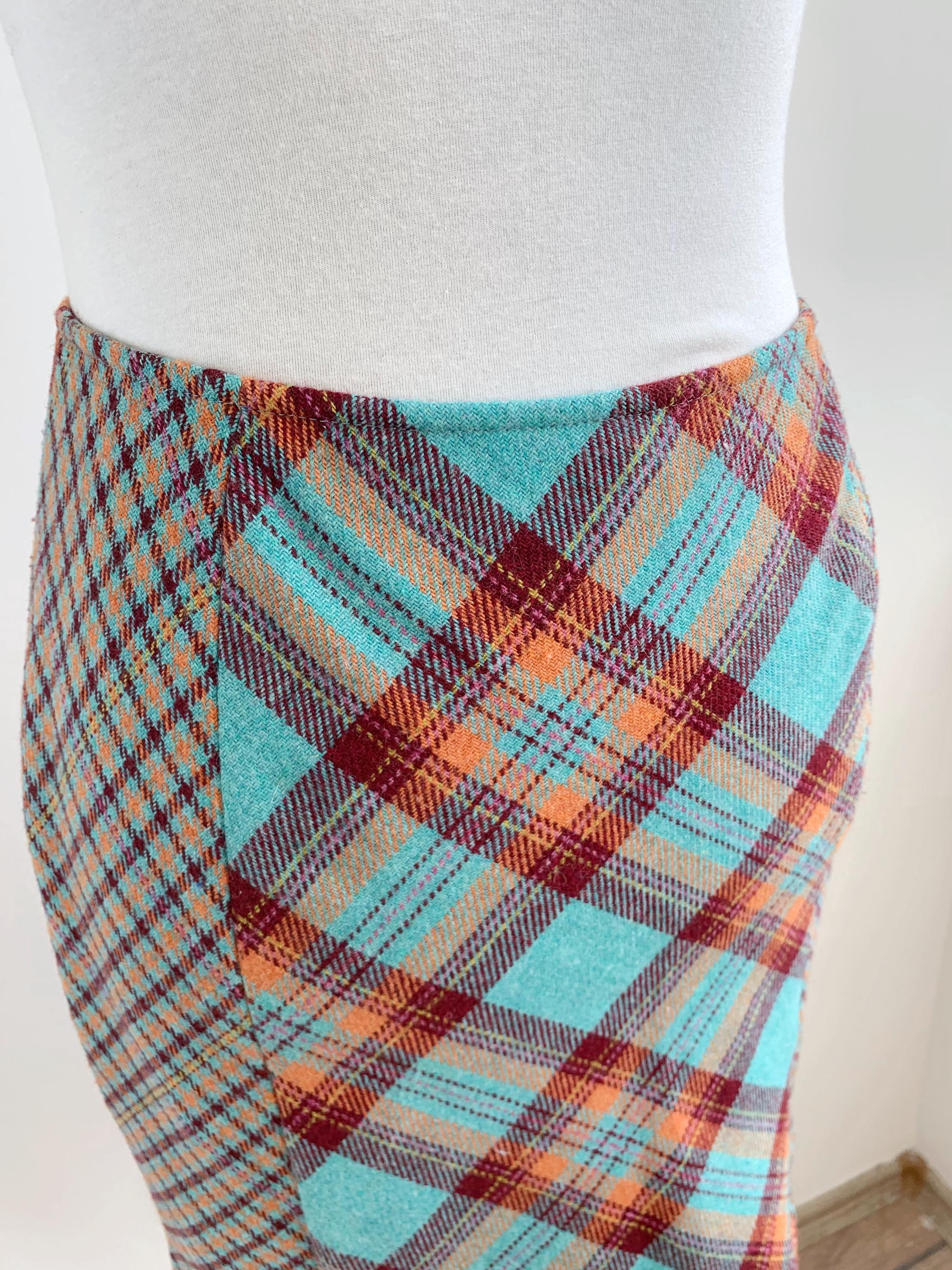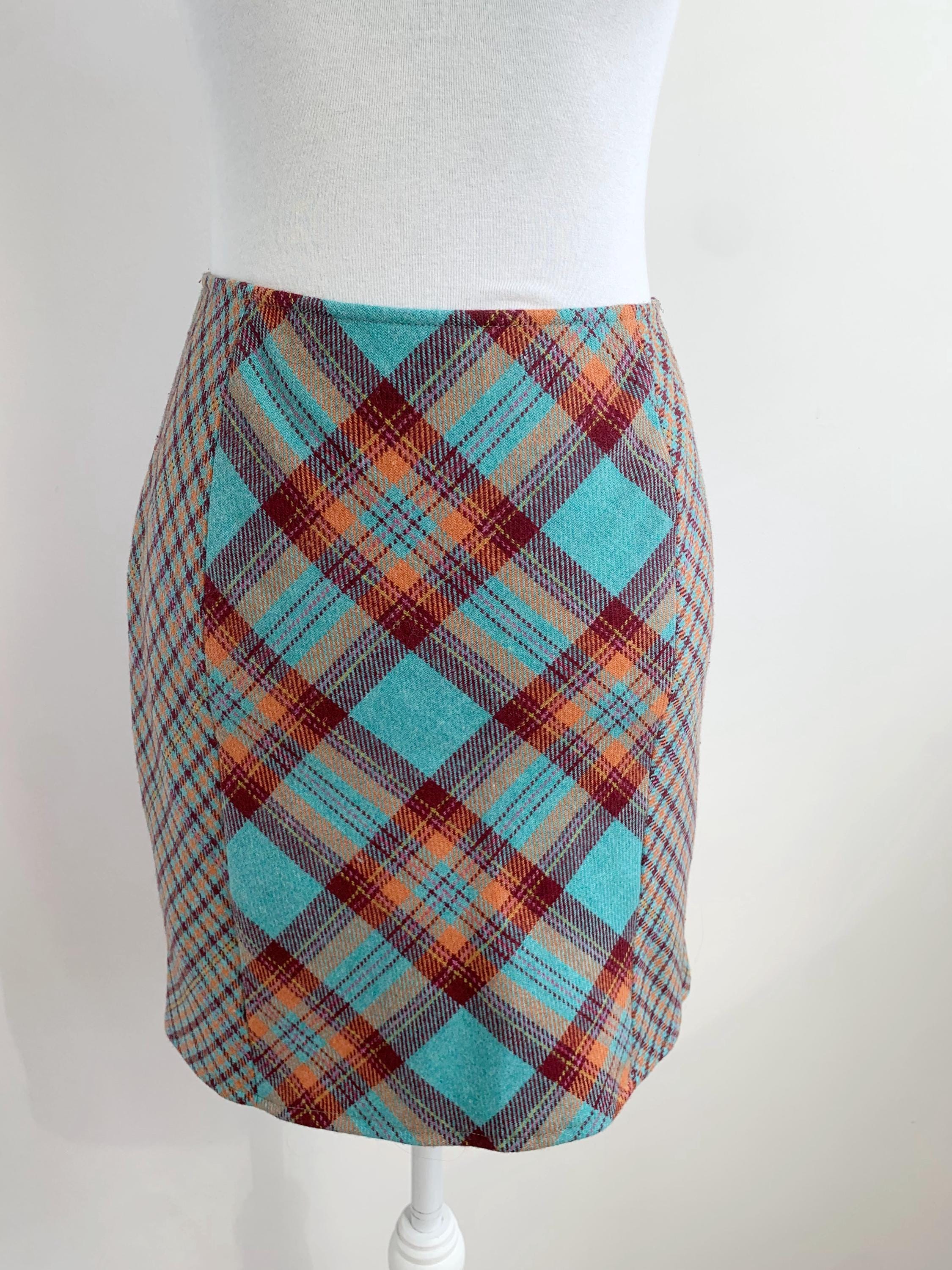 This tartan mini skirt features a vibrant and unusual multi-color plaid pattern, blending bold teal and orange with deep burgundy and neutral tones in a clever patchwork/paneled design. The contrasting center panel uses a tighter check pattern, offering a unique visual interest. Crafted in an ultra-flattering, slightly-fitted A-line silhouette, this high-waisted mini skirt closes with a concealed side zipper. It’s perfect for layering with tights, chunky boots, and an oversized knit for a cozy, stylish fall or winter look, or pairing with a fitted top for a true retro vibe. An authentic piece of vintage Kookai apparel that’s ready to become the statement piece of your sustainable wardrobe! Please ensure you check the precise measurements below for the best fit.