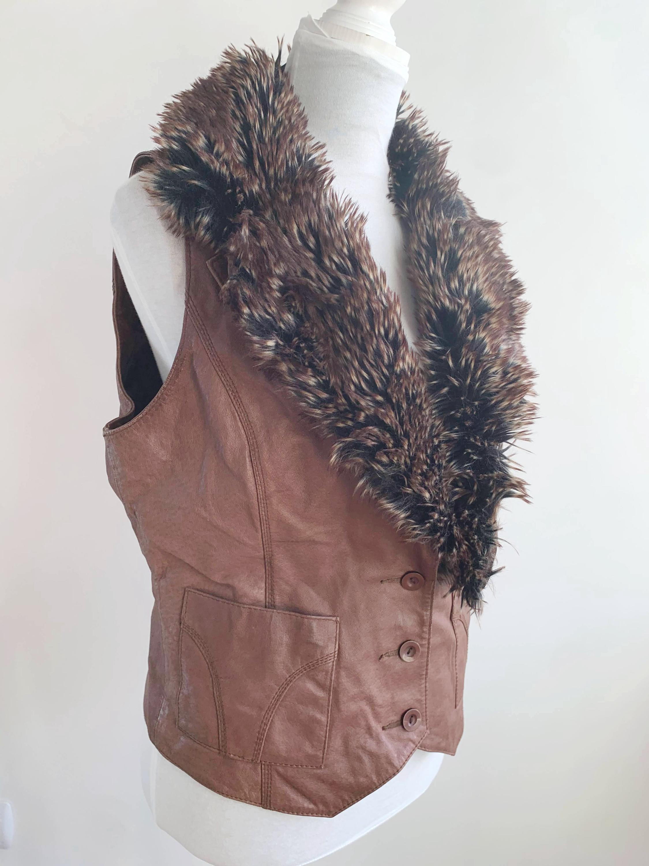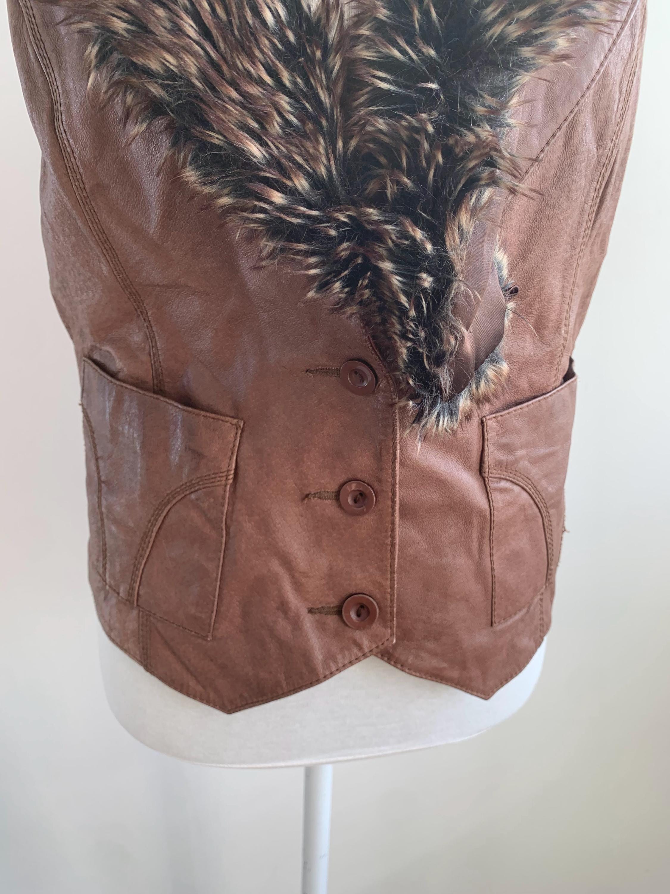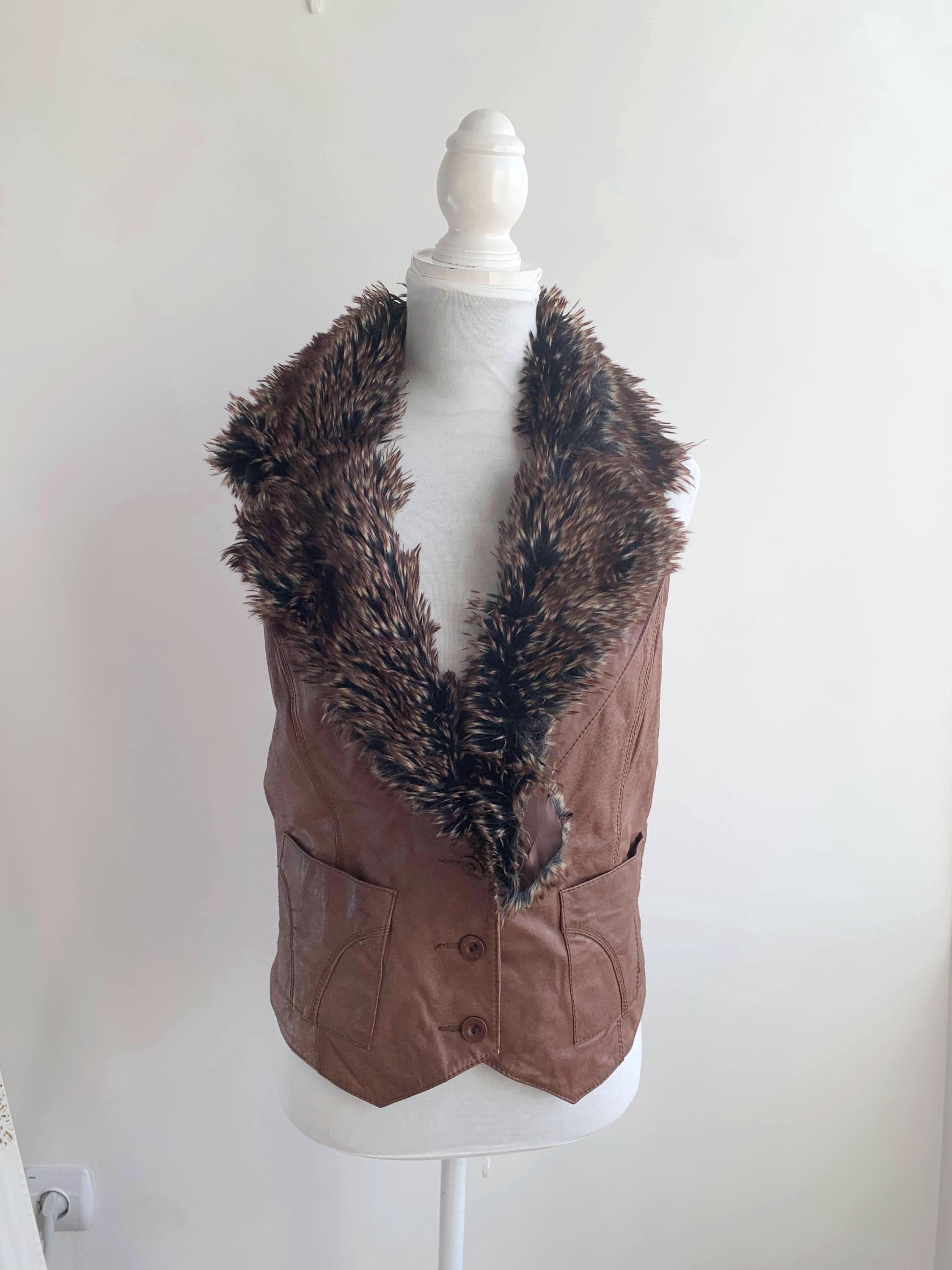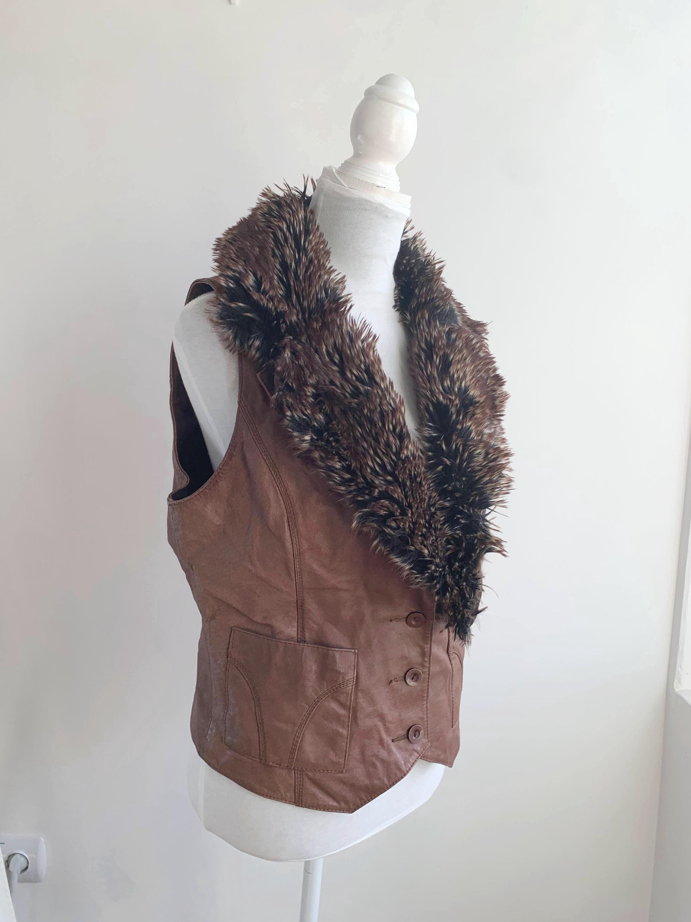 Embrace the cozy, rustic luxury of this fabulous vintage brown leather vest. This statement piece features soft, genuine leather in a rich chestnut color, beautifully contrasted by an oversized, shaggy faux fur collar. It perfectly blends the rugged charm of Western style with the free-spirited vibes of 70s boho-chic and the layering trend of the Y2K era.