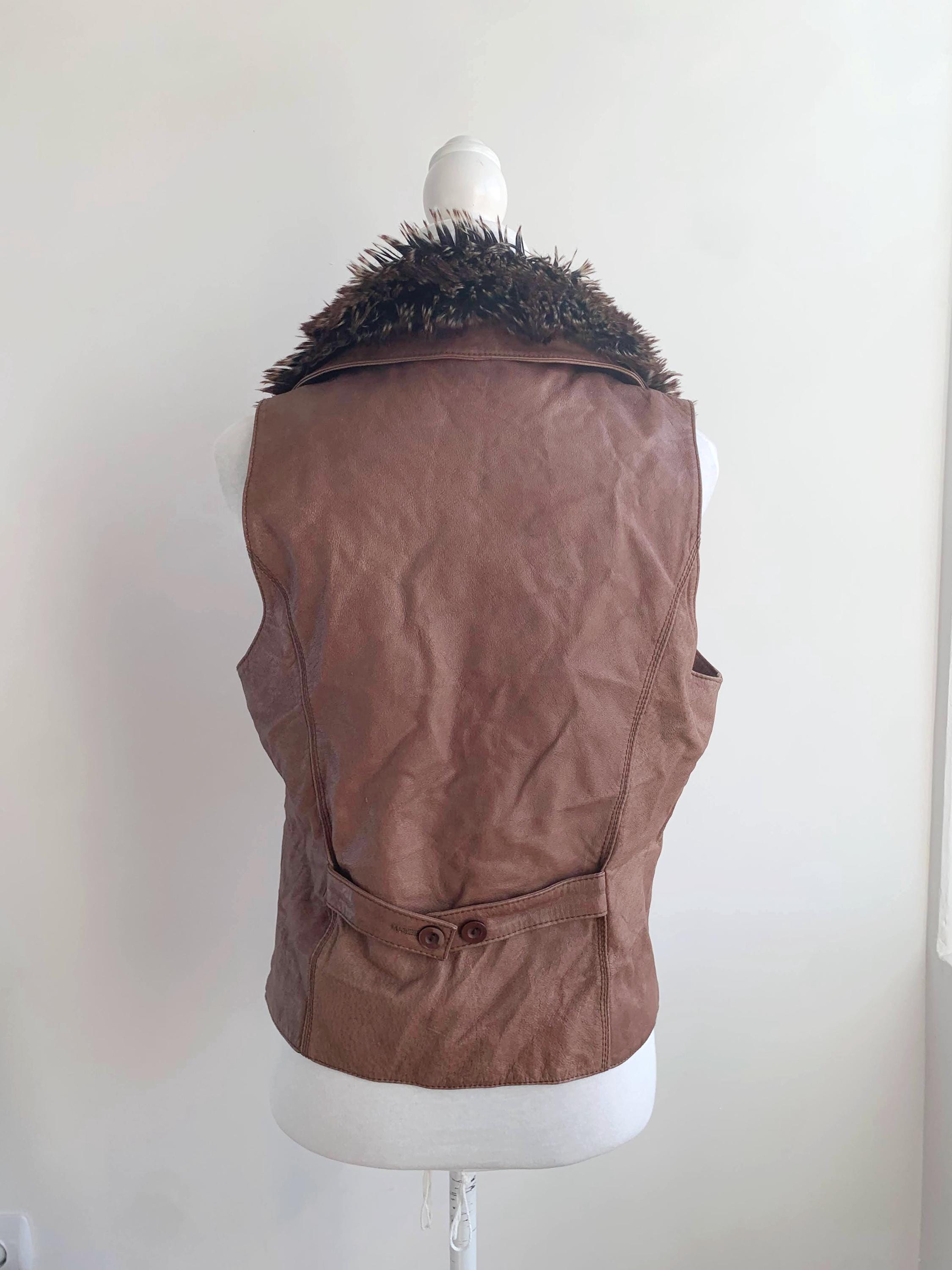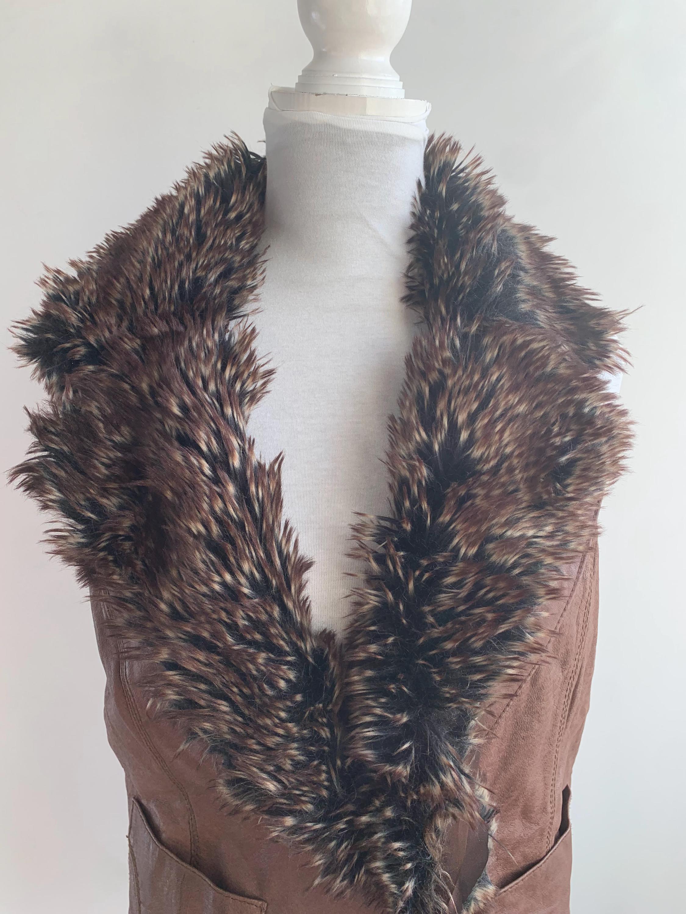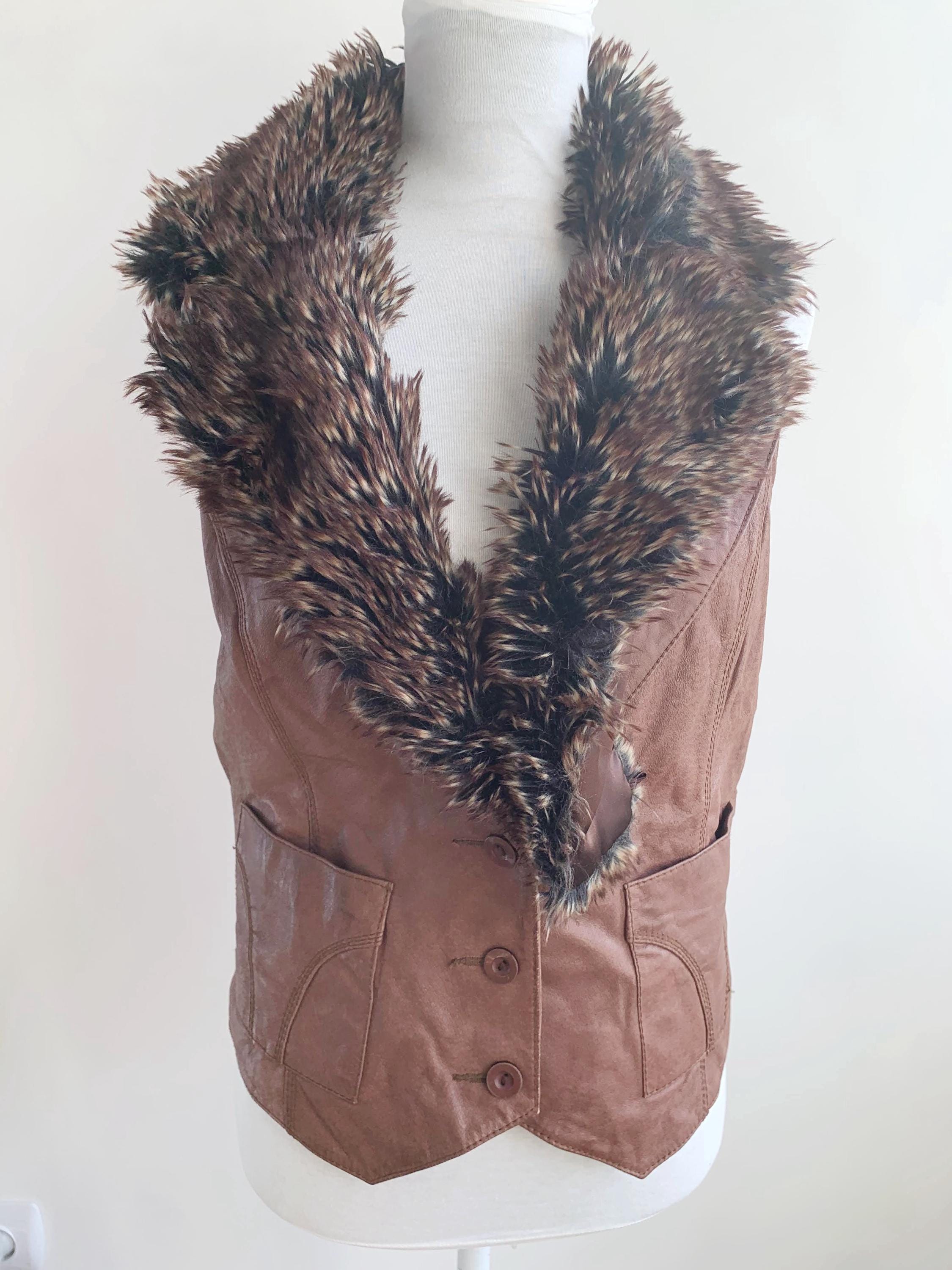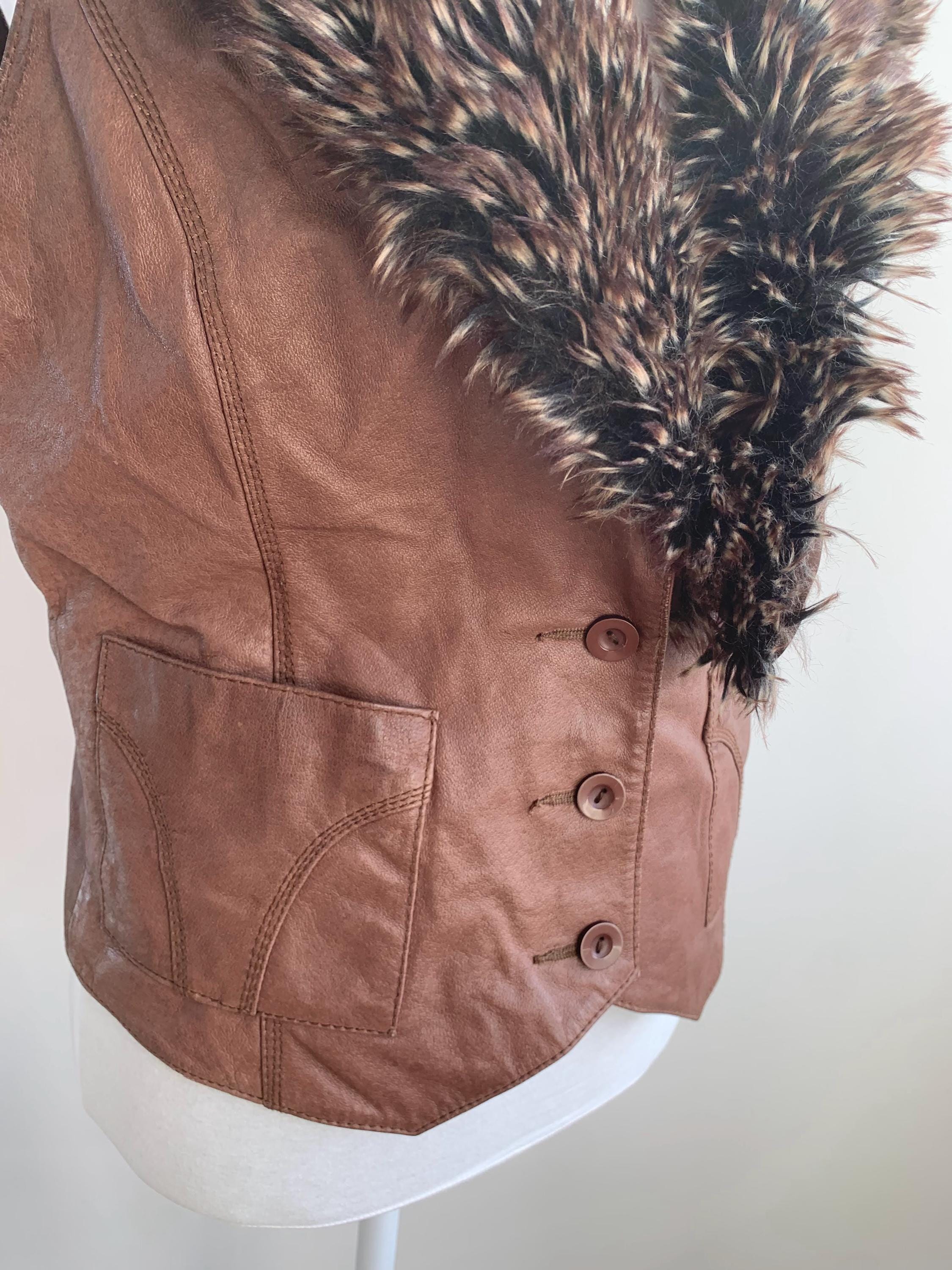 Embrace the cozy, rustic luxury of this fabulous vintage brown leather vest. This statement piece features soft, genuine leather in a rich chestnut color, beautifully contrasted by an oversized, shaggy faux fur collar. It perfectly blends the rugged charm of Western style with the free-spirited vibes of 70s boho-chic and the layering trend of the Y2K era.