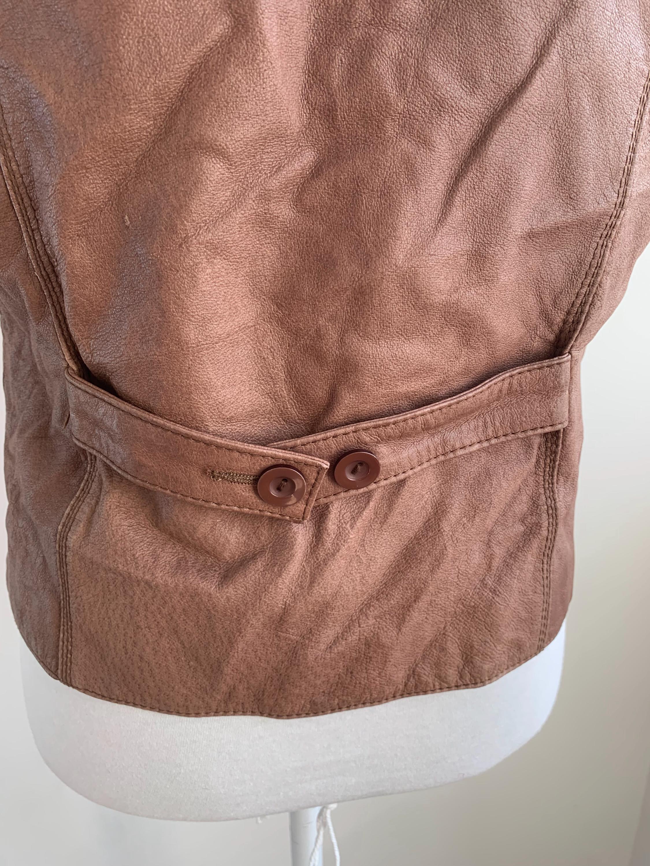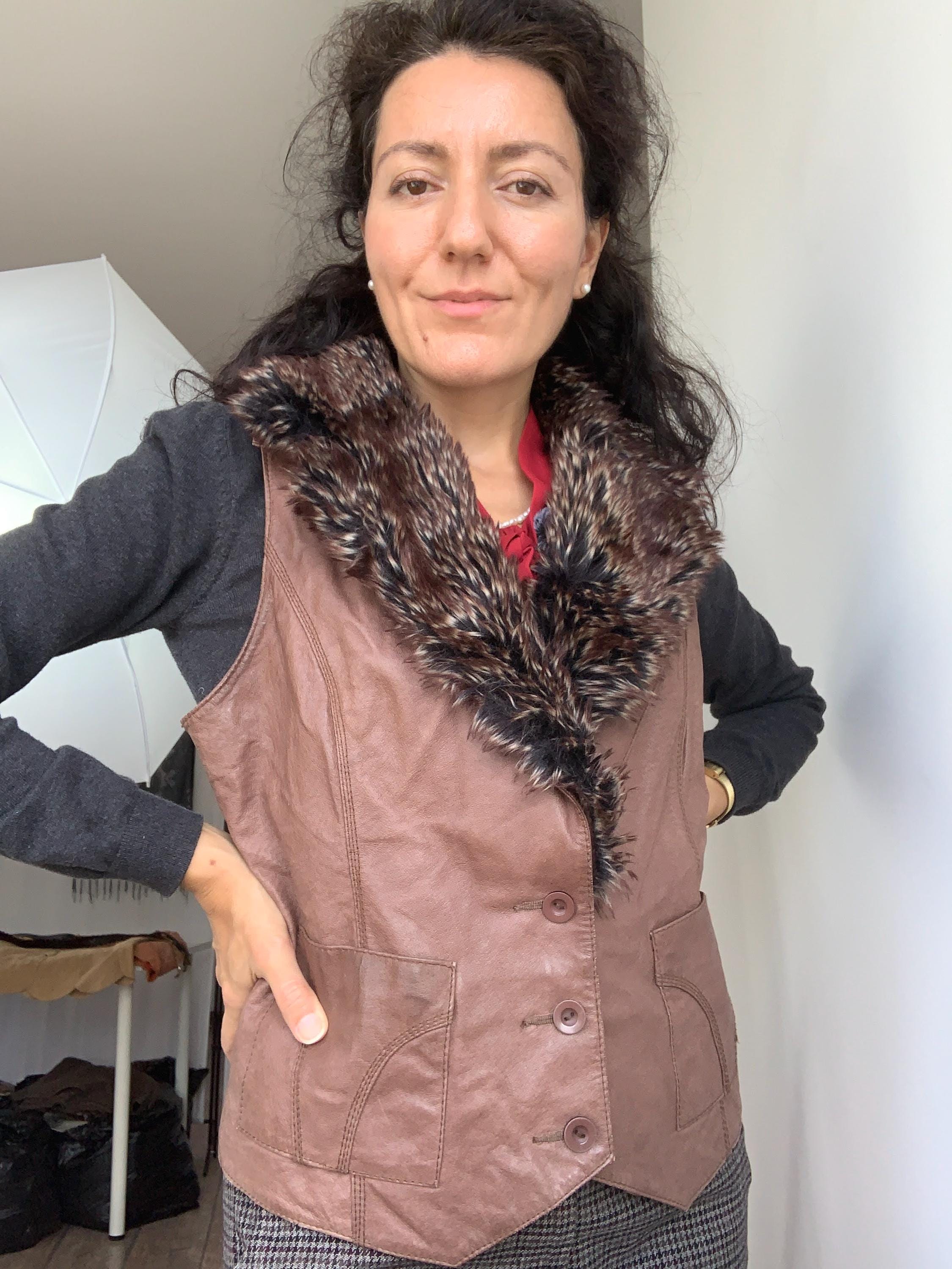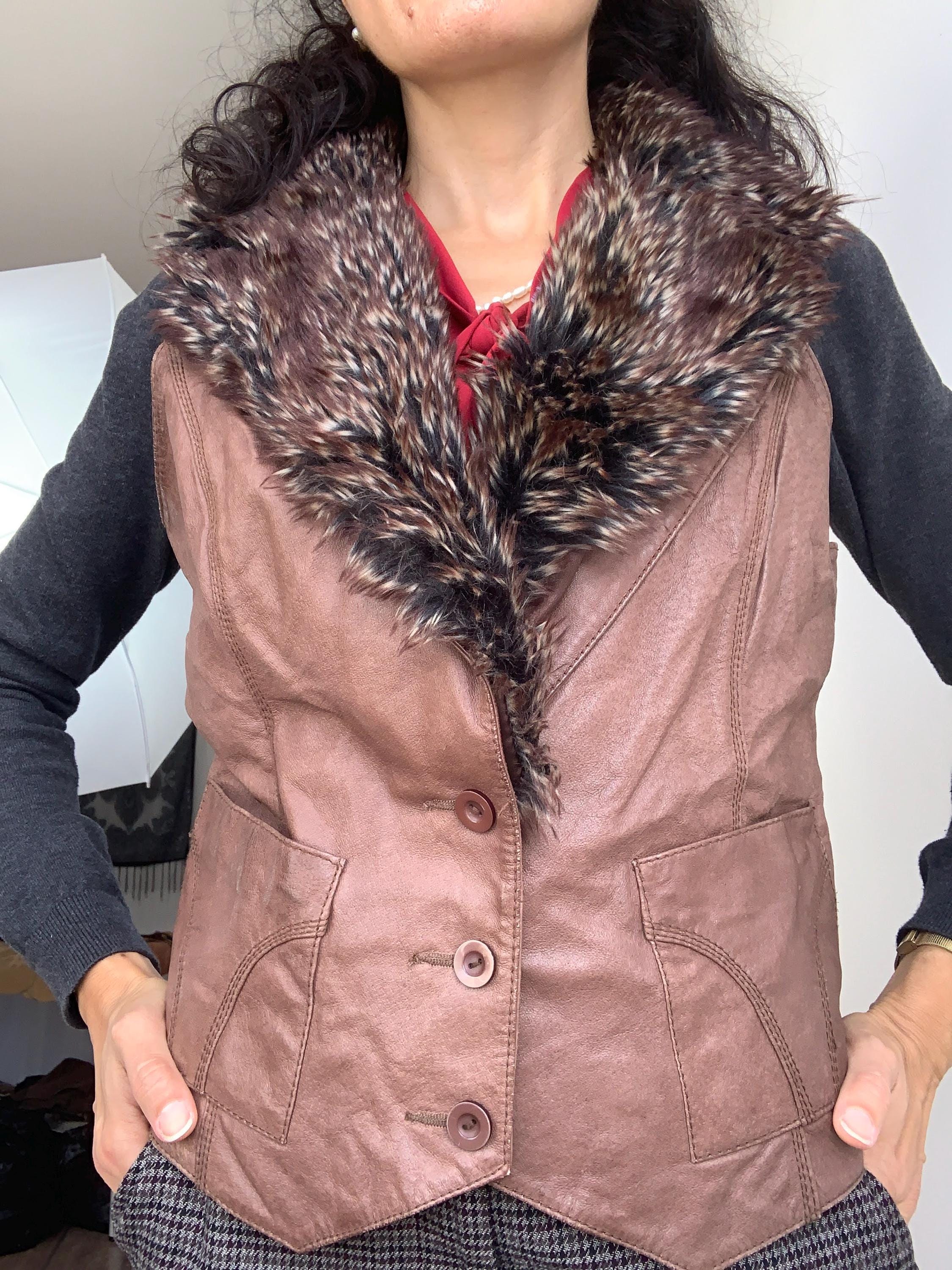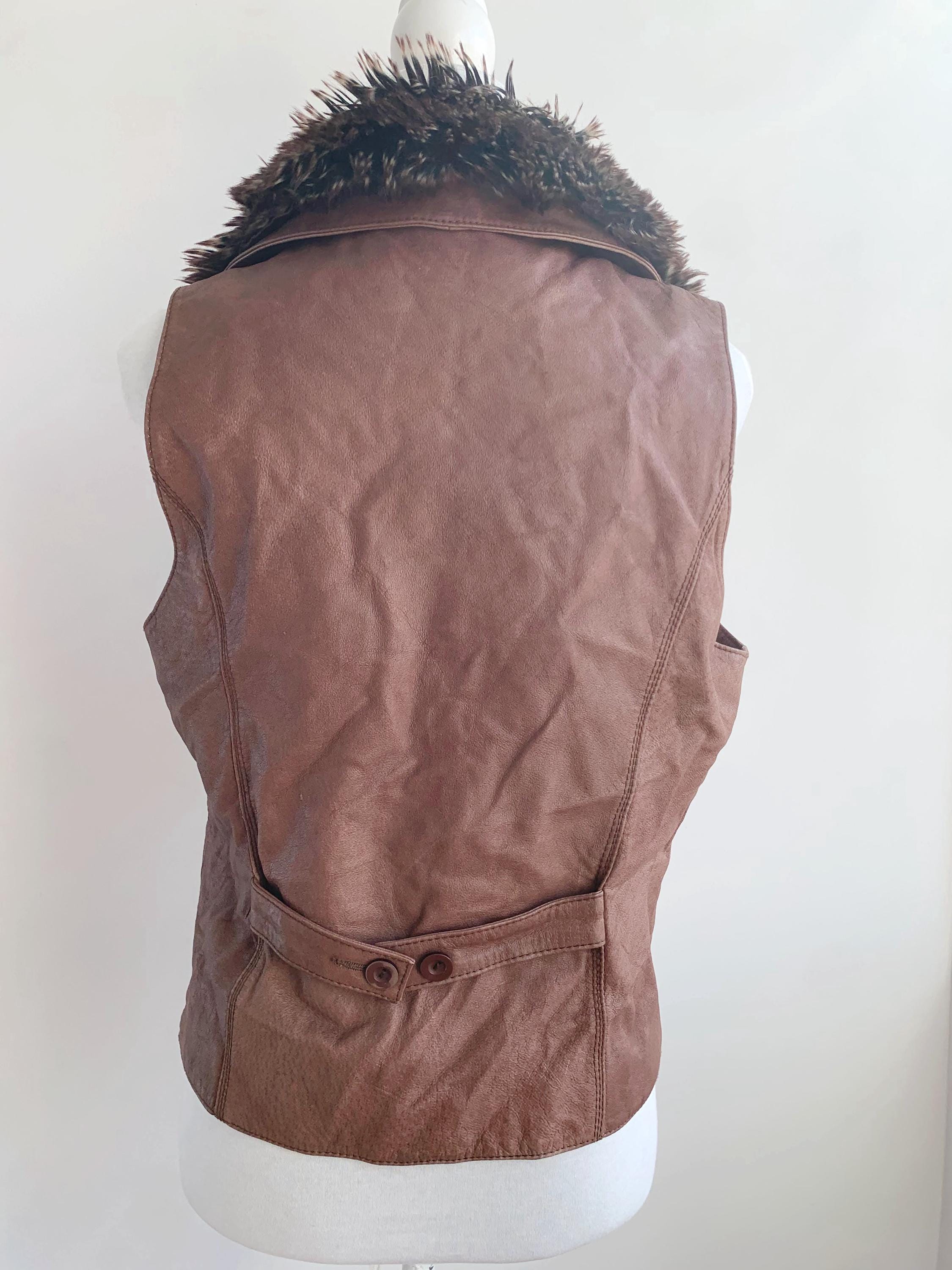 Embrace the cozy, rustic luxury of this fabulous vintage brown leather vest. This statement piece features soft, genuine leather in a rich chestnut color, beautifully contrasted by an oversized, shaggy faux fur collar. It perfectly blends the rugged charm of Western style with the free-spirited vibes of 70s boho-chic and the layering trend of the Y2K era.