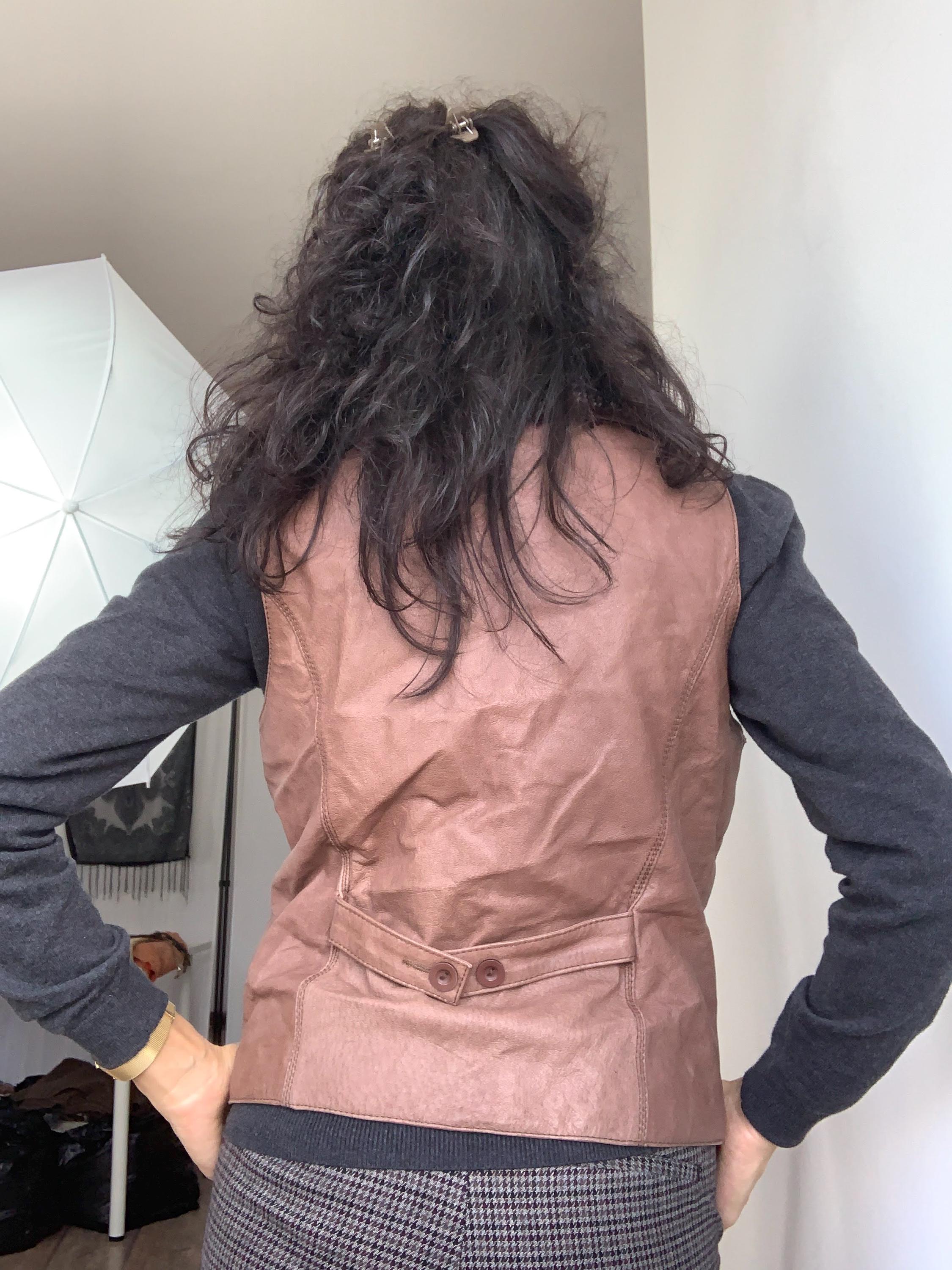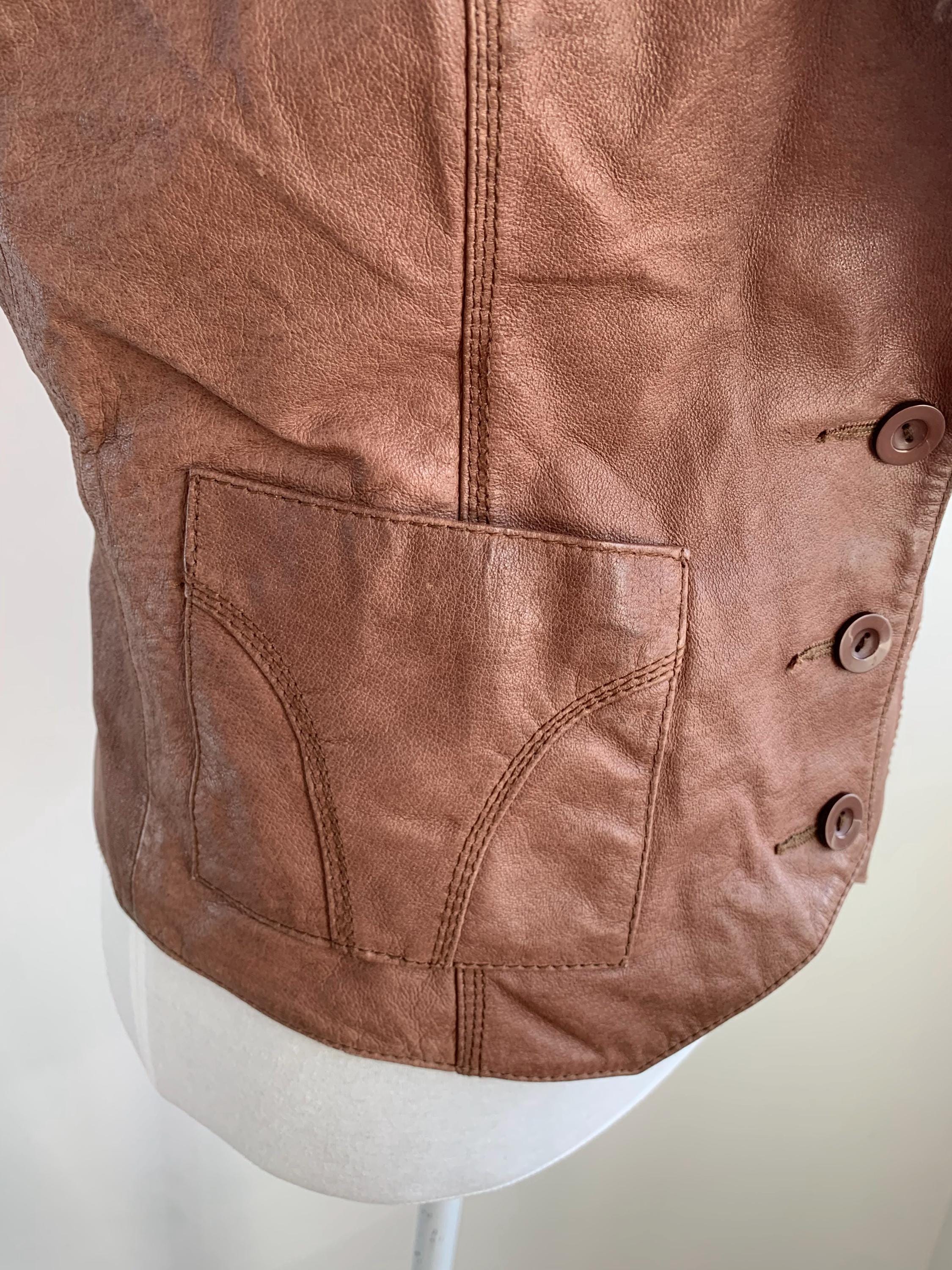 The vest is fully lined with a silky polyester fabric and features a classic button-down front, two functional front pockets, and an adjustable strap detail at the back waist. The genuine leather waistcoat is perfect for layering over a sweater or blouse to add texture and warmth to any transitional outfit. A unique and high-quality addition to any wardrobe, this piece is an excellent choice for sustainable fashion lovers and collectors of authentic vintage statement wear.