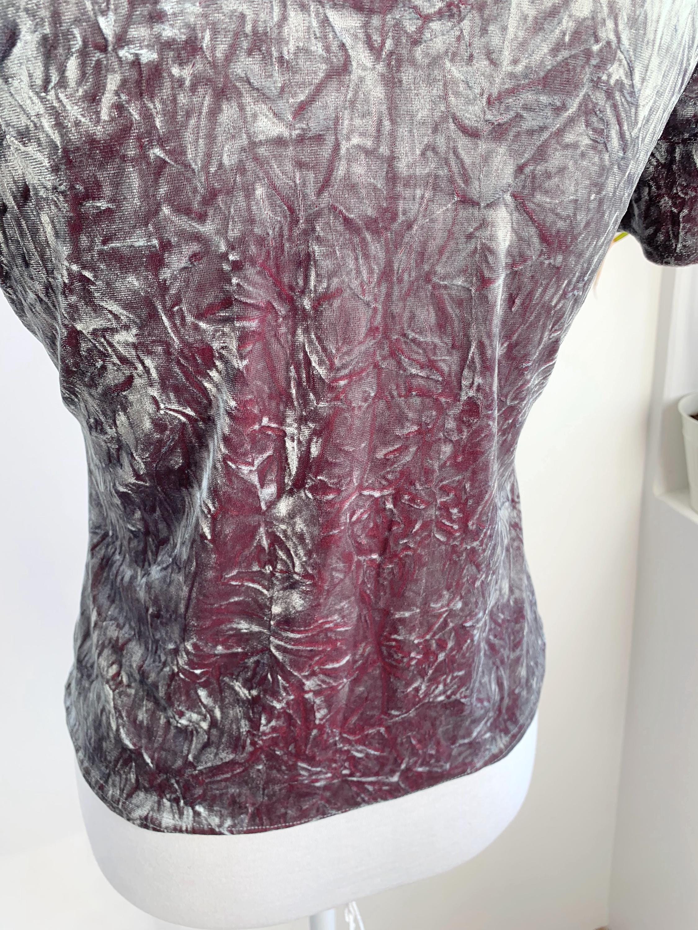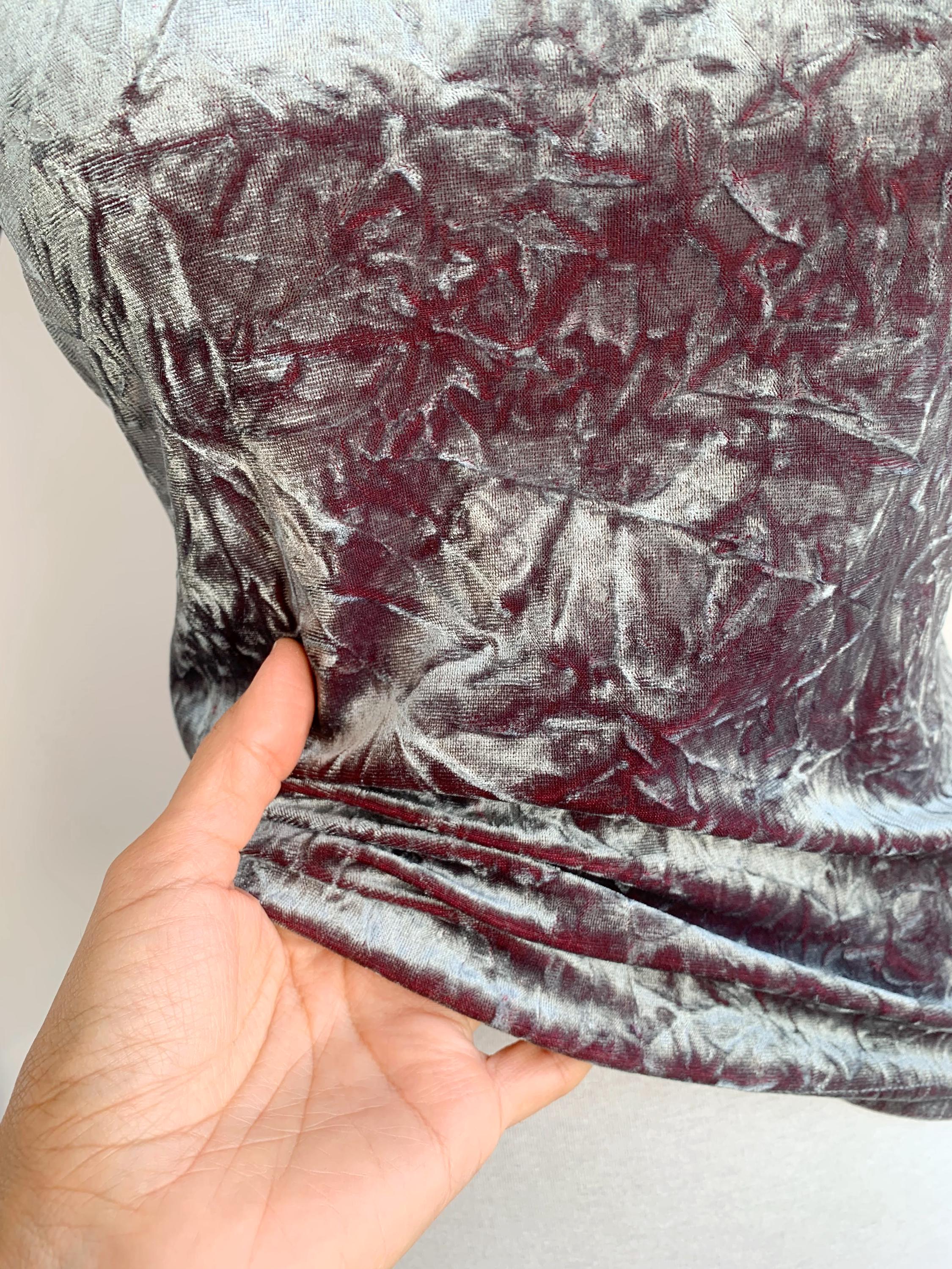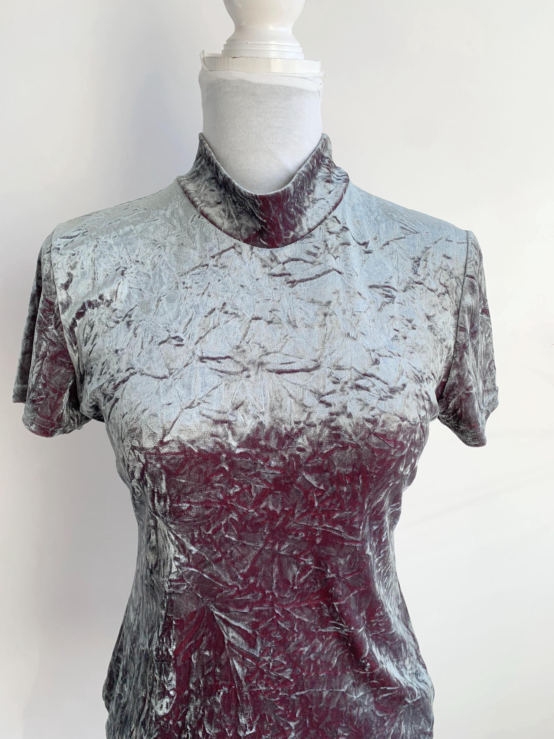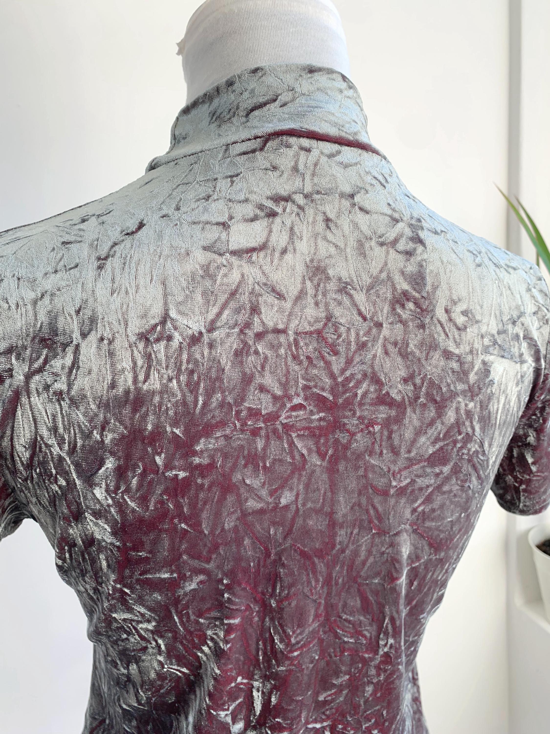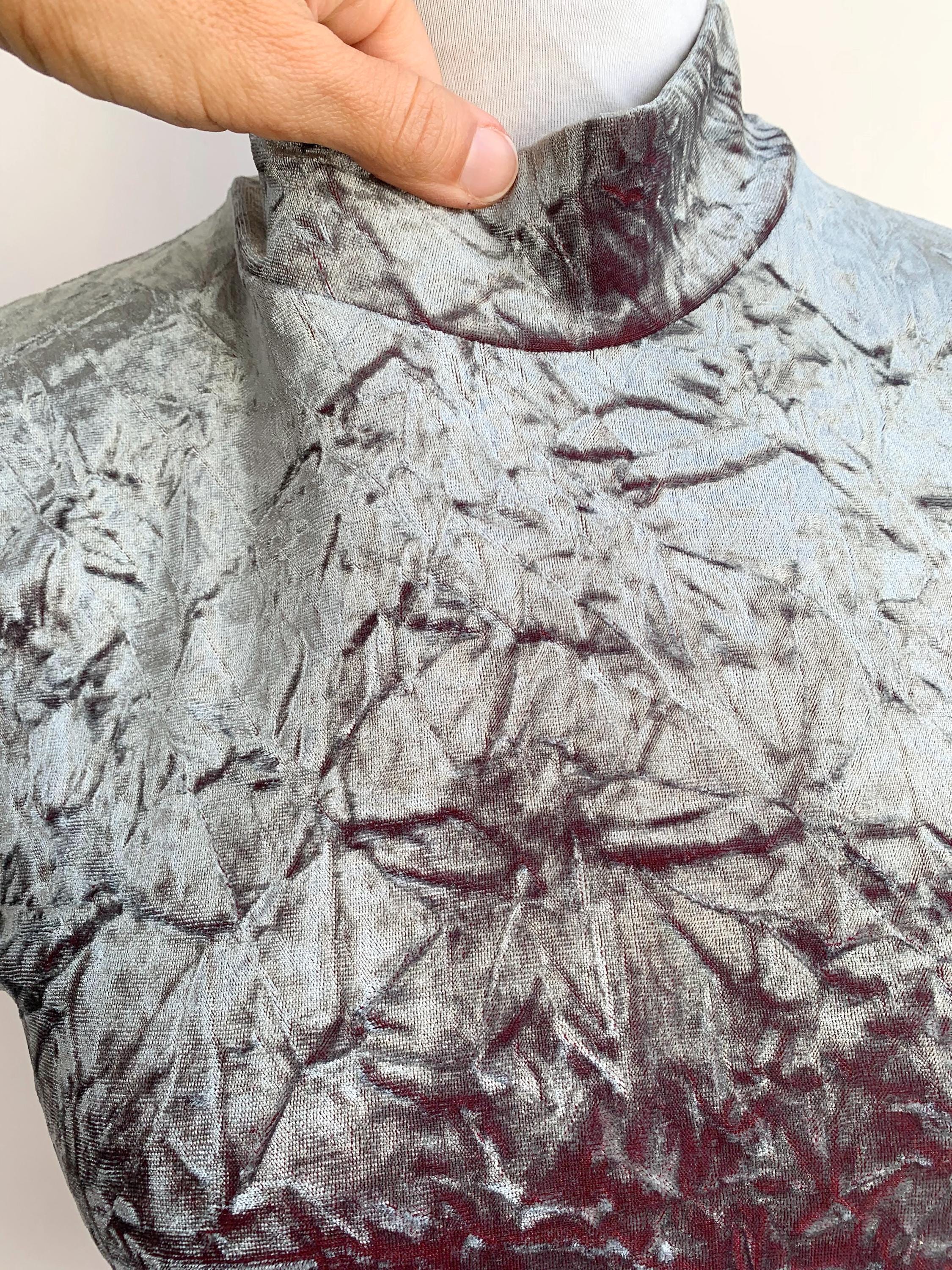 The fabric is incredibly soft and stretchy, allowing for a comfortable and figure-flattering fit that accommodates a range of sizes (S to M). The rich, jewel-toned magenta/burgundy reverse color adds depth to the crushed texture, making the metallic top shimmer beautifully as you move. This is a must-have for anyone looking to incorporate authentic vintage clubwear, grunge, or cyber-y2k aesthetics into their wardrobe or for a unique festival look. Layer it under a slip dress or wear it simply with high-waisted trousers—this velvet turtleneck is sure to turn heads!