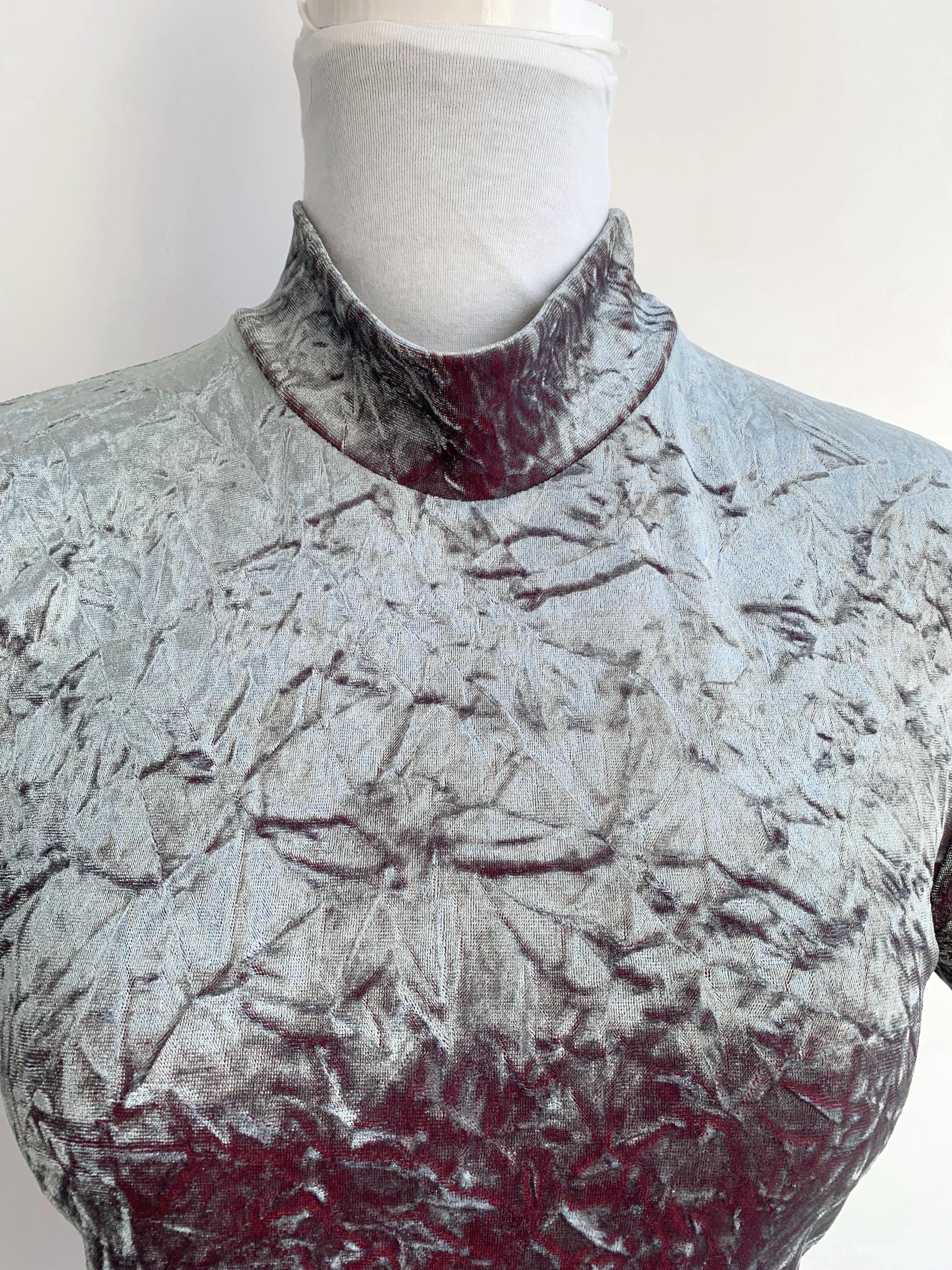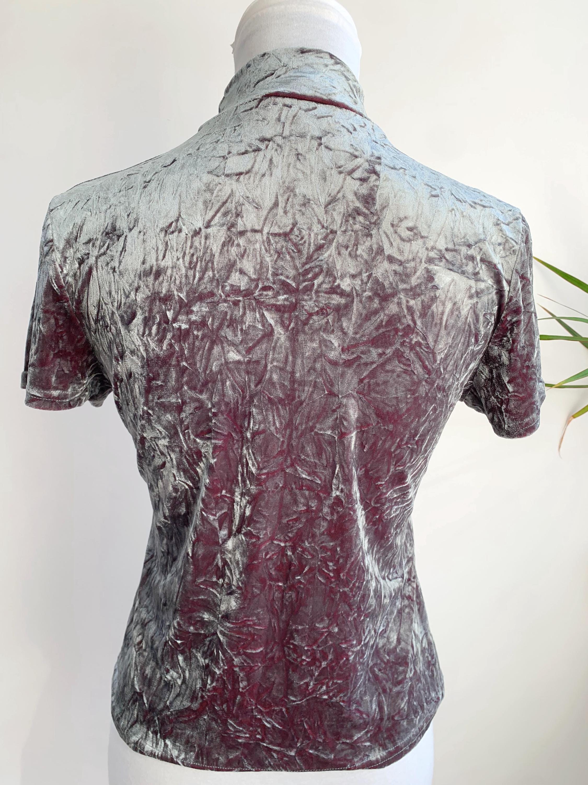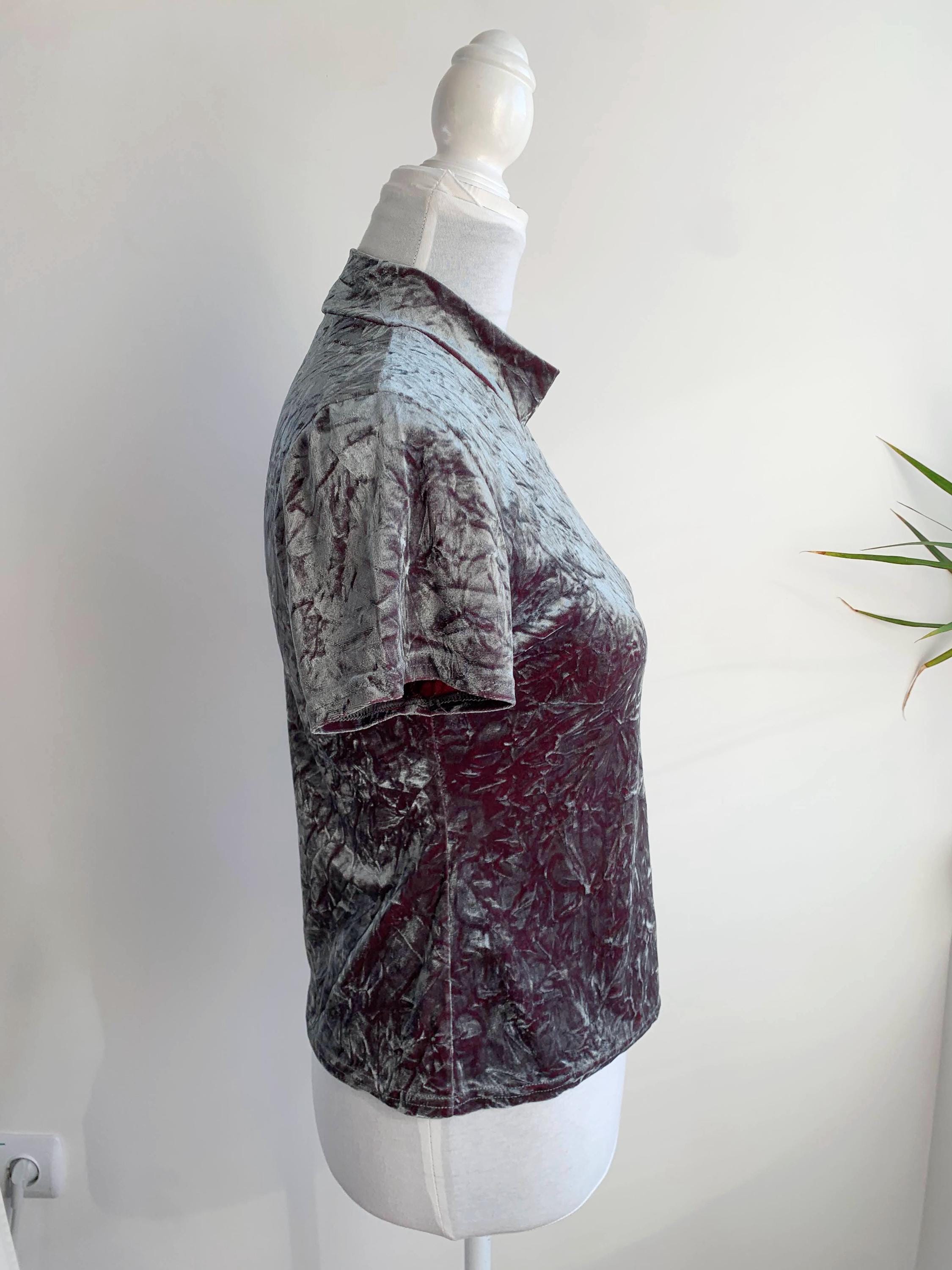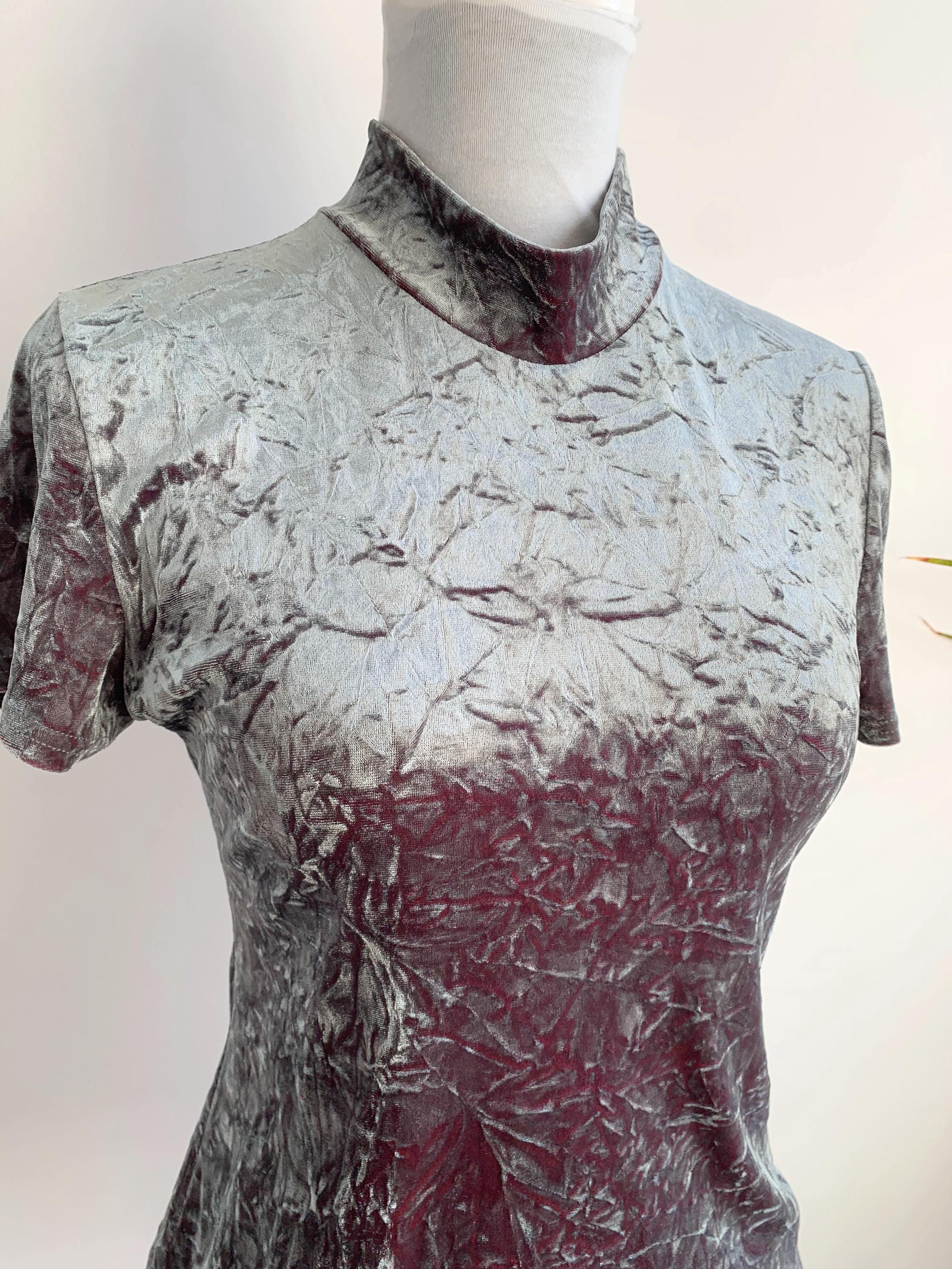 The fabric is incredibly soft and stretchy, allowing for a comfortable and figure-flattering fit that accommodates a range of sizes (S to M). The rich, jewel-toned magenta/burgundy reverse color adds depth to the crushed texture, making the metallic top shimmer beautifully as you move. This is a must-have for anyone looking to incorporate authentic vintage clubwear, grunge, or cyber-y2k aesthetics into their wardrobe or for a unique festival look. Layer it under a slip dress or wear it simply with high-waisted trousers—this velvet turtleneck is sure to turn heads!