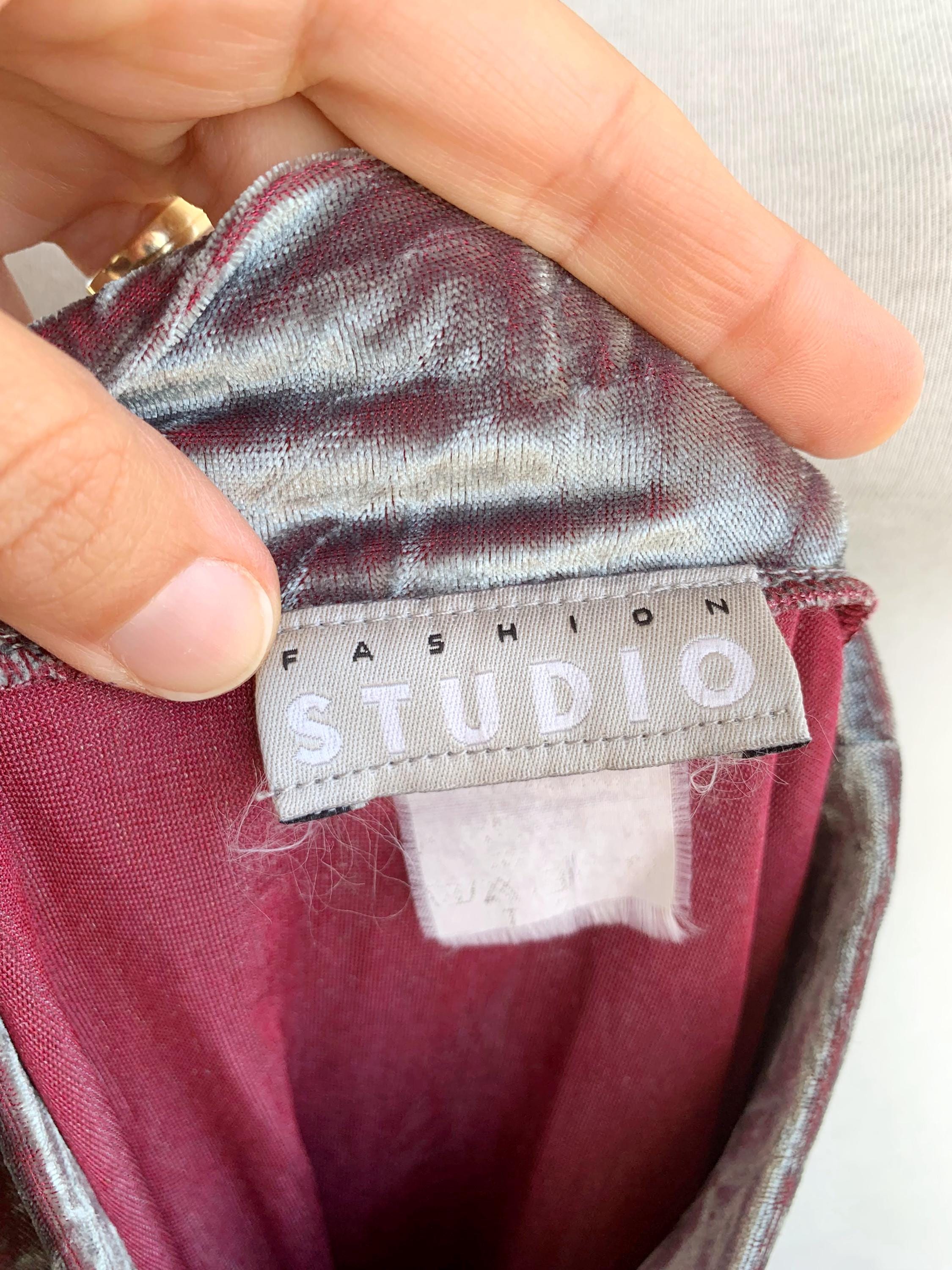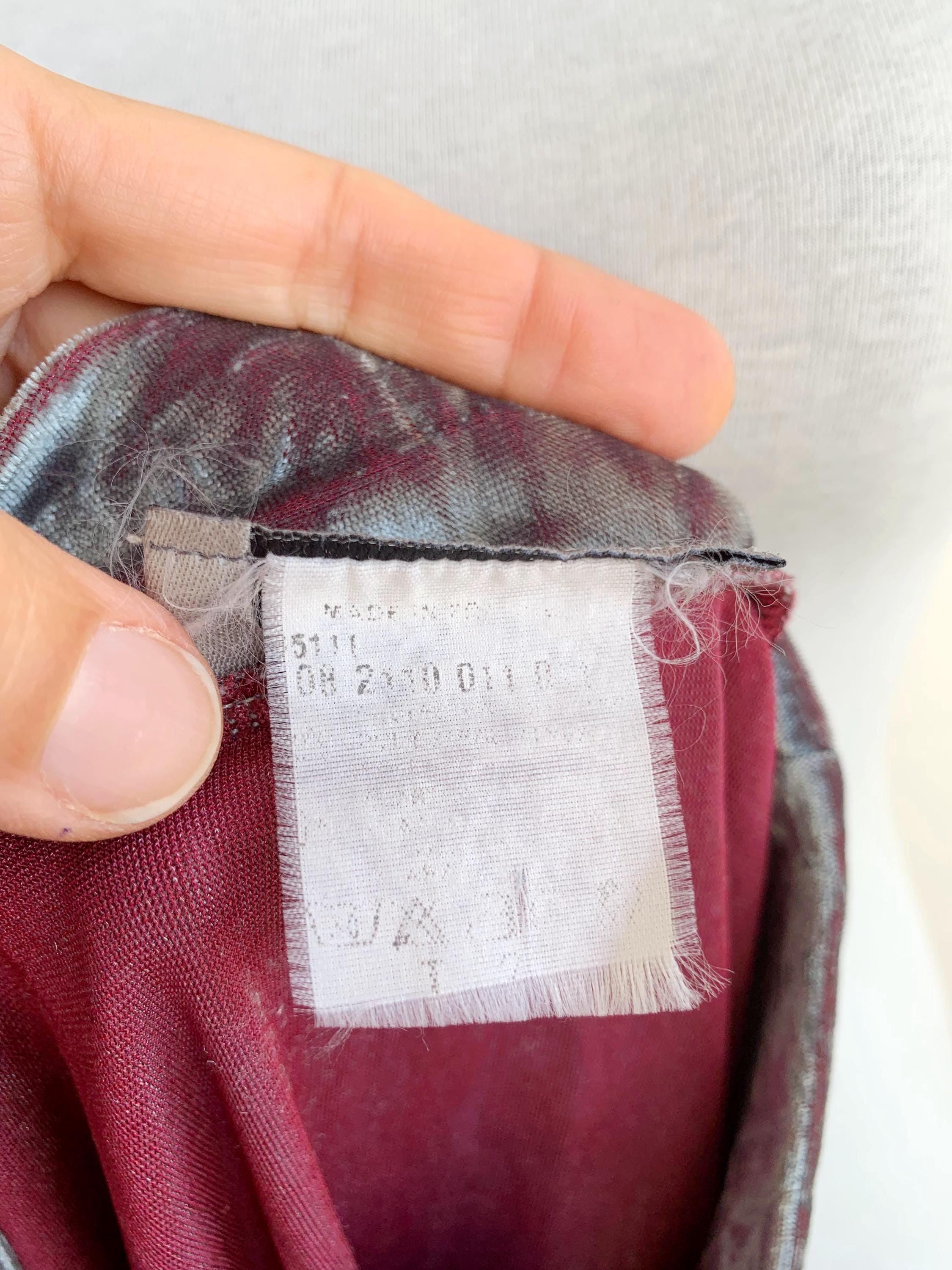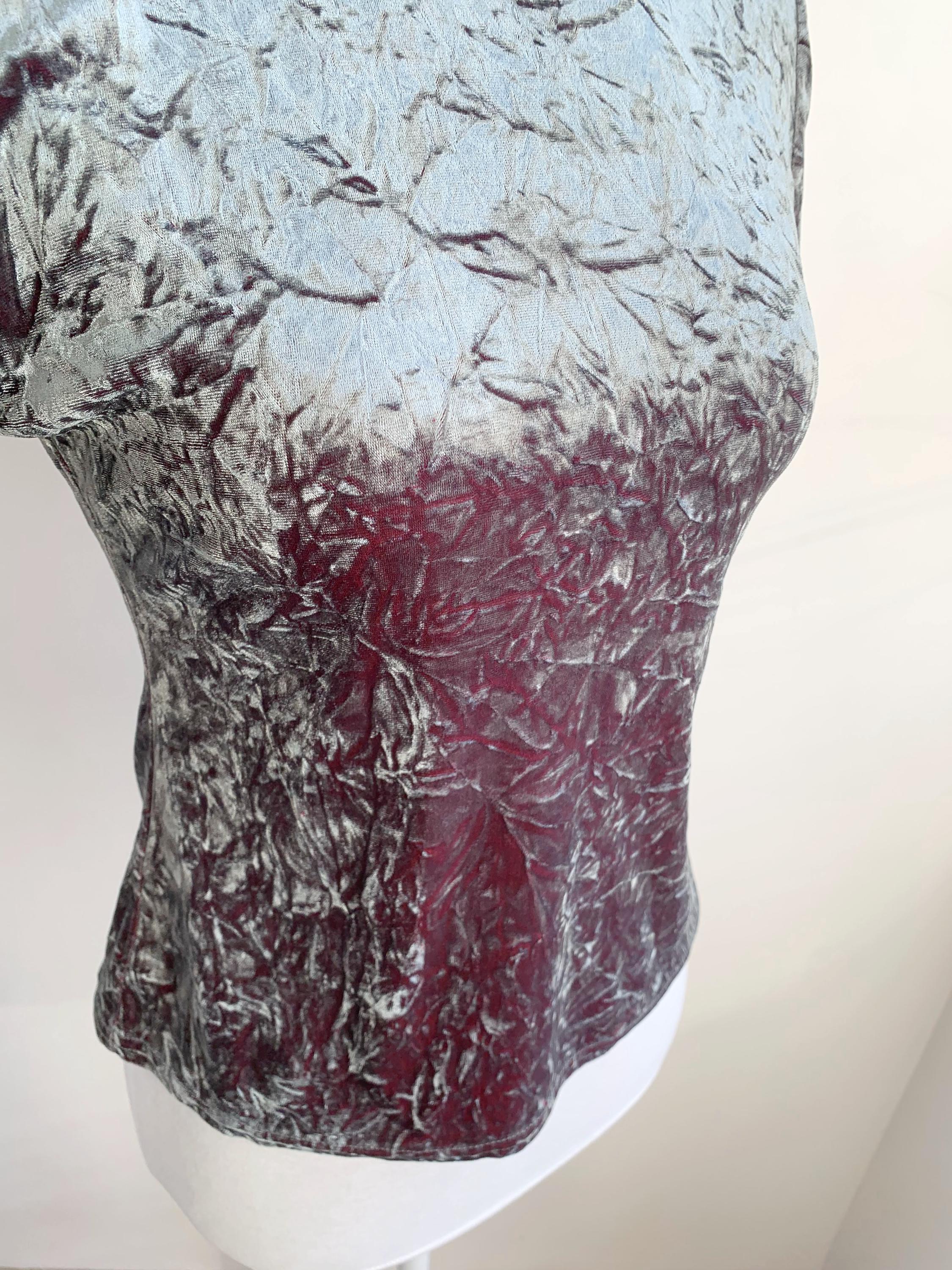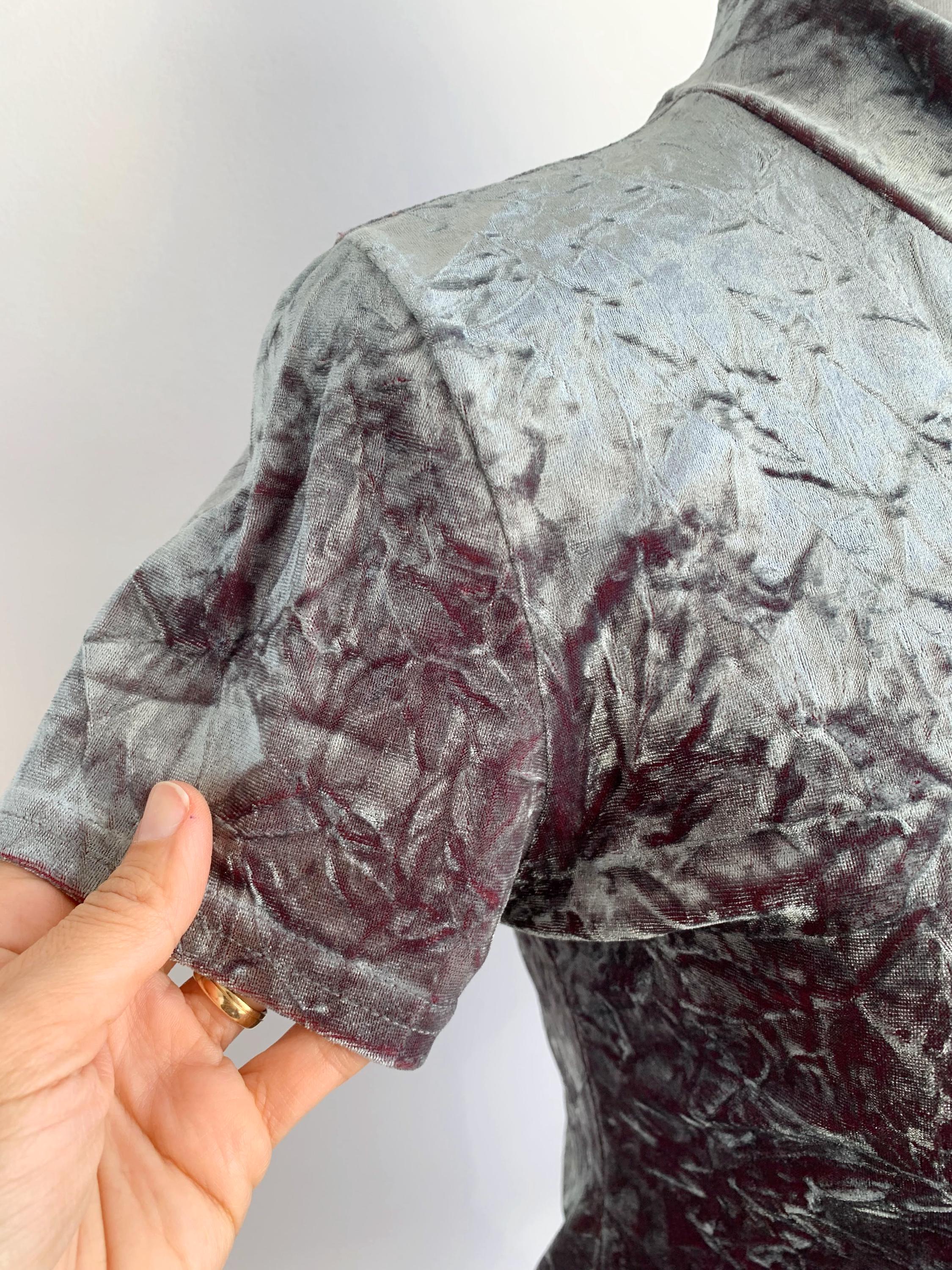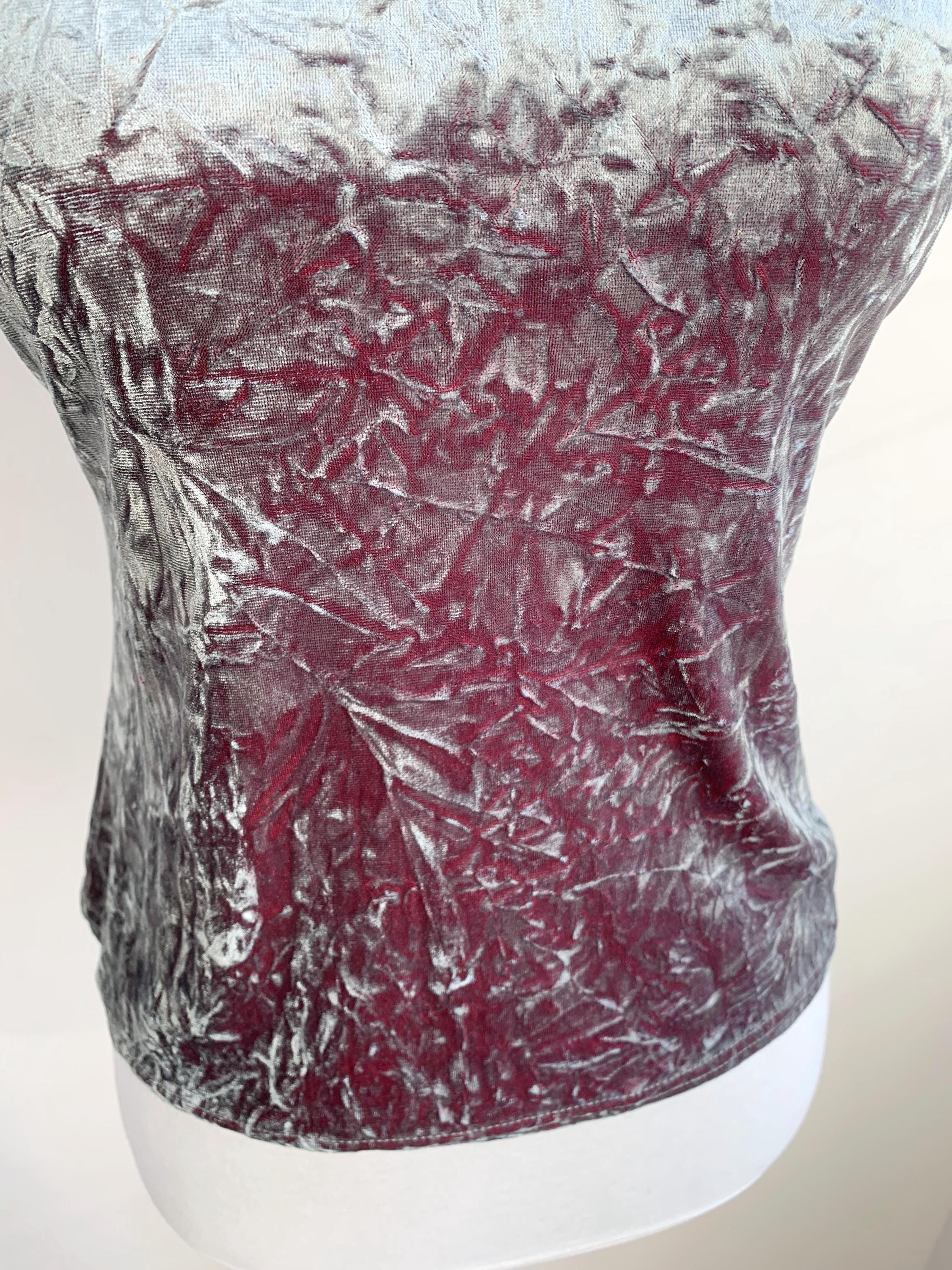 The fabric is incredibly soft and stretchy, allowing for a comfortable and figure-flattering fit that accommodates a range of sizes (S to M). The rich, jewel-toned magenta/burgundy reverse color adds depth to the crushed texture, making the metallic top shimmer beautifully as you move. This is a must-have for anyone looking to incorporate authentic vintage clubwear, grunge, or cyber-y2k aesthetics into their wardrobe or for a unique festival look. Layer it under a slip dress or wear it simply with high-waisted trousers—this velvet turtleneck is sure to turn heads!
