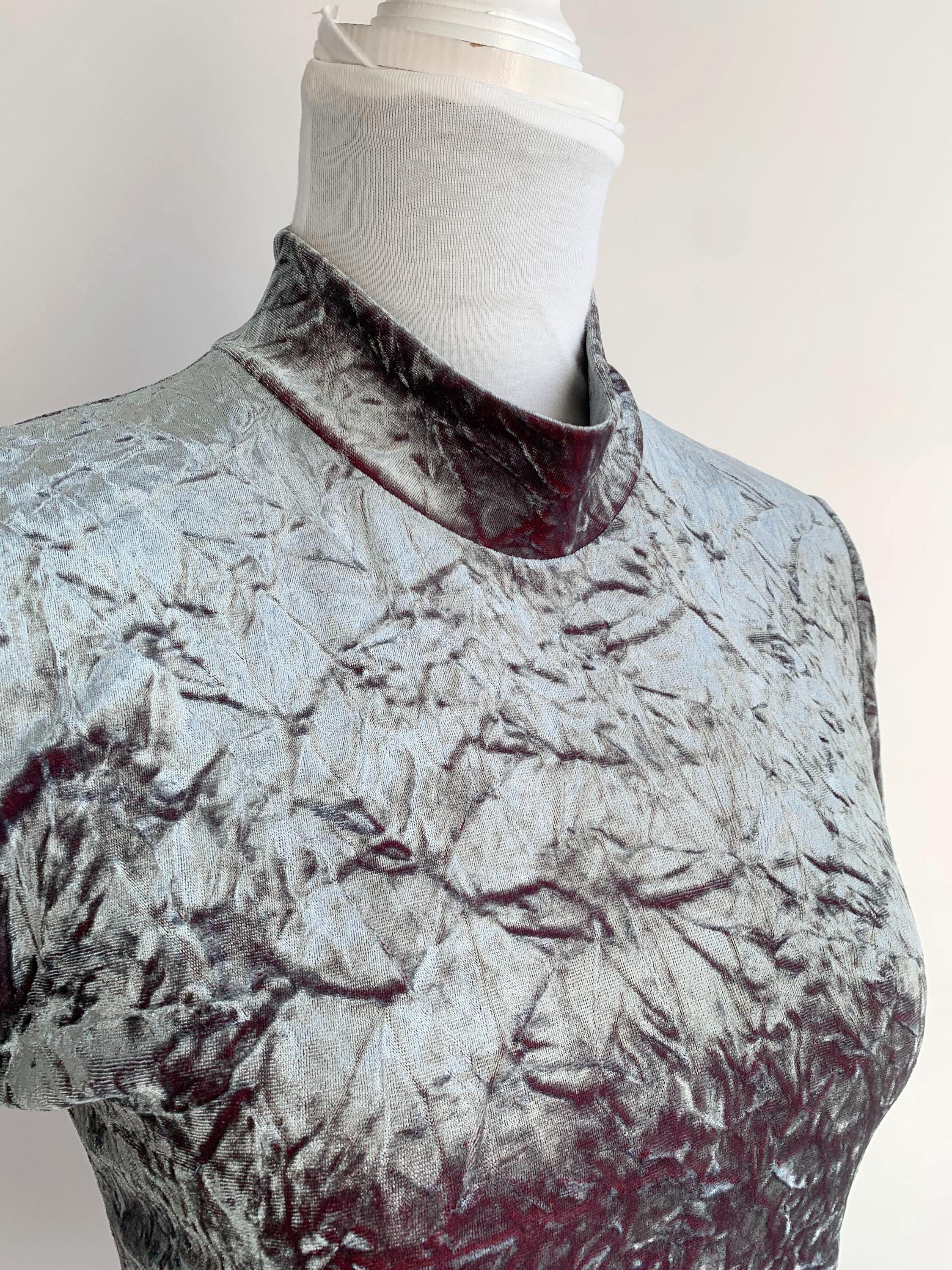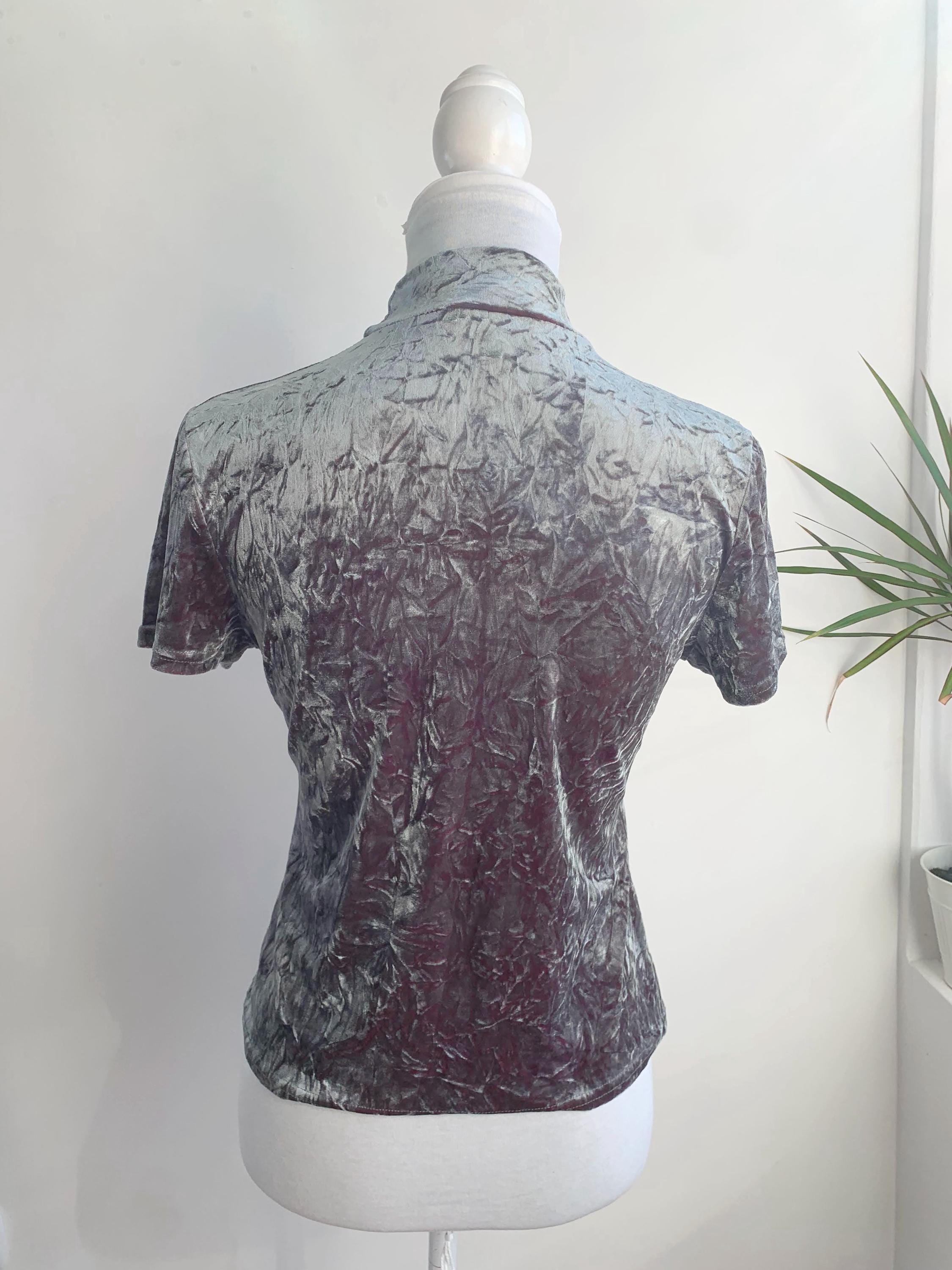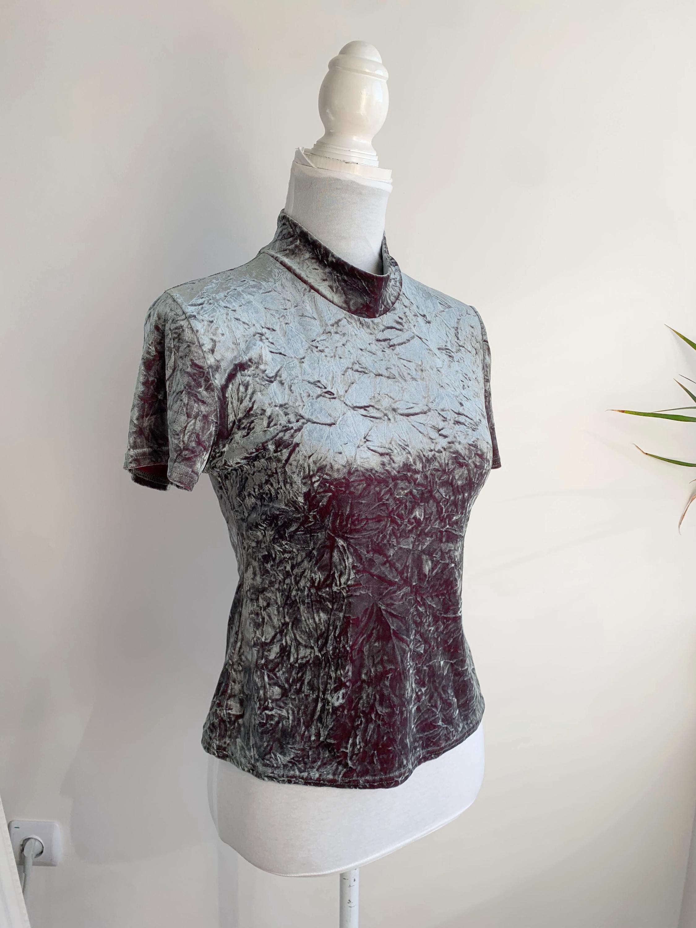 Step into the spotlight with this unique vintage crushed velvet top by Fashion Studio in size S/M. This short sleeve velvet tee effortlessly captures the essence of late 90s and Y2K fashion with its striking silver-sage metallic sheen and heavily textured, crushed velvet knit. The mock turtleneck and short sleeves give it a clean, slightly futuristic silhouette, making it a perfect statement piece.