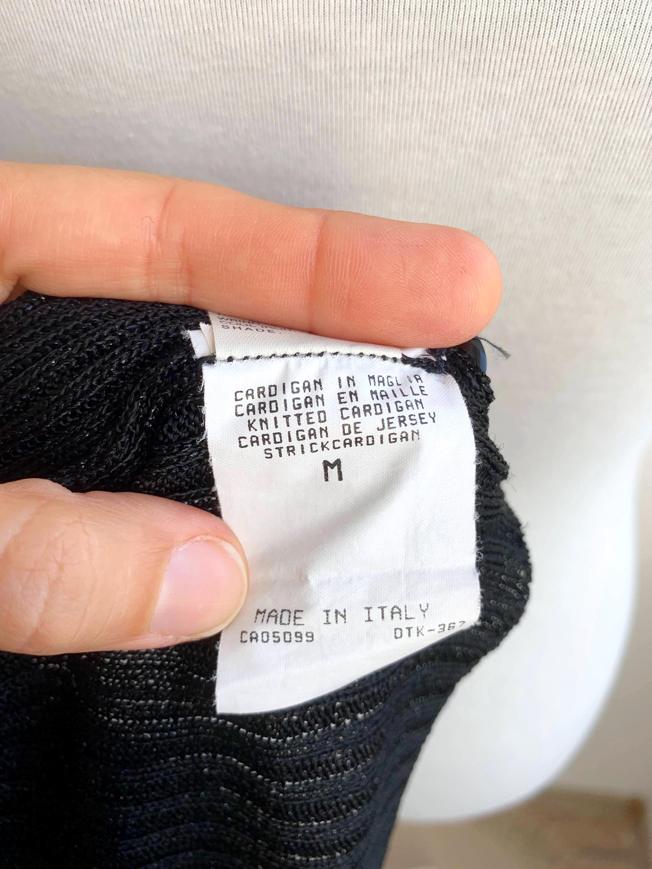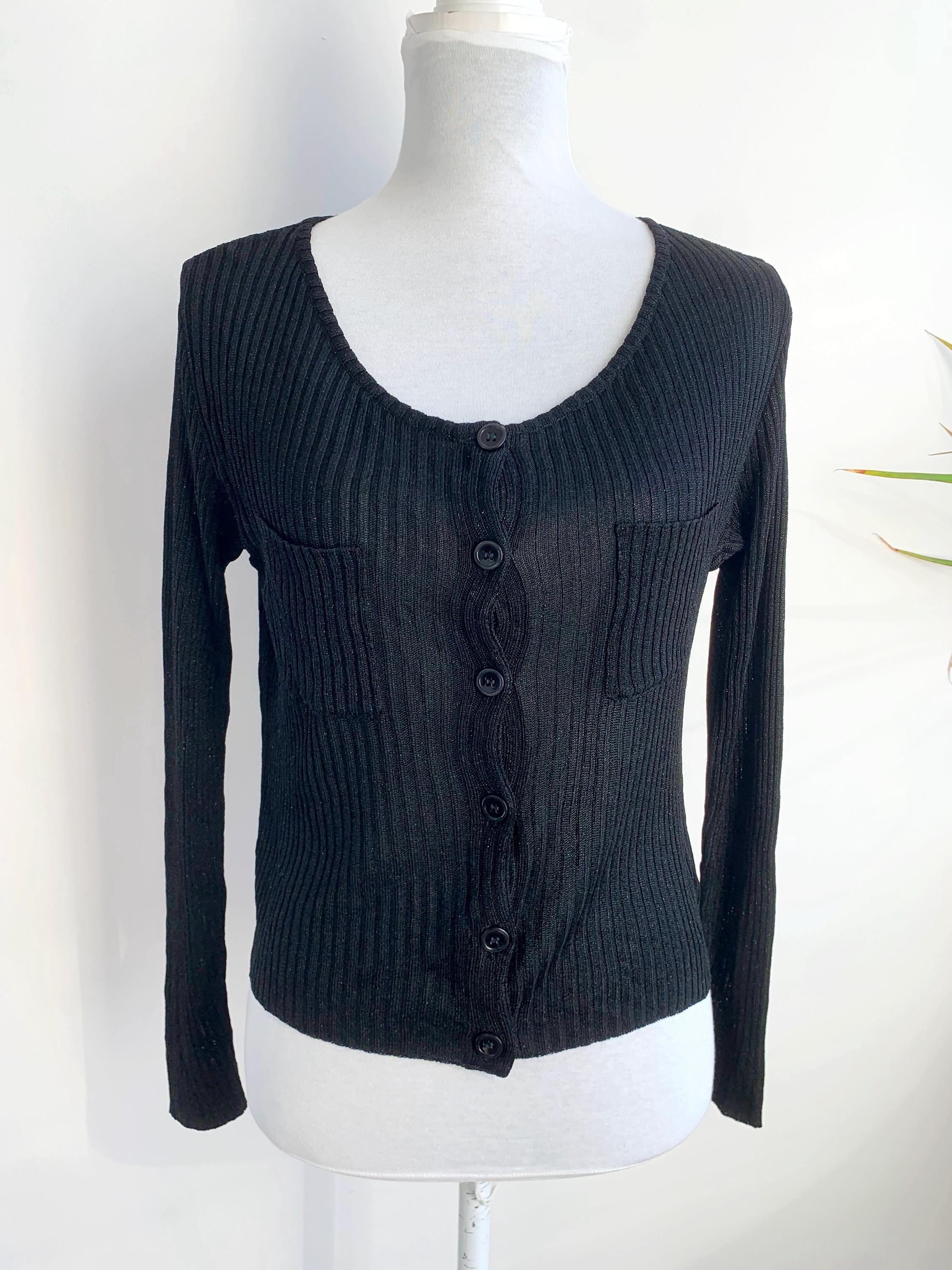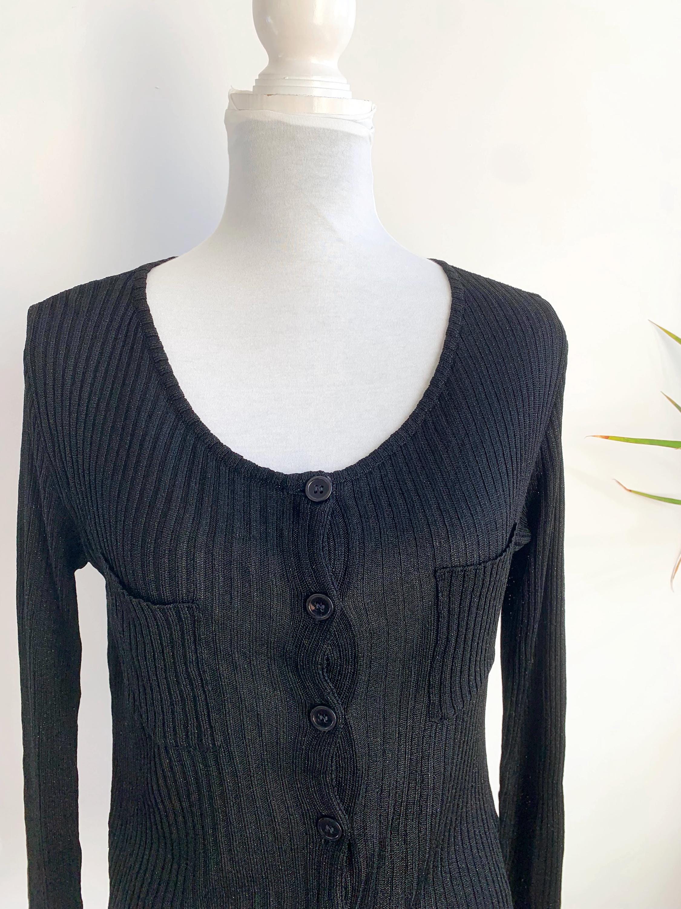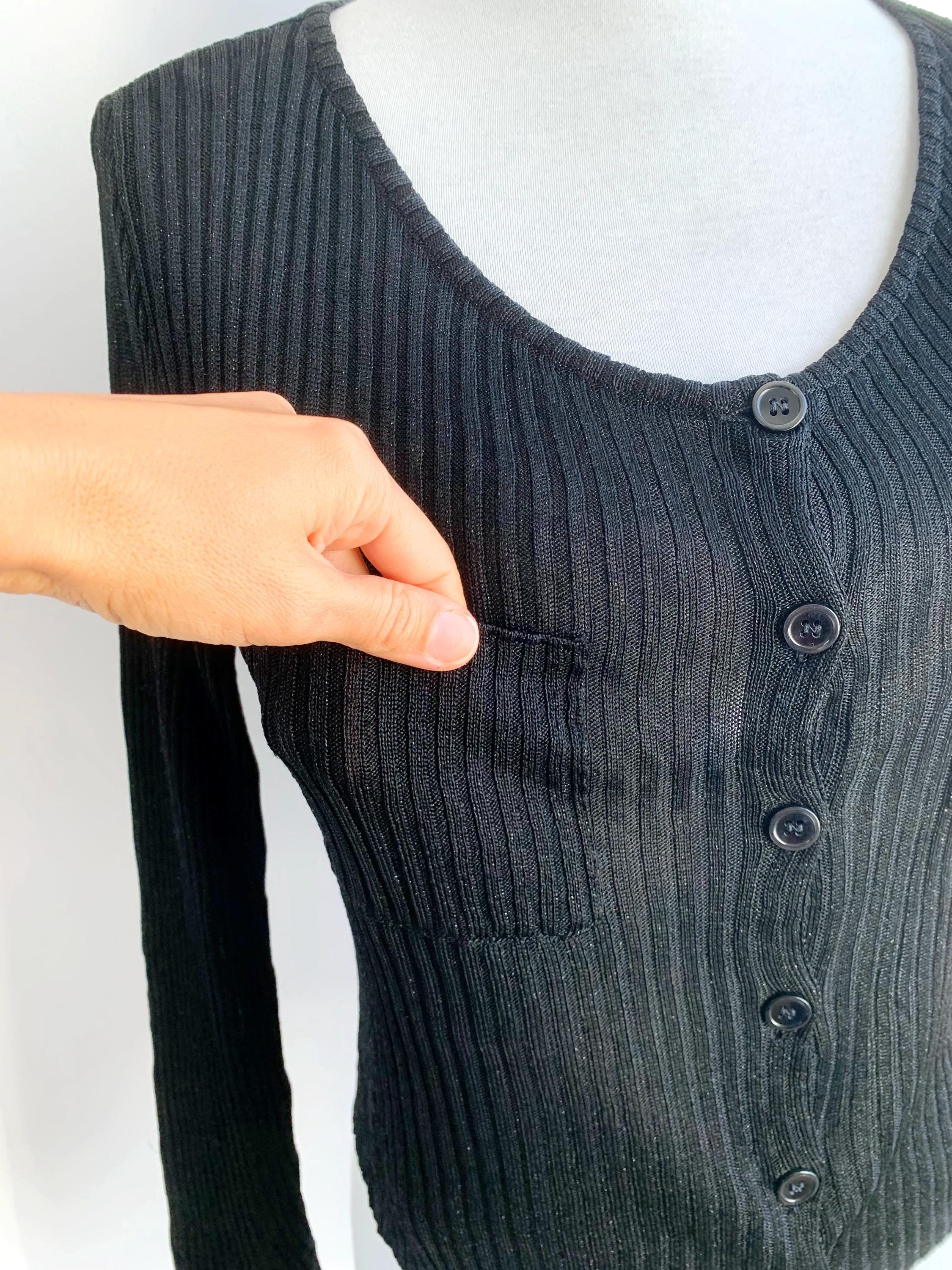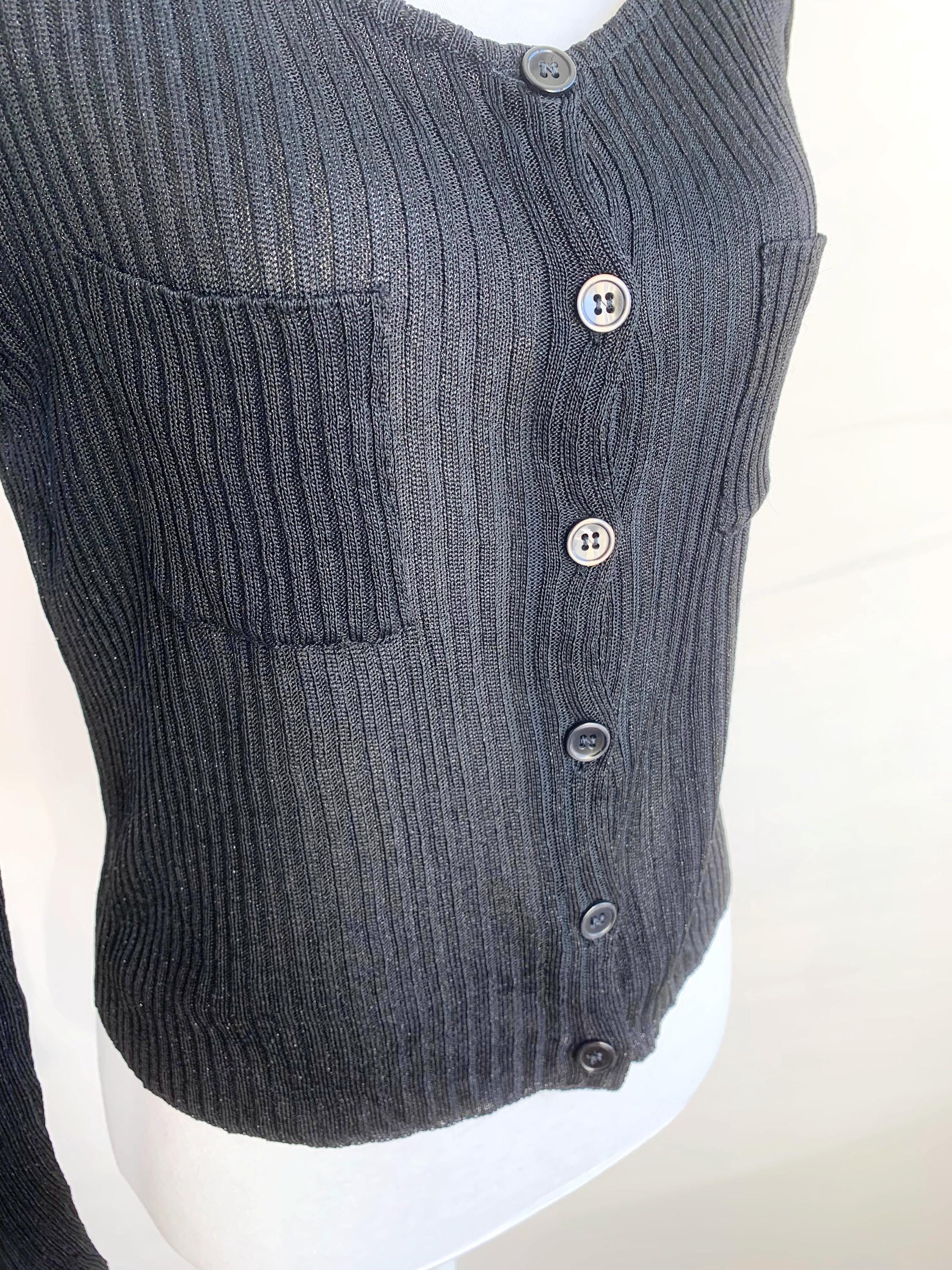 This chic vintage black cardigan by Max&Co. Active is a versatile and stylish addition to any wardrobe. Made in Italy, this fitted, long-sleeve top features a beautiful ribbed knit texture that offers a subtle silver shimmer and a slight sheer quality, perfect for layering or wearing on its own. The scoop neckline and front button closure create an elegant silhouette, while the two stitched bust pockets add a unique detail. This Italian designer knitwear piece is marked as size Medium (M) and its stretchy fabric ensures a flattering, comfortable fit. Whether you’re looking for a retro sheer knit top, a designer black sweater, or a high-quality vintage fitted cardigan, this Max&Co. piece brings timeless European style and a touch of active-wear chic to your look.
