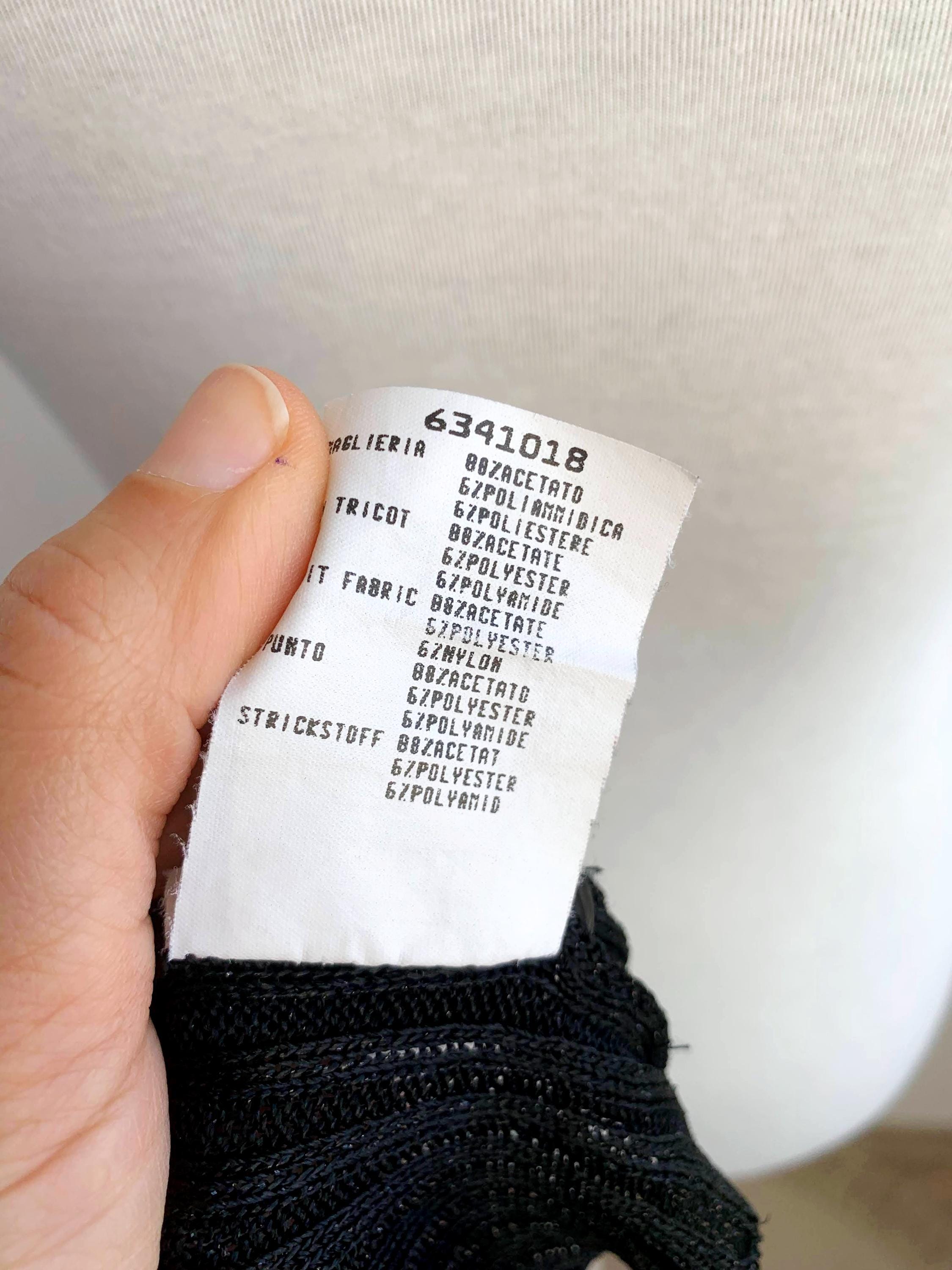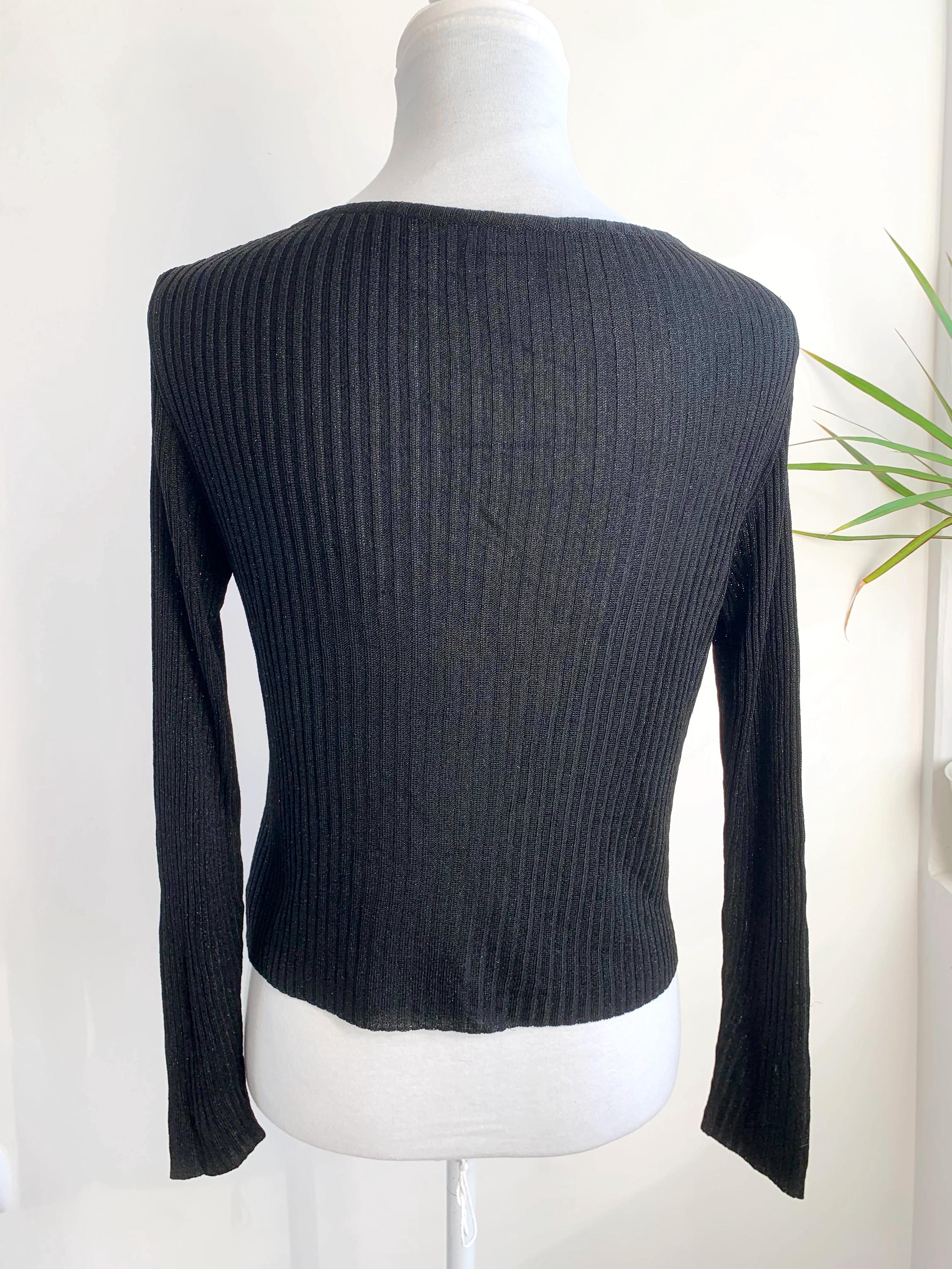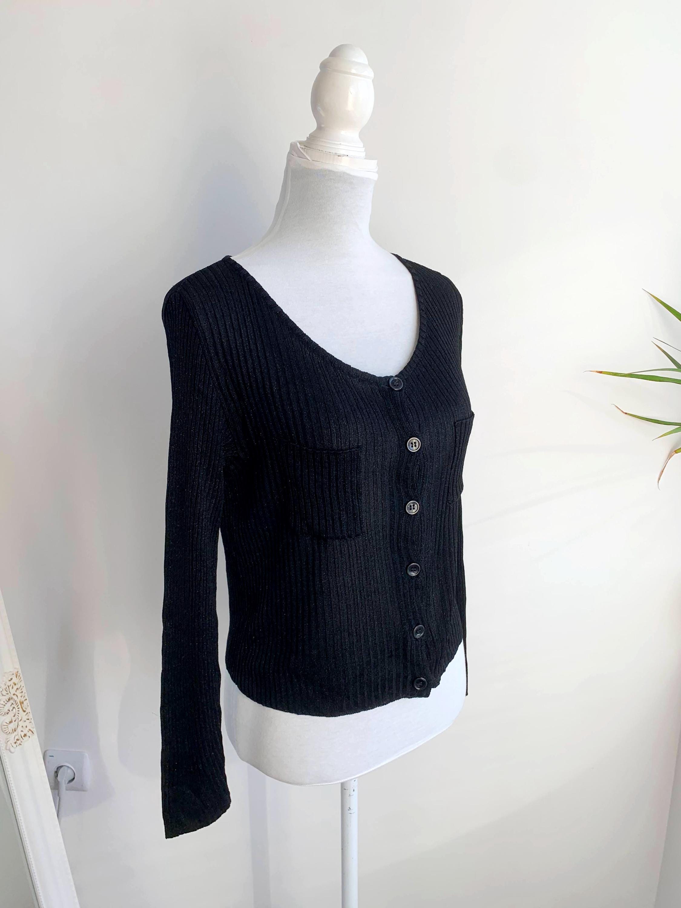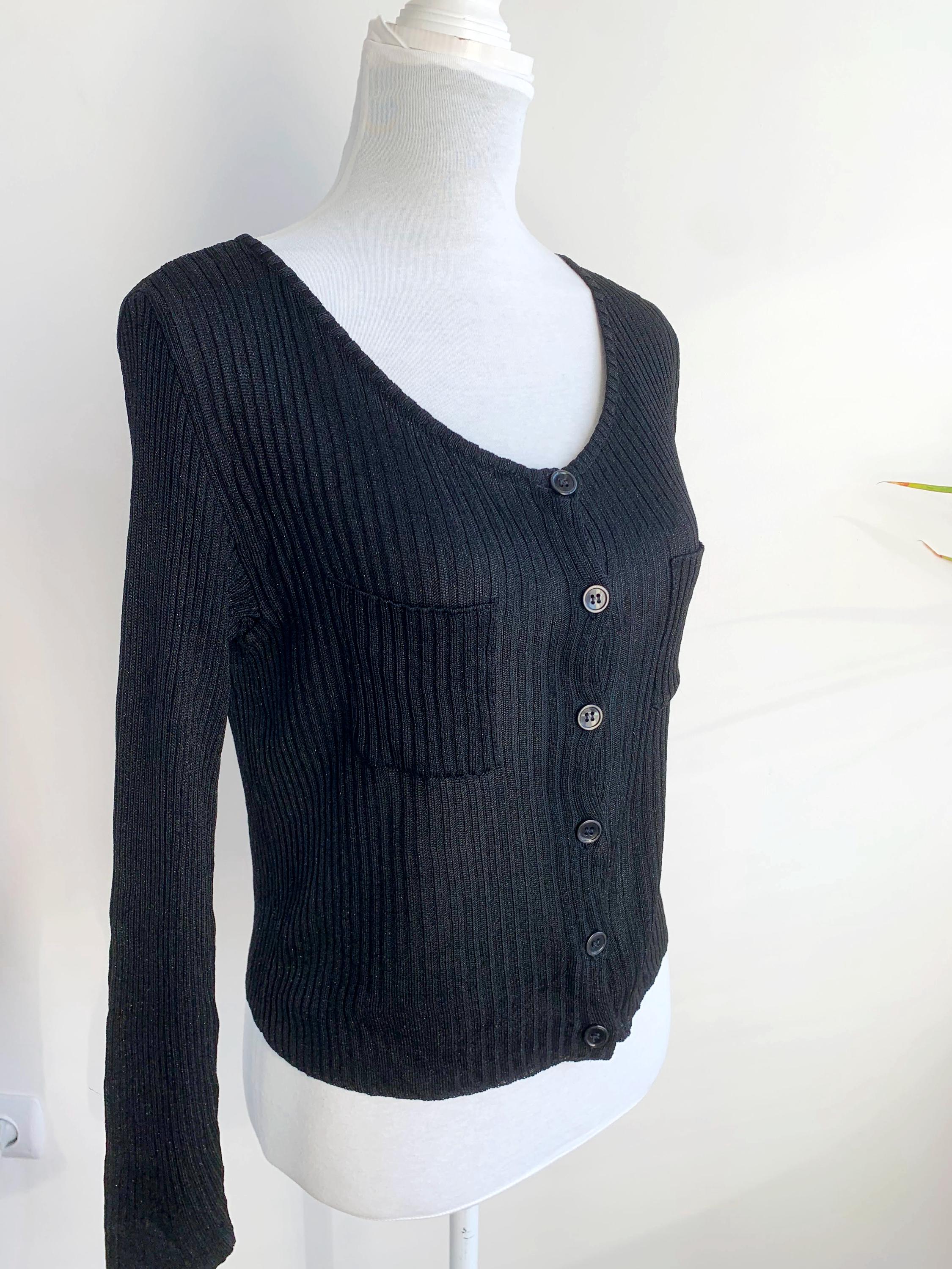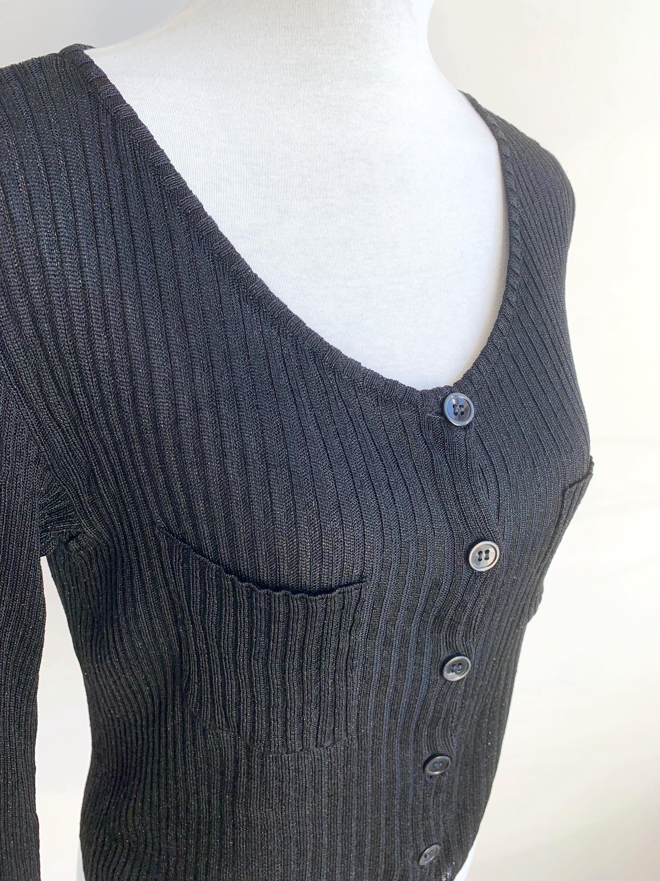 This chic vintage black cardigan by Max&Co. Active is a versatile and stylish addition to any wardrobe. Made in Italy, this fitted, long-sleeve top features a beautiful ribbed knit texture that offers a subtle silver shimmer and a slight sheer quality, perfect for layering or wearing on its own. The scoop neckline and front button closure create an elegant silhouette, while the two stitched bust pockets add a unique detail. This Italian designer knitwear piece is marked as size Medium (M) and its stretchy fabric ensures a flattering, comfortable fit. Whether you’re looking for a retro sheer knit top, a designer black sweater, or a high-quality vintage fitted cardigan, this Max&Co. piece brings timeless European style and a touch of active-wear chic to your look.
