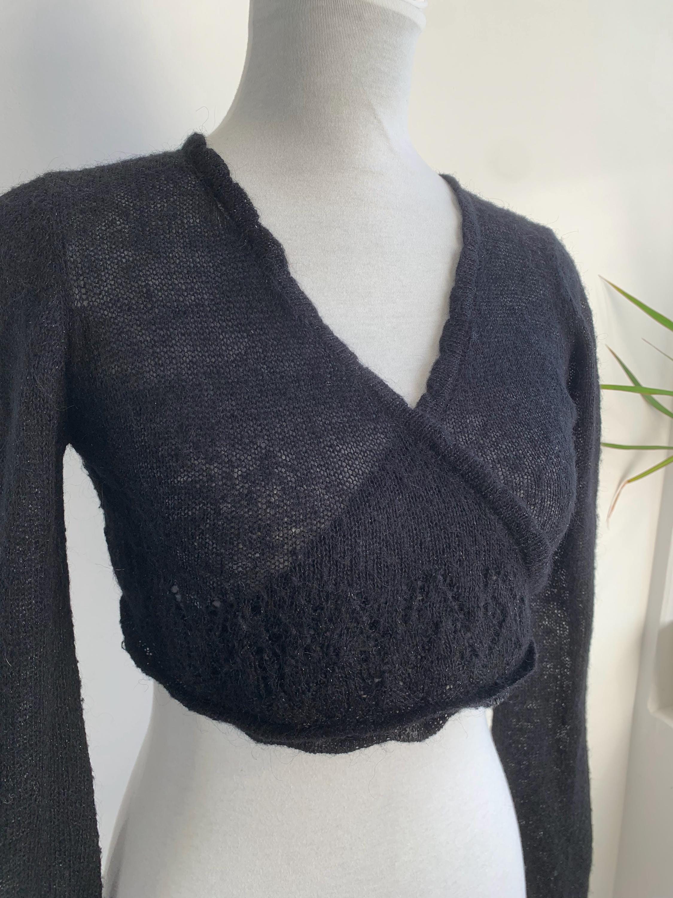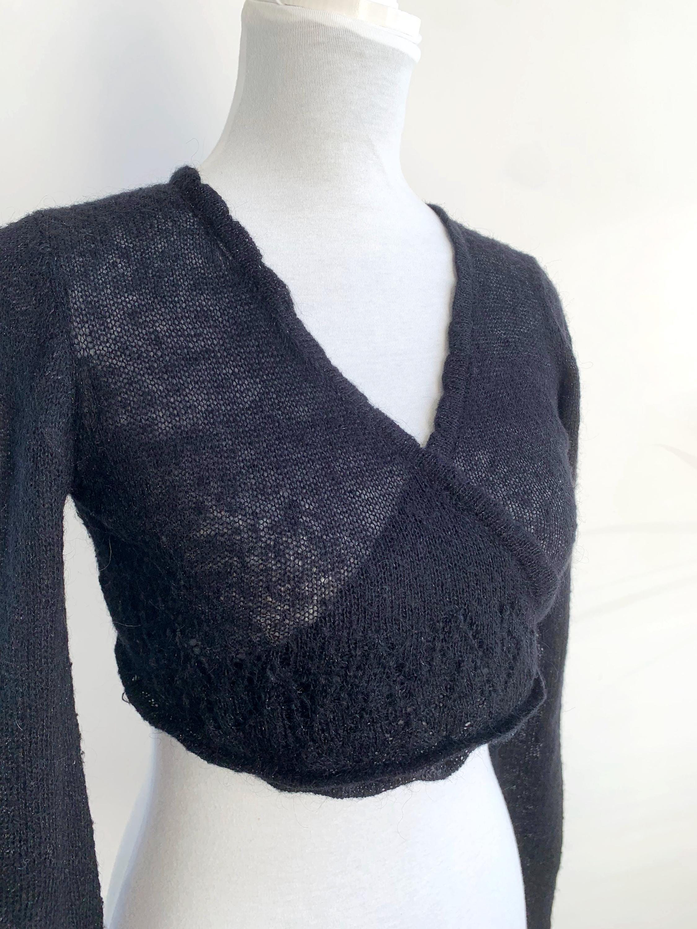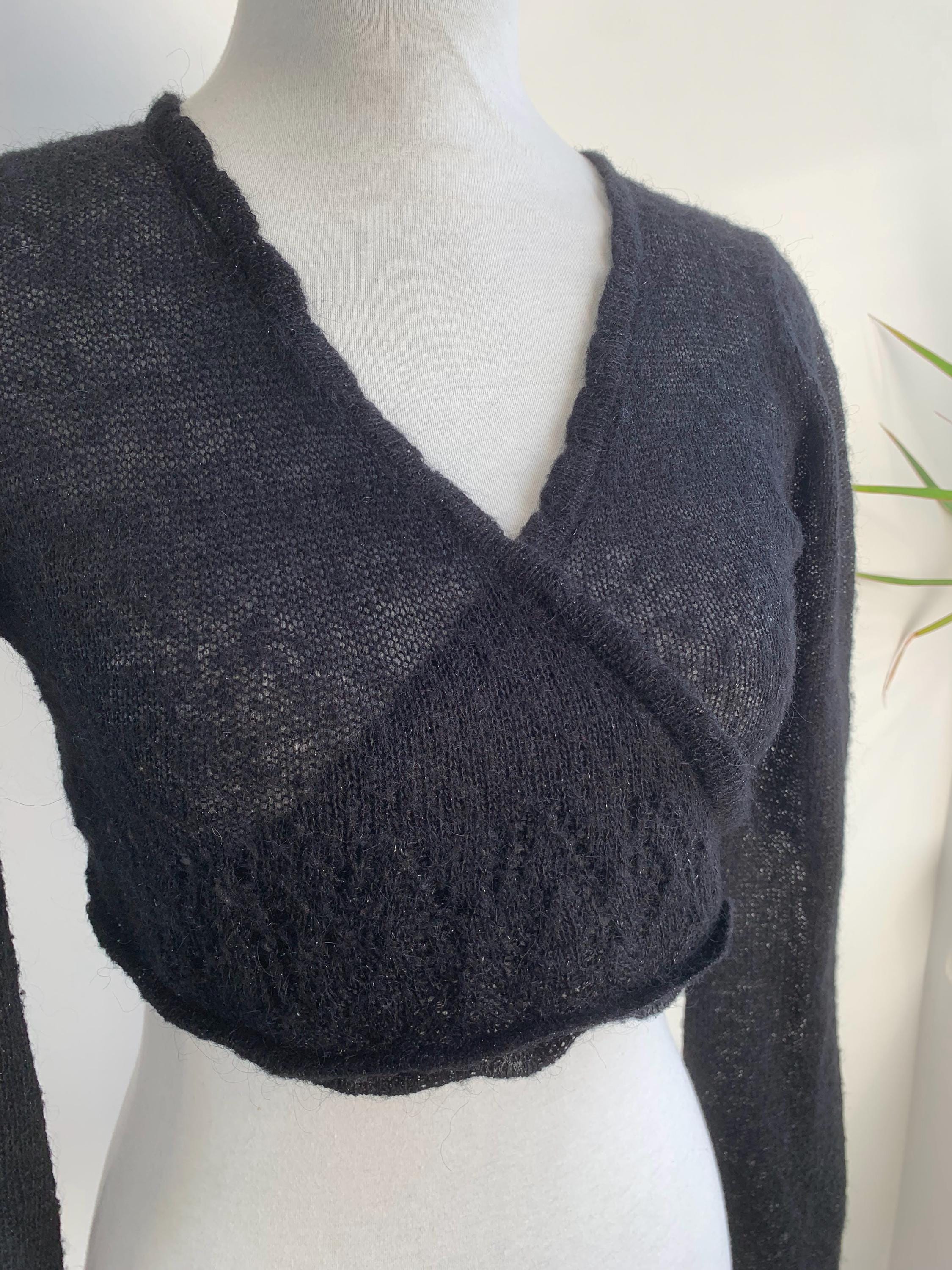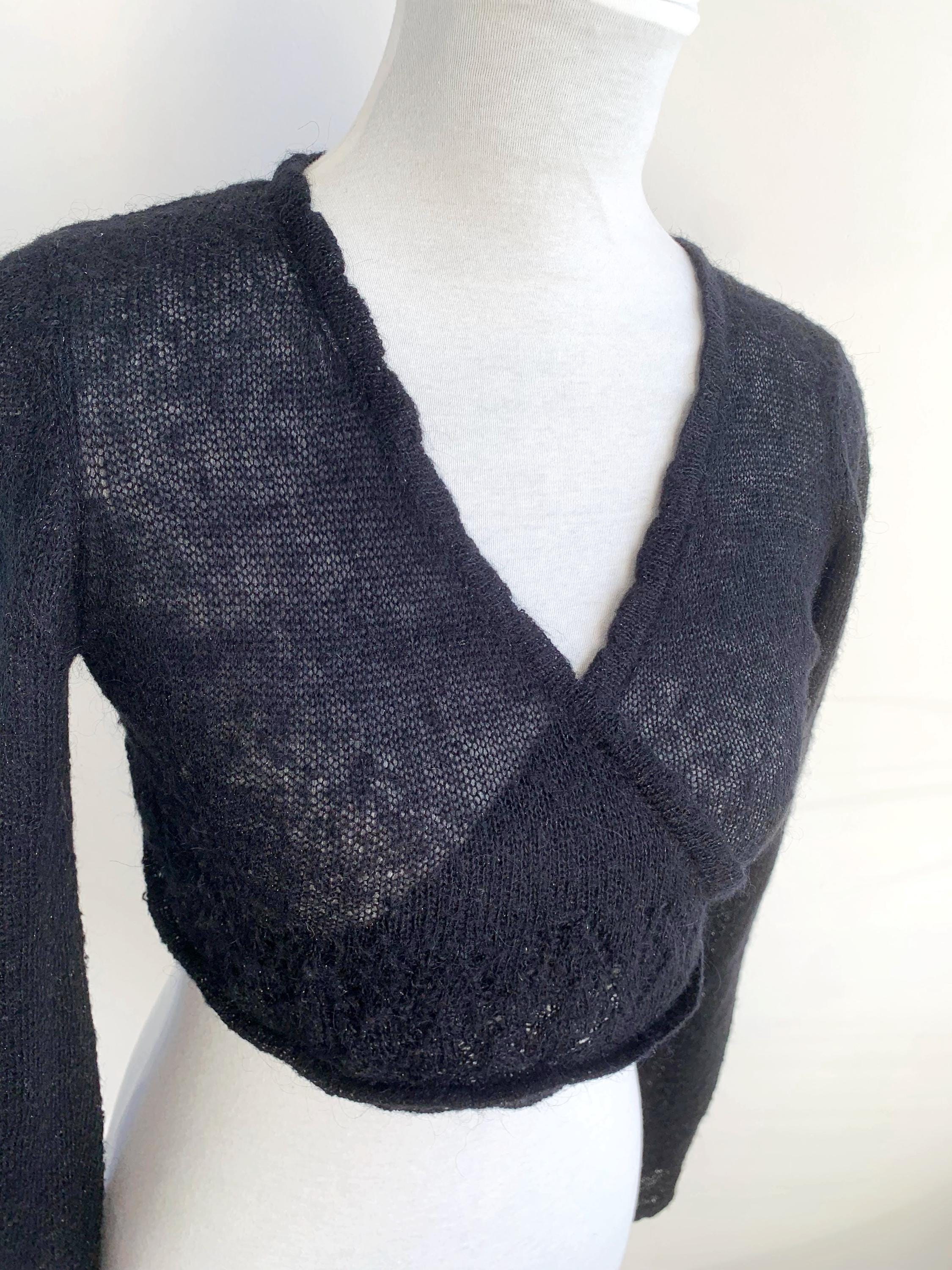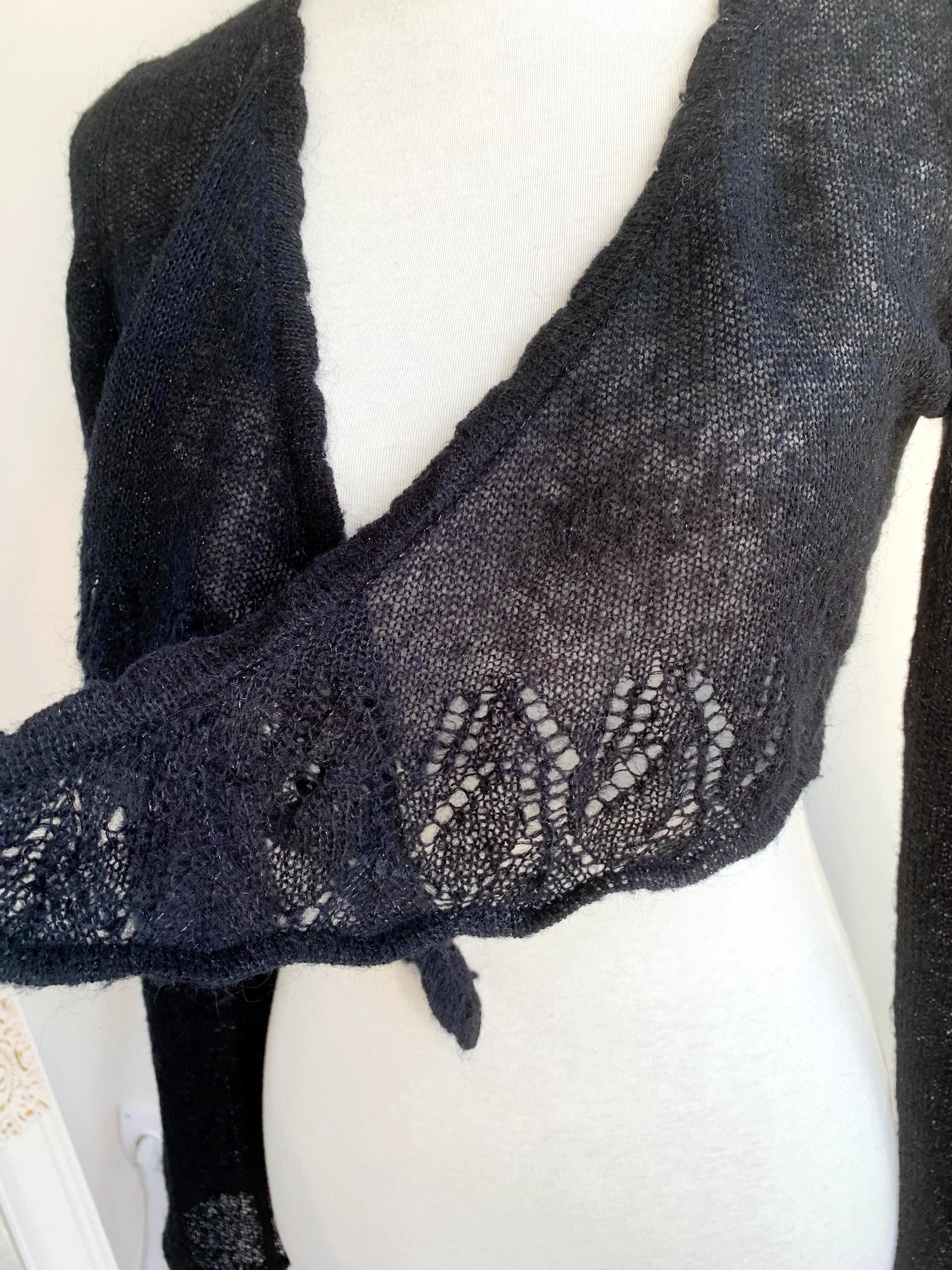 Layer up your look with this super chic and cozy vintage black bolero wrap top in size S. This black wrap cardigan perfectly channels the 90s and early Y2K aesthetic, blending a cropped silhouette with a touch of delicate silver shimmer and soft mohair fuzzy texture. It's constructed from a fine, semi-sheer knit that includes a blend of mohair, acrylic, nylon, and shimmering silver lurex, giving it a delicate halo and subtle sparkle.