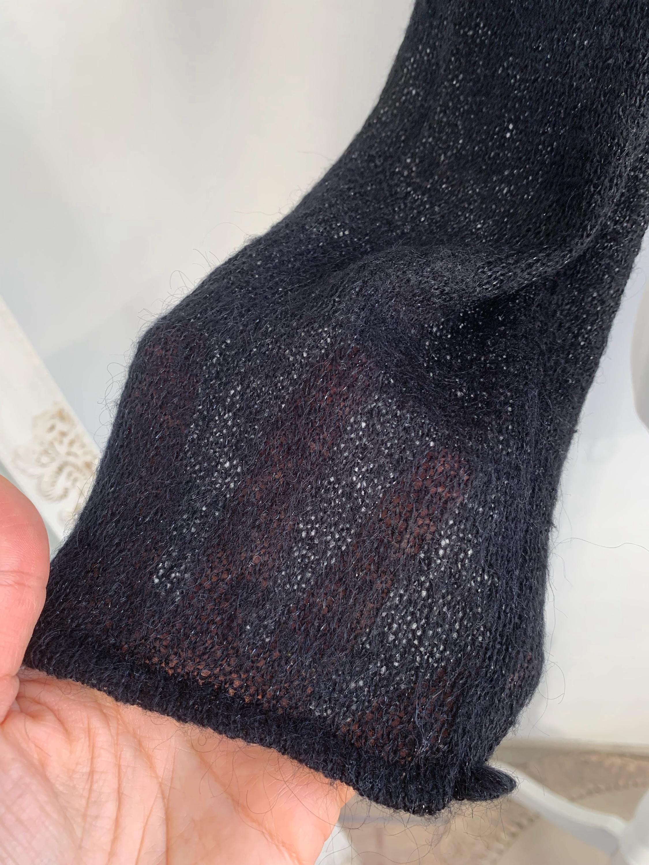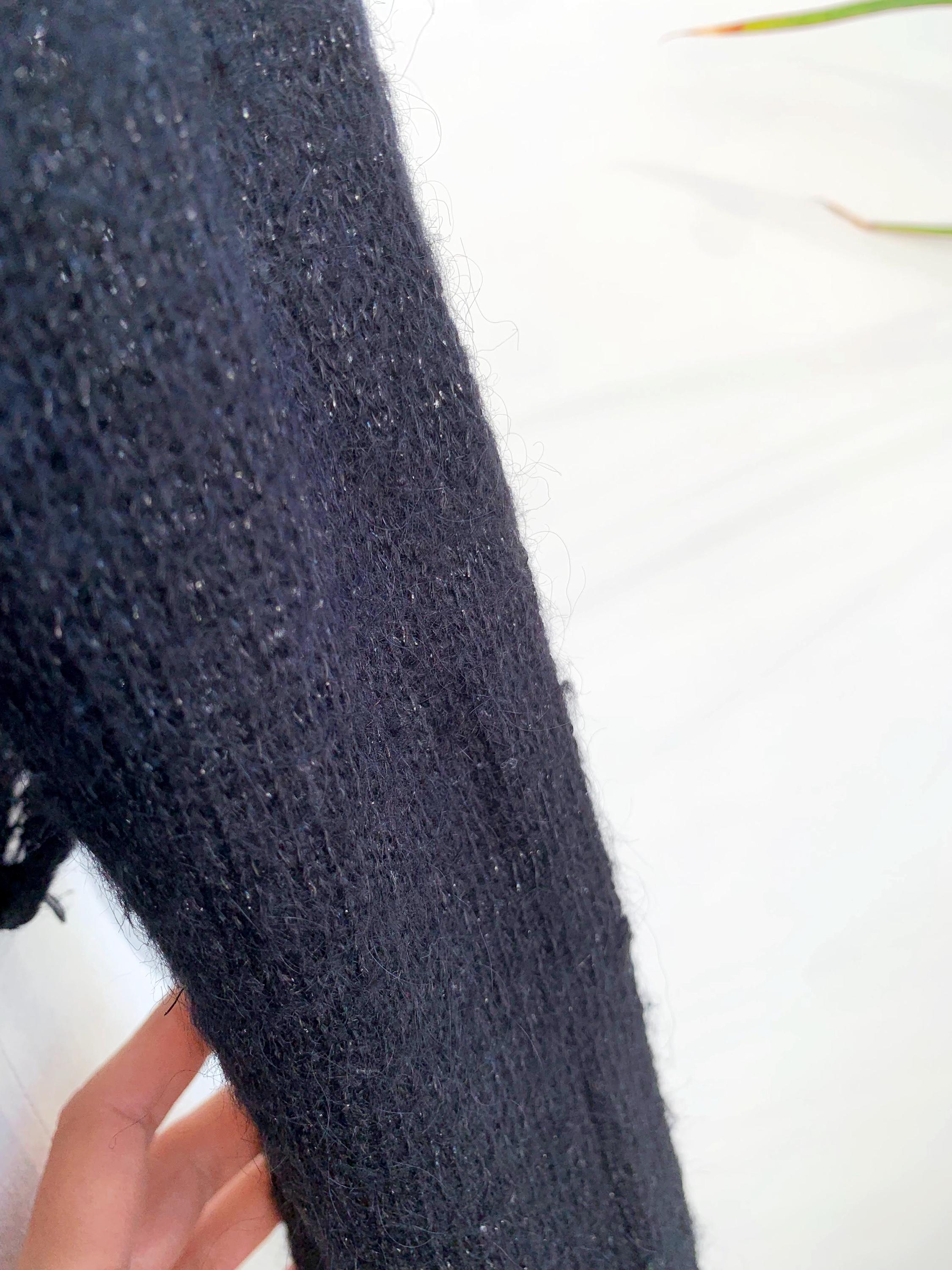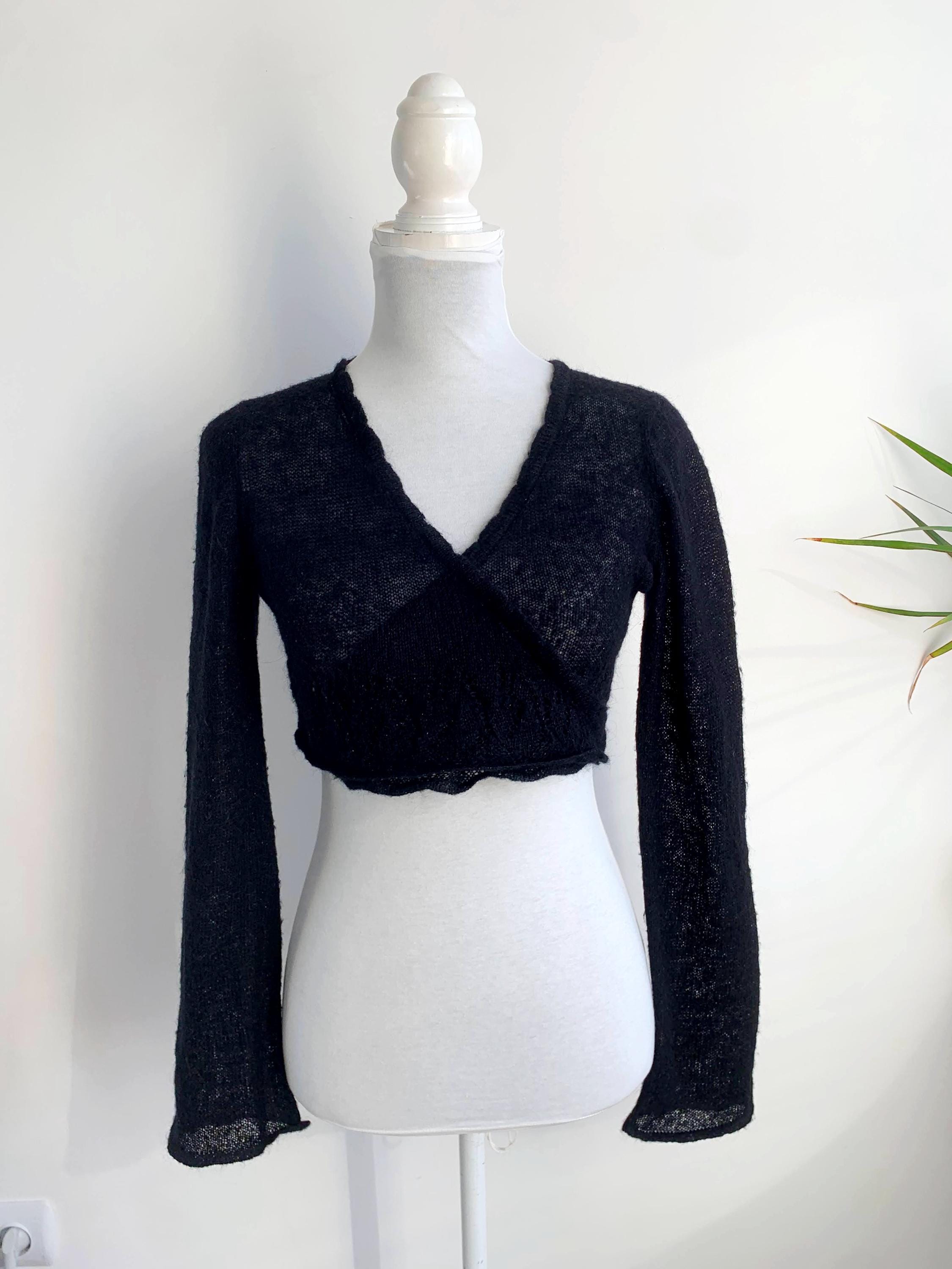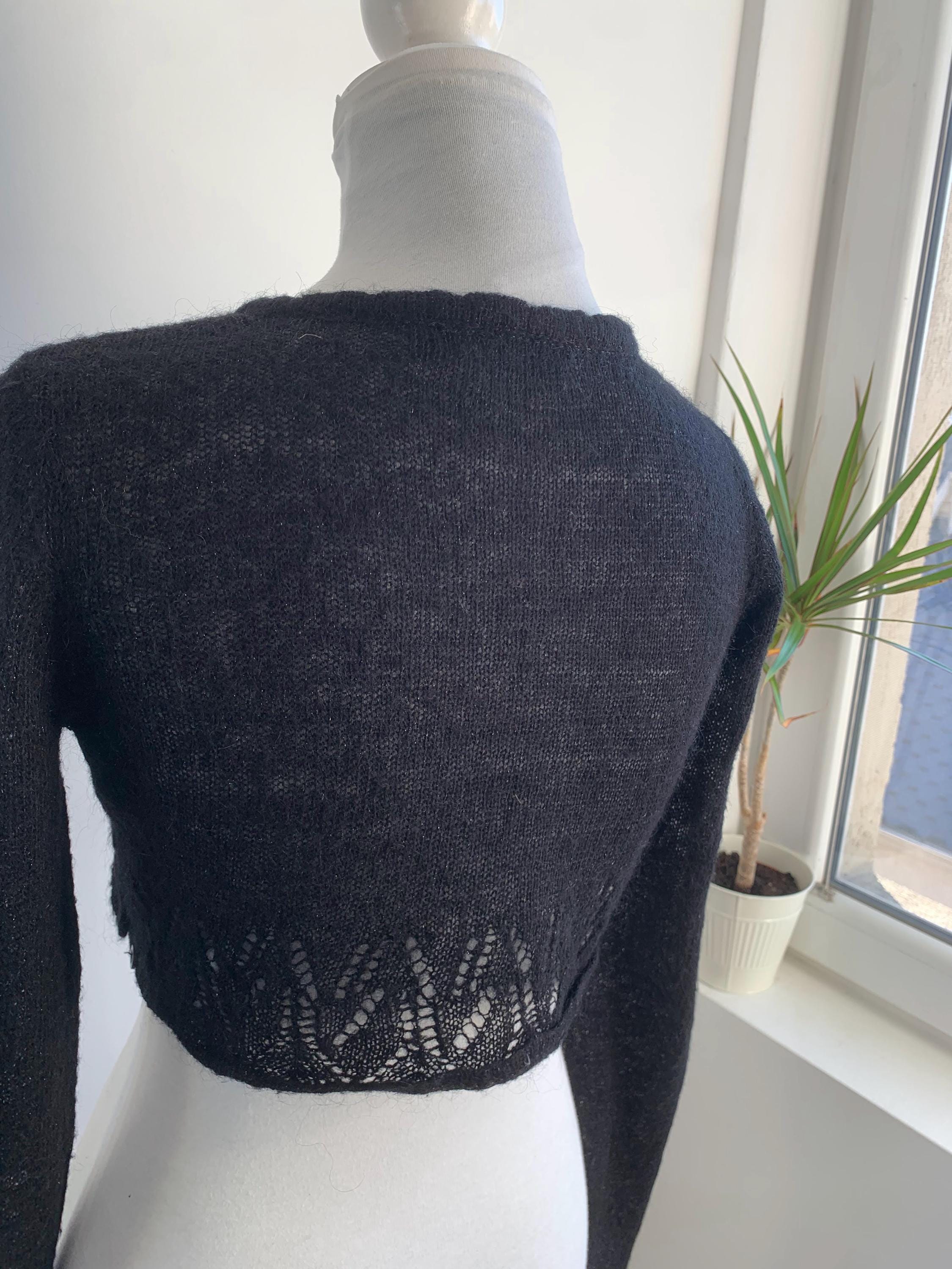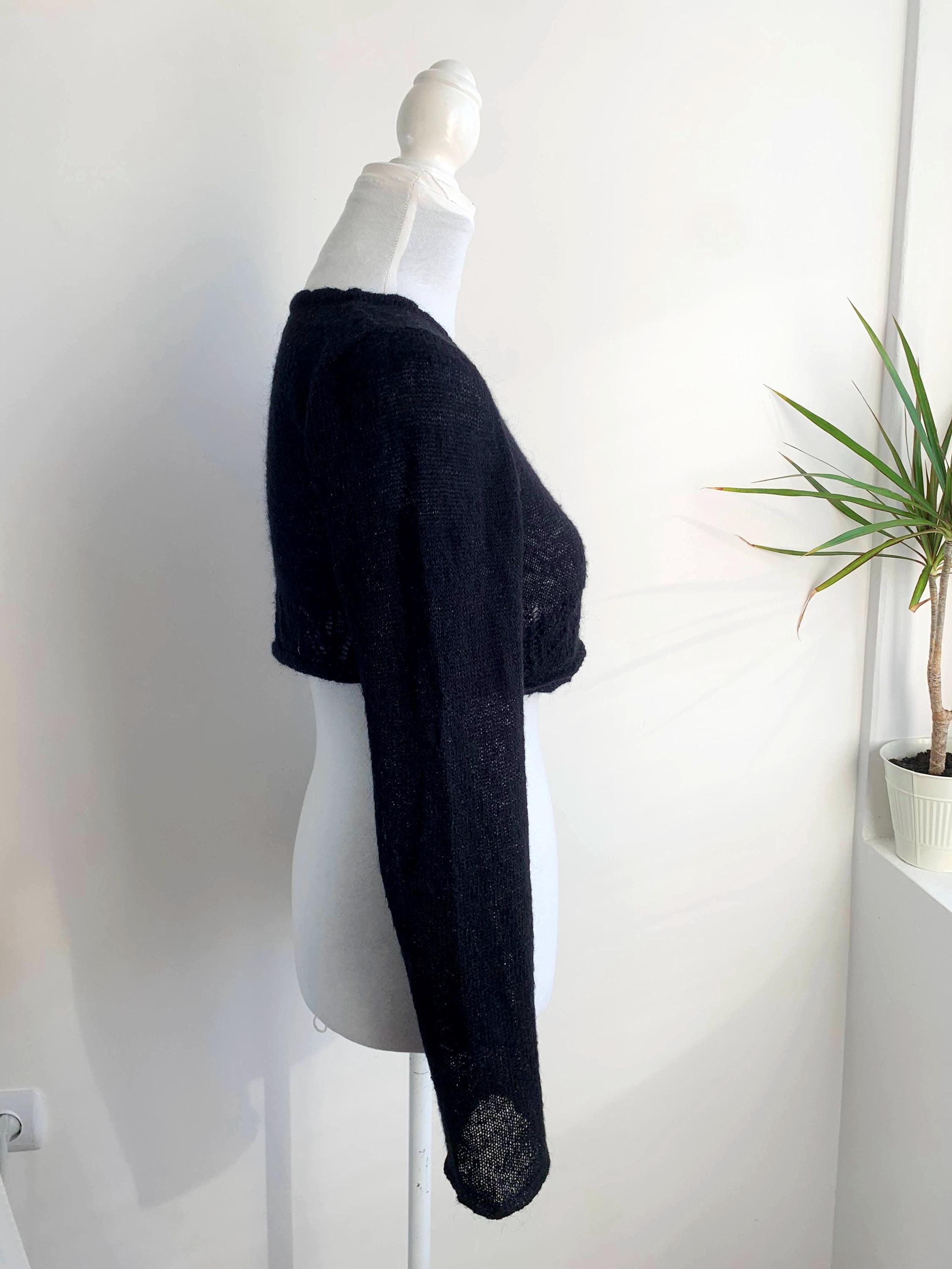 Layer up your look with this super chic and cozy vintage black bolero wrap top in size S. This black wrap cardigan perfectly channels the 90s and early Y2K aesthetic, blending a cropped silhouette with a touch of delicate silver shimmer and soft mohair fuzzy texture. It's constructed from a fine, semi-sheer knit that includes a blend of mohair, acrylic, nylon, and shimmering silver lurex, giving it a delicate halo and subtle sparkle.
