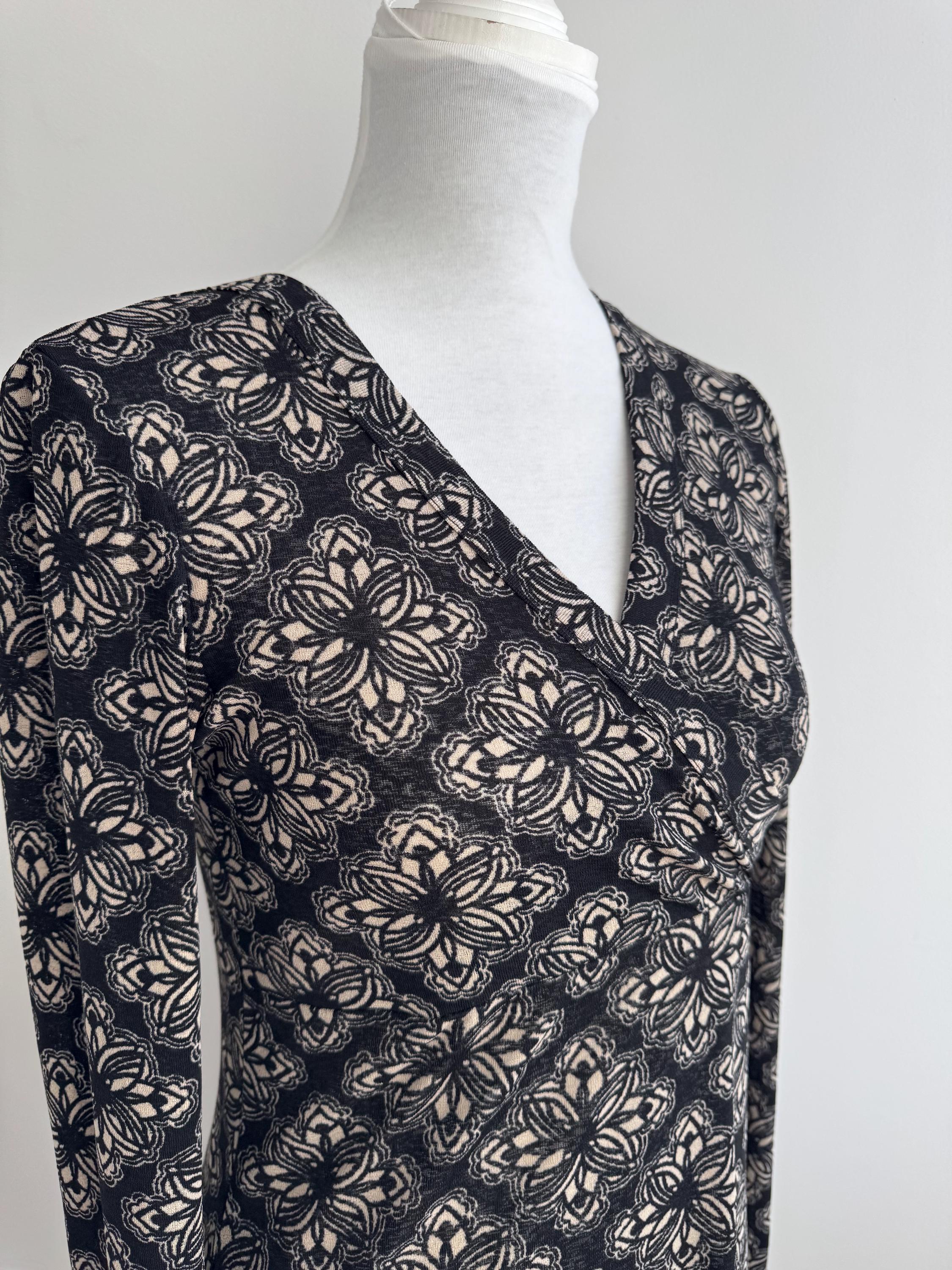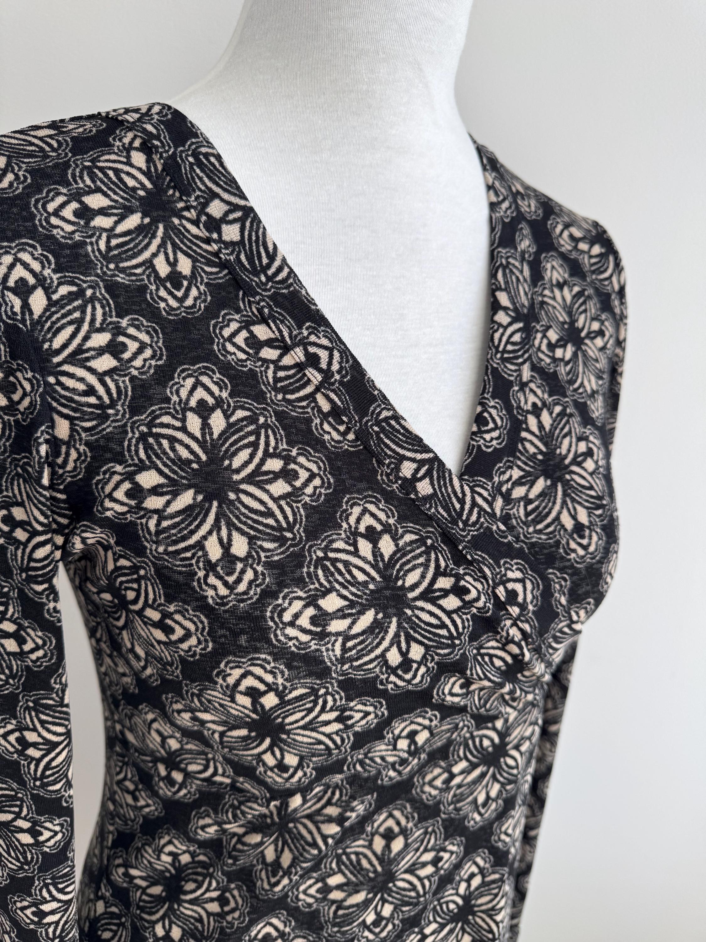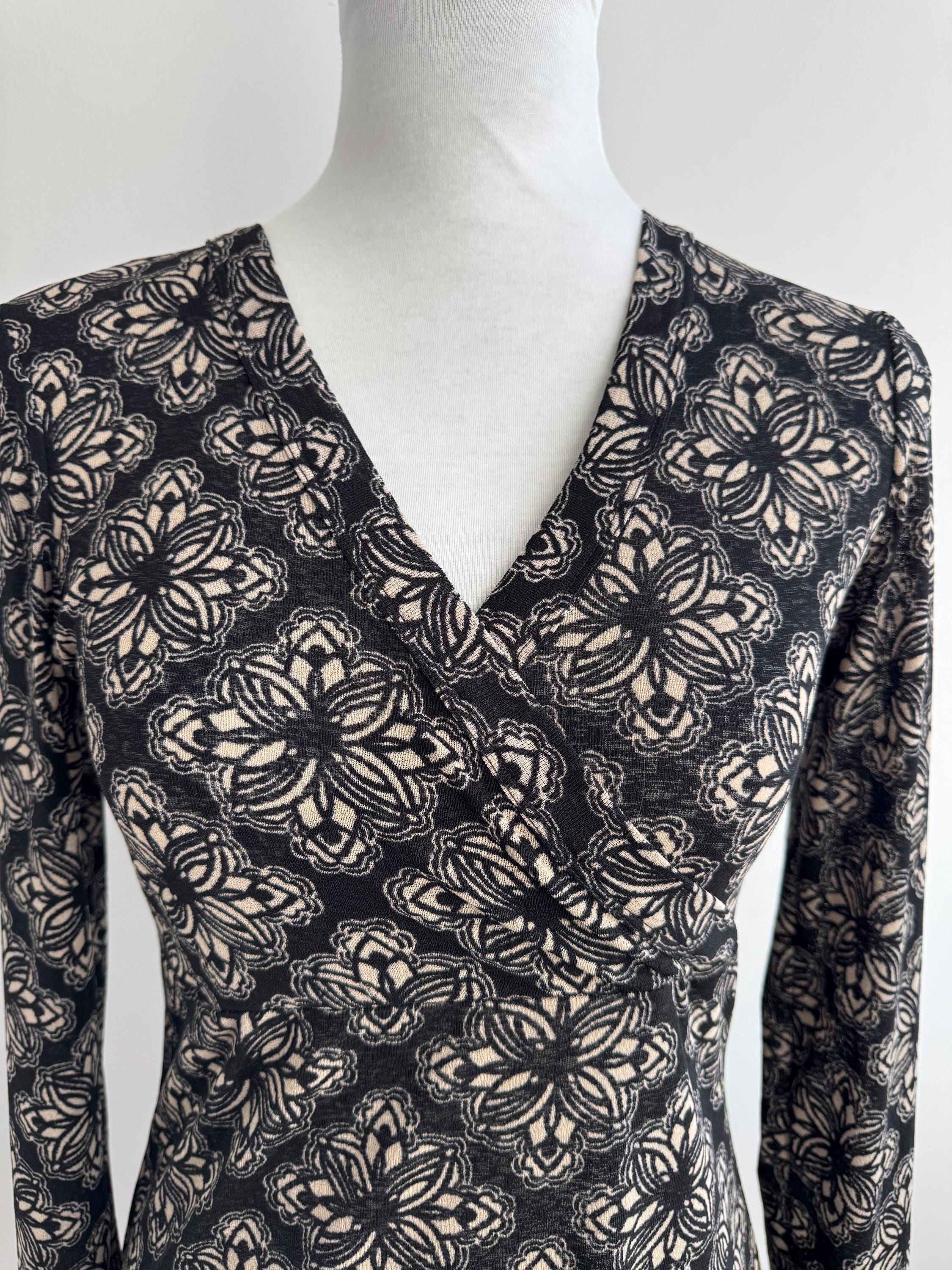 The stretchy material and the wrap style V neck allow it to mold perfectly to the body, creating a head-turning bodycon silhouette. It’s ideal for layering over a simple slip, bralette, or bandeau top to control the sheerness. Perfect for club nights, concerts, date nights, or a festival, this little black dress offers an immediate boost of confidence and unique, effortless style. It’s an easy way to own a piece of high-impact, sustainable vintage clothing.
