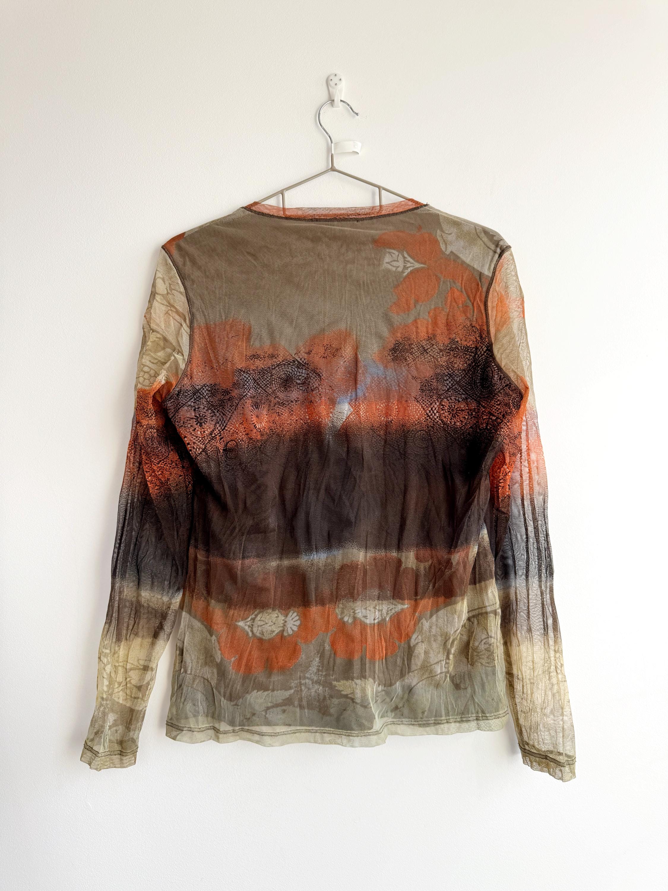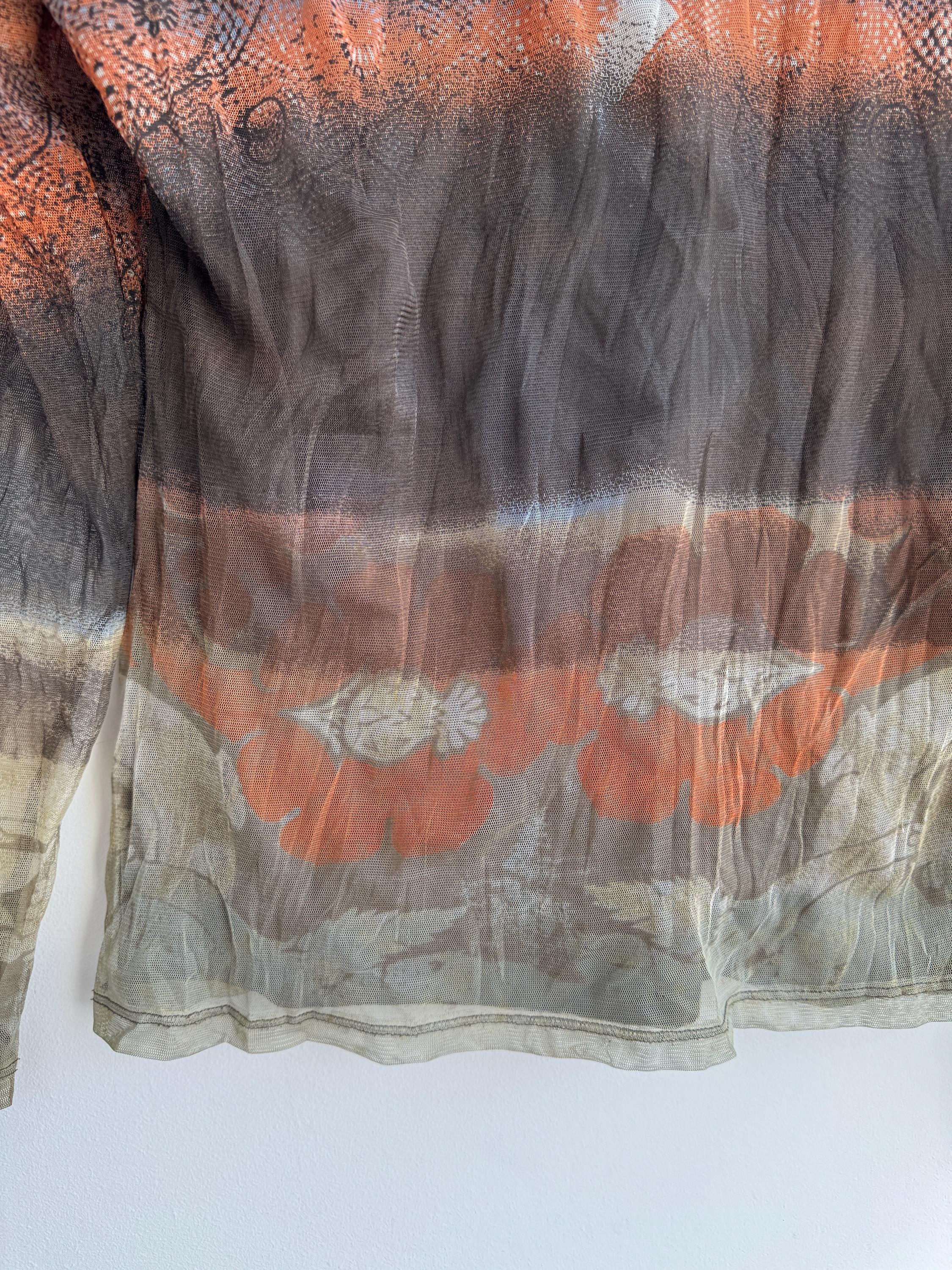The lightweight, sheer stretch mesh fabric gives it that characteristic "second skin" or "tattoo" top feel, a signature look of the era. The graphic print is bold and artistic, making it a perfect statement piece for anyone drawn to Fairycore, Whimsigoth, or Artsy Grunge styles. It features long sleeves and a comfortably fitted silhouette that stretches to hug your figure.