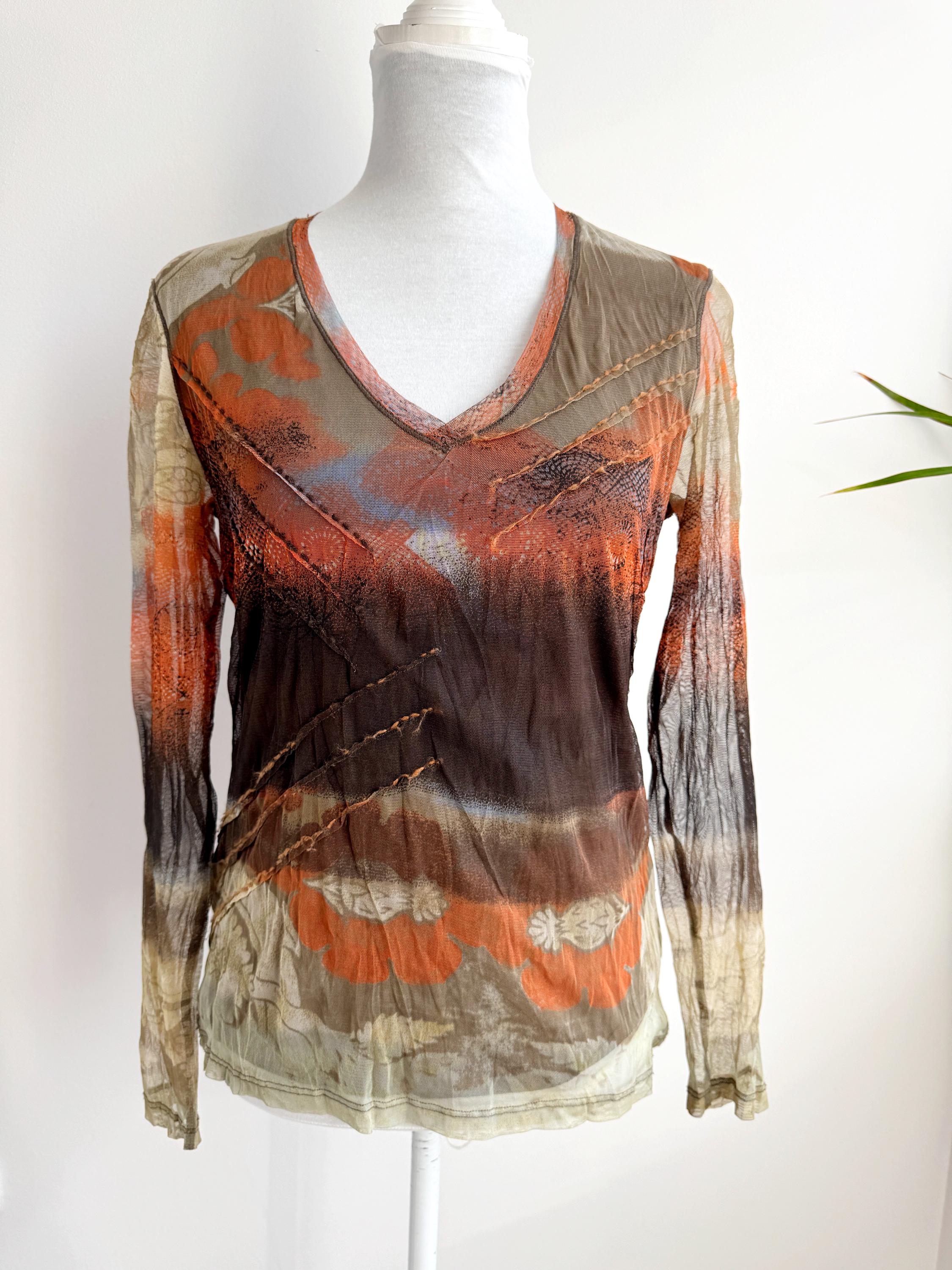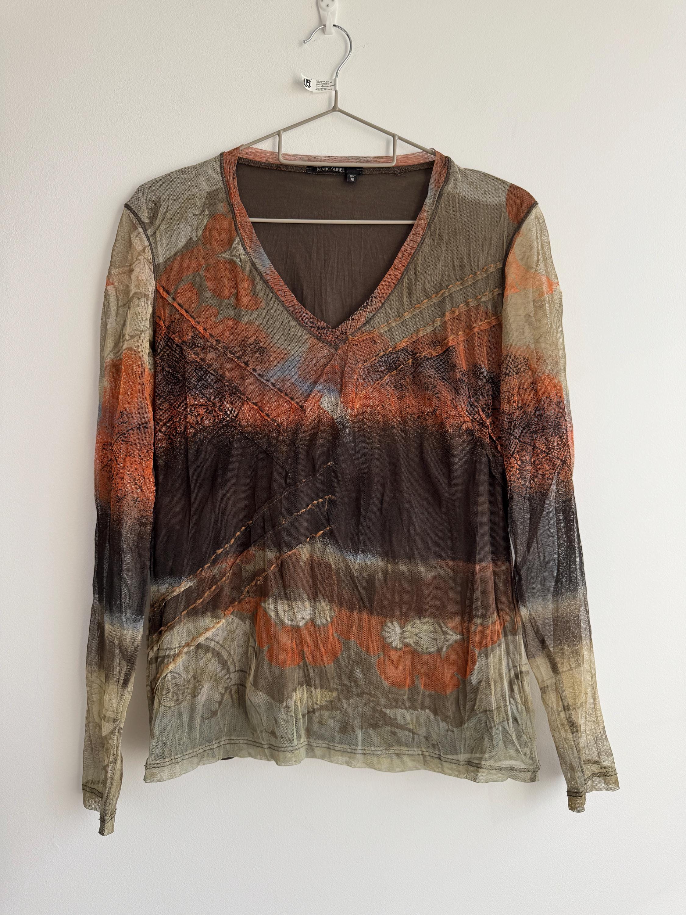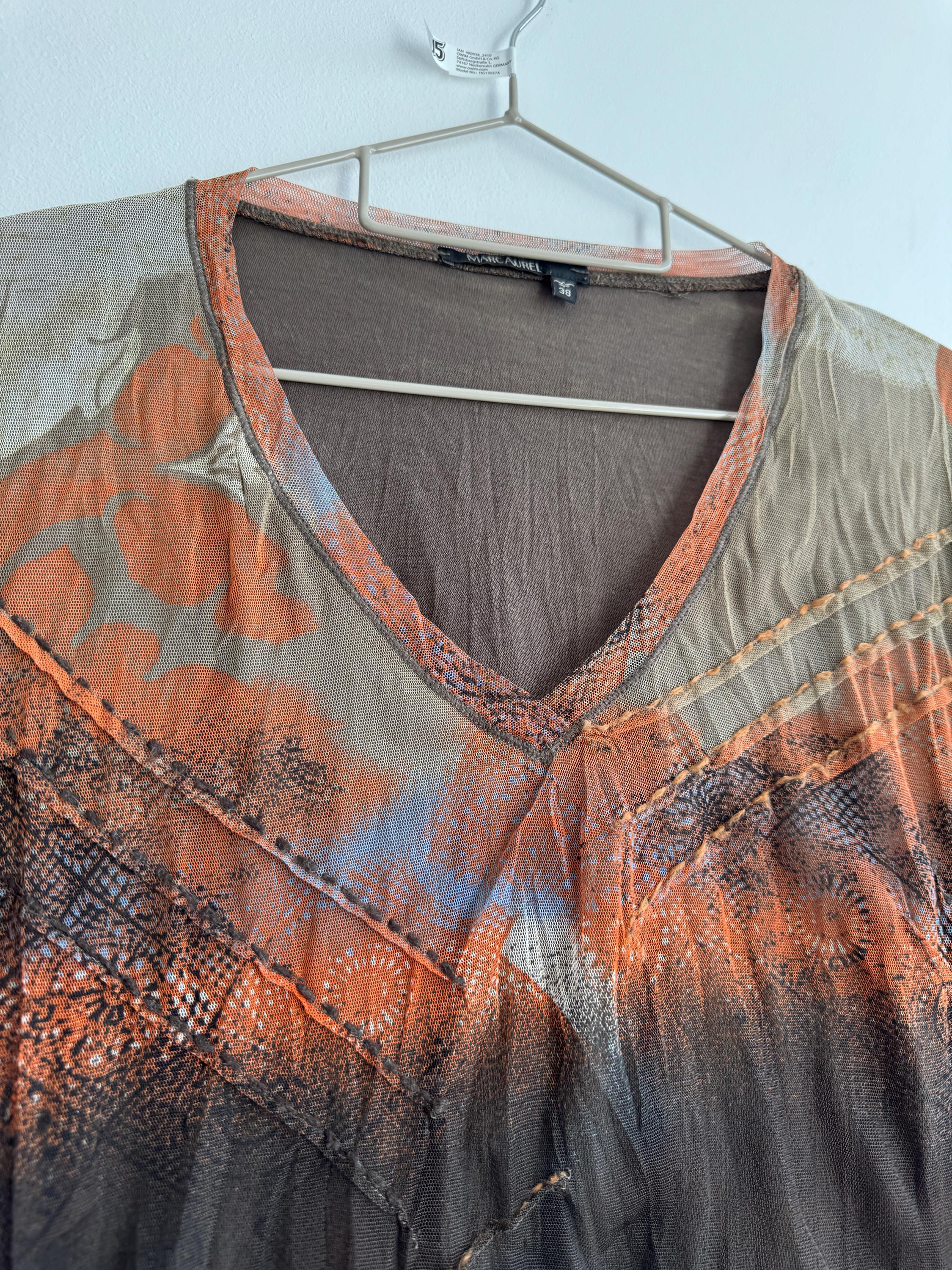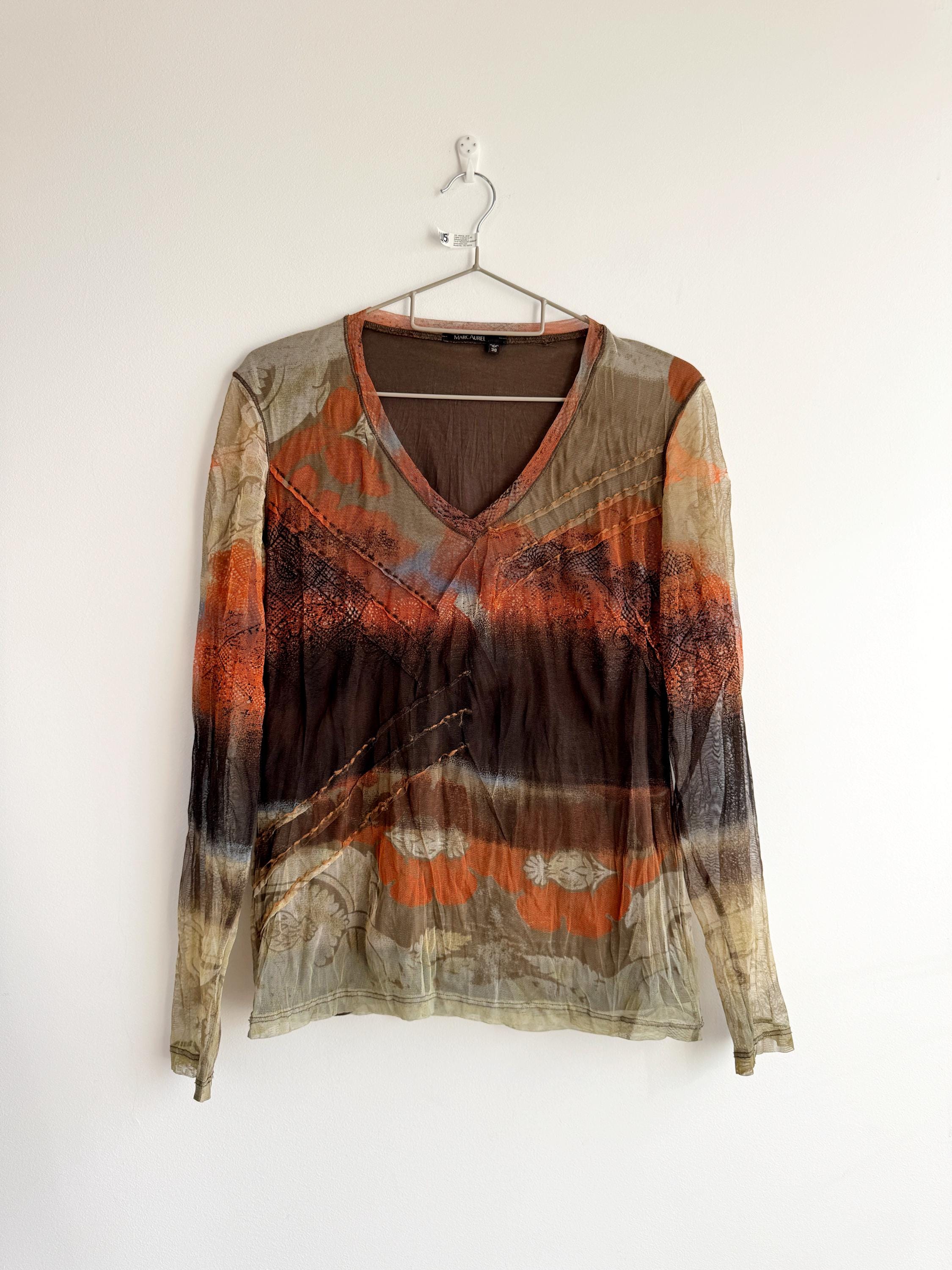 Step back into the effortlessly cool aesthetic of the late 90s and Y2K with this exceptional vintage Marc Aurel mesh top. This German-designed piece captures the essence of retro avant-garde fashion with its captivating abstract art print in vibrant shades of khaki green, orange, brown and beige.