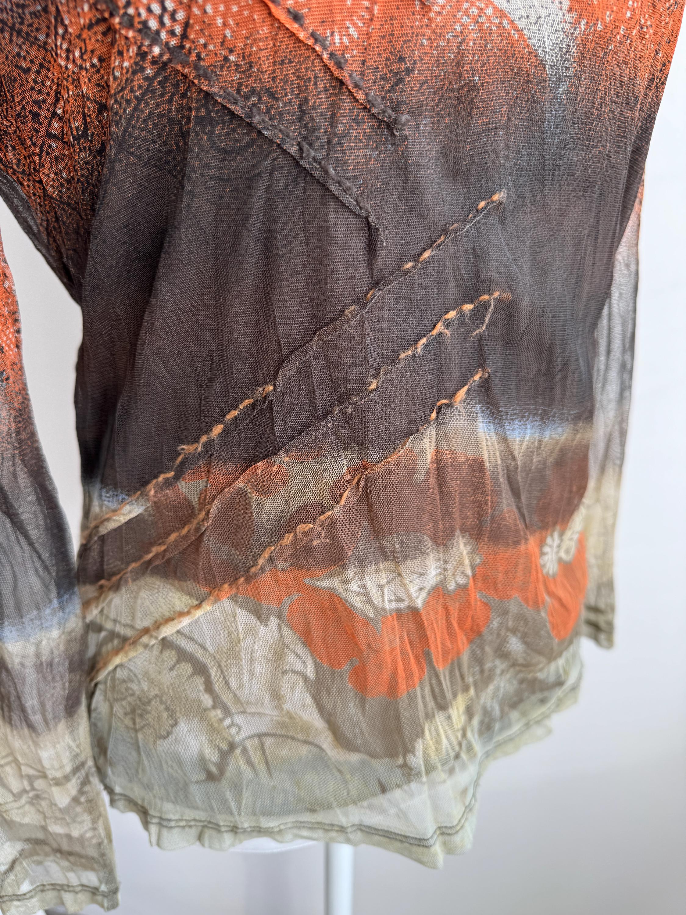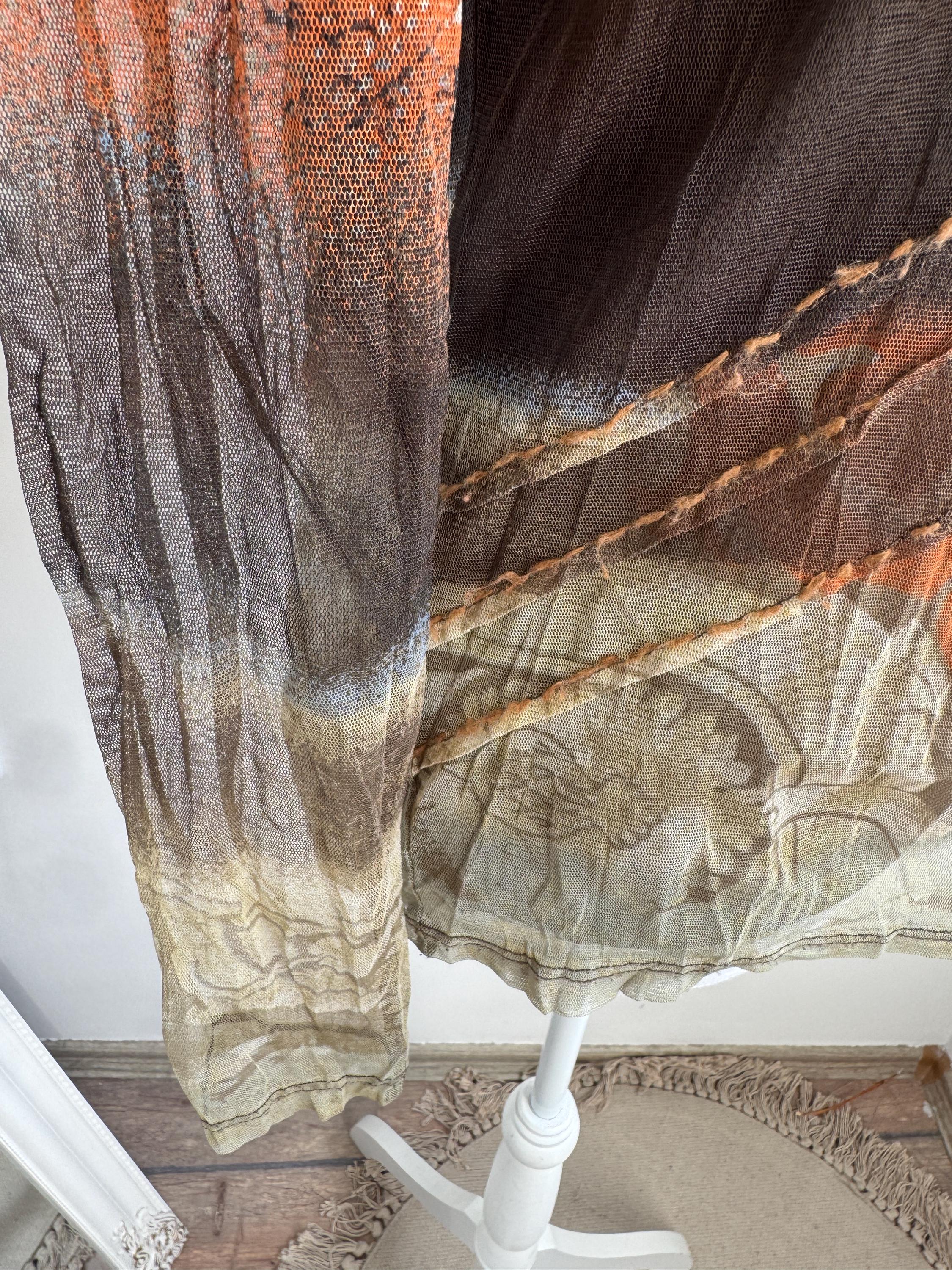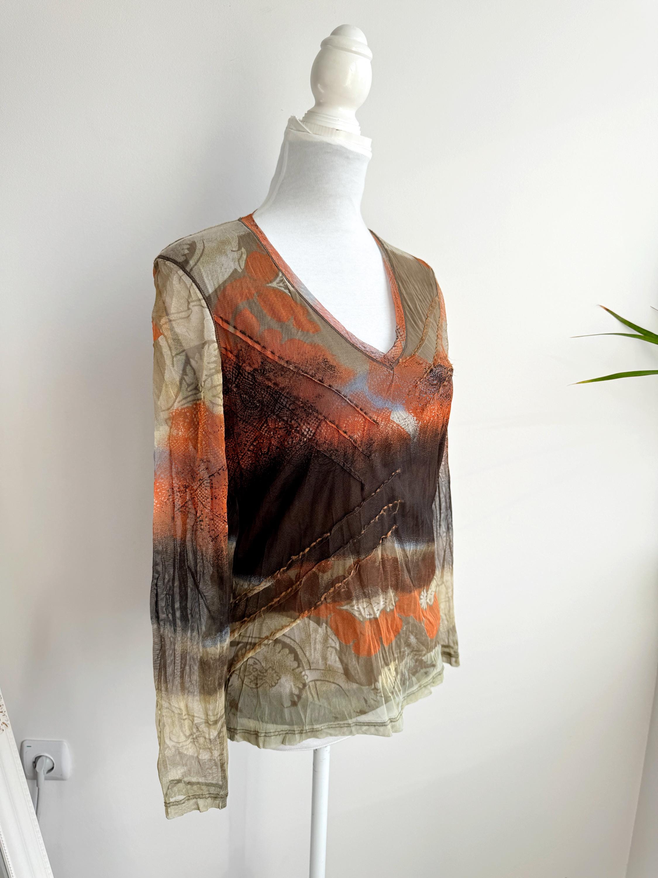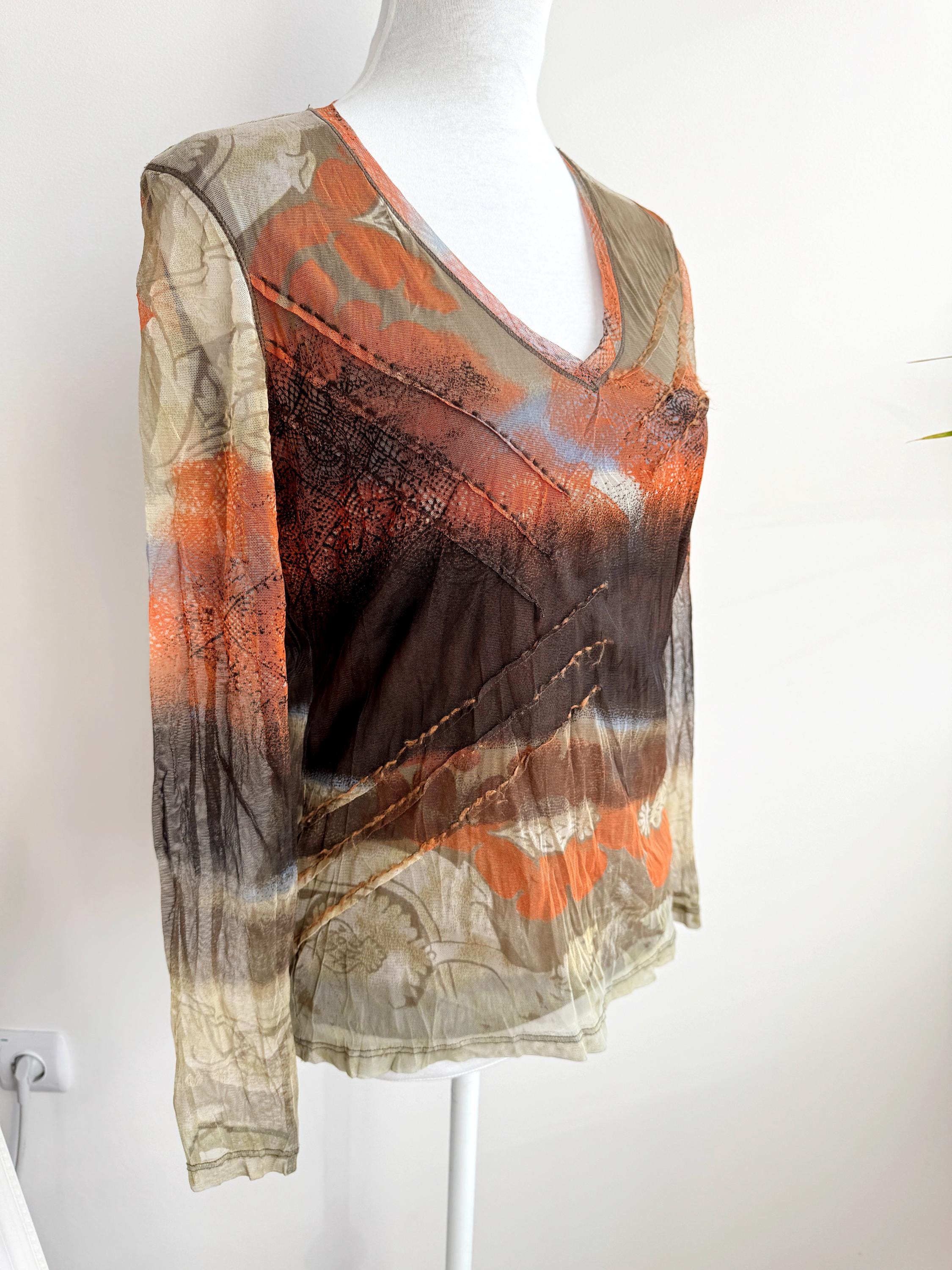 Step back into the effortlessly cool aesthetic of the late 90s and Y2K with this exceptional vintage Marc Aurel mesh top. This German-designed piece captures the essence of retro avant-garde fashion with its captivating abstract art print in vibrant shades of khaki green, orange, brown and beige.