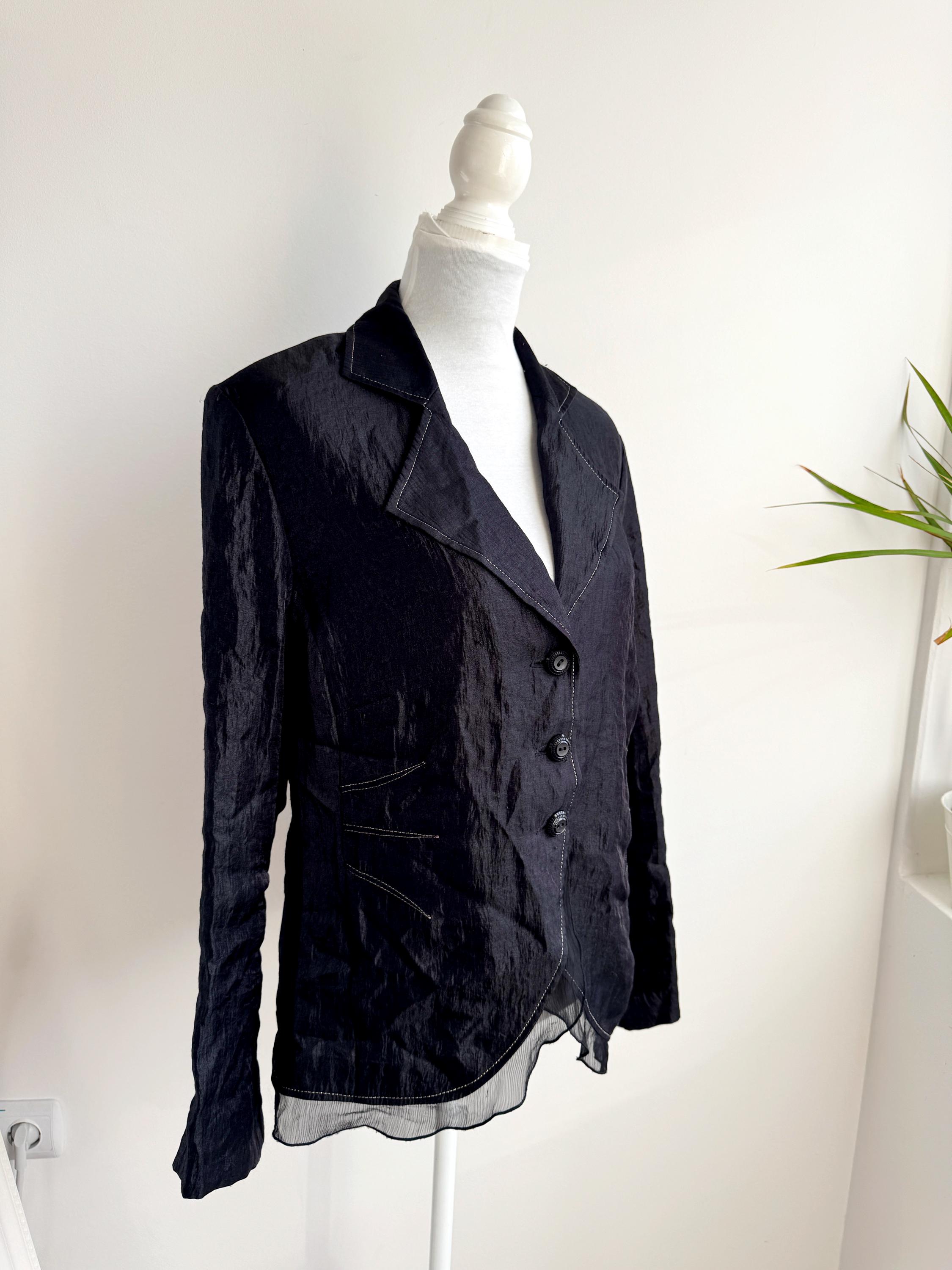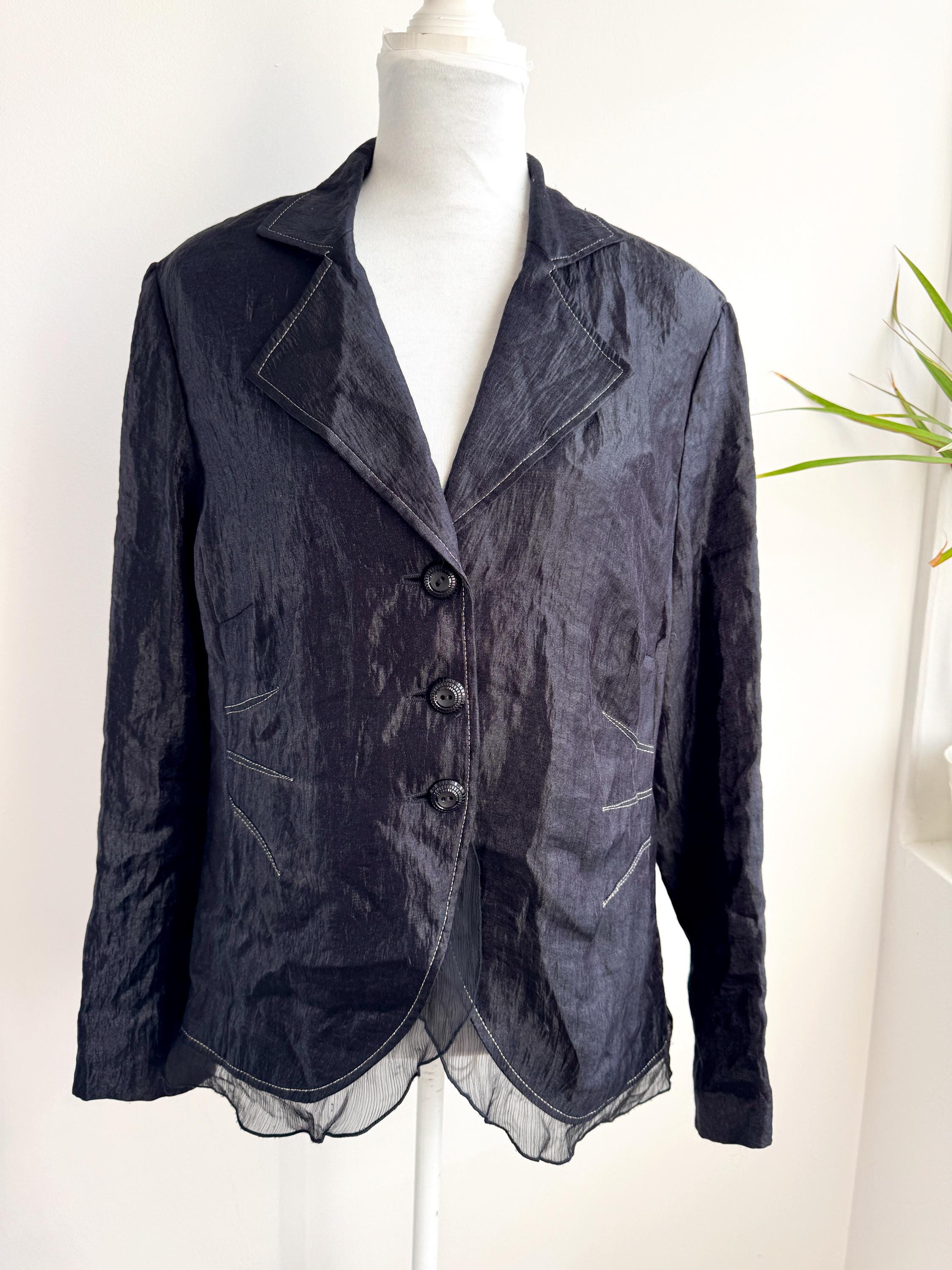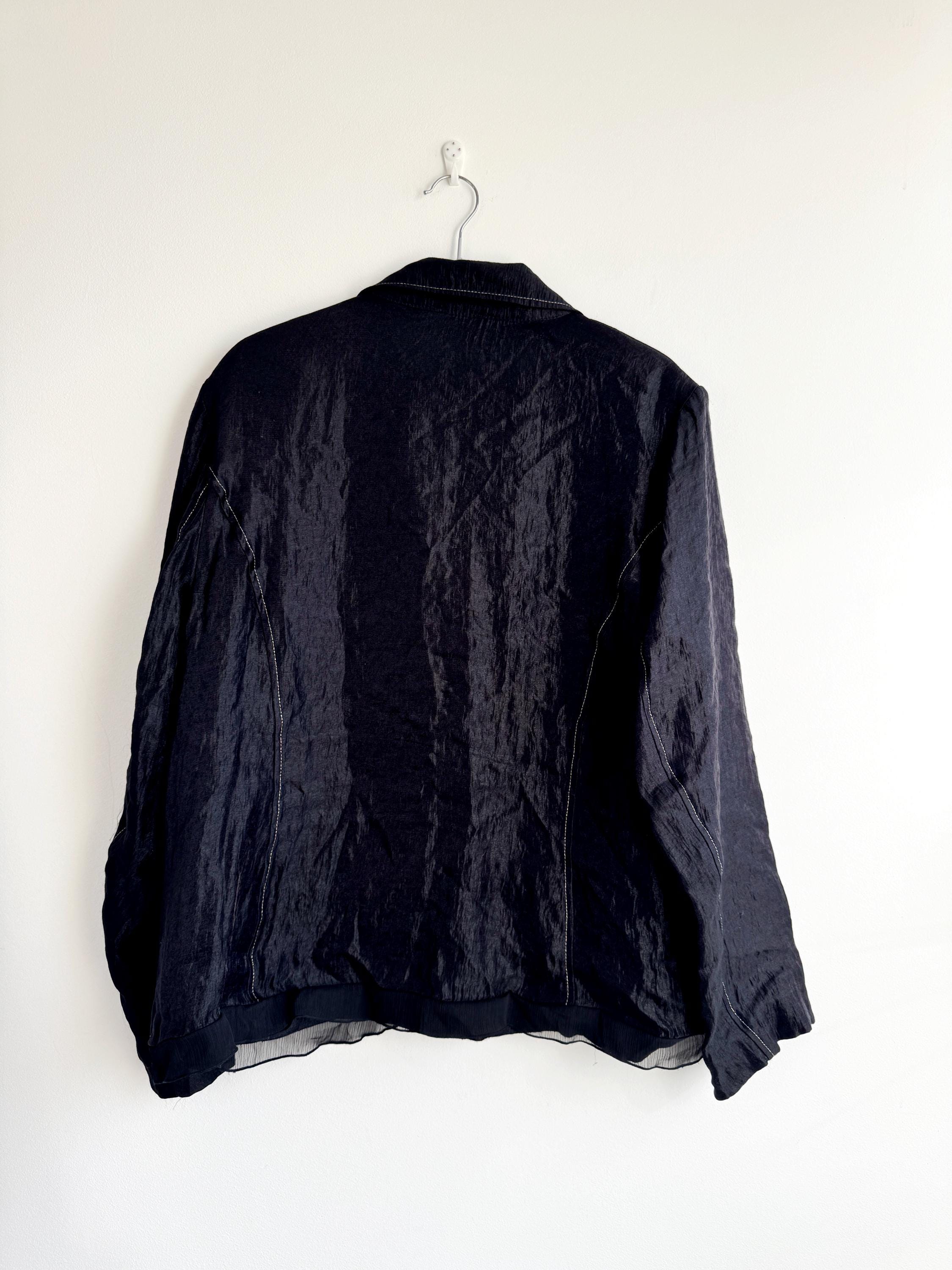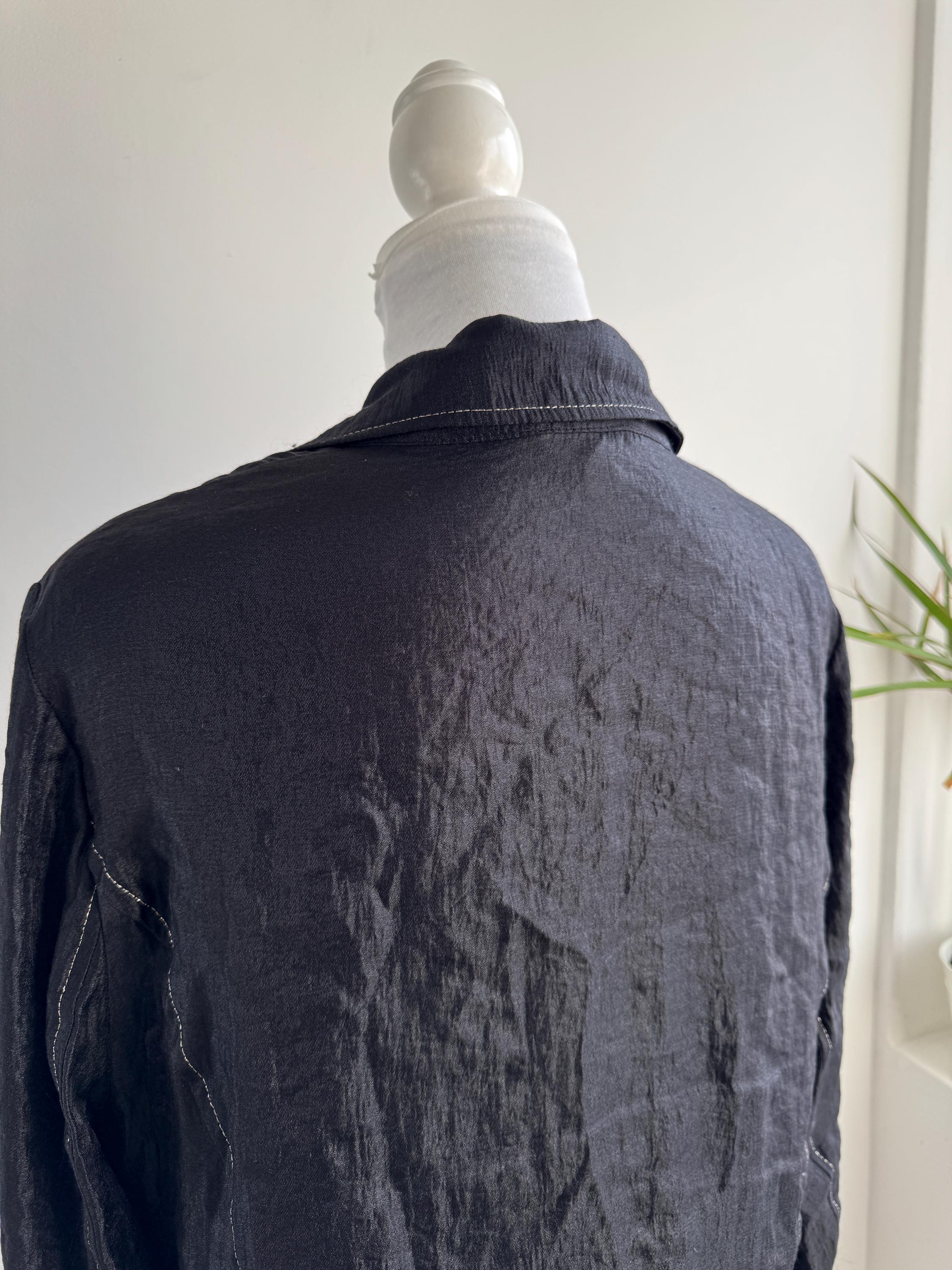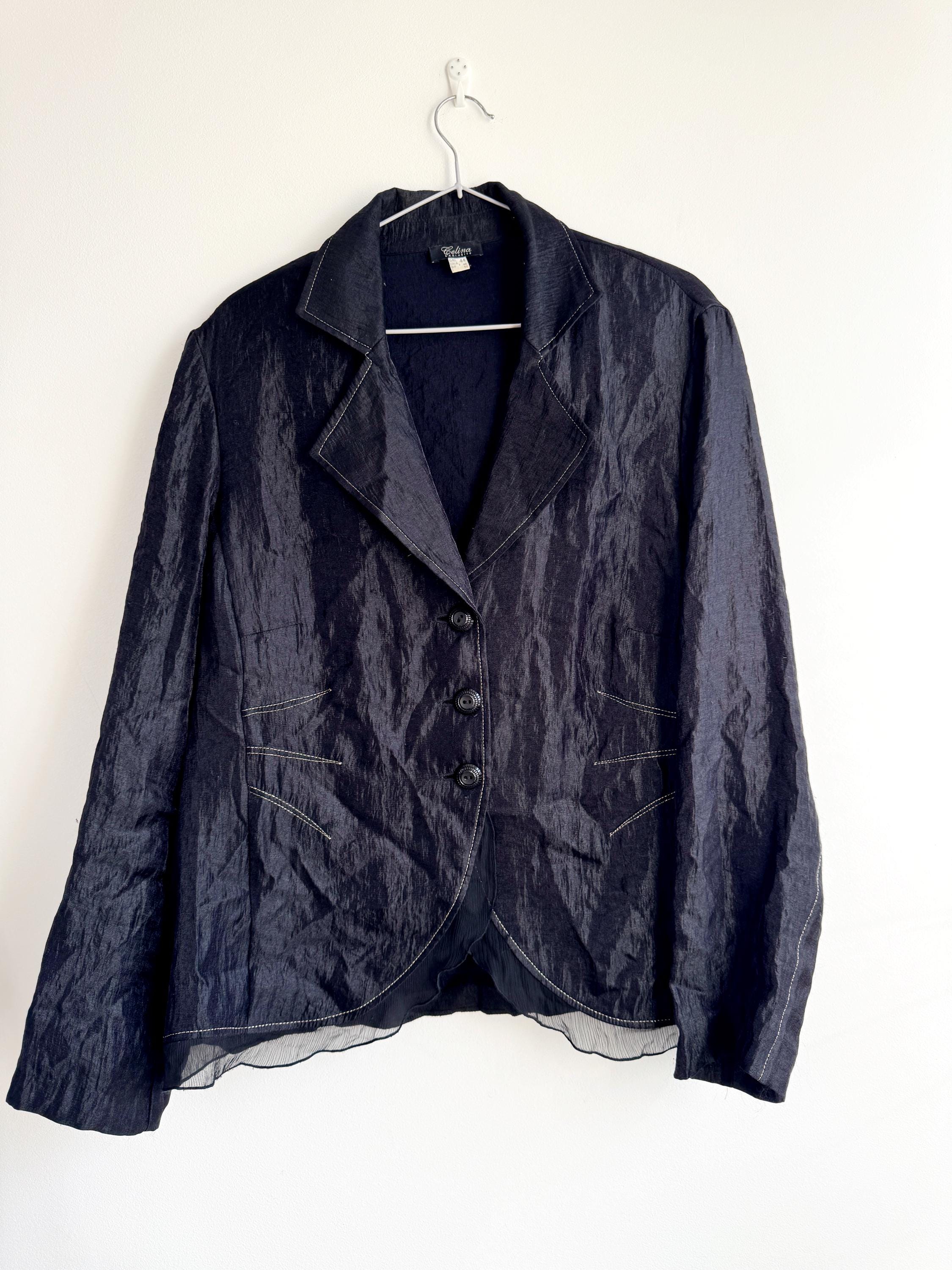 Elevate your professional or evening look with this unique lightweight vintage Celina Exclusive blazer in size XL women's. This striking shiny black jacket transcends ordinary outerwear with its sophisticated details and incredible texture. The fabric features a deliberate crinkle/crush texture that catches the light and adds depth, while the contrasting white top-stitching outlines the lapels, pockets, and seams, giving it a distinctive, handmade feel.