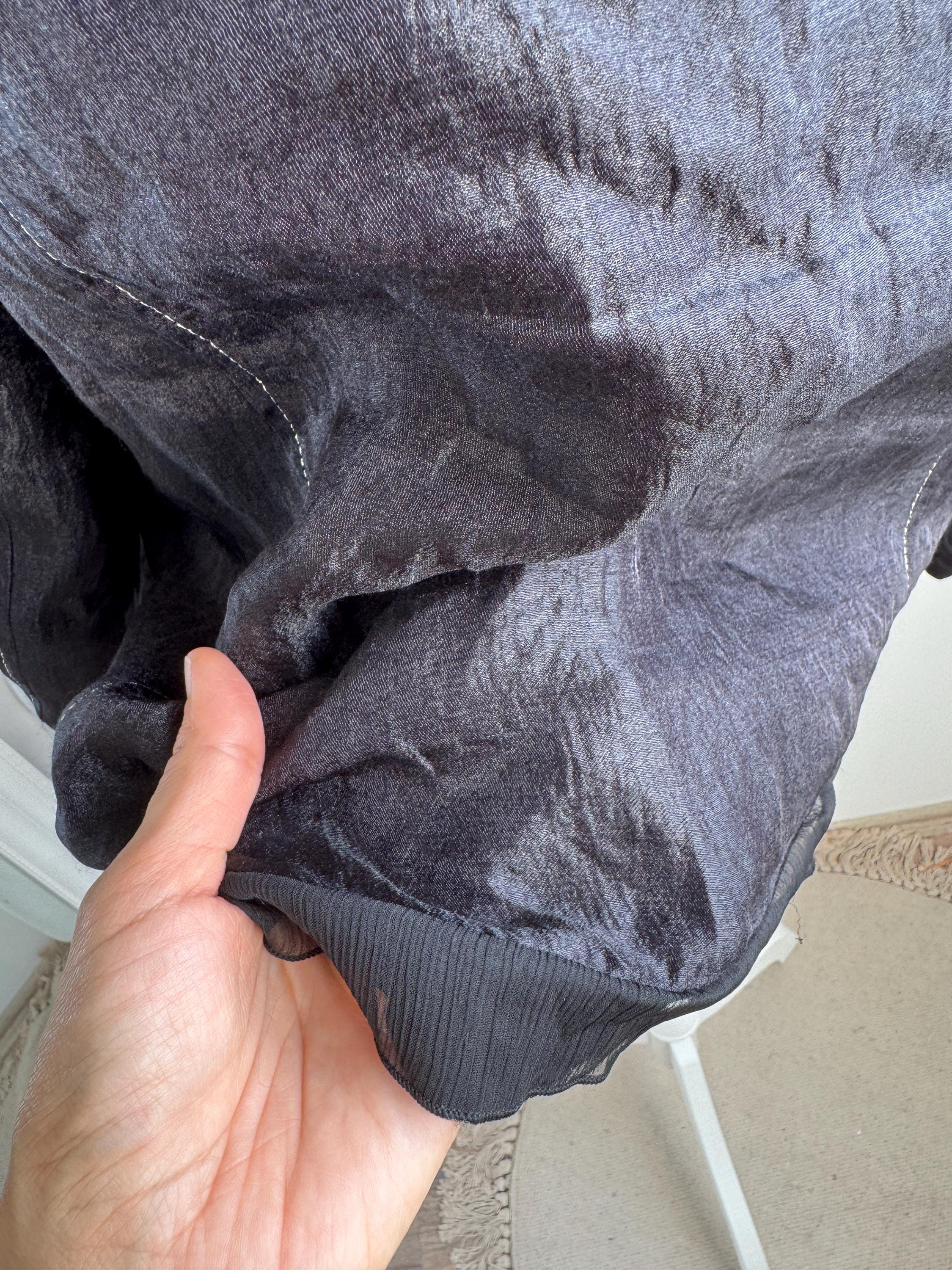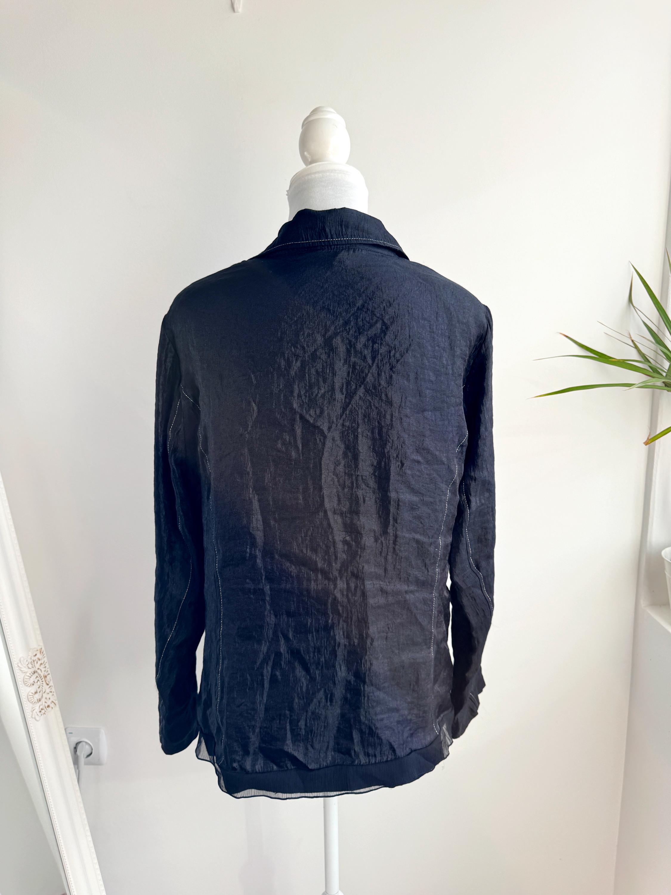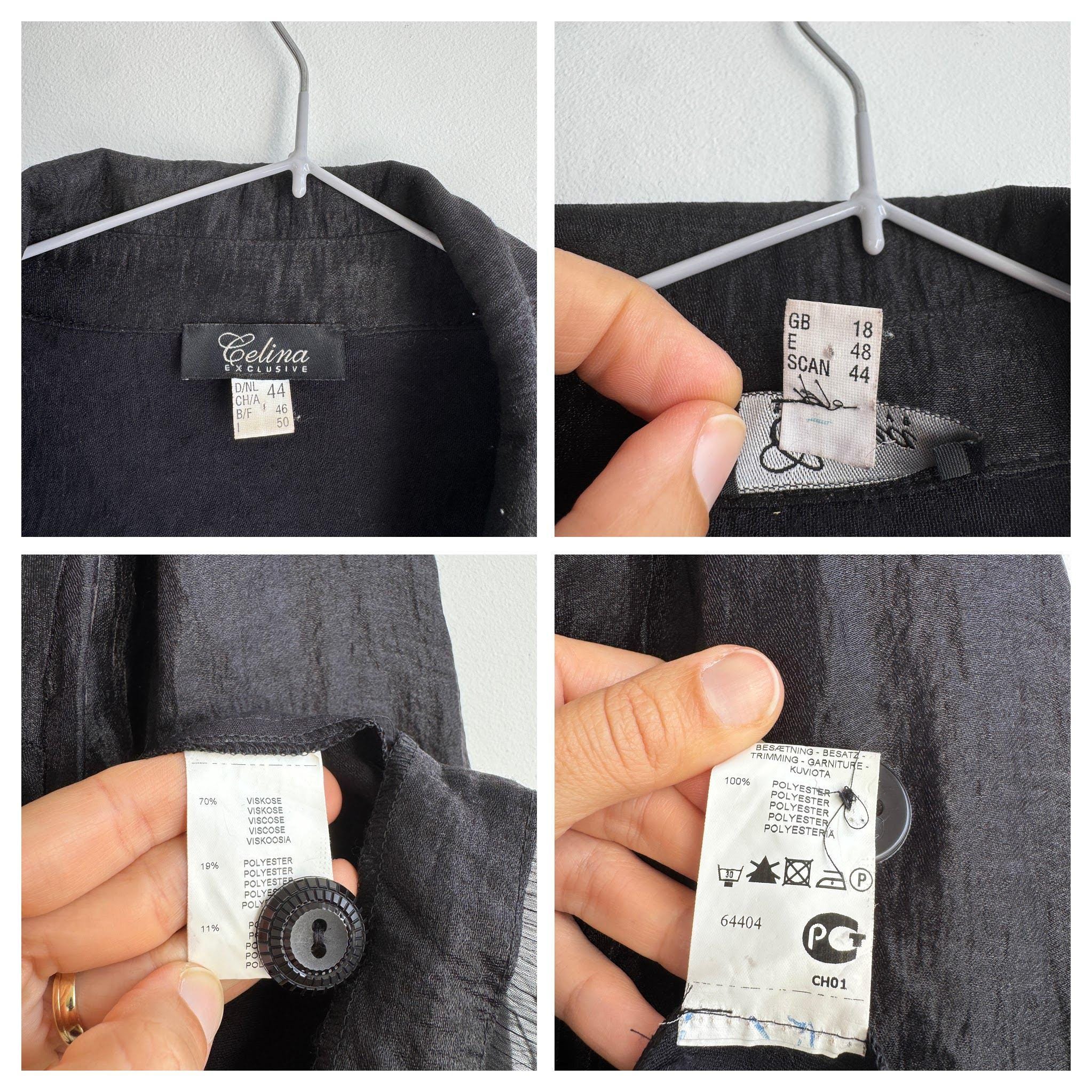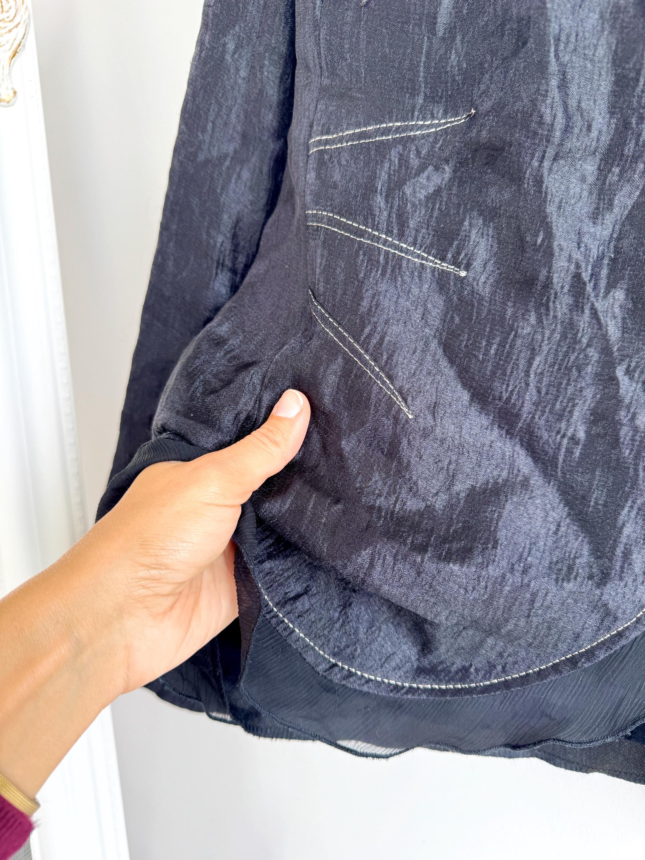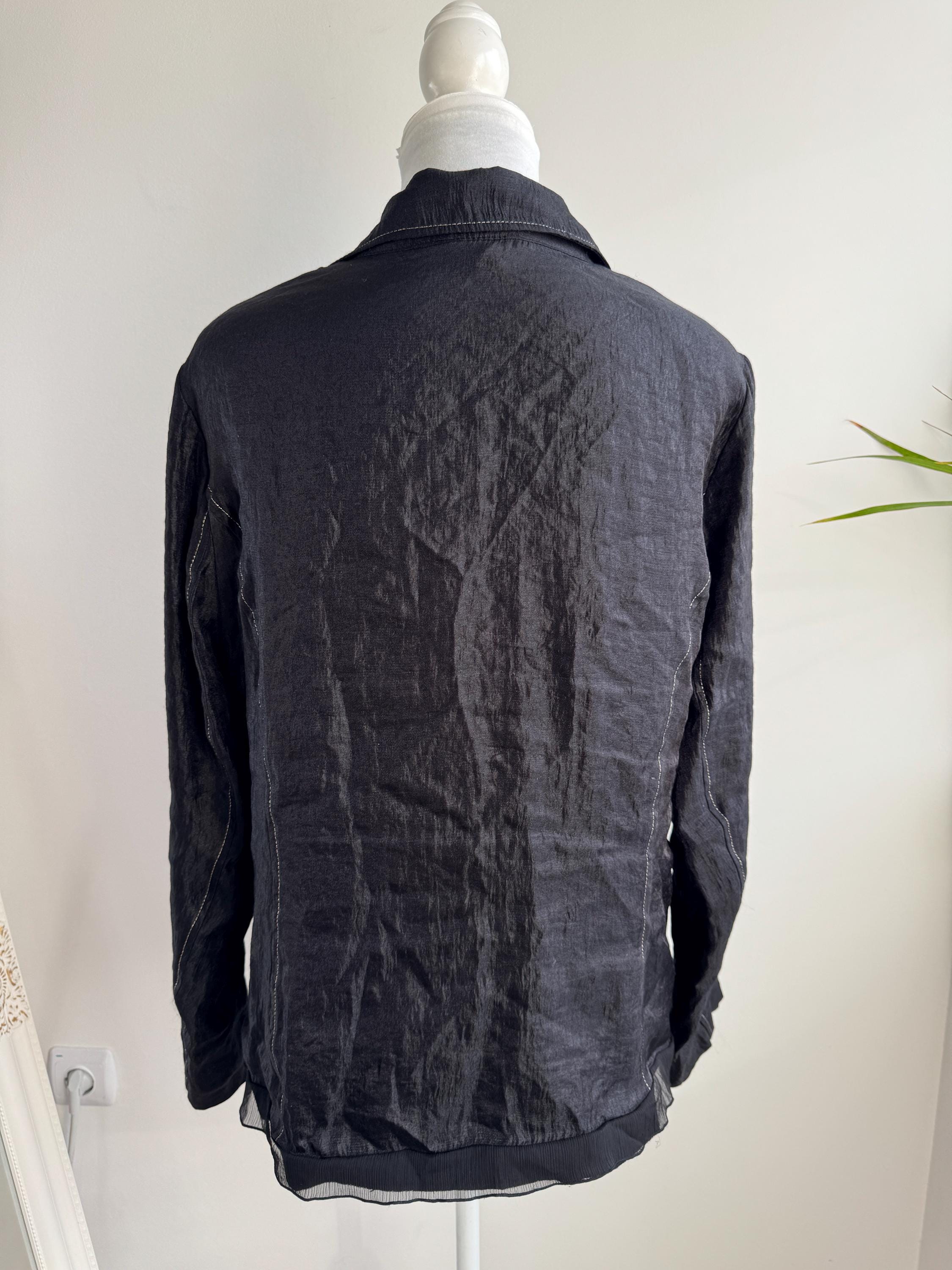Elevate your professional or evening look with this unique lightweight vintage Celina Exclusive blazer in size XL women's. This striking shiny black jacket transcends ordinary outerwear with its sophisticated details and incredible texture. The fabric features a deliberate crinkle/crush texture that catches the light and adds depth, while the contrasting white top-stitching outlines the lapels, pockets, and seams, giving it a distinctive, handmade feel.