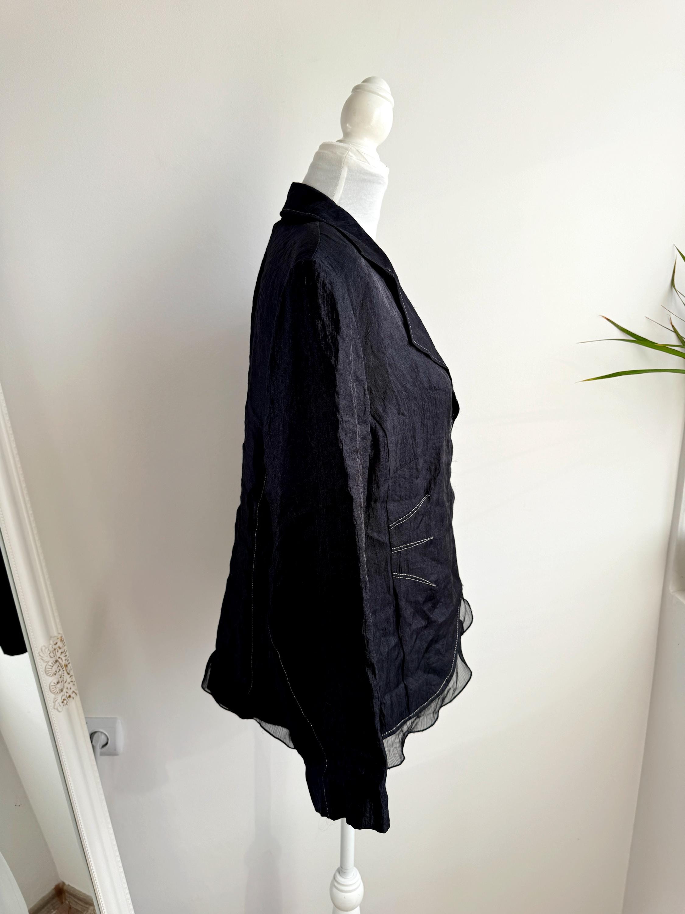 This black evening blazer is a perfect blend of structure and fluidity. It features a three-button front closure and a subtle, tiered mesh trim along the bottom hem that gives it an avant-garde, flowing silhouette. This lightweight unlined blazer is ideal for creating an oversized dark academia aesthetic, or dressing up a Goth or Emo inspired outfit. Its composition makes it a wonderful lightweight jacket for layering across seasons.