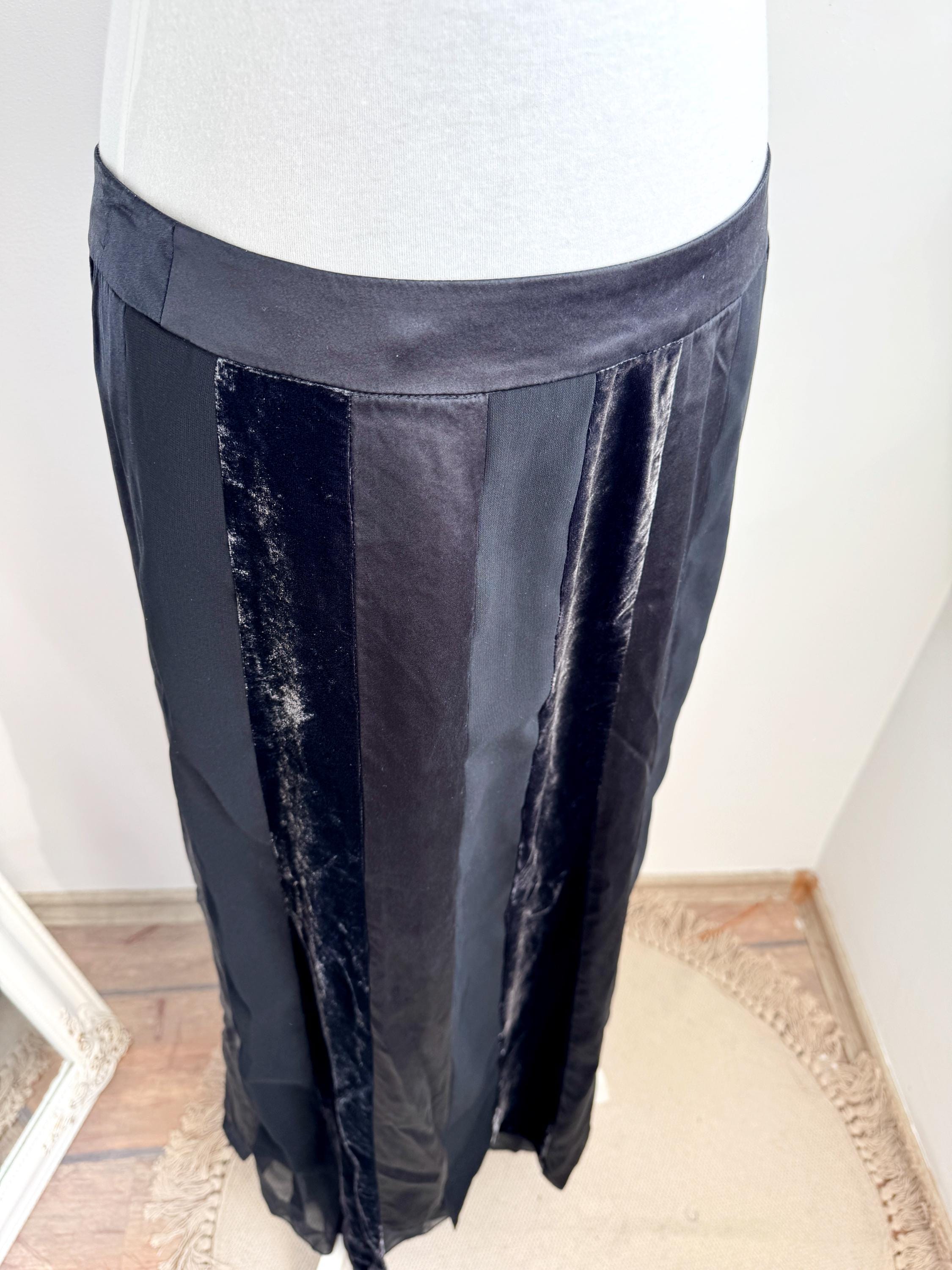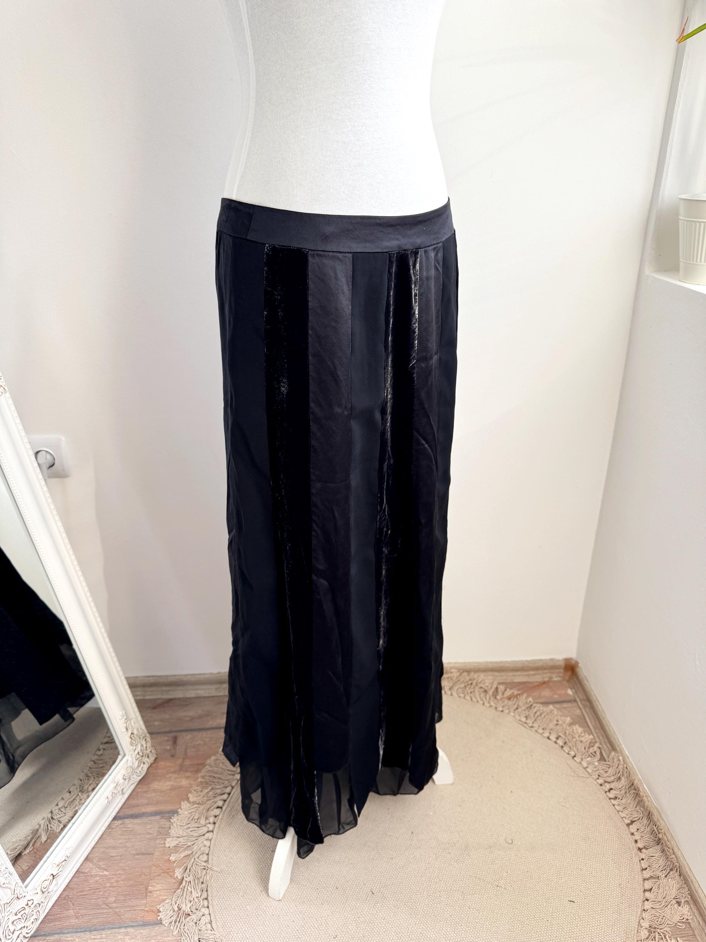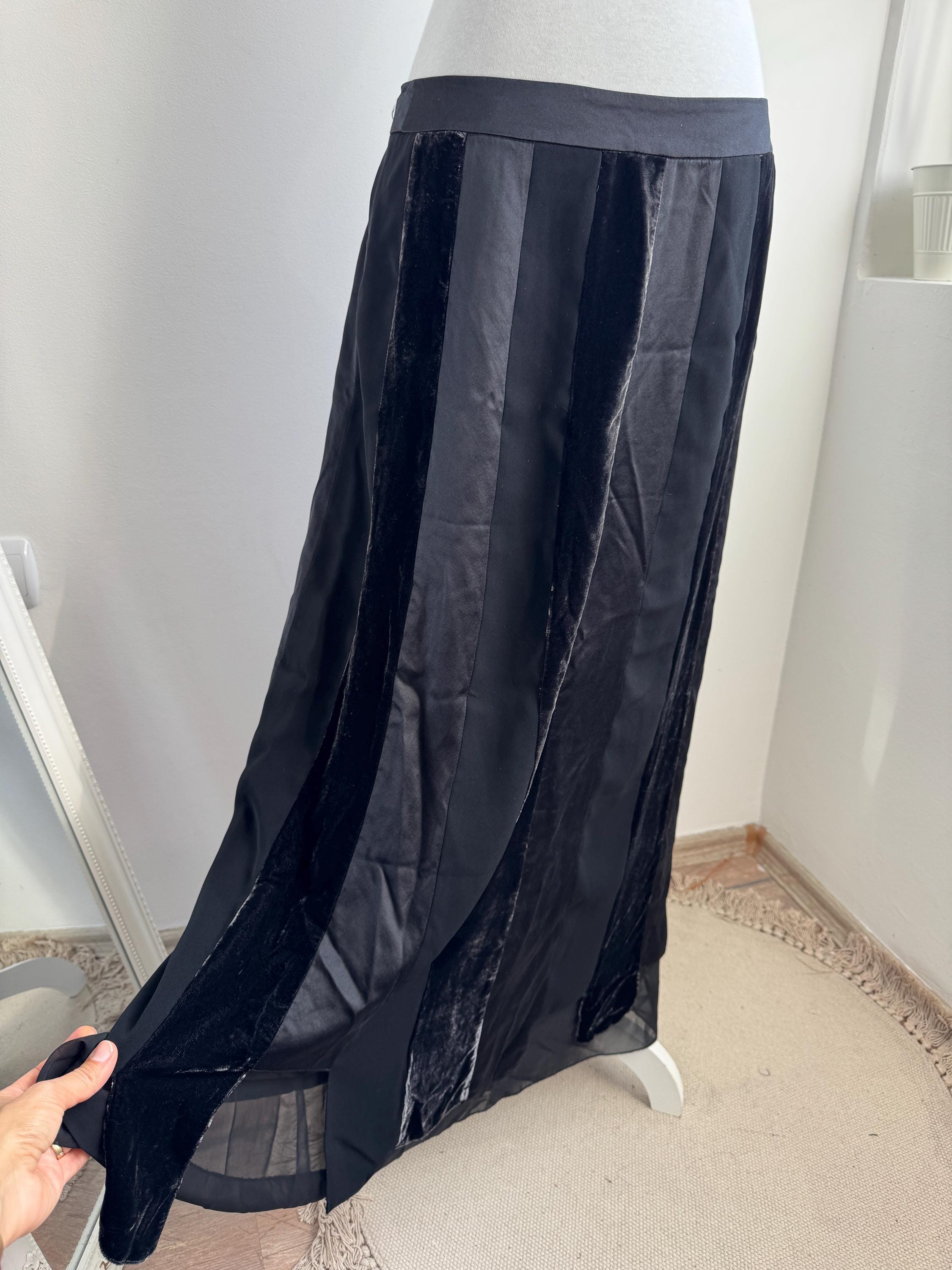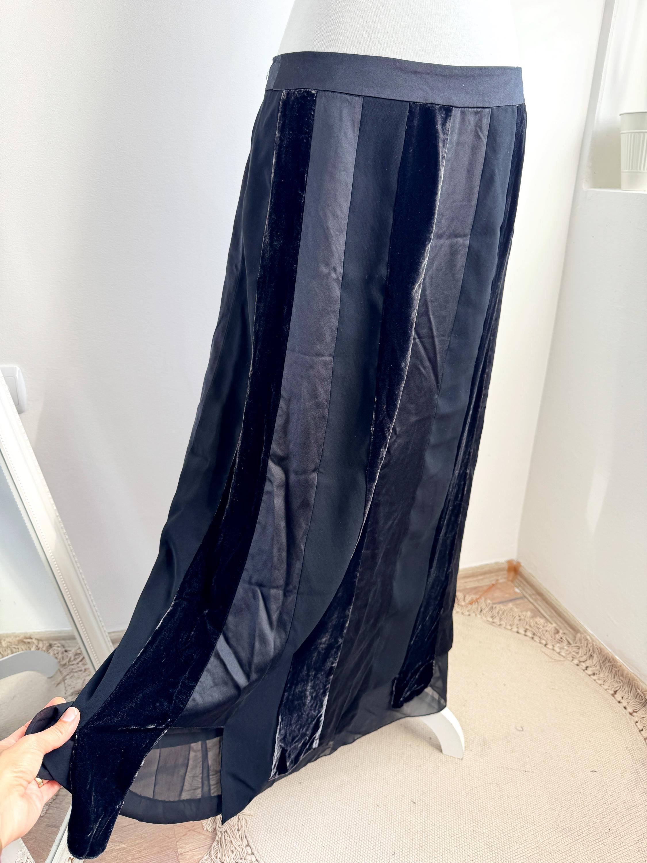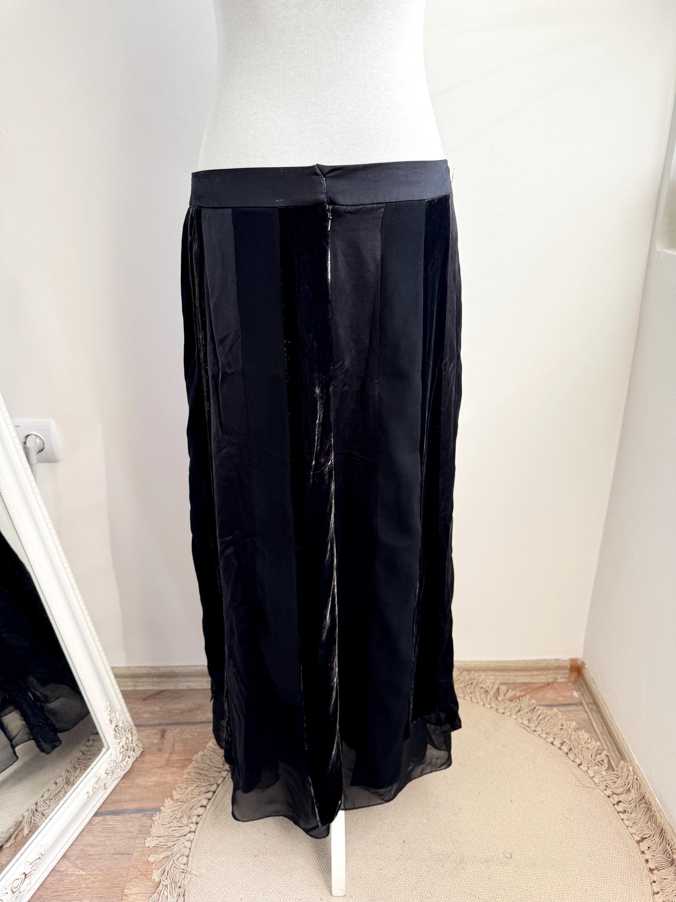 Embrace timeless sophistication with this exquisite vintage Betty Barclay maxi skirt in size L. This black vevlet skirt perfectly captures the luxurious, textural depth popular in the late 90s and Y2K era. It features stunning alternating vertical panels of plush black velvet and smooth silk/viscose blend fabric, creating a rich, subtle striped effect that lengthens the silhouette.
