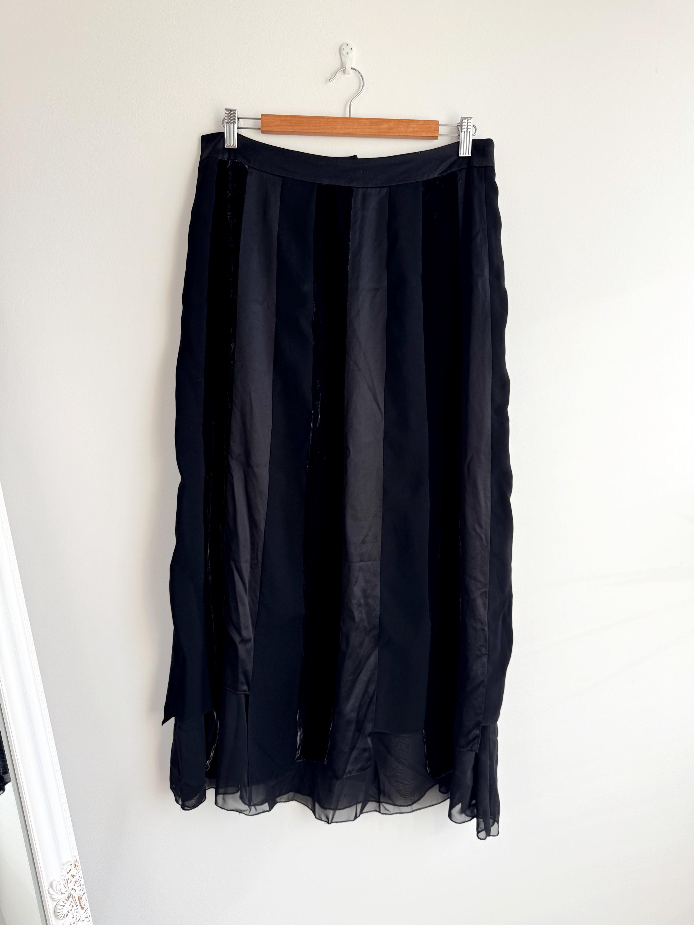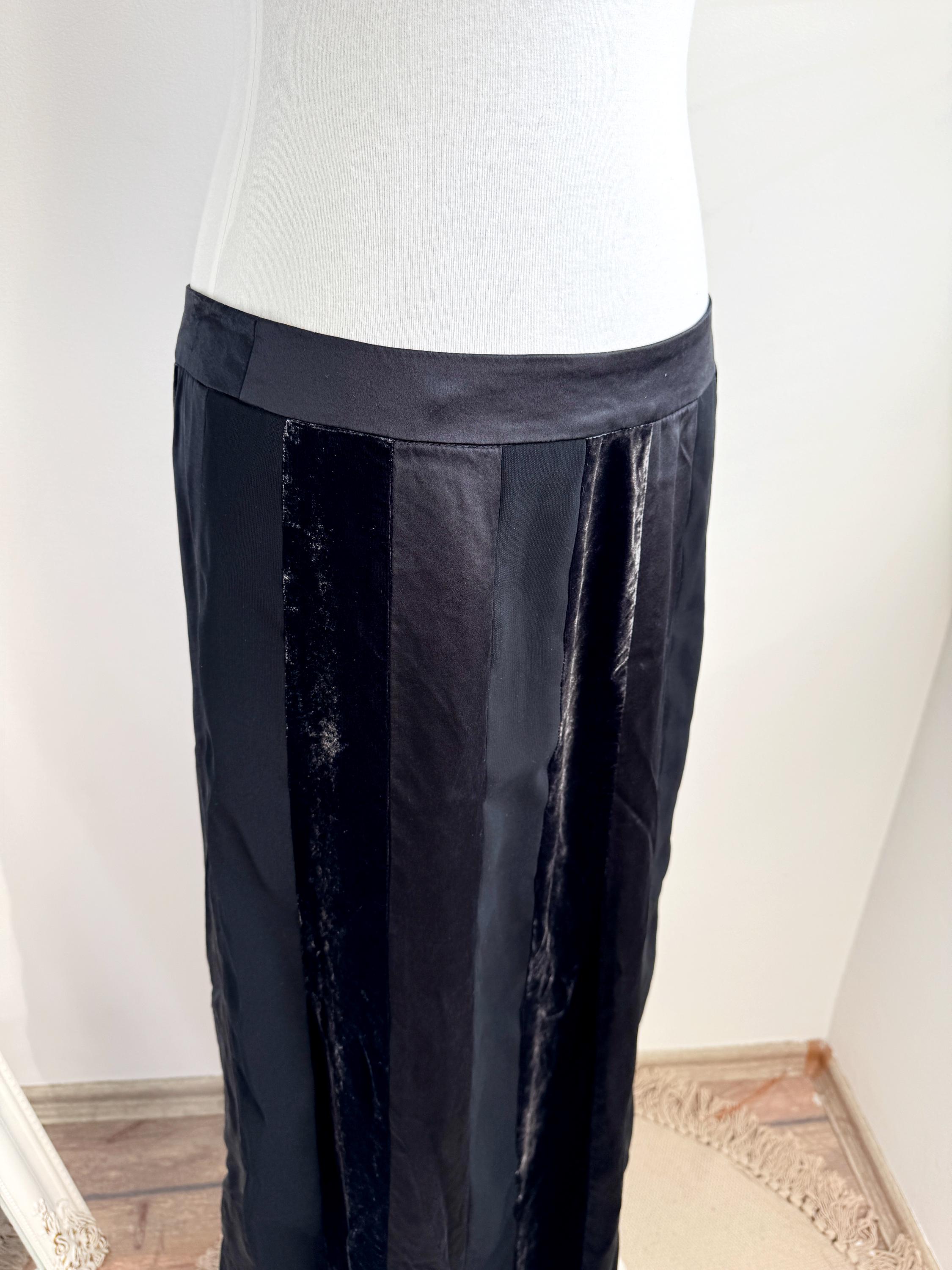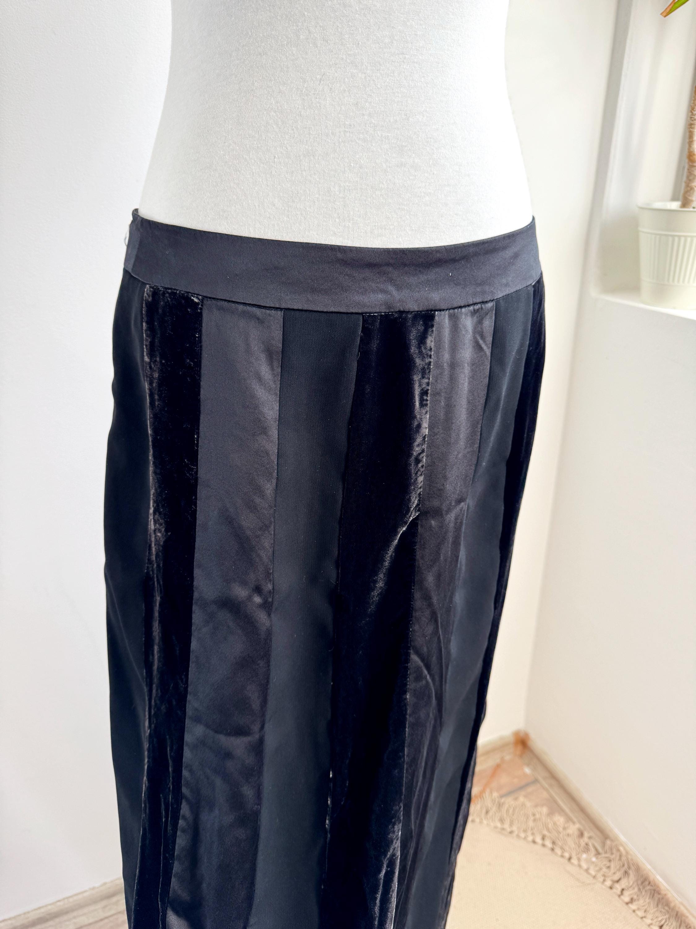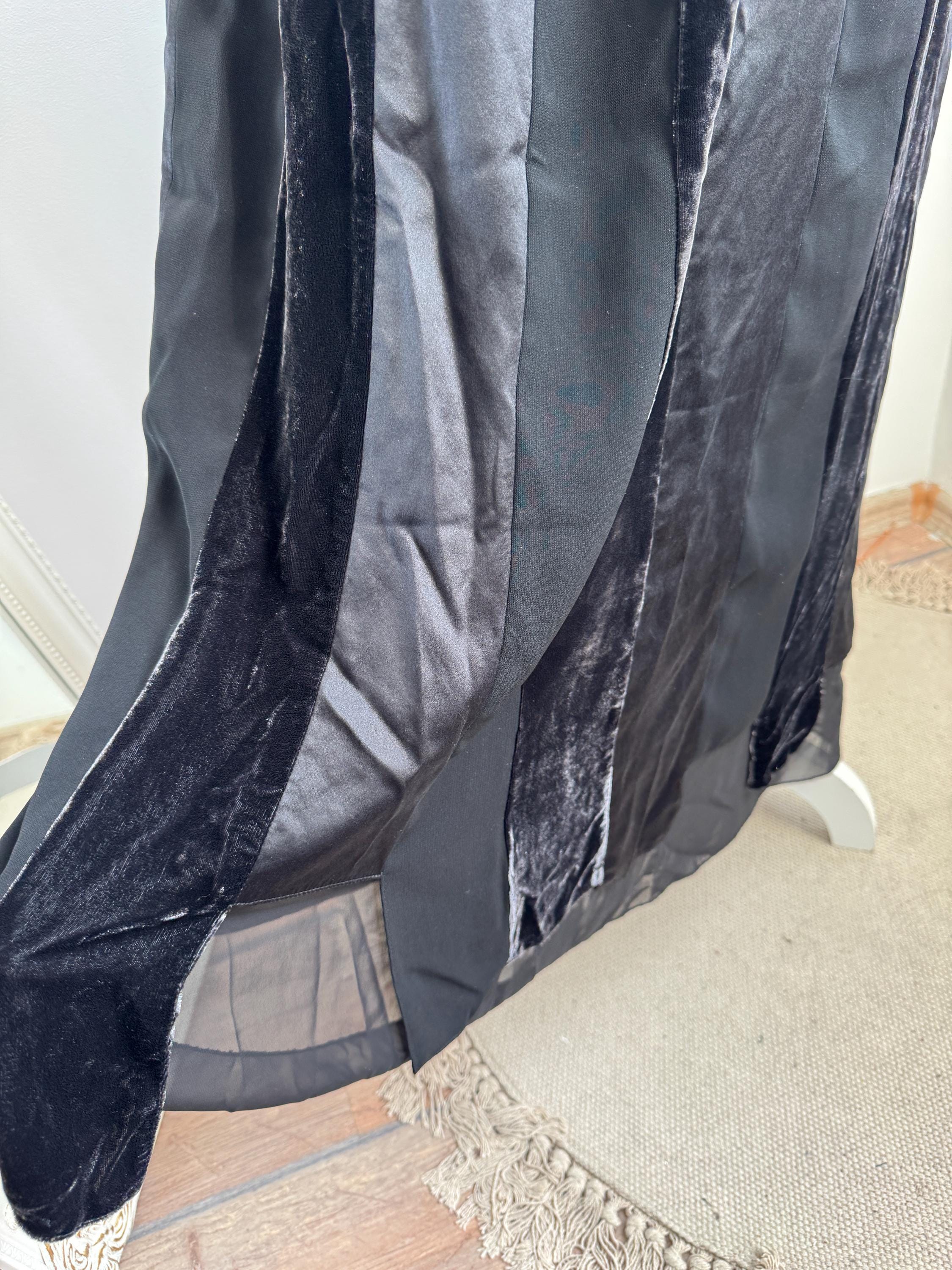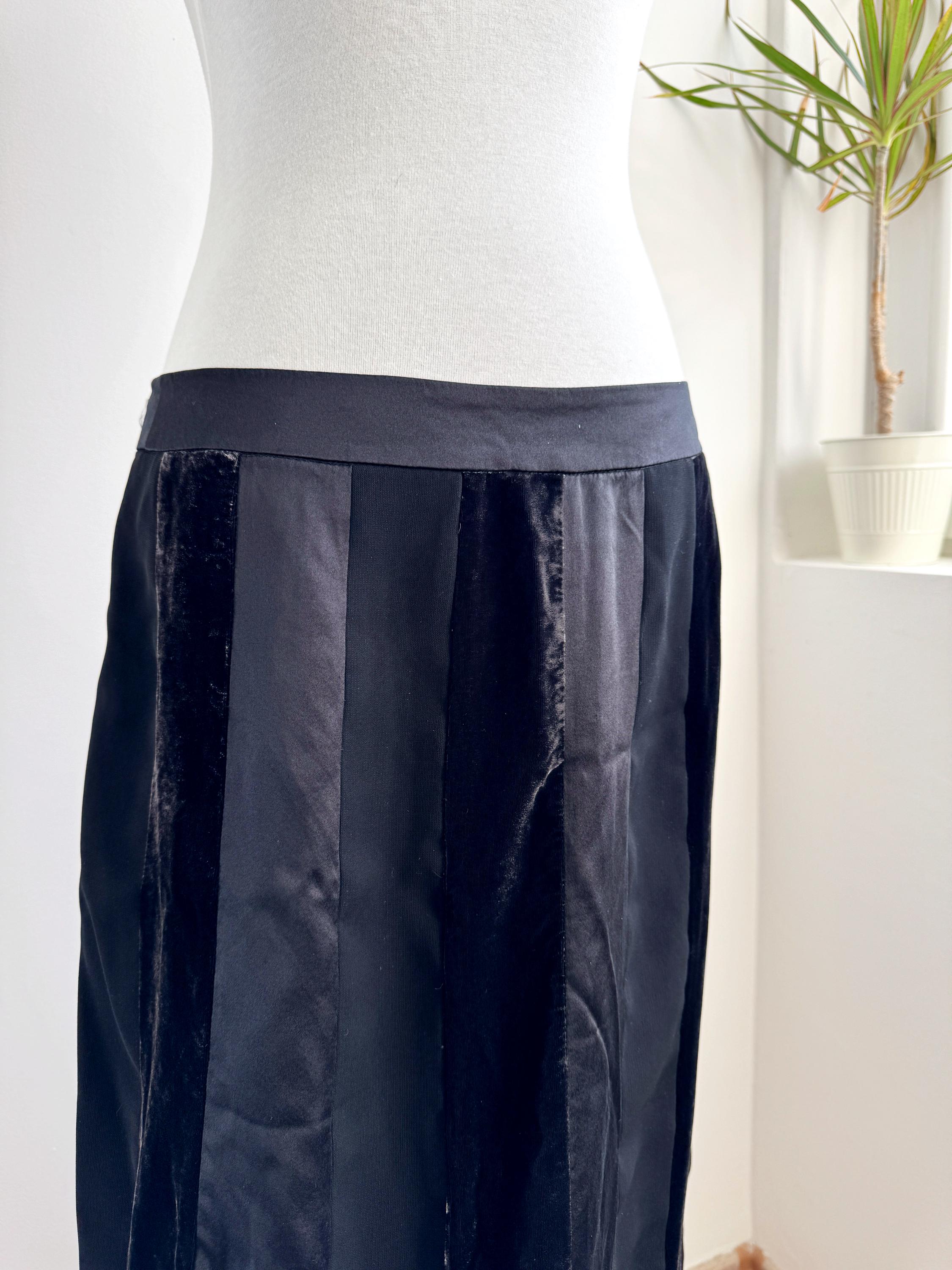 Embrace timeless sophistication with this exquisite vintage Betty Barclay maxi skirt in size L. This black vevlet skirt perfectly captures the luxurious, textural depth popular in the late 90s and Y2K era. It features stunning alternating vertical panels of plush black velvet and smooth silk/viscose blend fabric, creating a rich, subtle striped effect that lengthens the silhouette.