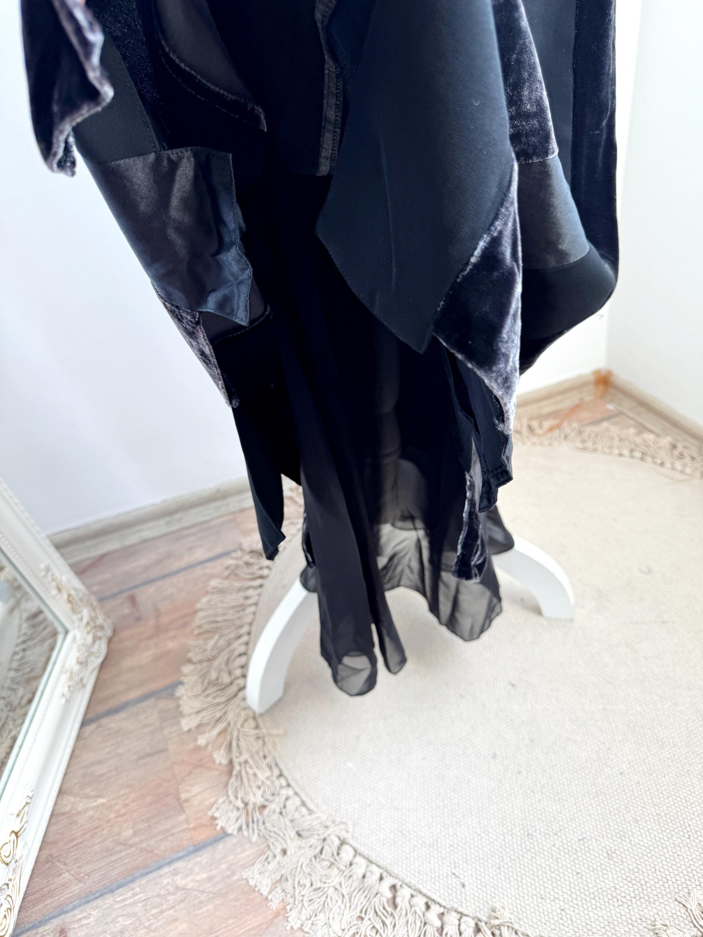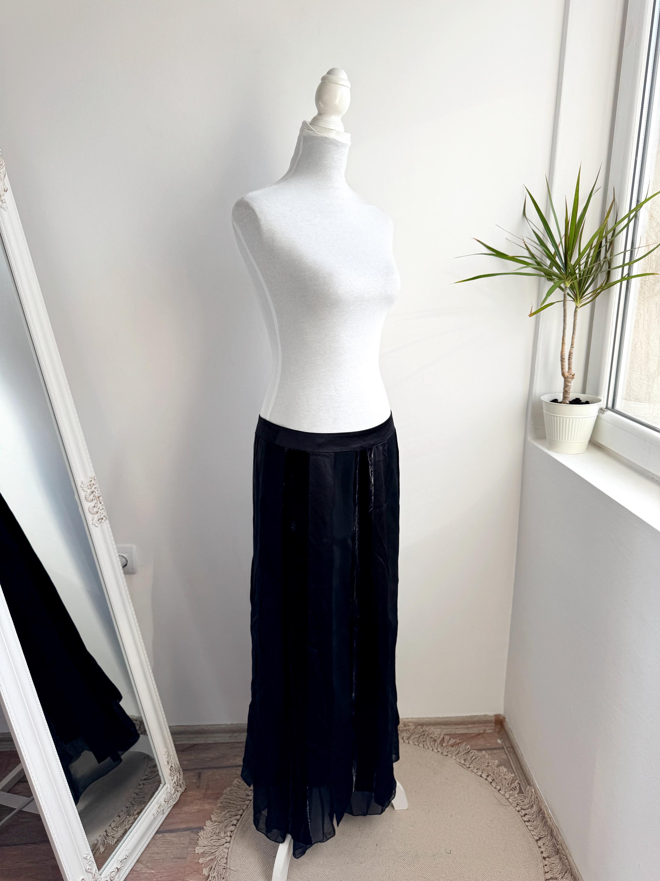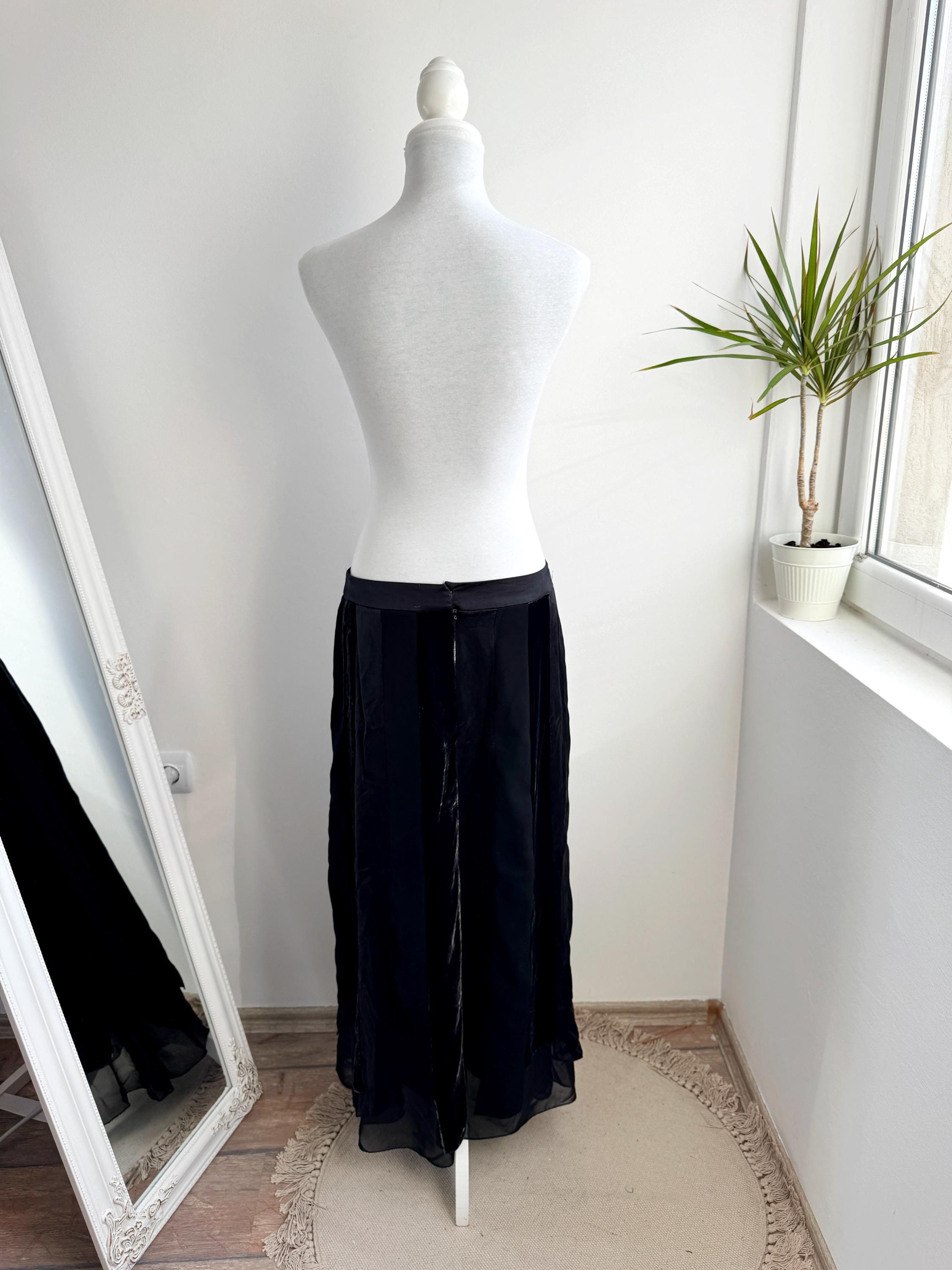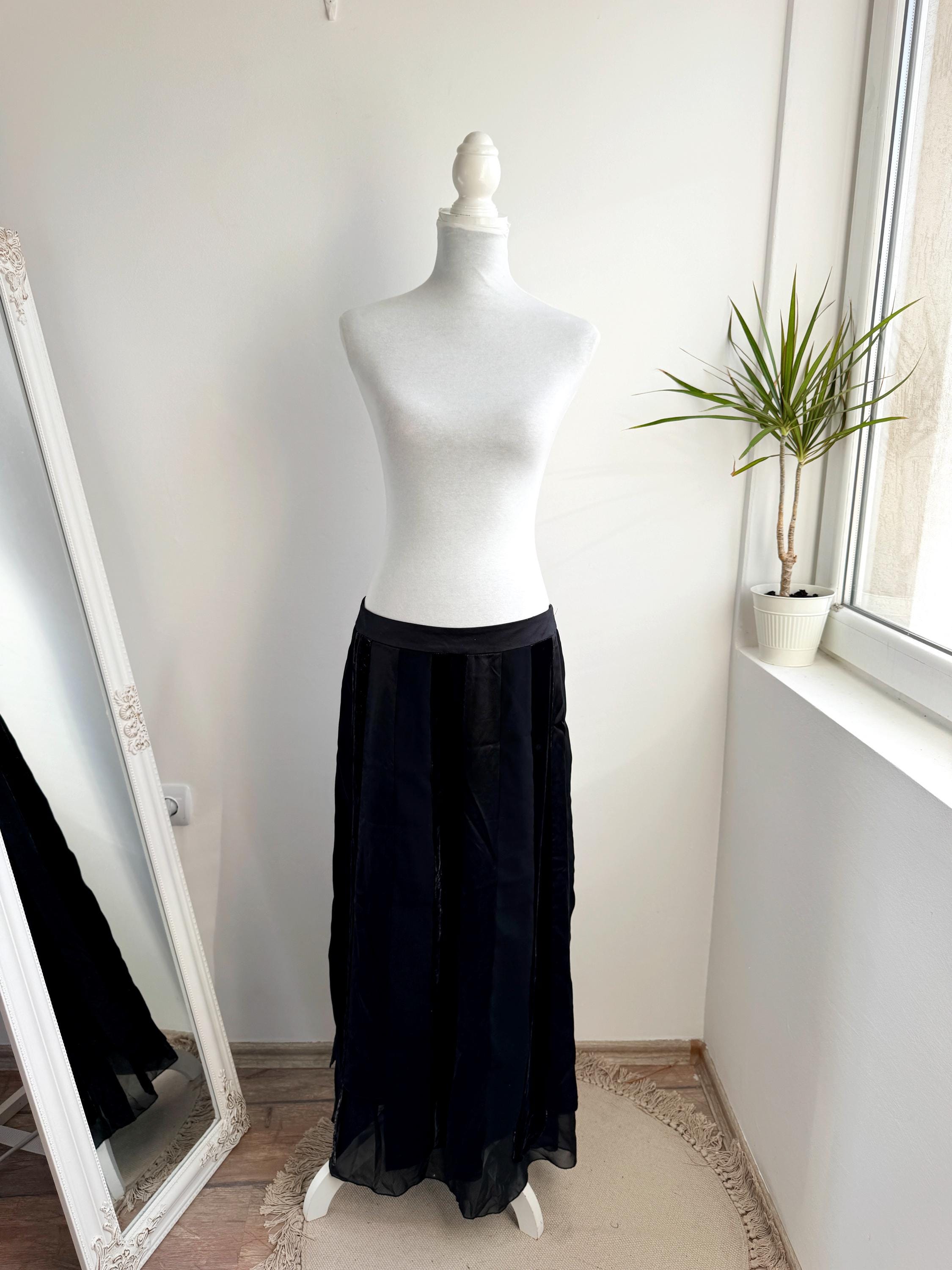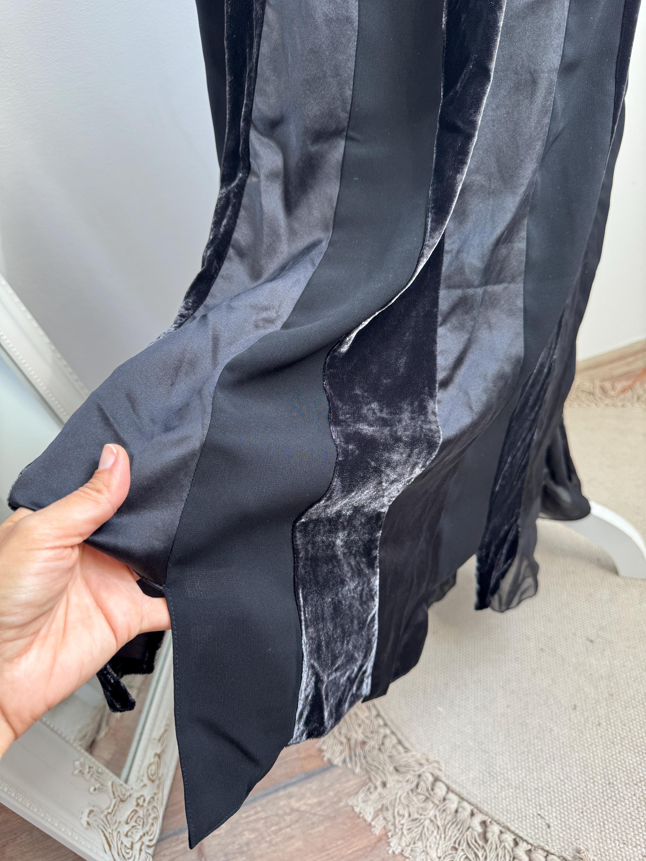 Embrace timeless sophistication with this exquisite vintage Betty Barclay maxi skirt in size L. This black vevlet skirt perfectly captures the luxurious, textural depth popular in the late 90s and Y2K era. It features stunning alternating vertical panels of plush black velvet and smooth silk/viscose blend fabric, creating a rich, subtle striped effect that lengthens the silhouette.