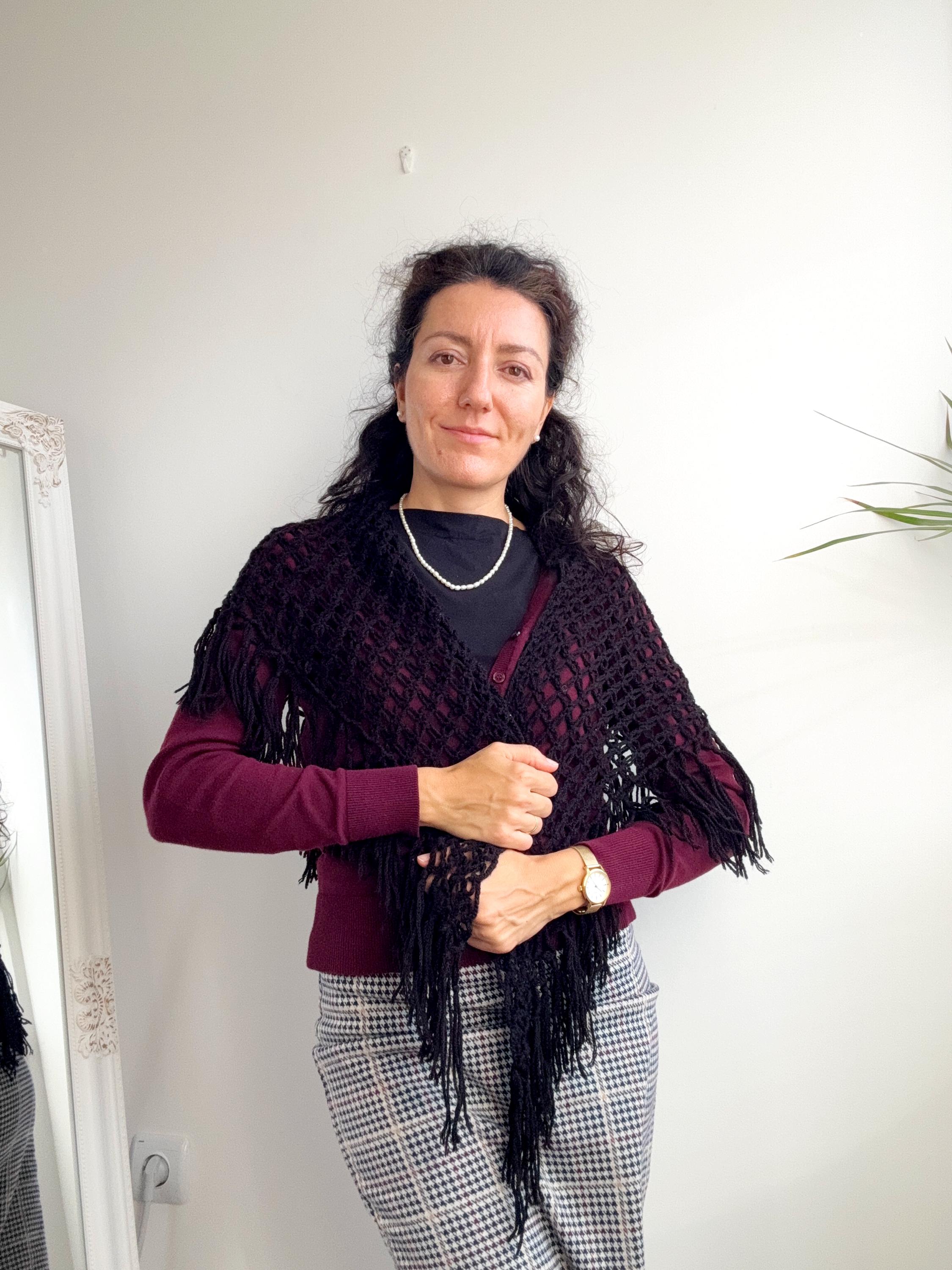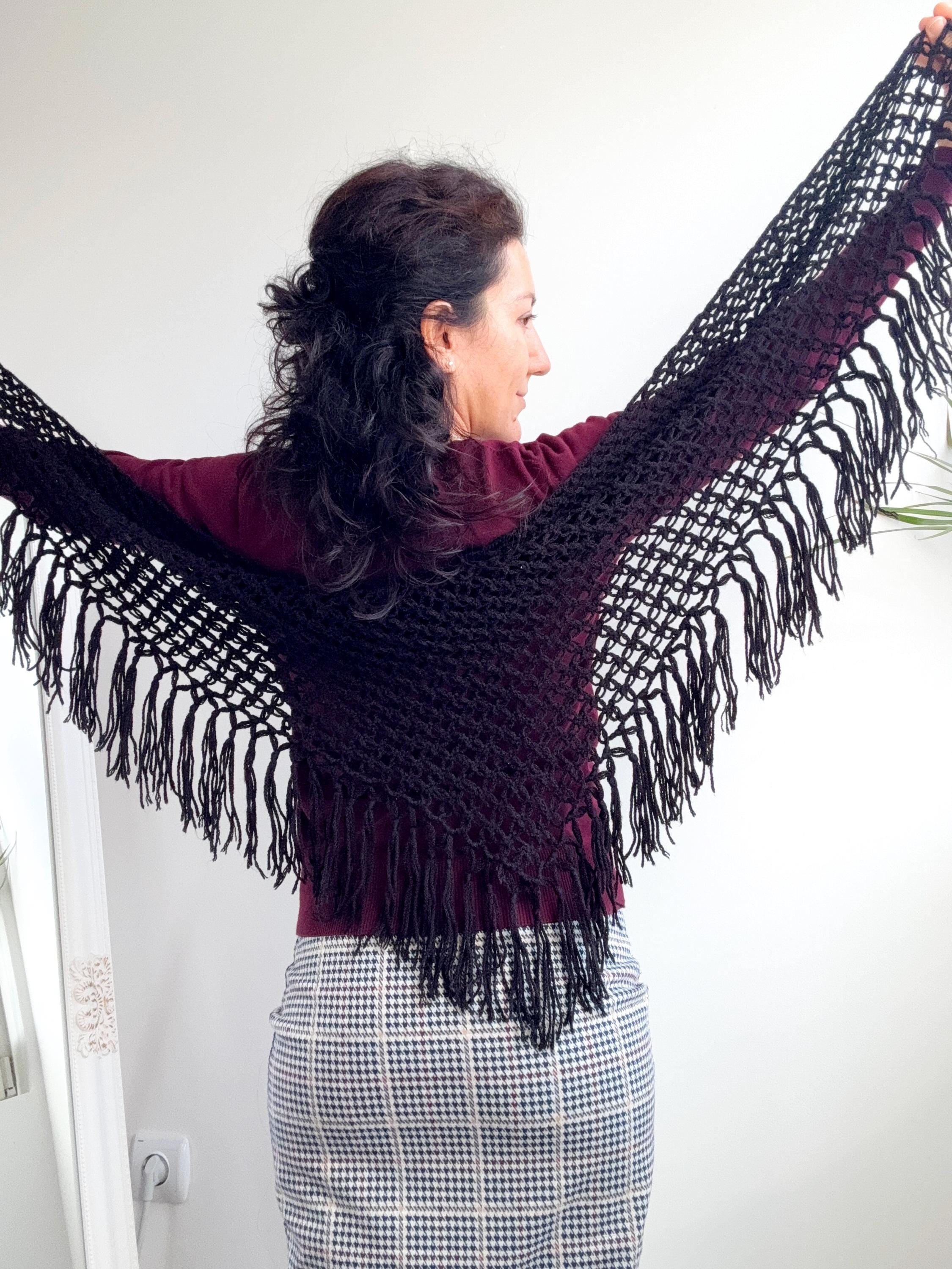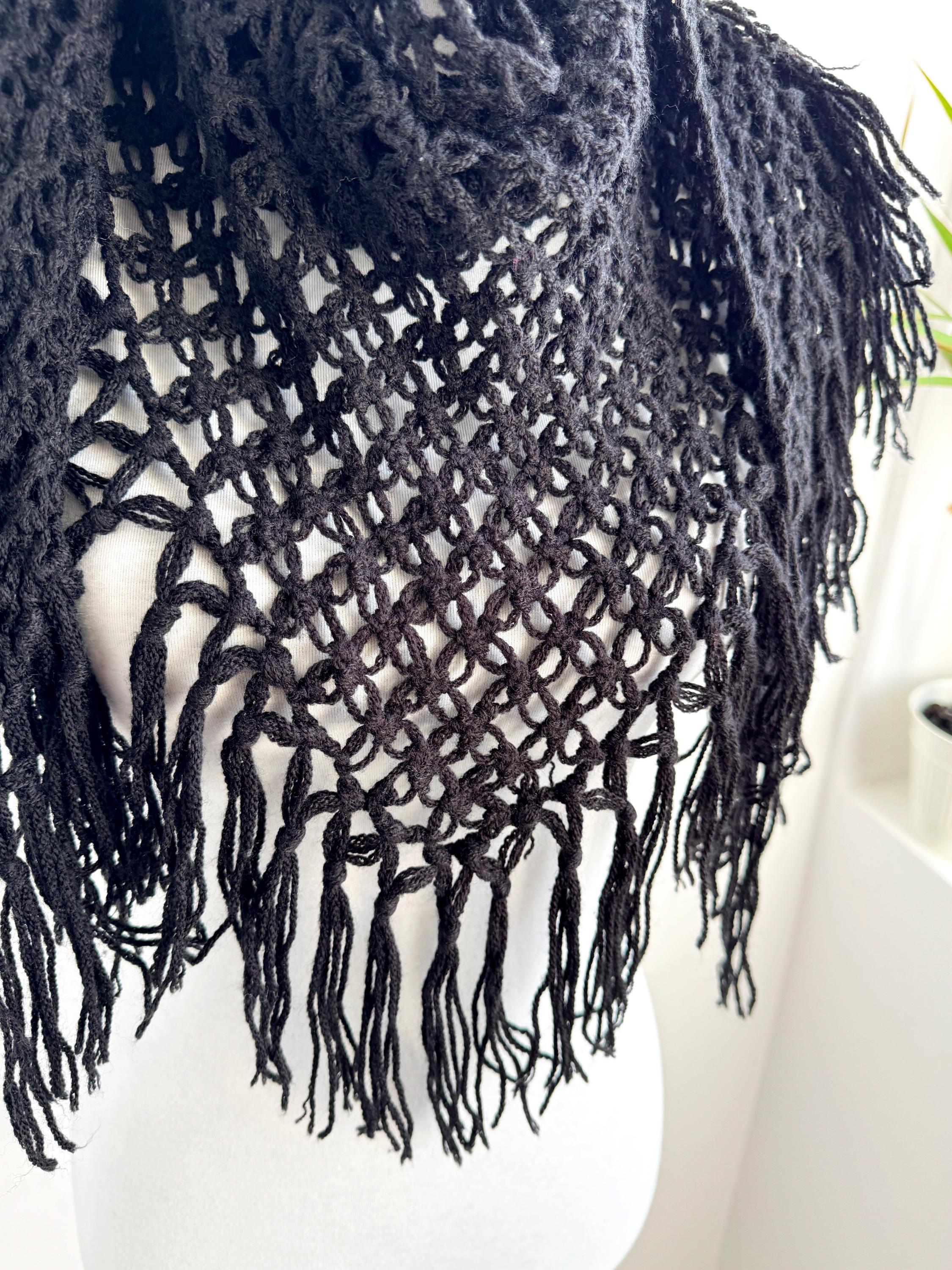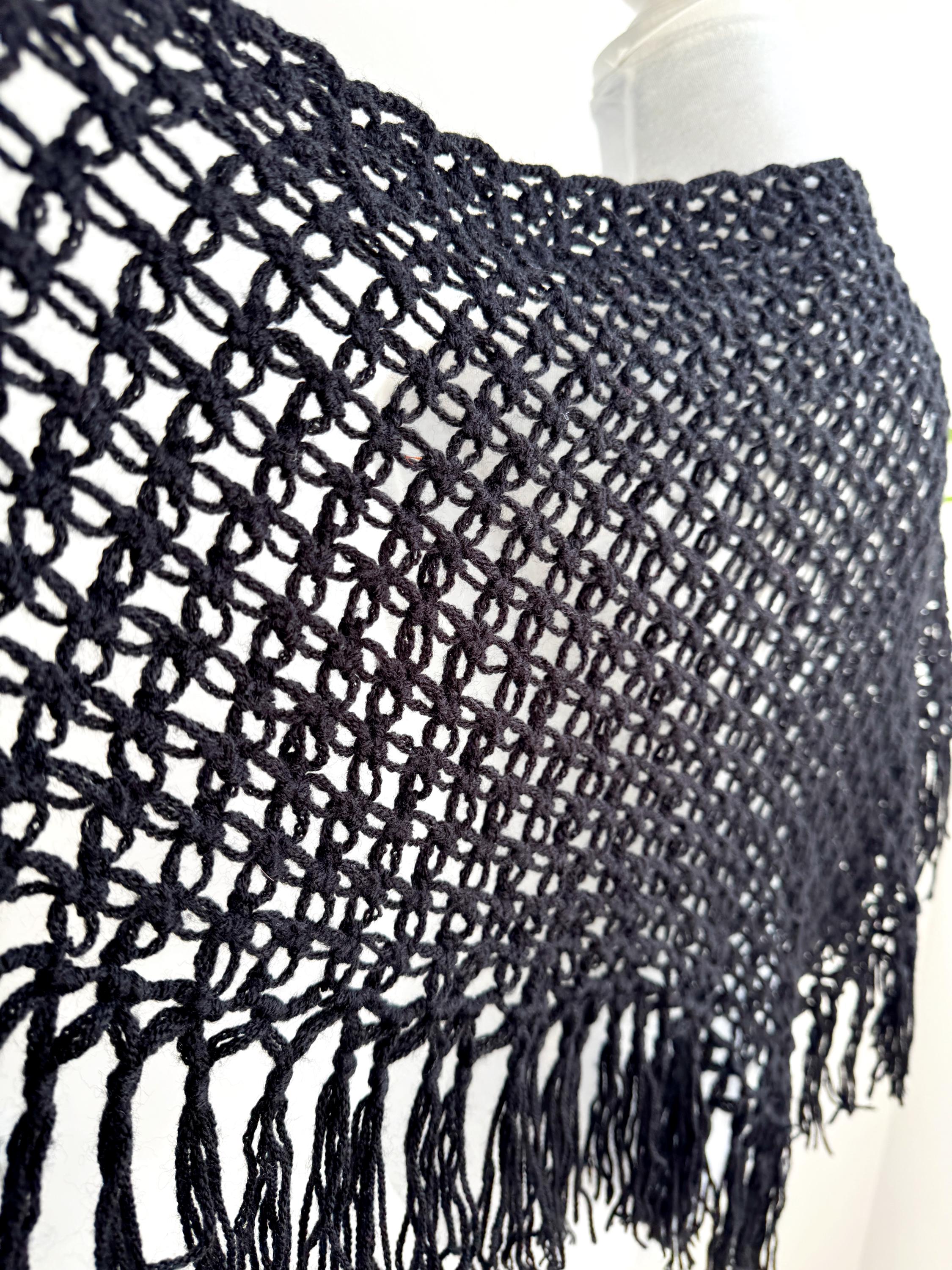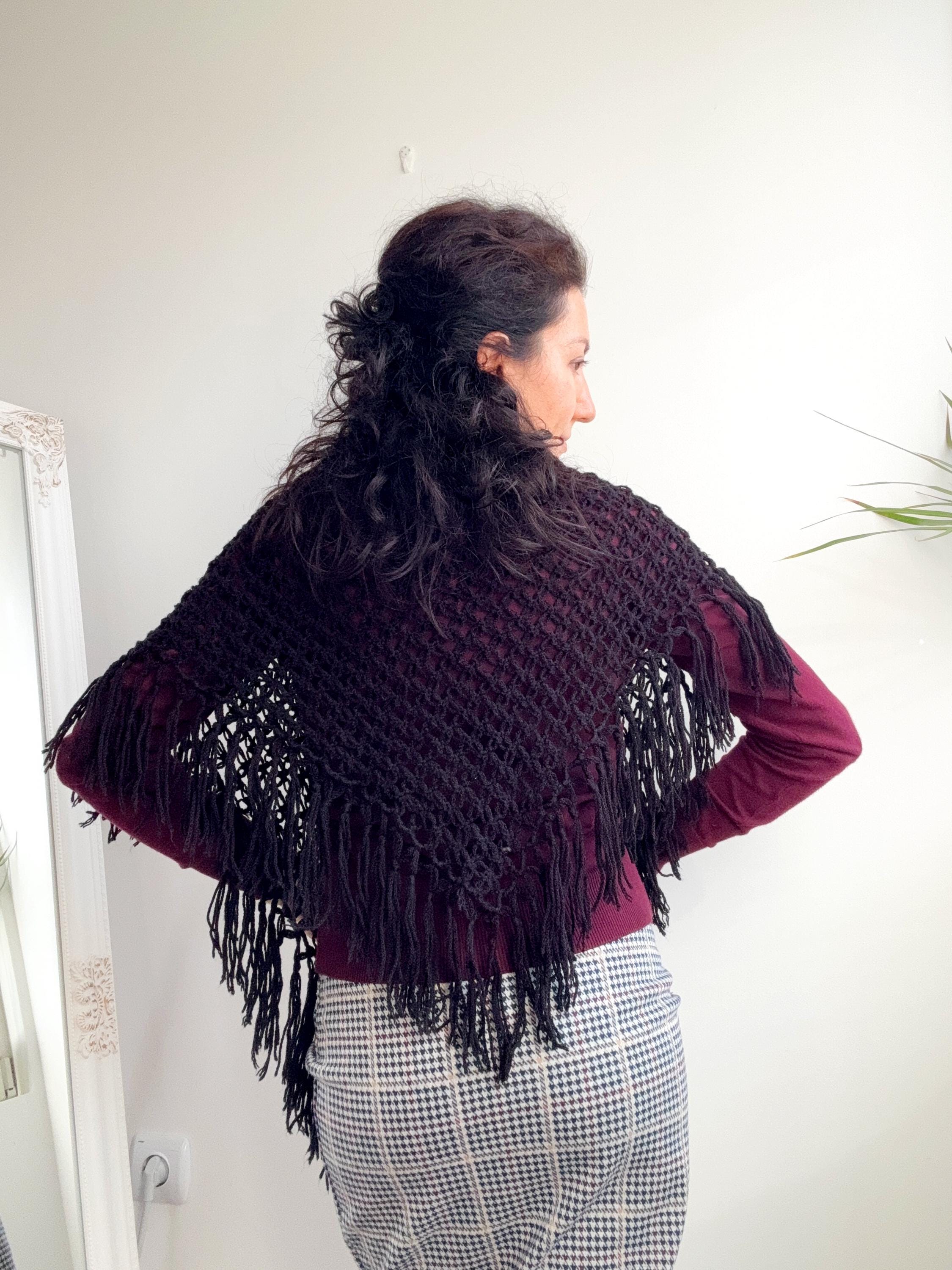 The elaborate long fringe detailing along the edges gives it wonderful movement and an authentic flamenco or Spanish Mantilla vibe. The pattern is light mesh and yet super cozy and warm. The interconnected design has a beautiful, home-crafted vintage feel. It's the perfect size for cozy layering and works equally well as a stunning focal point for Goth, Dark Academia, or Bohemian styles.