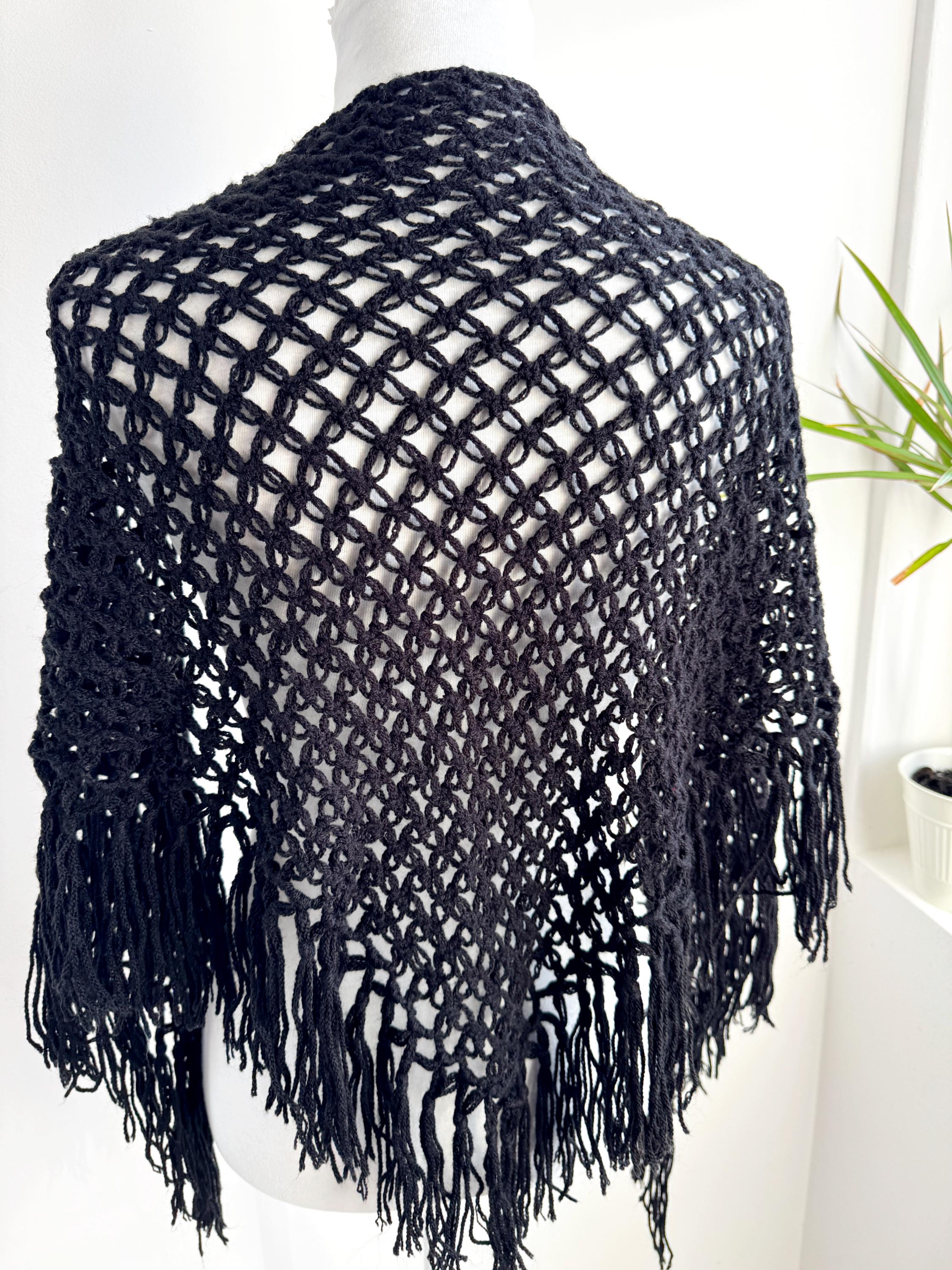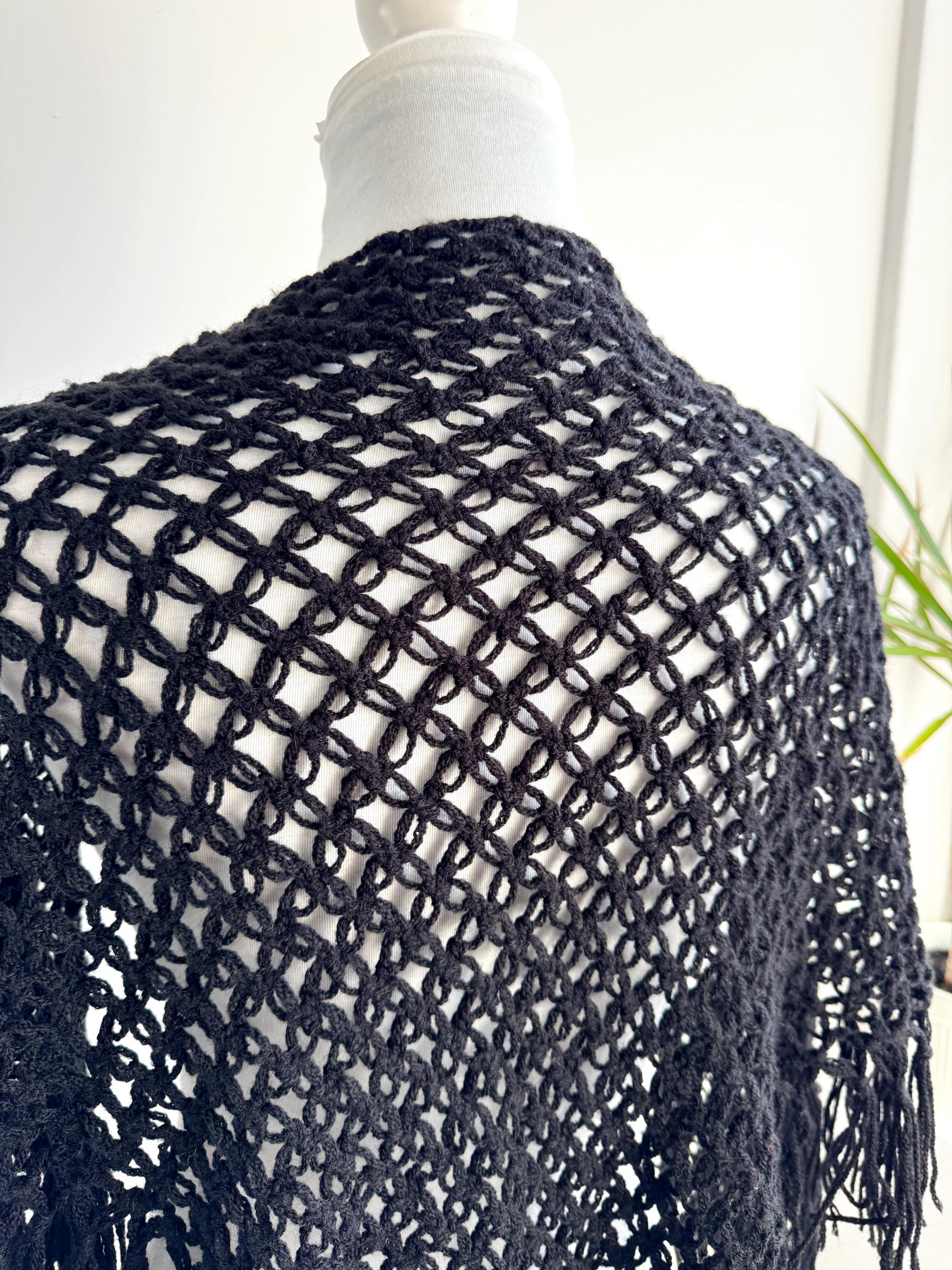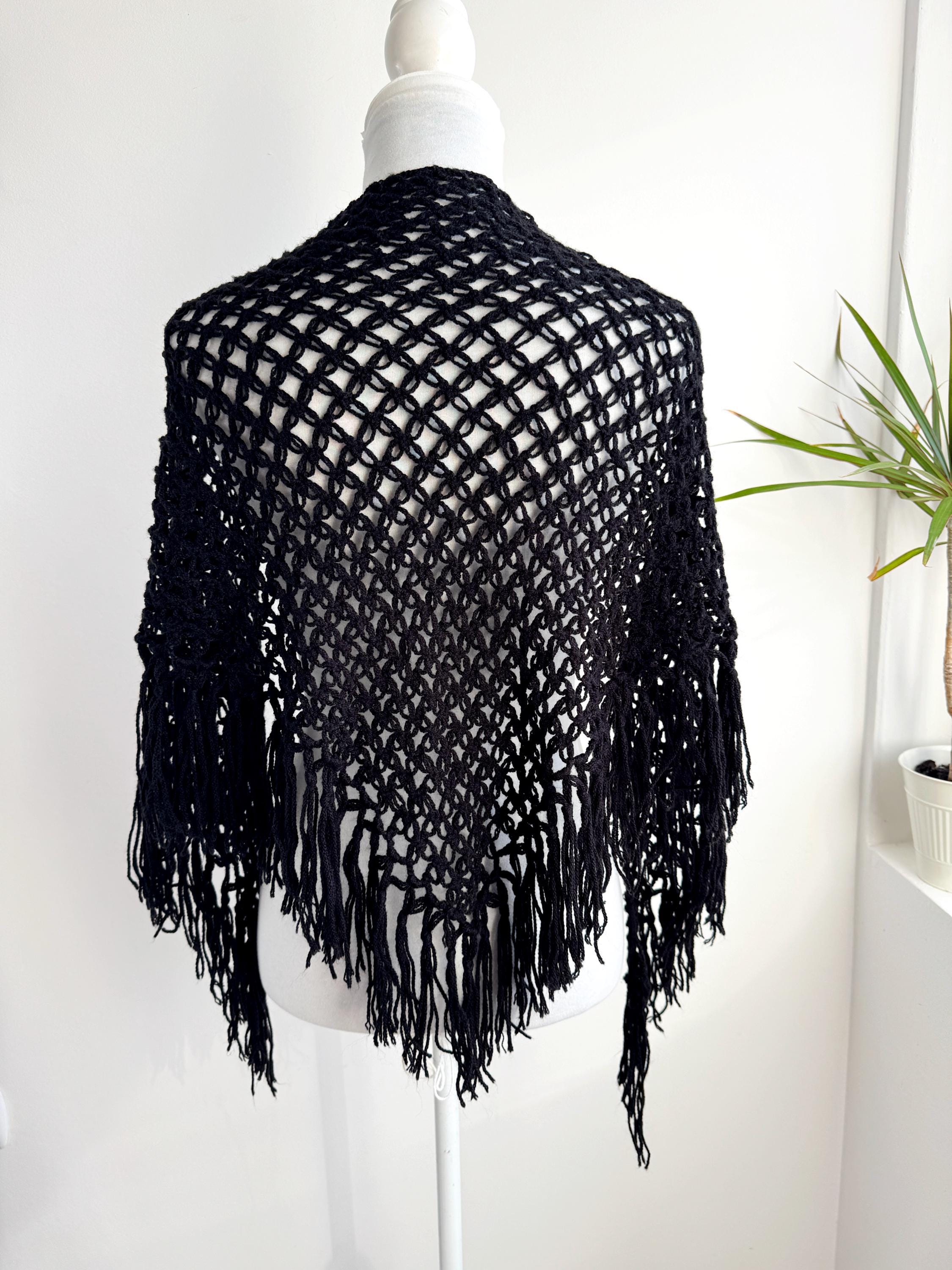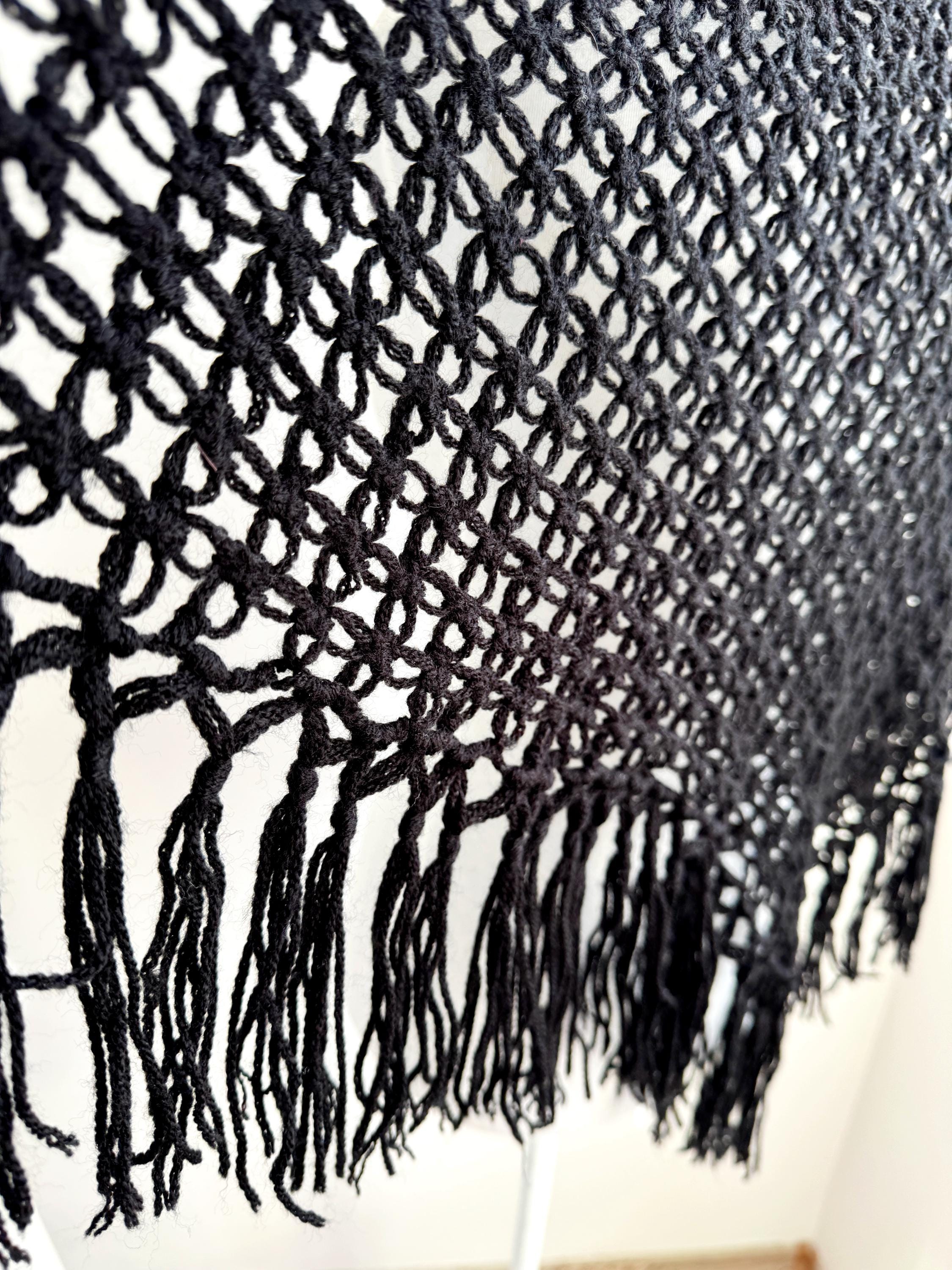 Drape yourself in dramatic vintage elegance with this beautiful black crochet shawl. Hand-knitted in a striking open Solomon's Knot lace pattern, this piece is an exceptional accessory that adds instant texture and gothic romance to any outfit. The shawl features a classic triangular shape, allowing it to be worn traditionally over the shoulders, tied like a scarf, or wrapped like a bohemian pashmina.