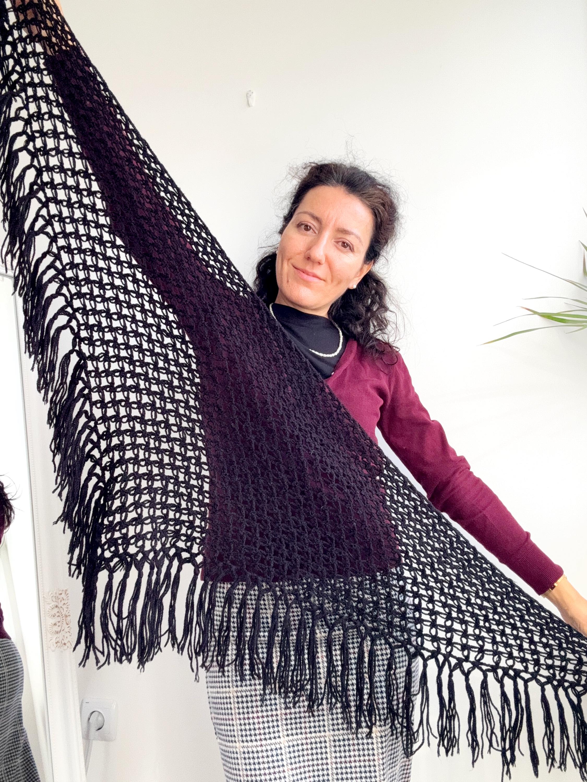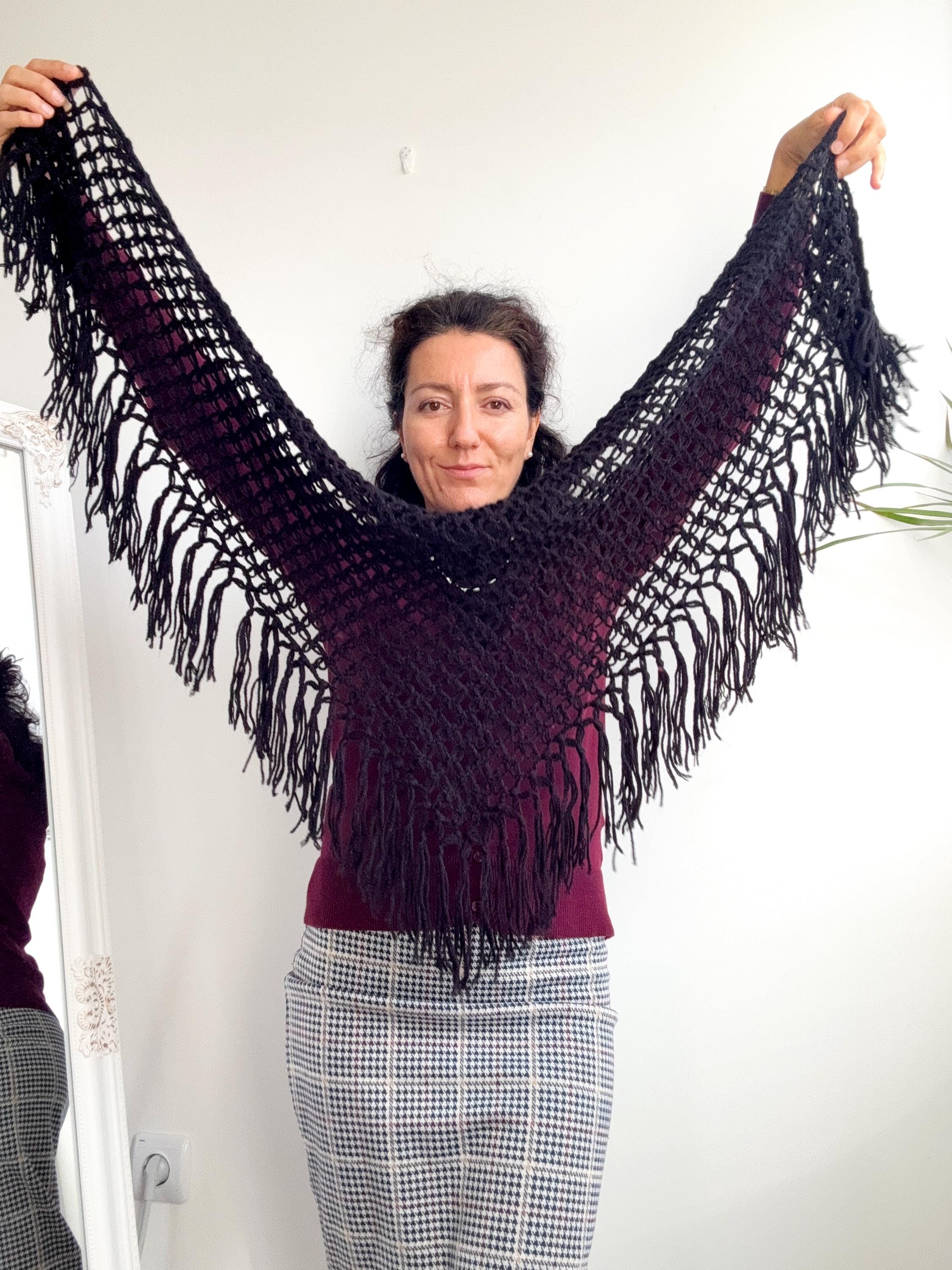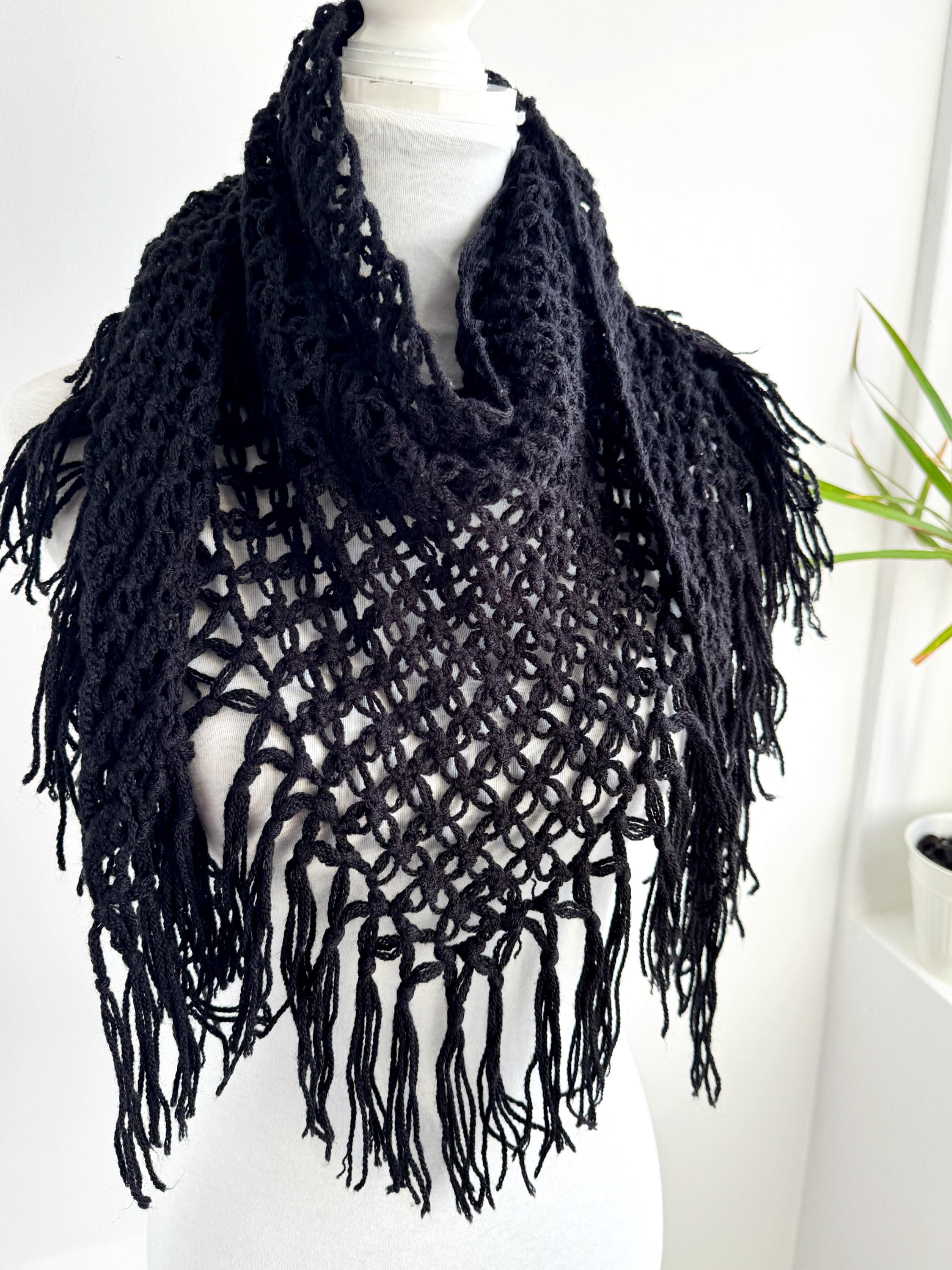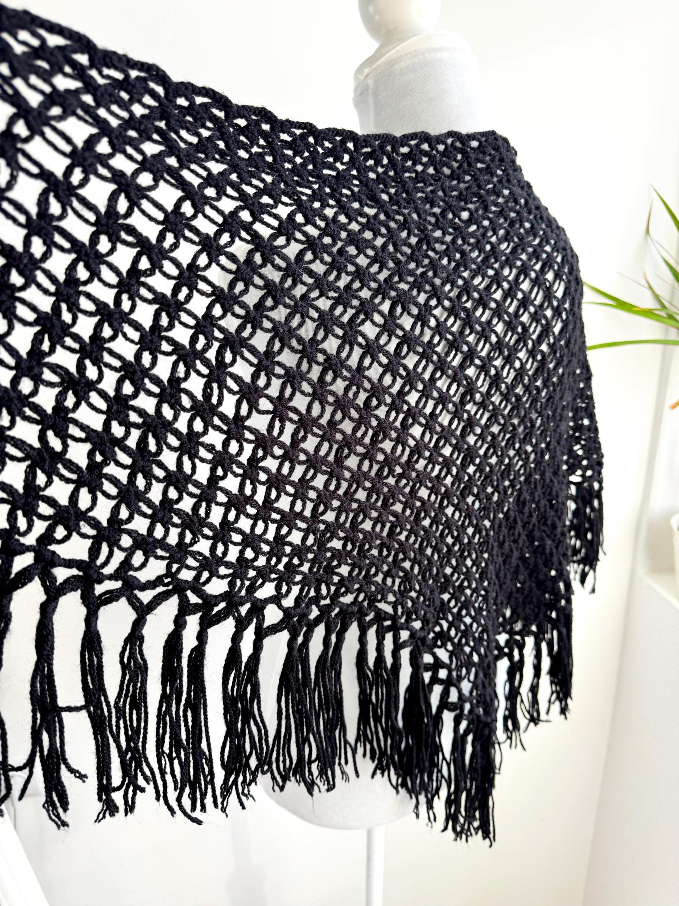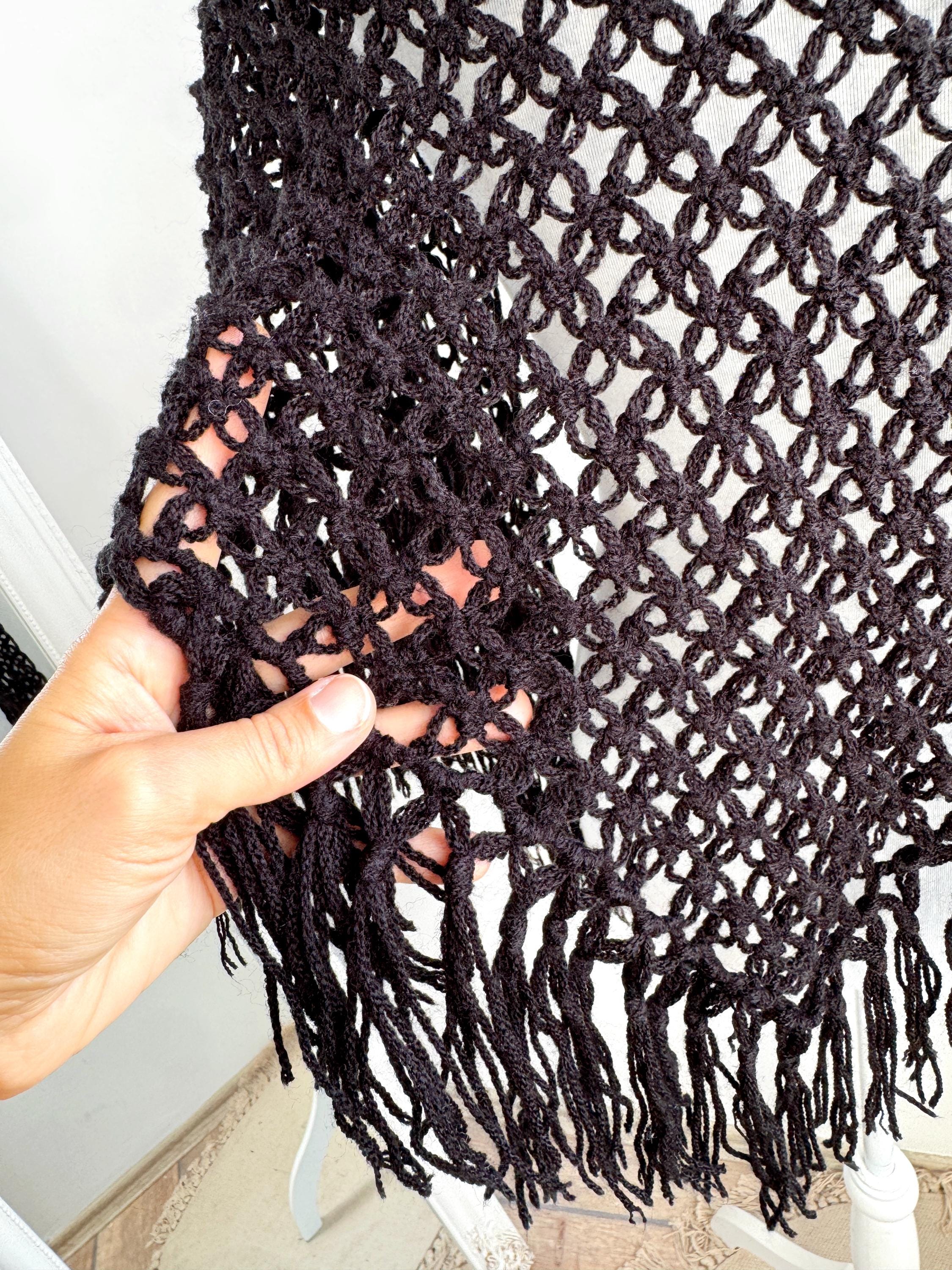 Drape yourself in dramatic vintage elegance with this beautiful black crochet shawl. Hand-knitted in a striking open Solomon's Knot lace pattern, this piece is an exceptional accessory that adds instant texture and gothic romance to any outfit. The shawl features a classic triangular shape, allowing it to be worn traditionally over the shoulders, tied like a scarf, or wrapped like a bohemian pashmina.