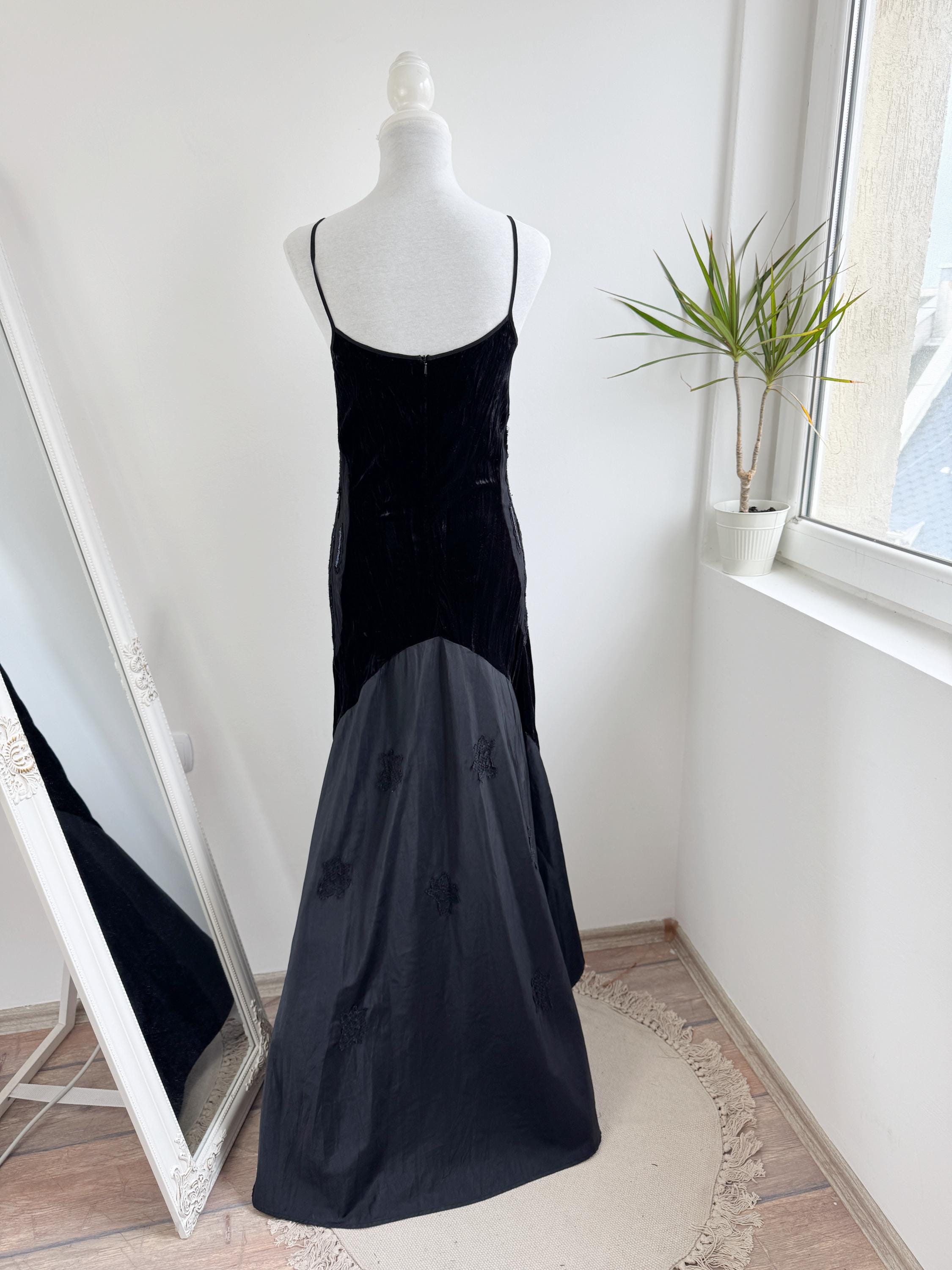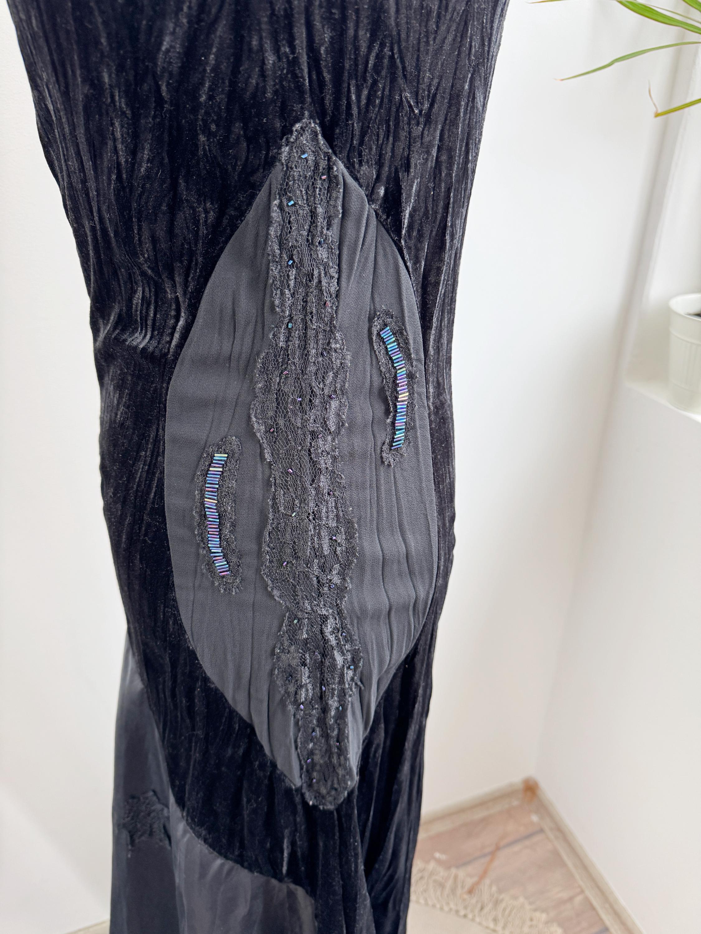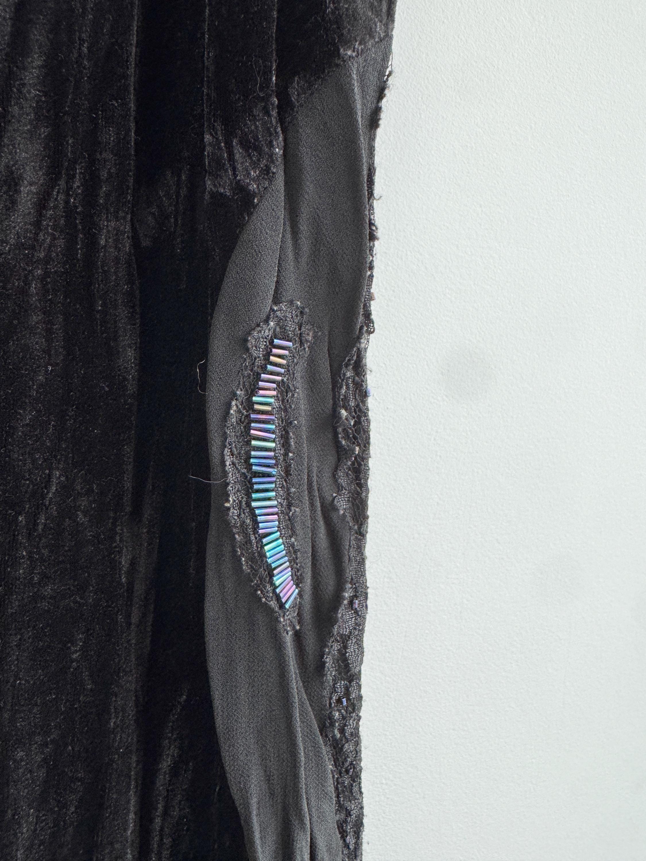 The magic of this dress lies in its unique construction. The velvet body is beautifully contrasted by a dramatic mermaid skirt constructed from tafeta black fabric with lace embelishments, which cascades down to a generous, uneven hemline which is longer at the back and shorter at the front. Adding further dimension, the hips feature bold, embroidered, and beaded panel detailing, which introduces texture and an iridescent flash of color. The length is intentionally asymmetrical, creating a fabulous movement and making this a perfect choice for costume designers or anyone seeking a unique, high-impact vintage maxi dress.