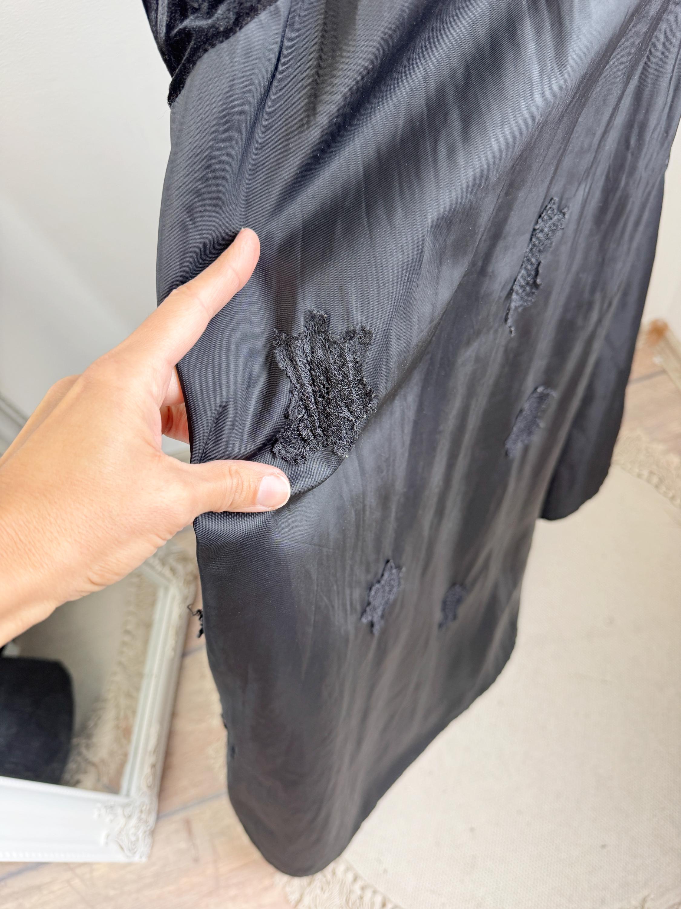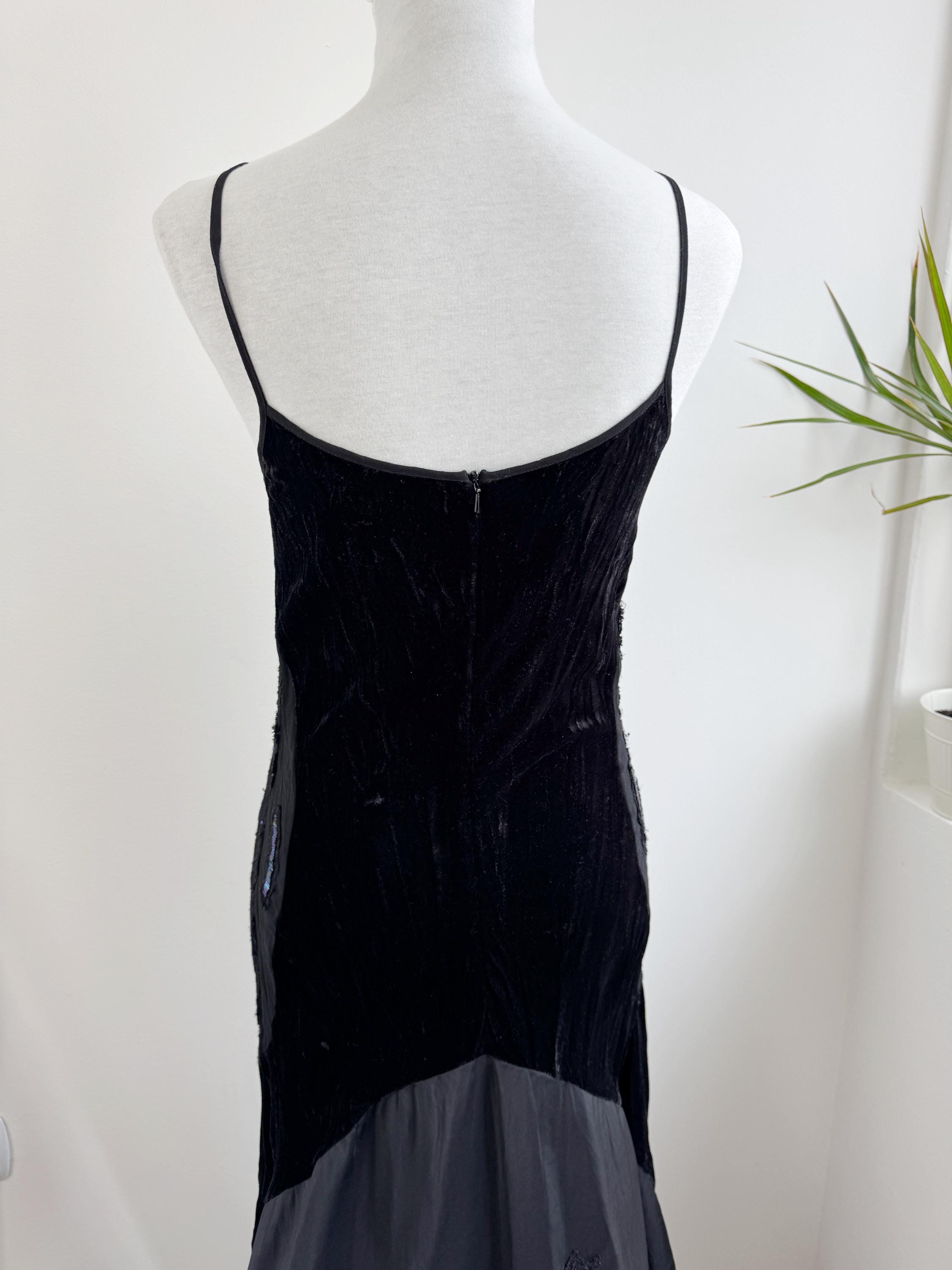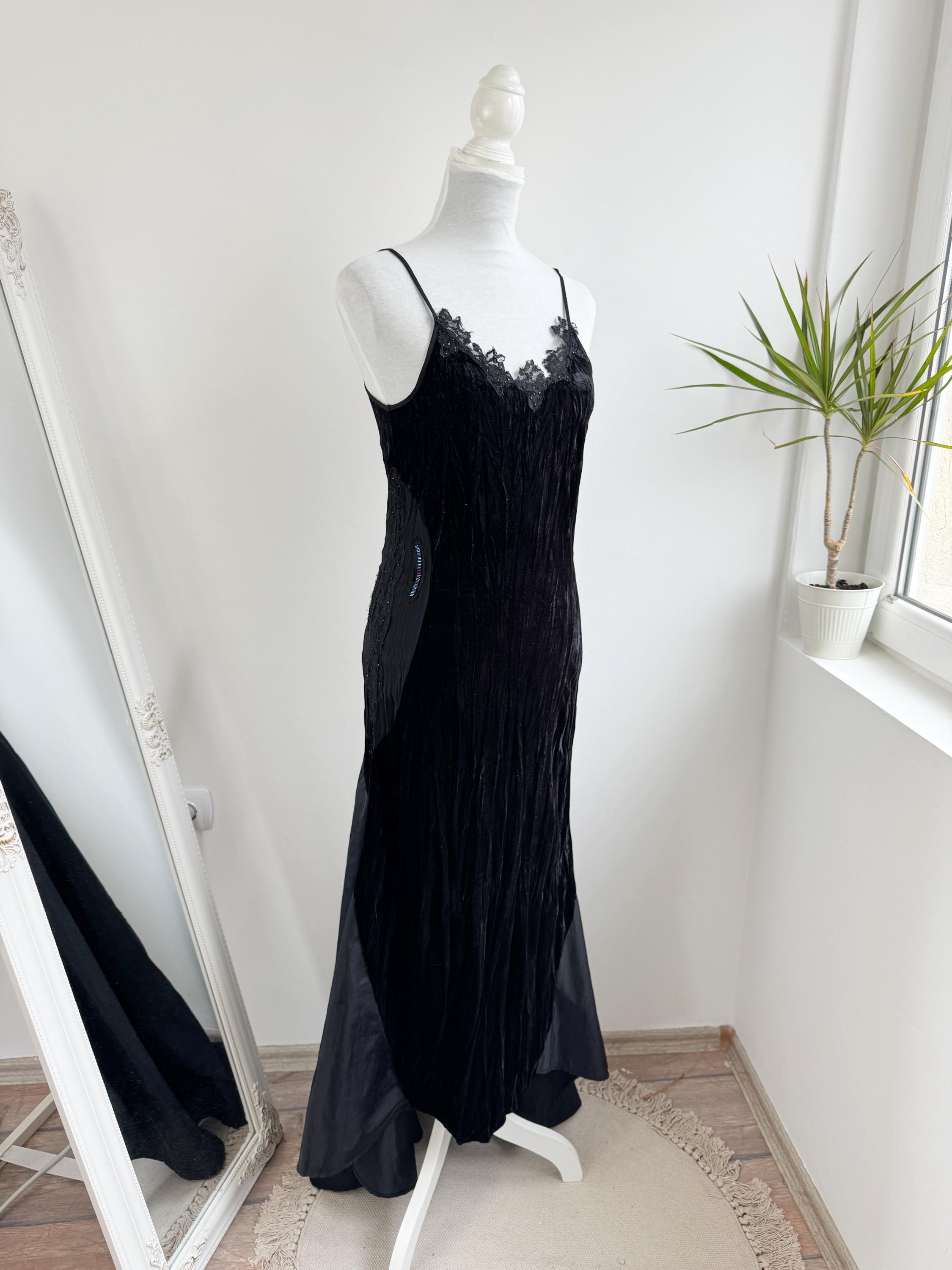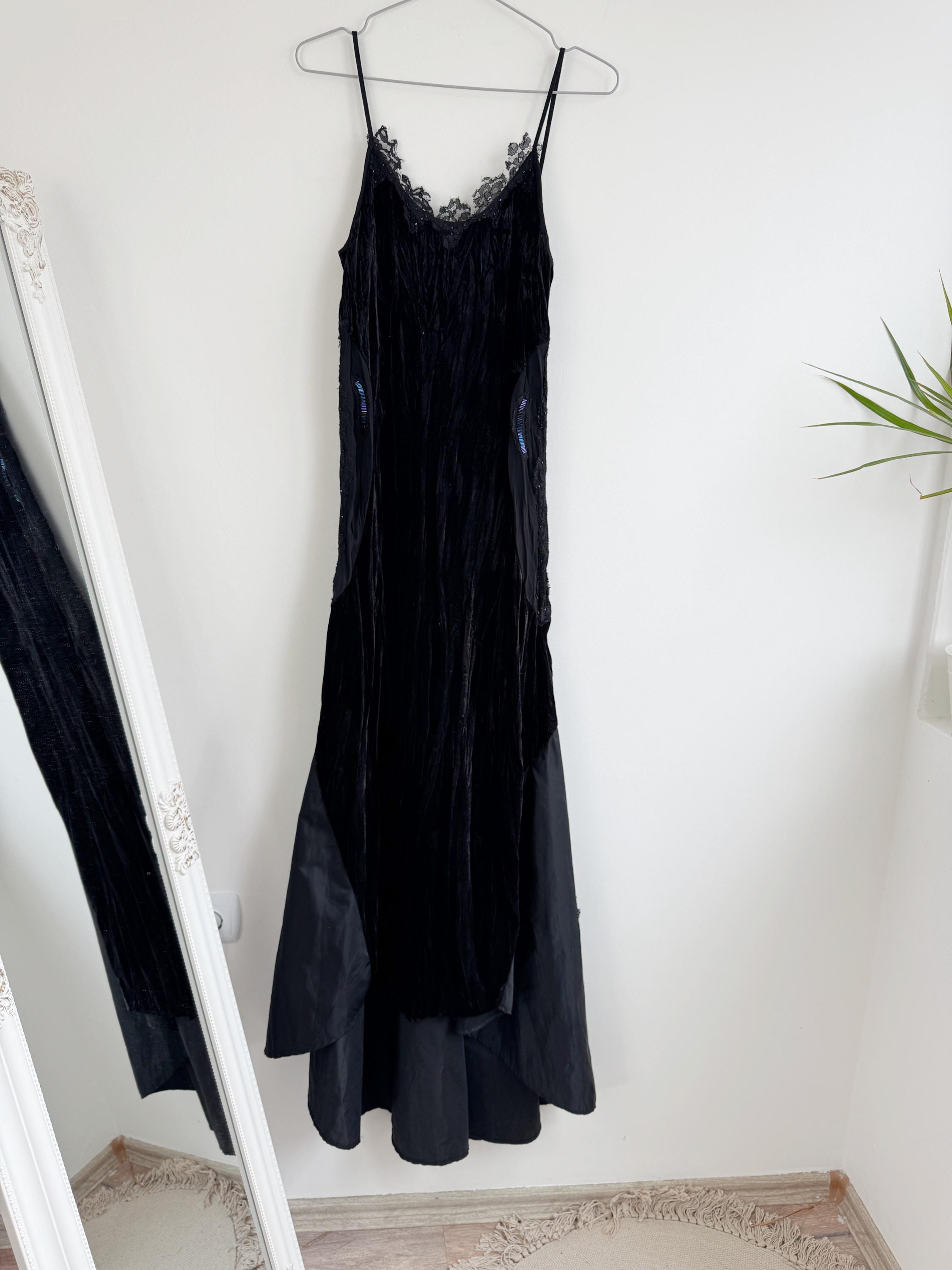 The magic of this dress lies in its unique construction. The velvet body is beautifully contrasted by a dramatic mermaid skirt constructed from tafeta black fabric with lace embelishments, which cascades down to a generous, uneven hemline which is longer at the back and shorter at the front. Adding further dimension, the hips feature bold, embroidered, and beaded panel detailing, which introduces texture and an iridescent flash of color. The length is intentionally asymmetrical, creating a fabulous movement and making this a perfect choice for costume designers or anyone seeking a unique, high-impact vintage maxi dress.