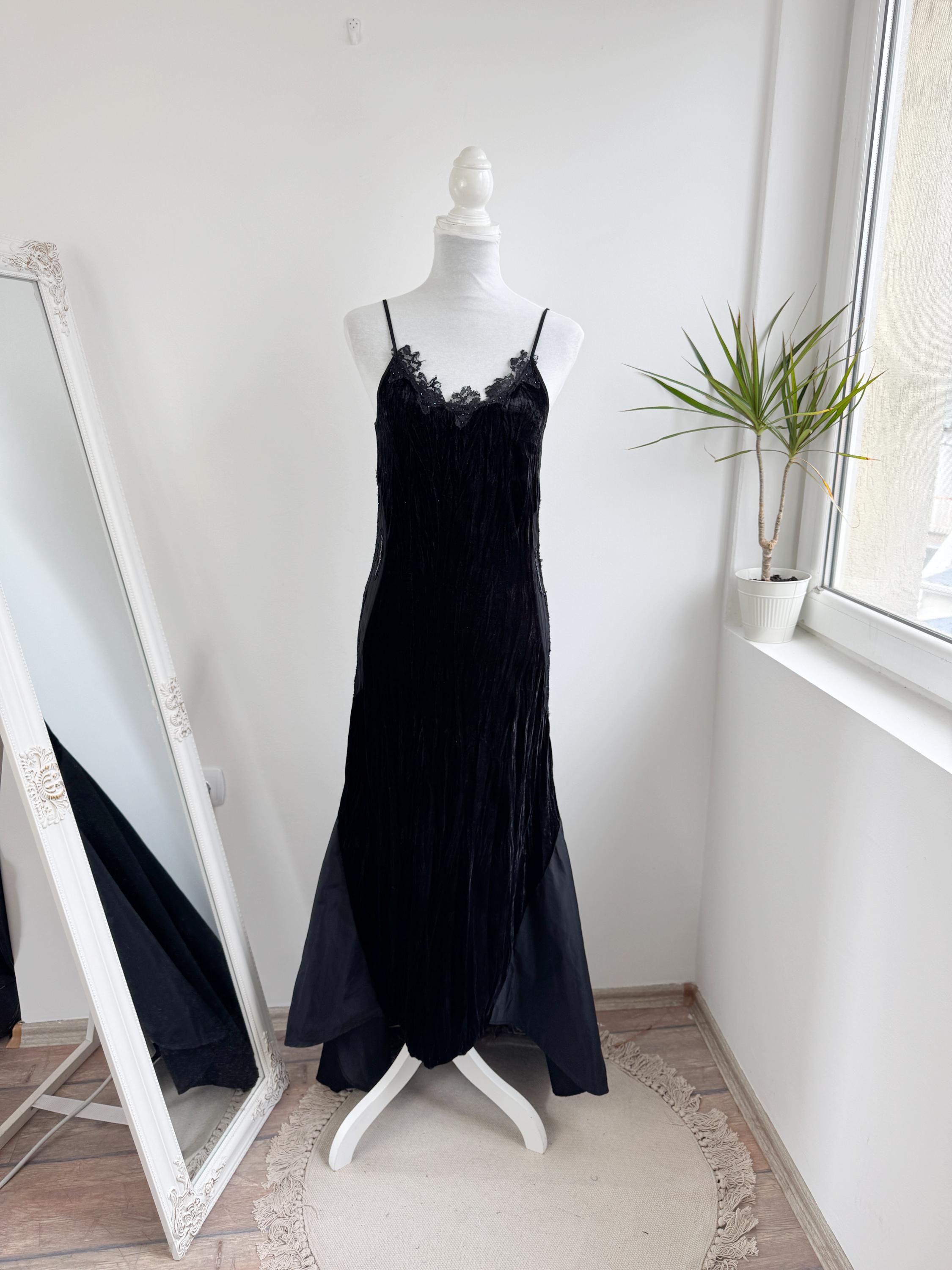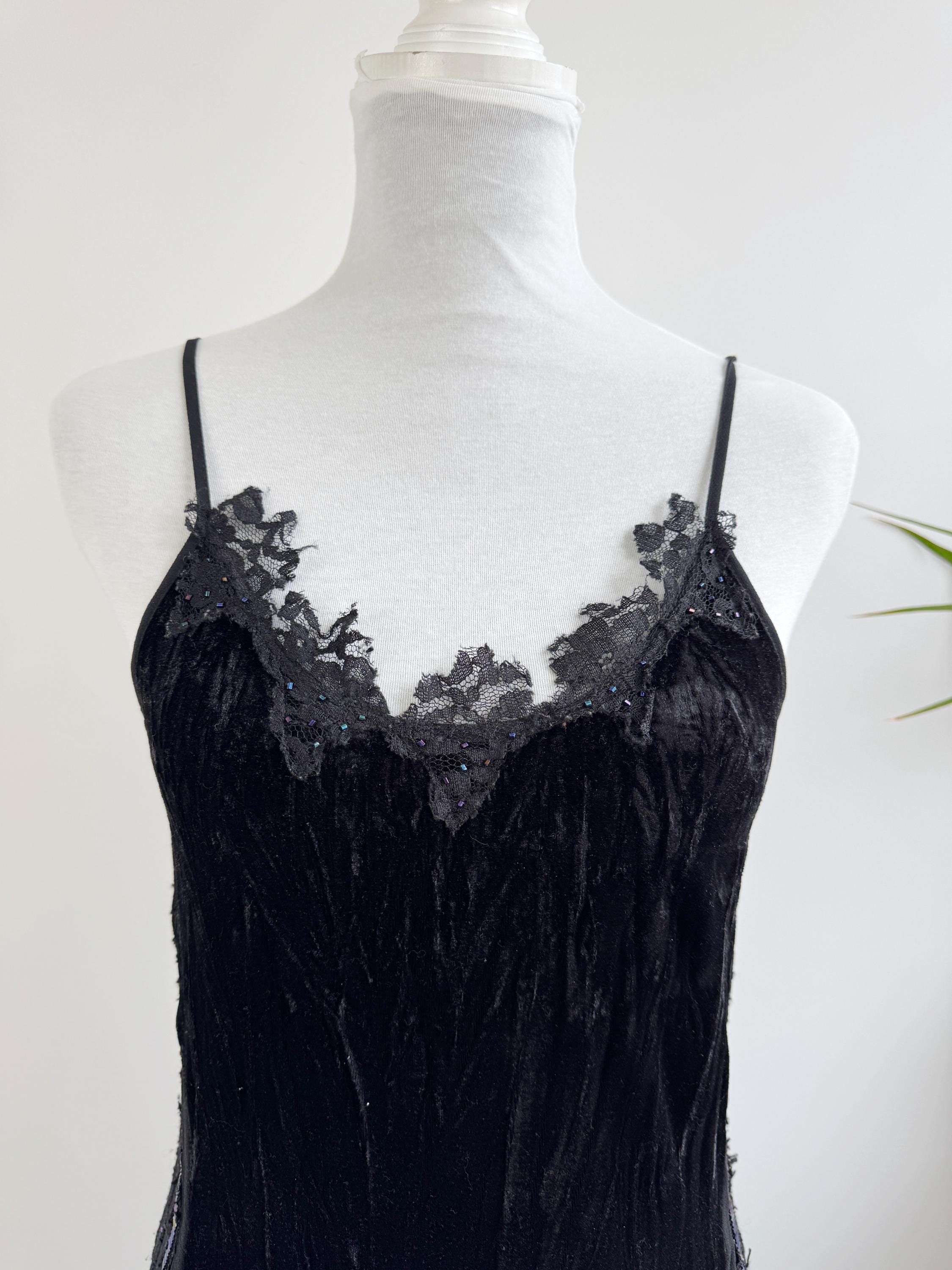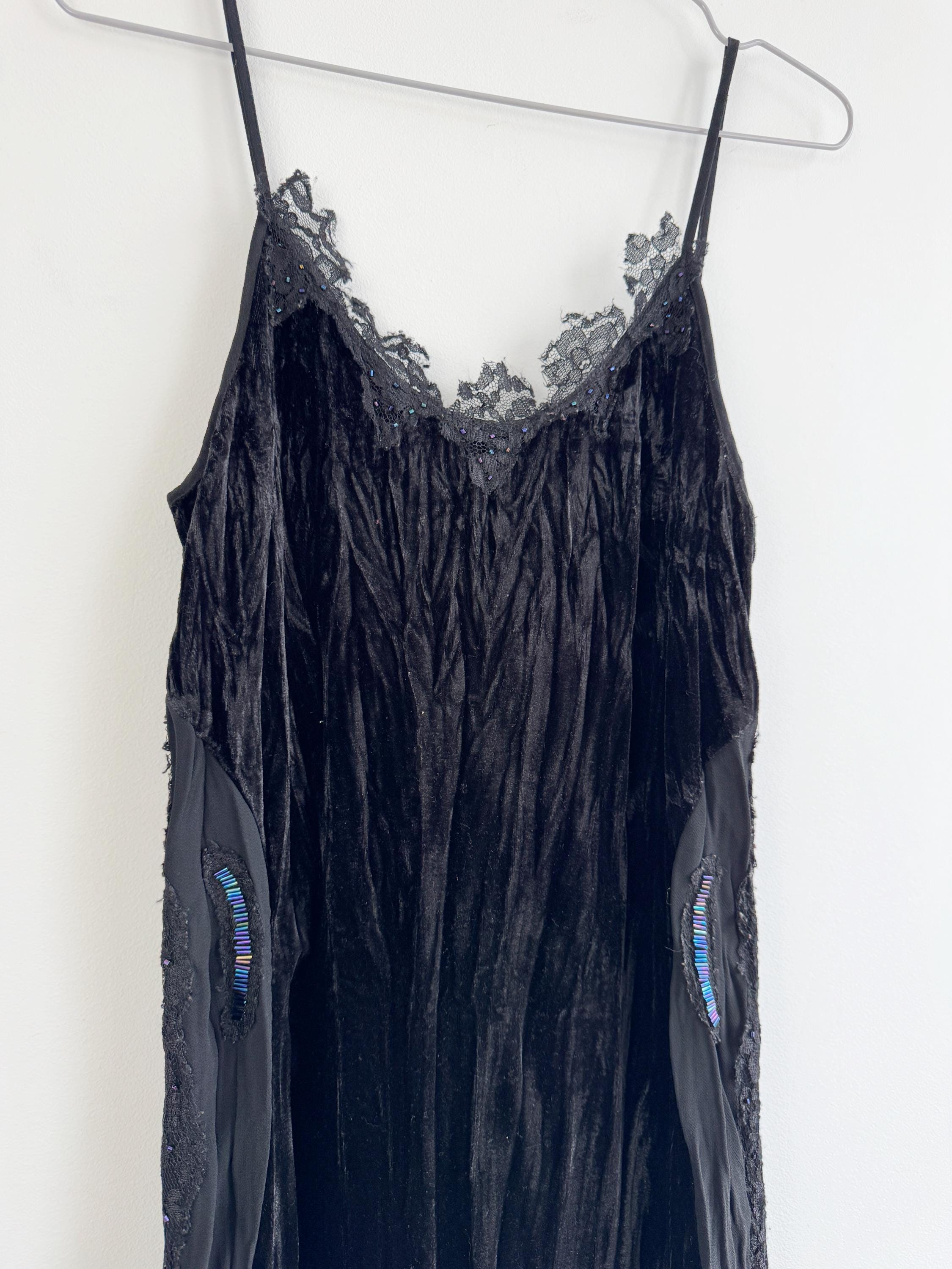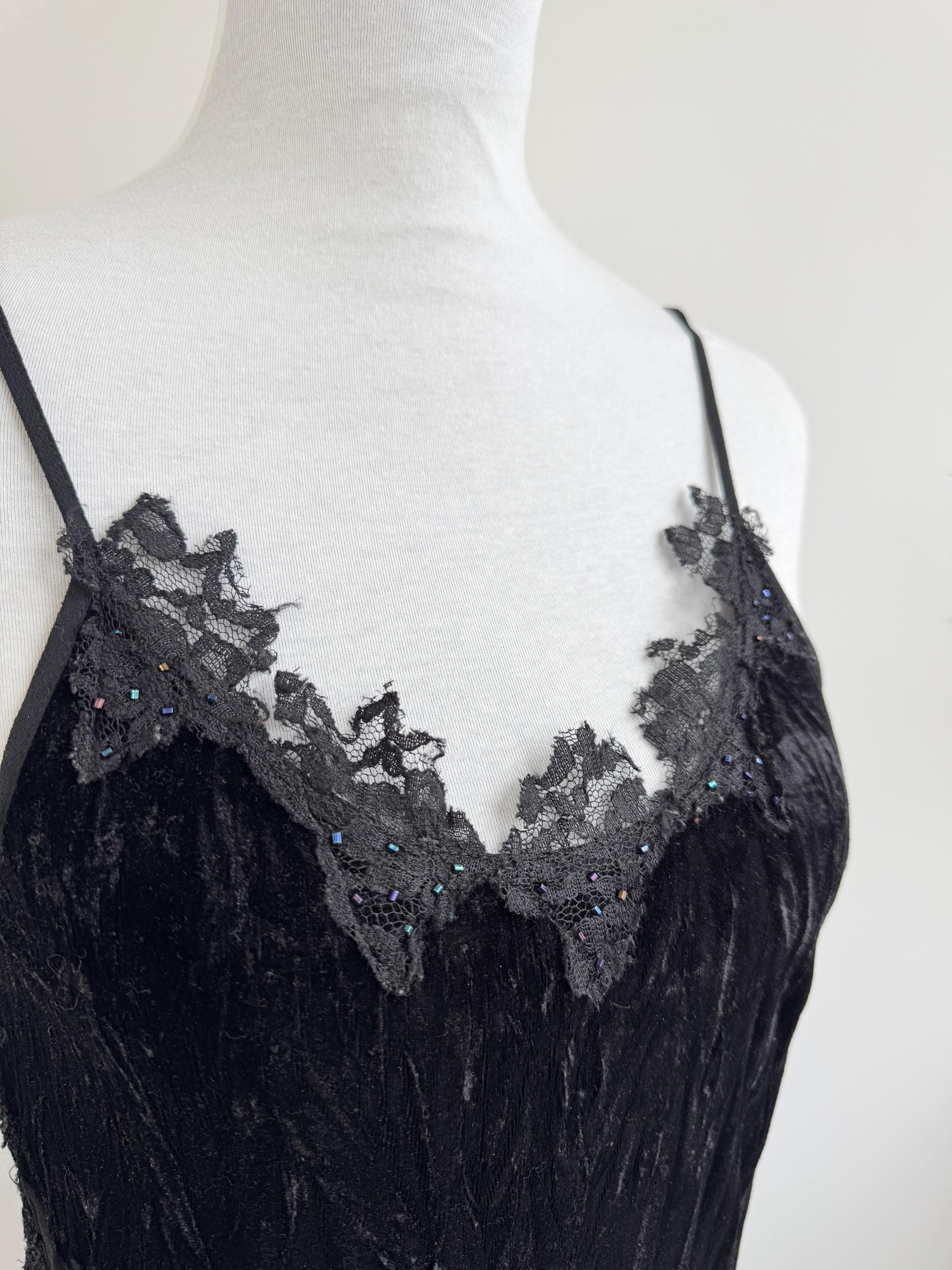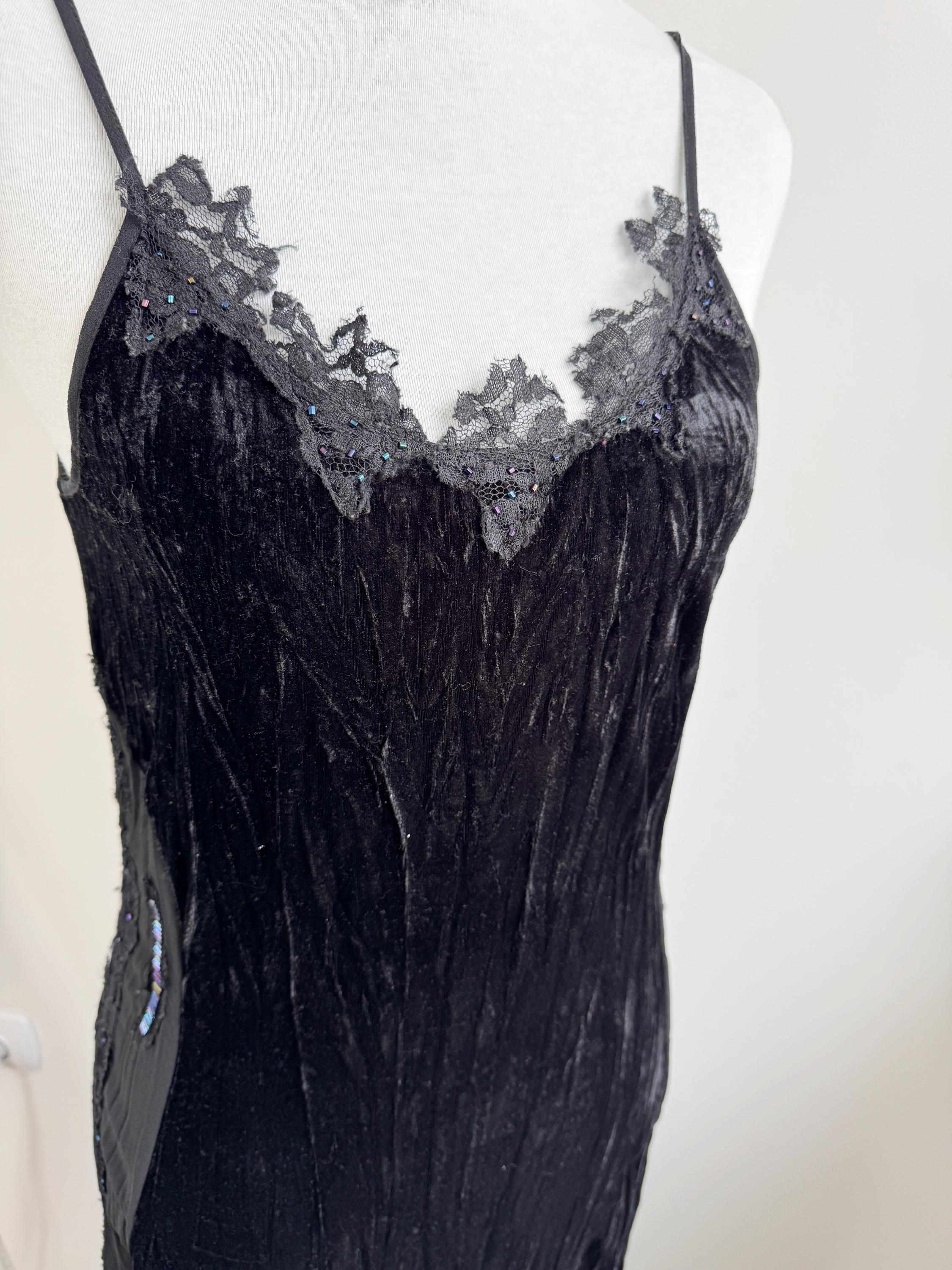 The dress features a fitted silhouette crafted from soft, luxurious, crushed black velvet that drapes beautifully and catches the light. The upper bodice is finished with delicate spaghetti straps and a striking, scalloped lace trim embellished with tiny iridescent beads—a subtle nod to classic glamour.