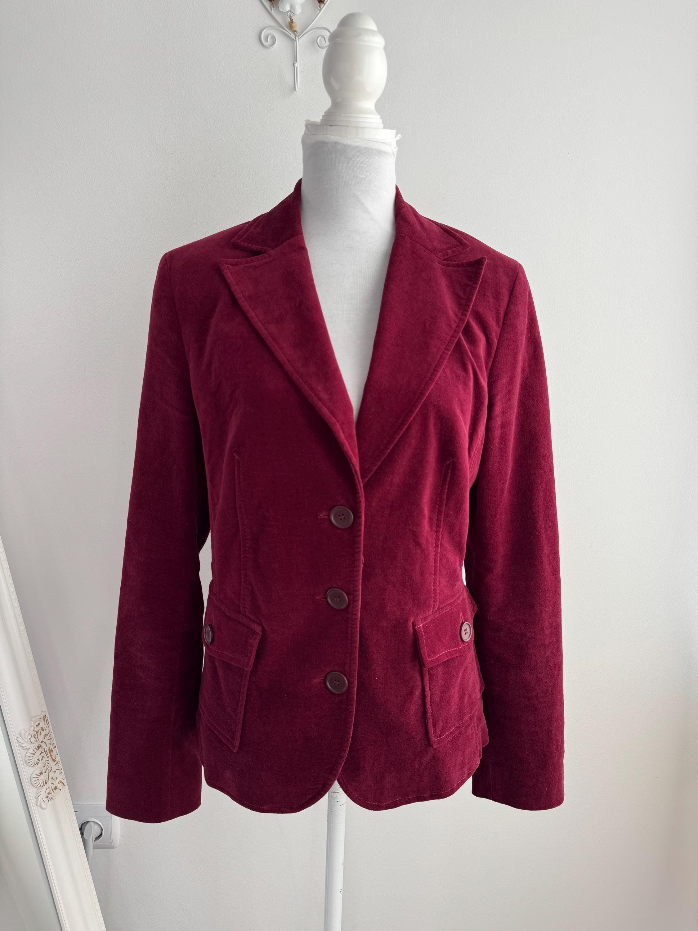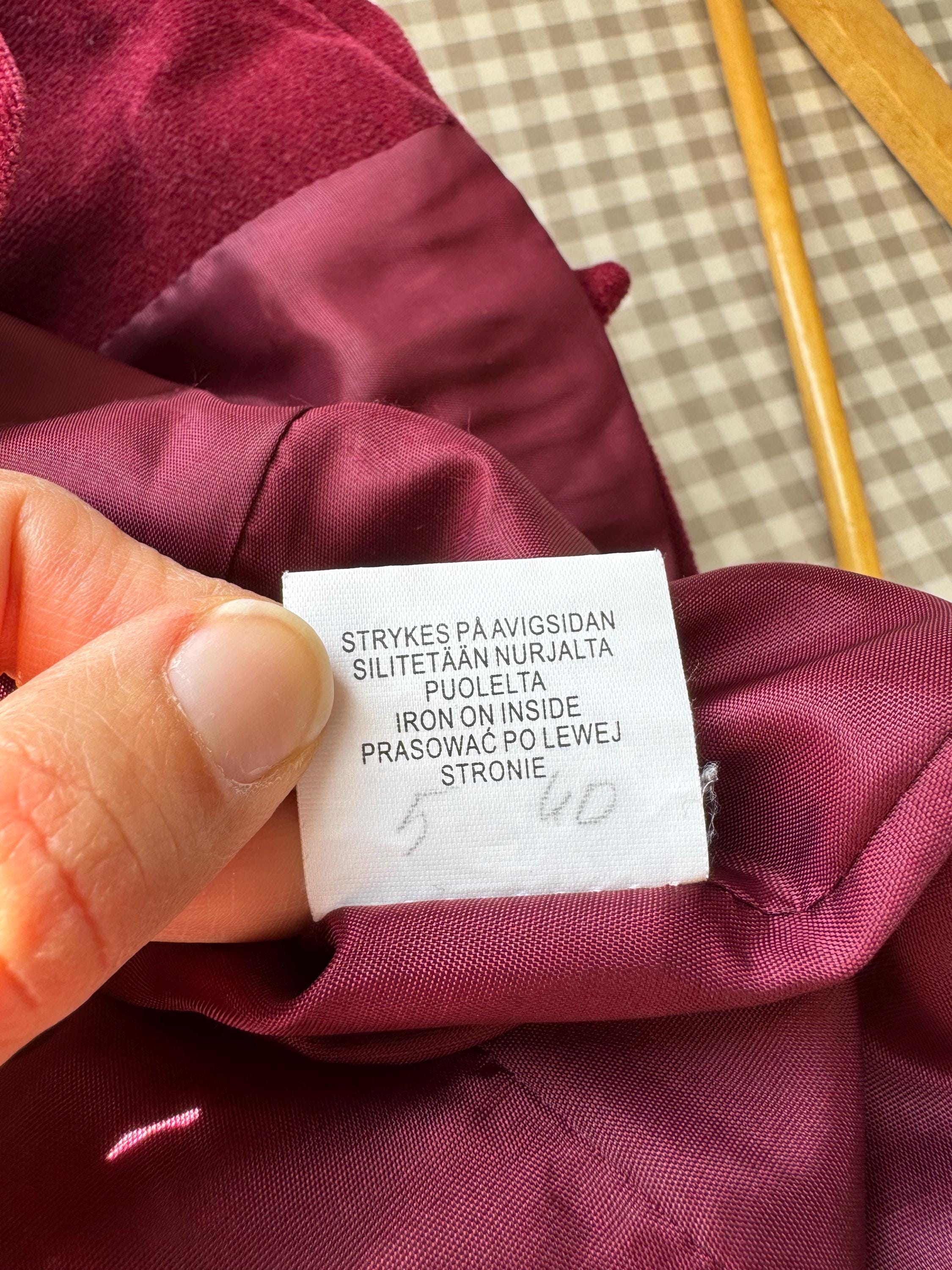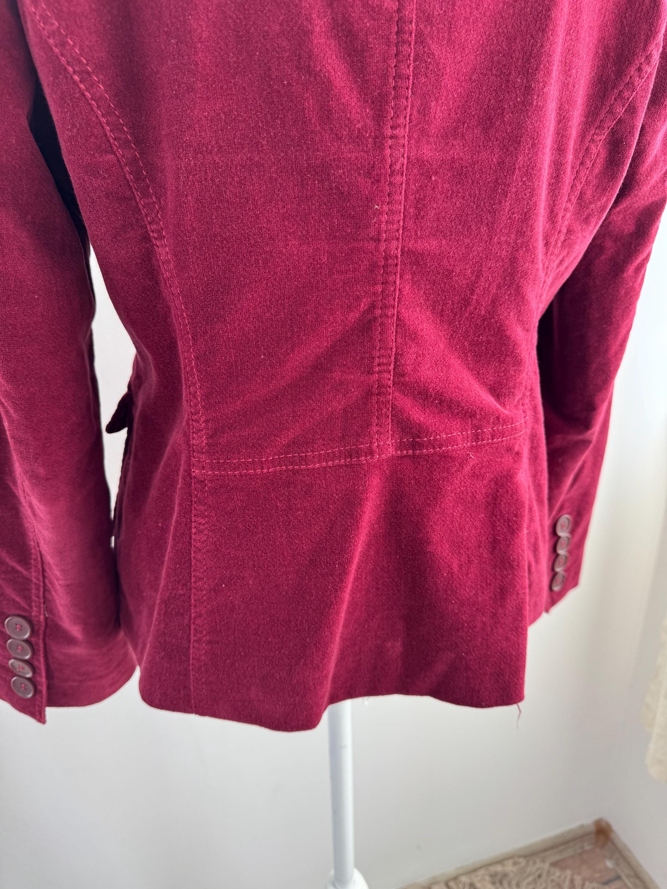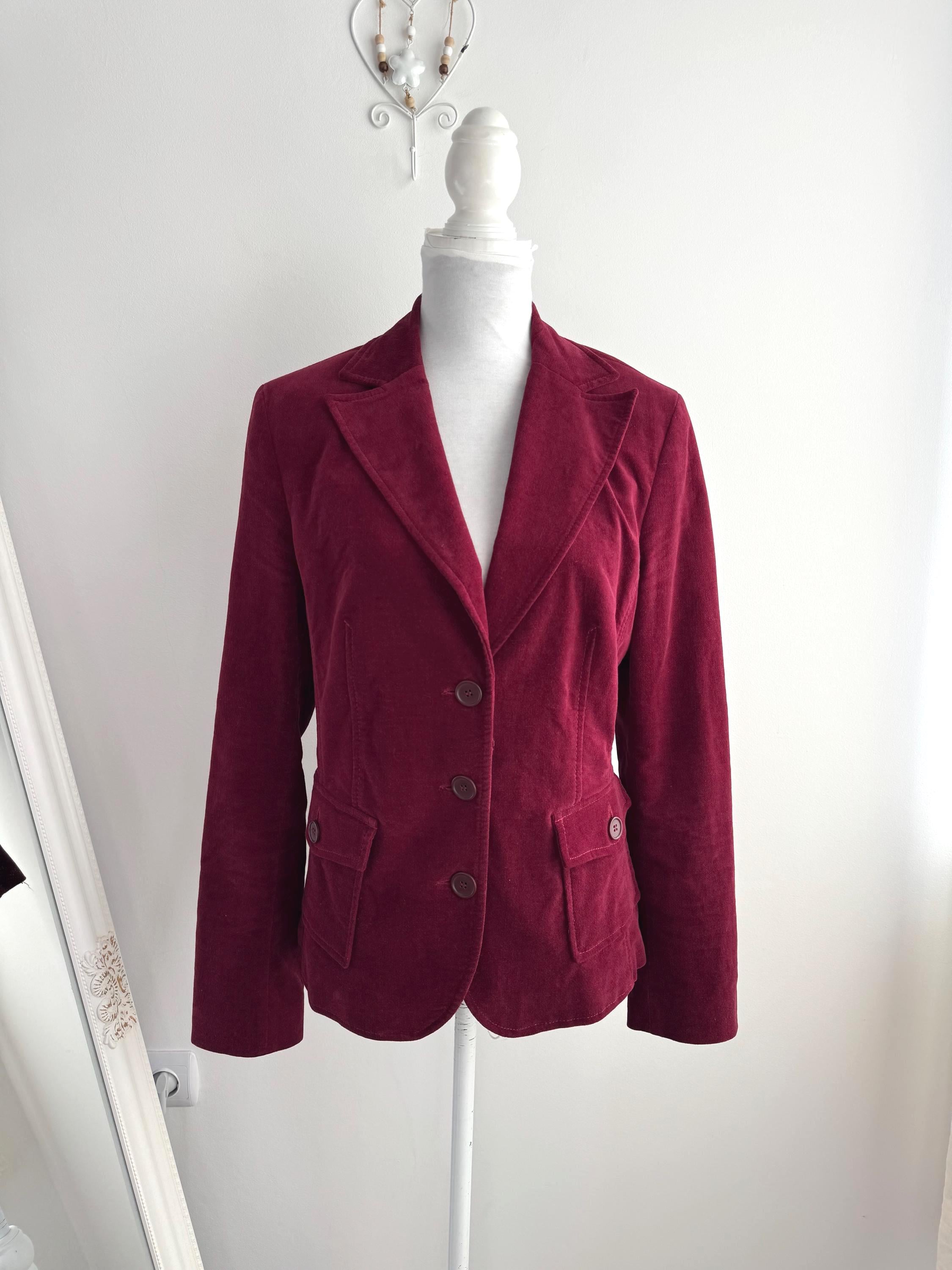 This is s vintage Y2K burgundy red corduroy blazer jacket for women by KappAhl in european size 40, which corresponds to size M. This elegant slim fit cotton blazer is made of soft velveteen corduroy fabric with three button closure and two pockets. This velveteen jacket has elegant slim fit silhouette and lining underneath. The size marked is EUR 40 which fits like size M. Please check the measurements below.