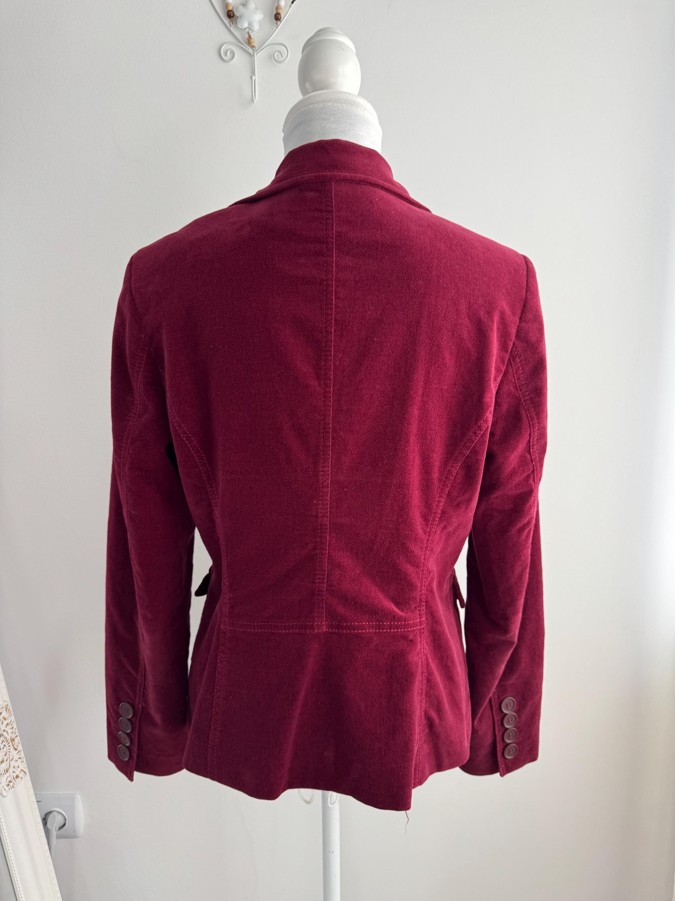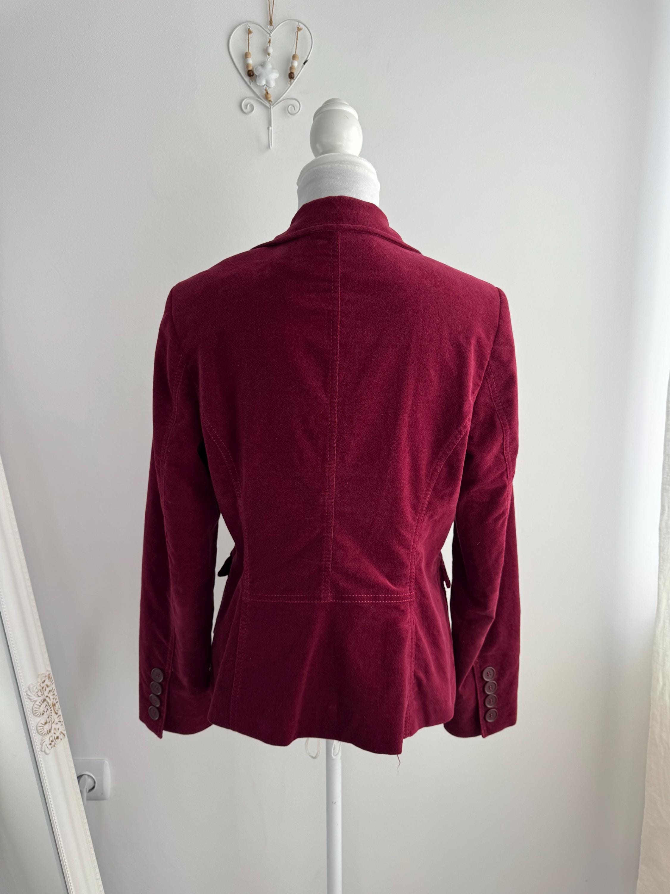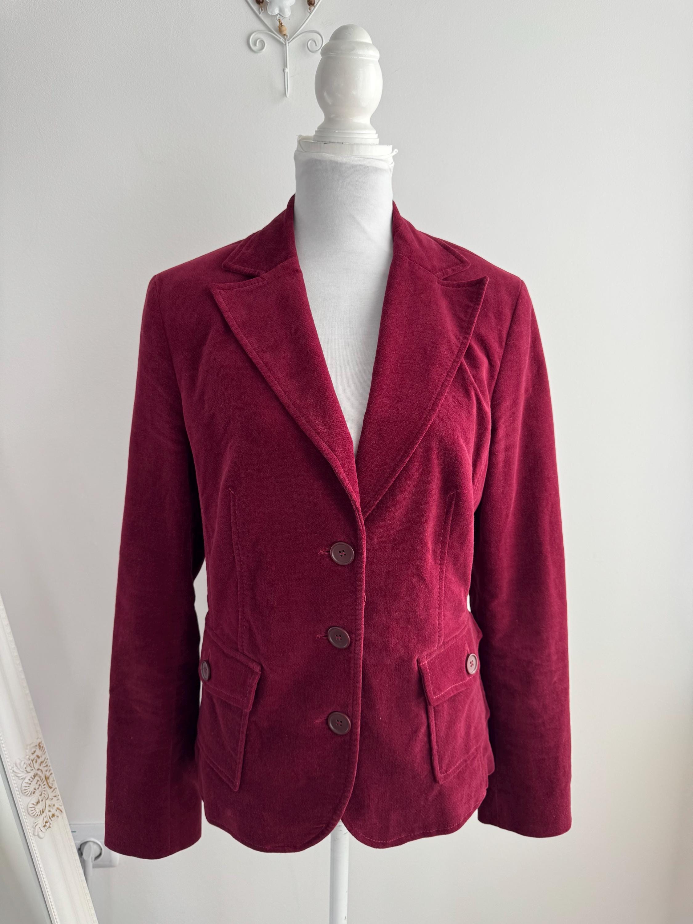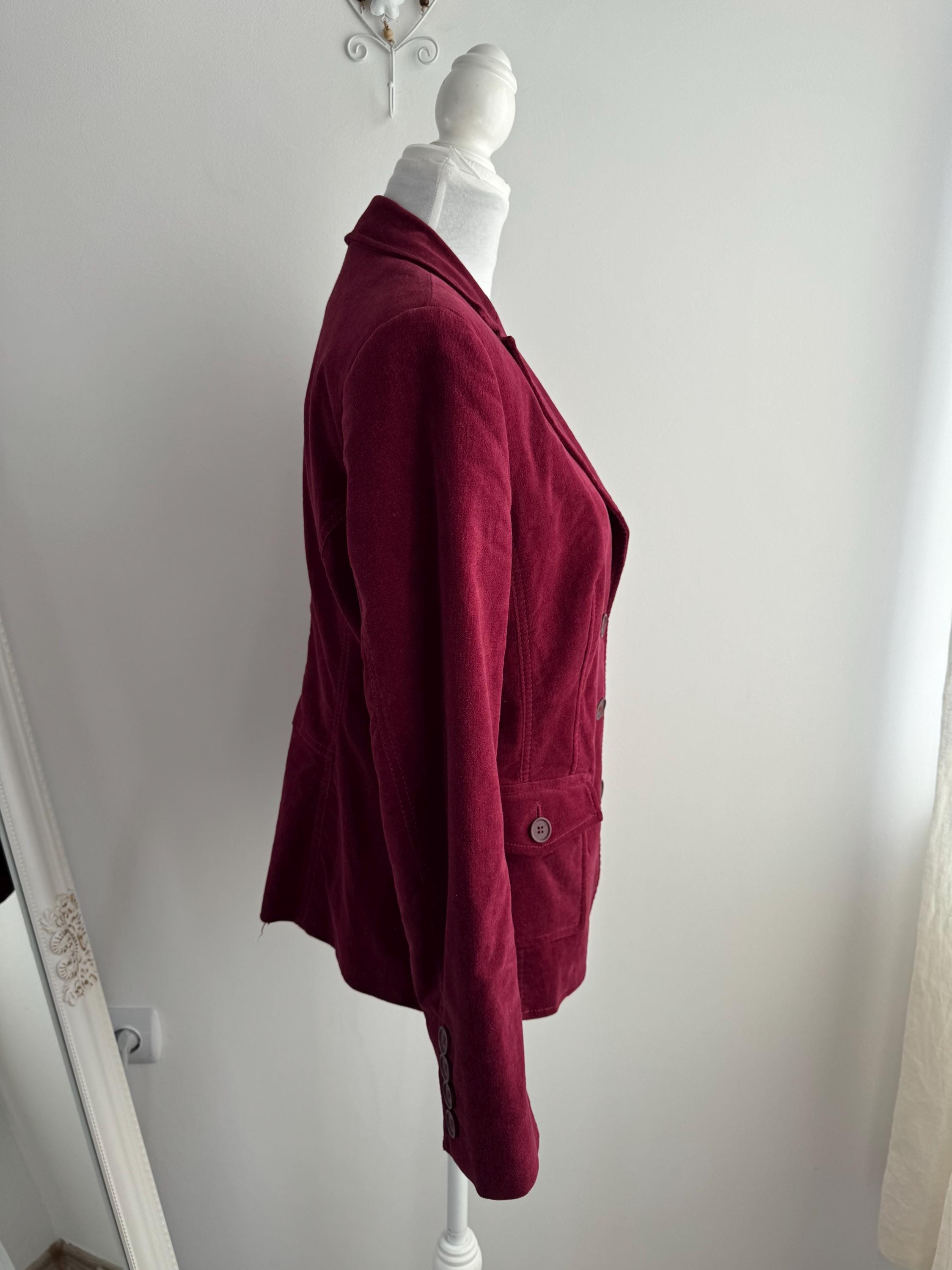 This is s vintage Y2K burgundy red corduroy blazer jacket for women by KappAhl in european size 40, which corresponds to size M. This elegant slim fit cotton blazer is made of soft velveteen corduroy fabric with three button closure and two pockets. This velveteen jacket has elegant slim fit silhouette and lining underneath. The size marked is EUR 40 which fits like size M. Please check the measurements below.