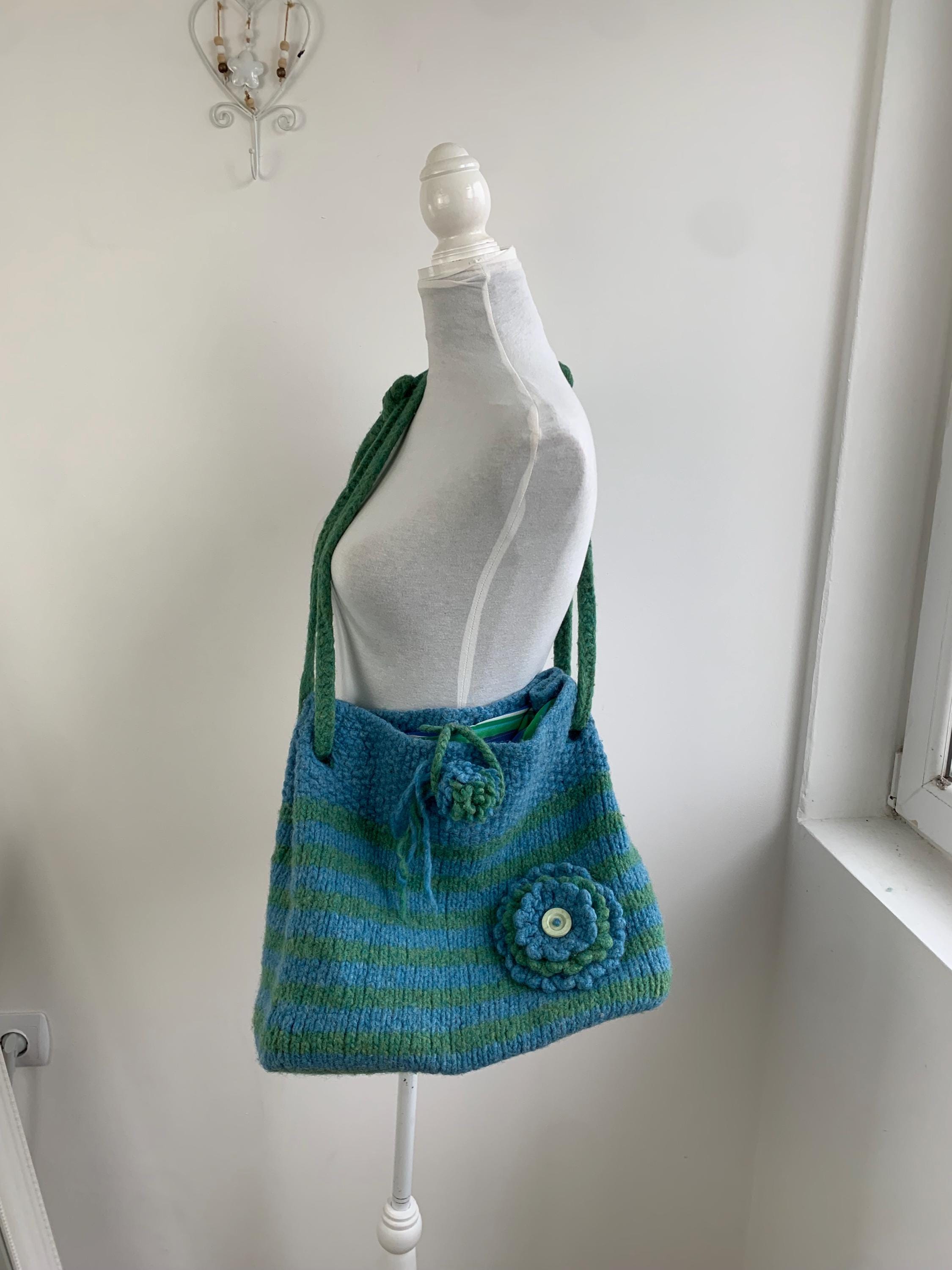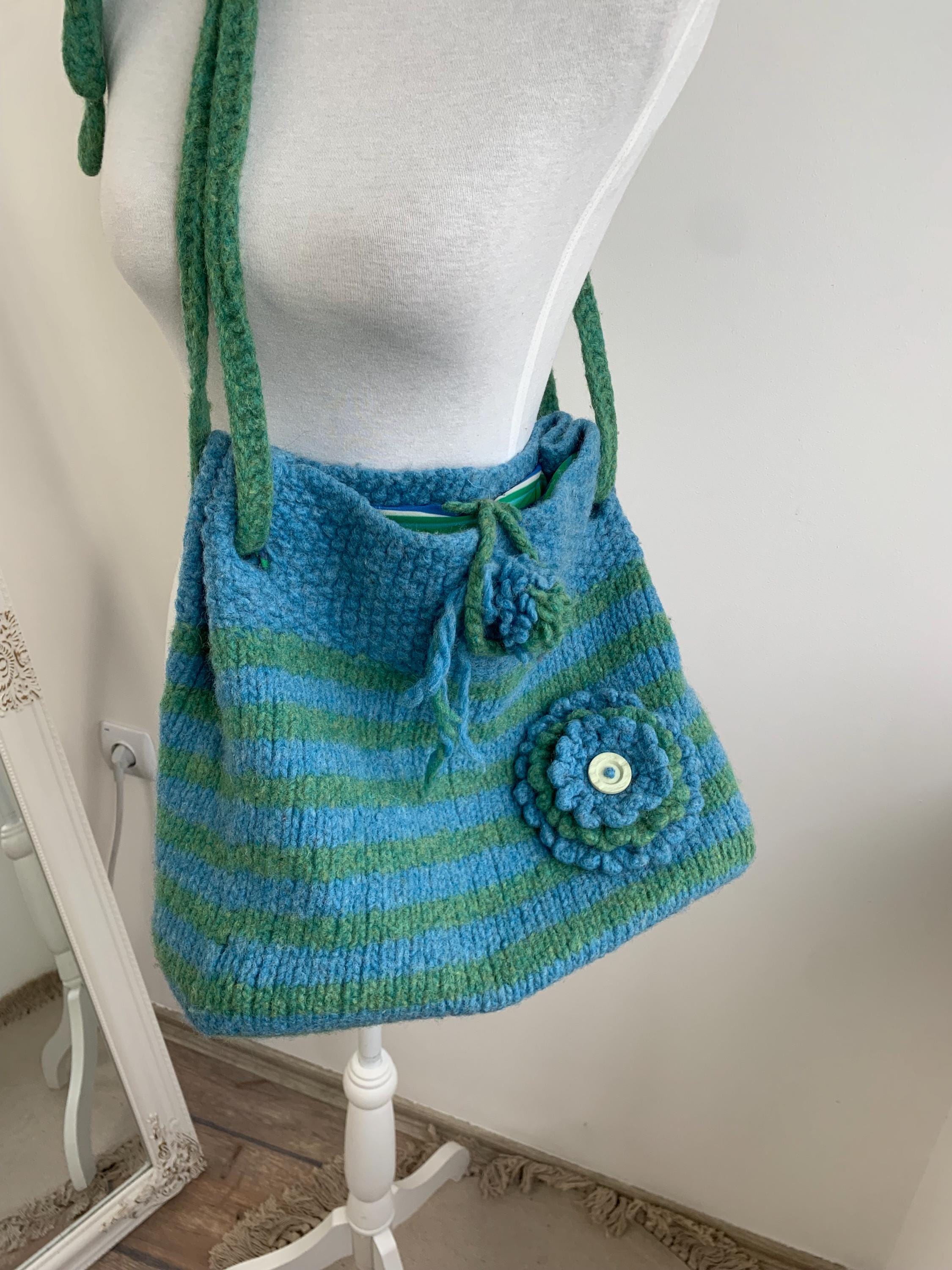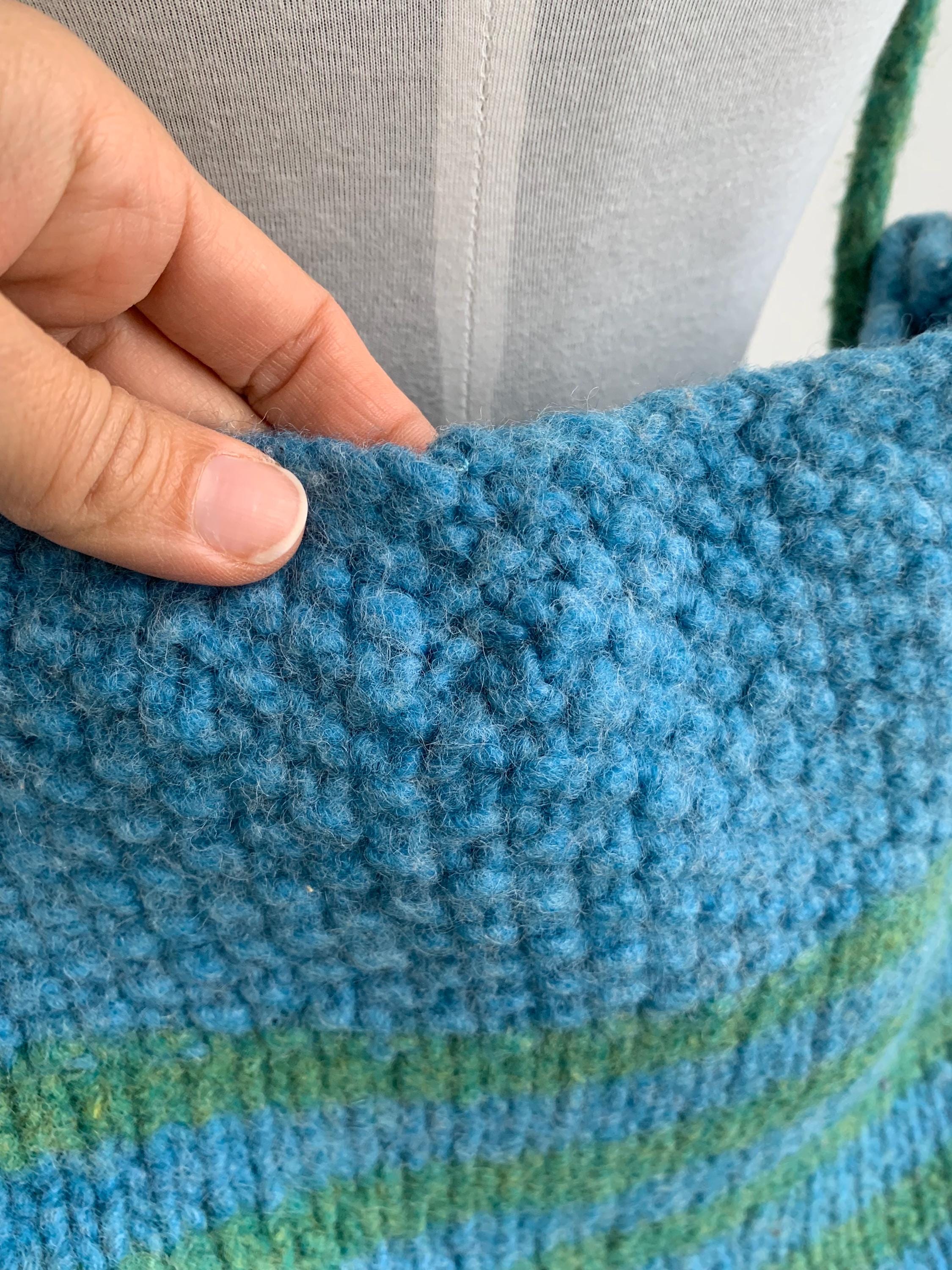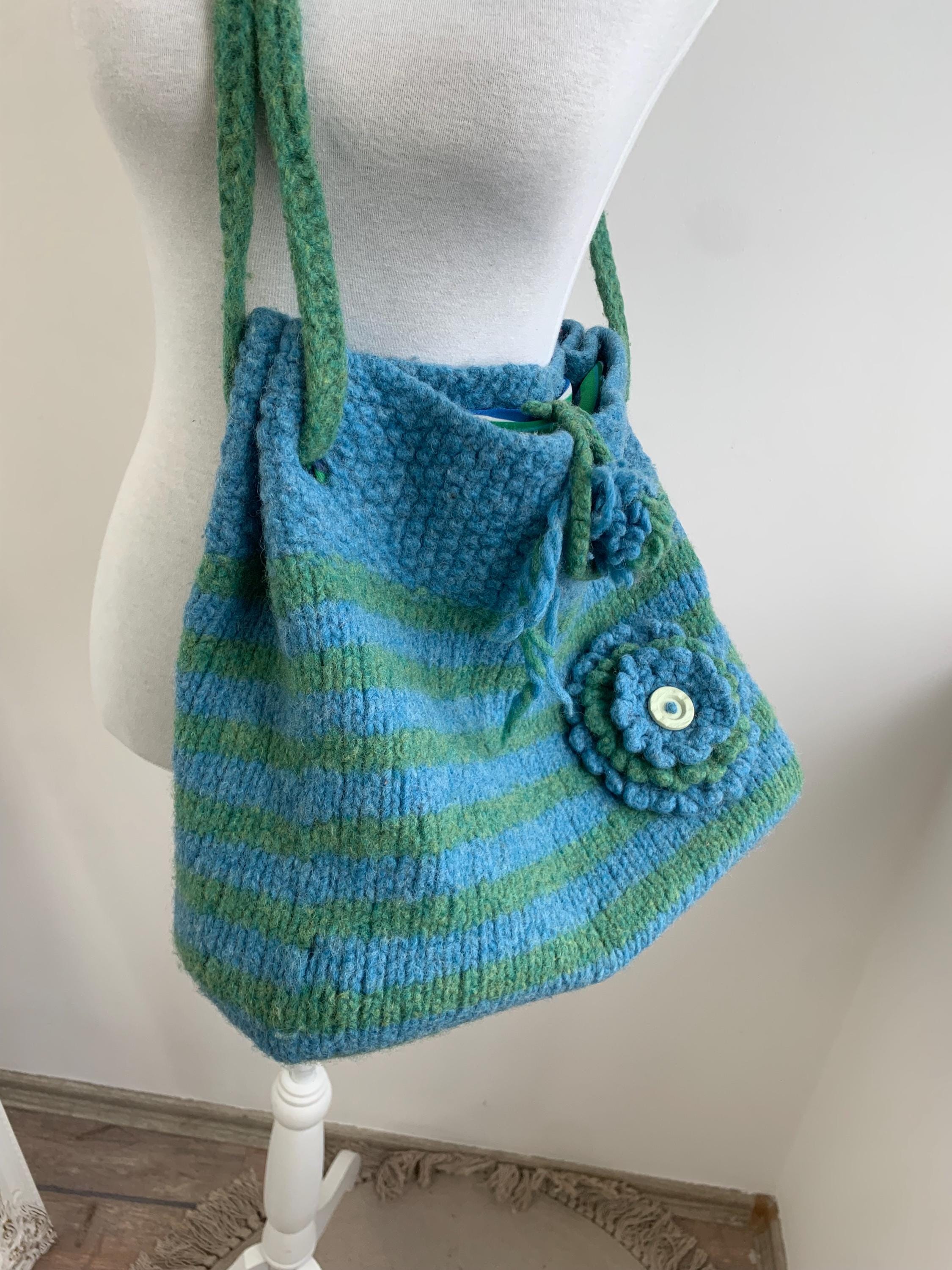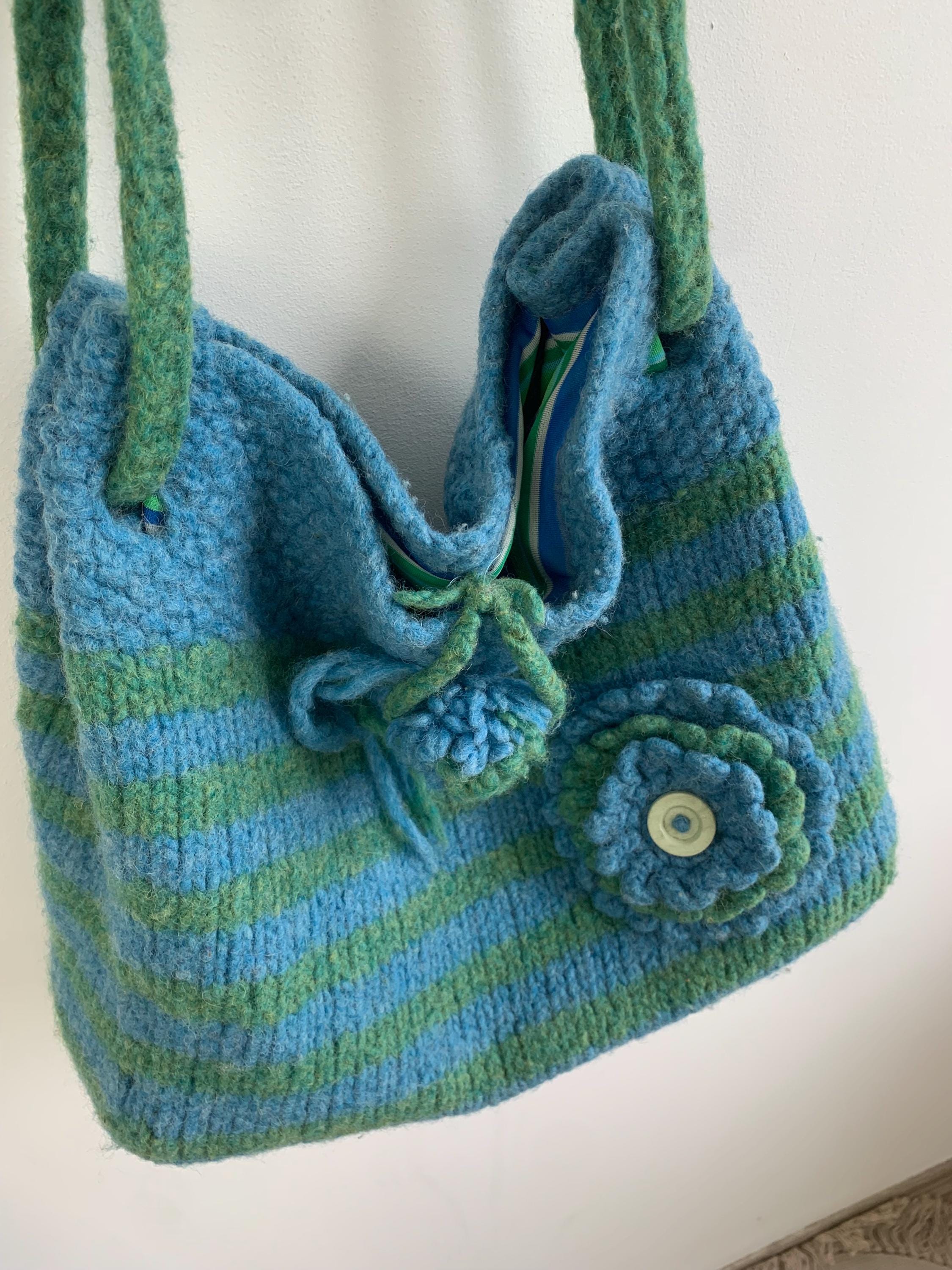 Expertly hand-knitted from thick wool yarn and then felted for an incredibly soft yet sturdy finish, this large boho shoulder bag has a wonderful, slouchy silhouette. The rich blue green color palette makes it a versatile companion for any season. The drawstring closure allows the top to cinch beautifully, creating the classic hobo shape while keeping your belongings secure. Use it as a large felted tote bag for your everyday essentials, a stylish wool project bag for knitting or crafting, or simply as a statement vintage knit purse that celebrates artisanal craftsmanship. It's an exceptional, high-quality accessory ready to become your favorite go-to bag.