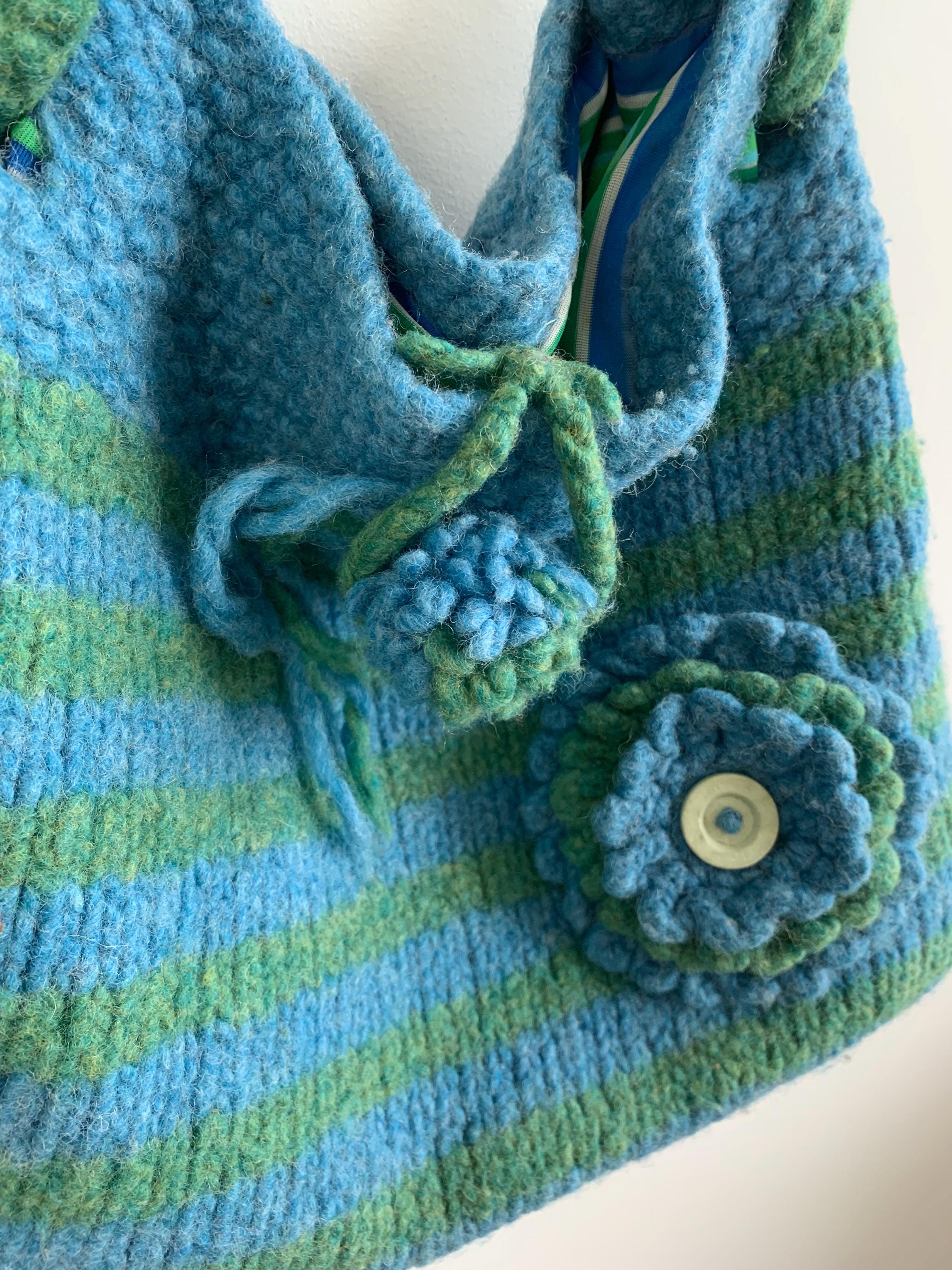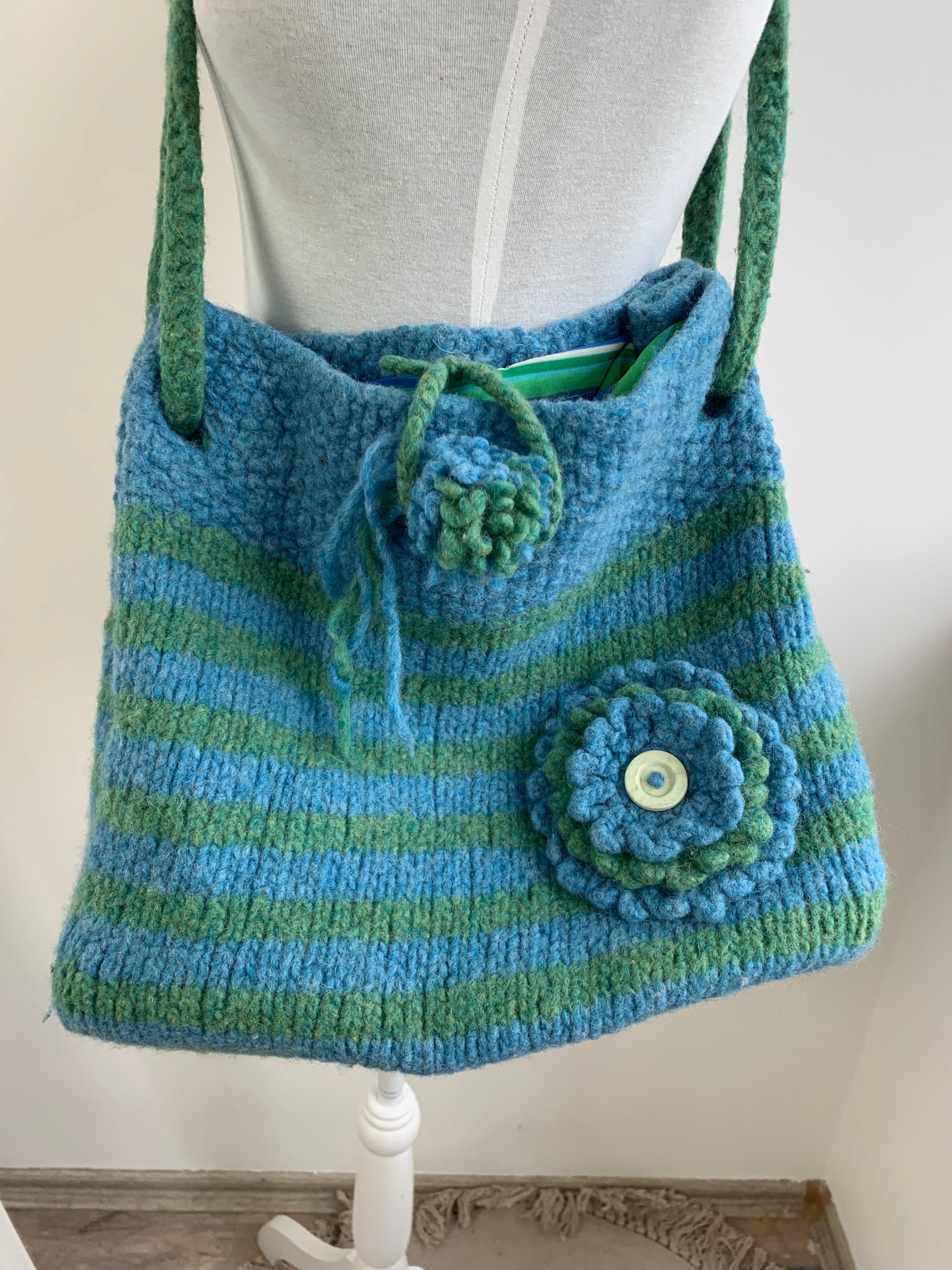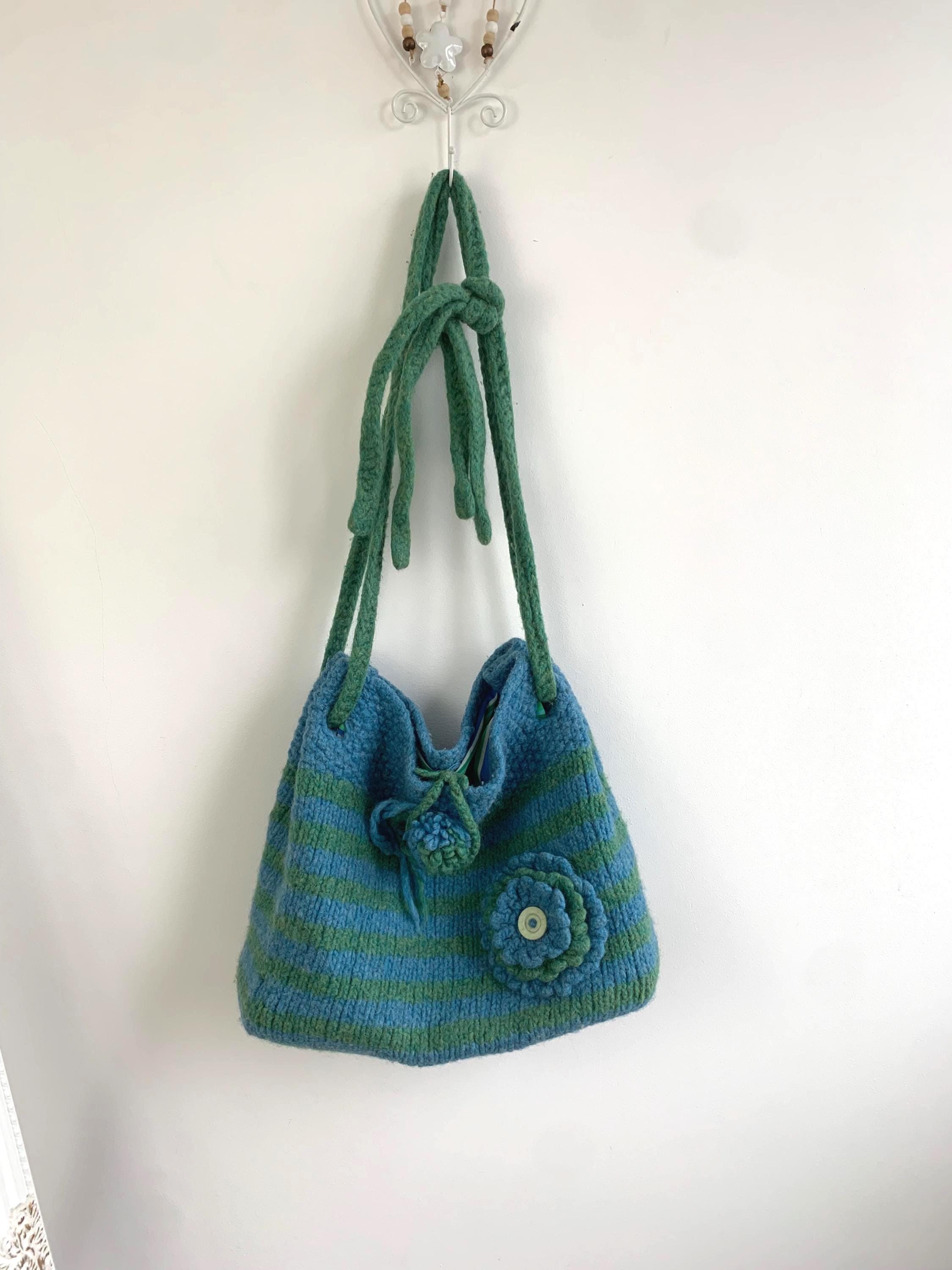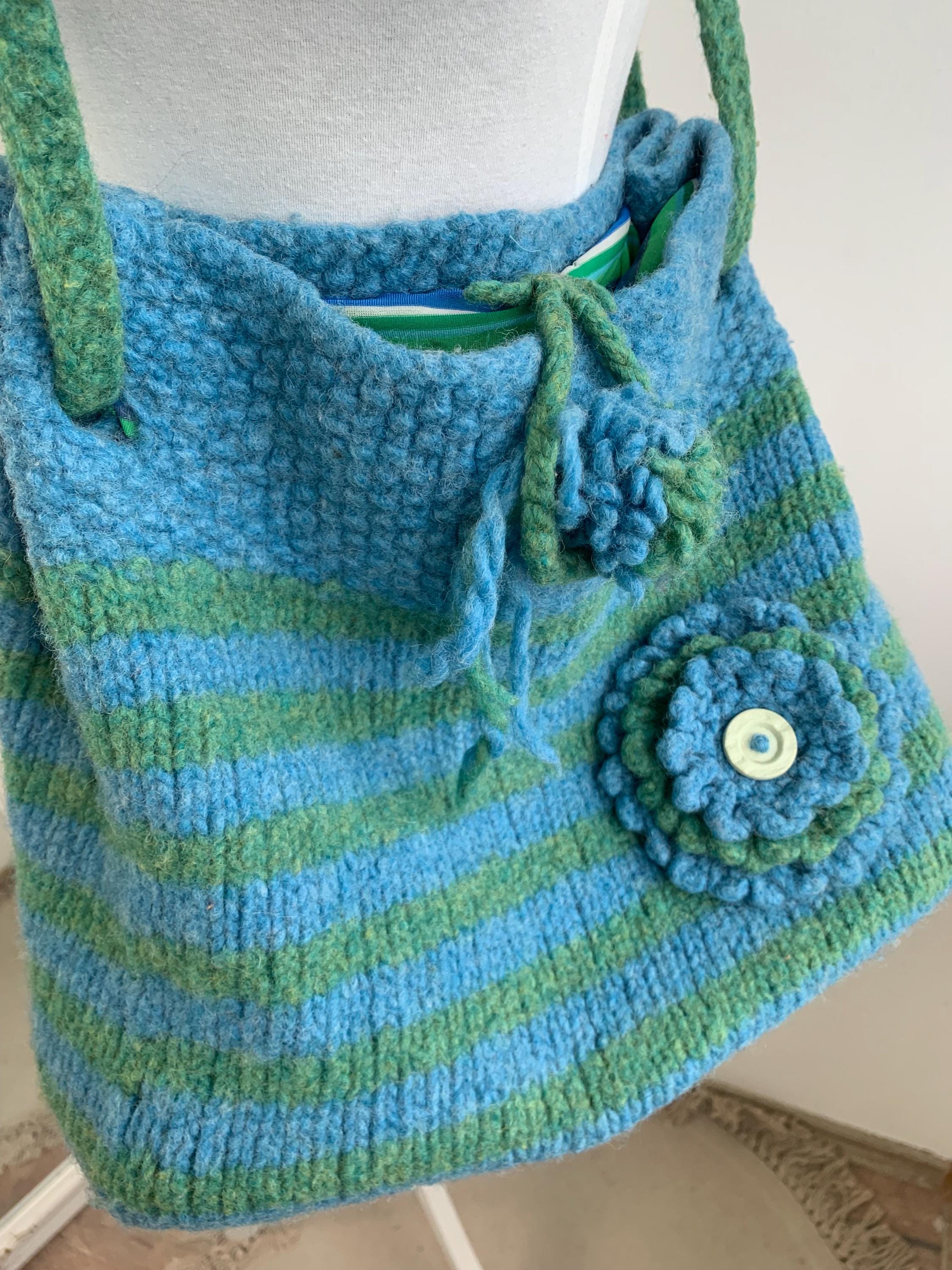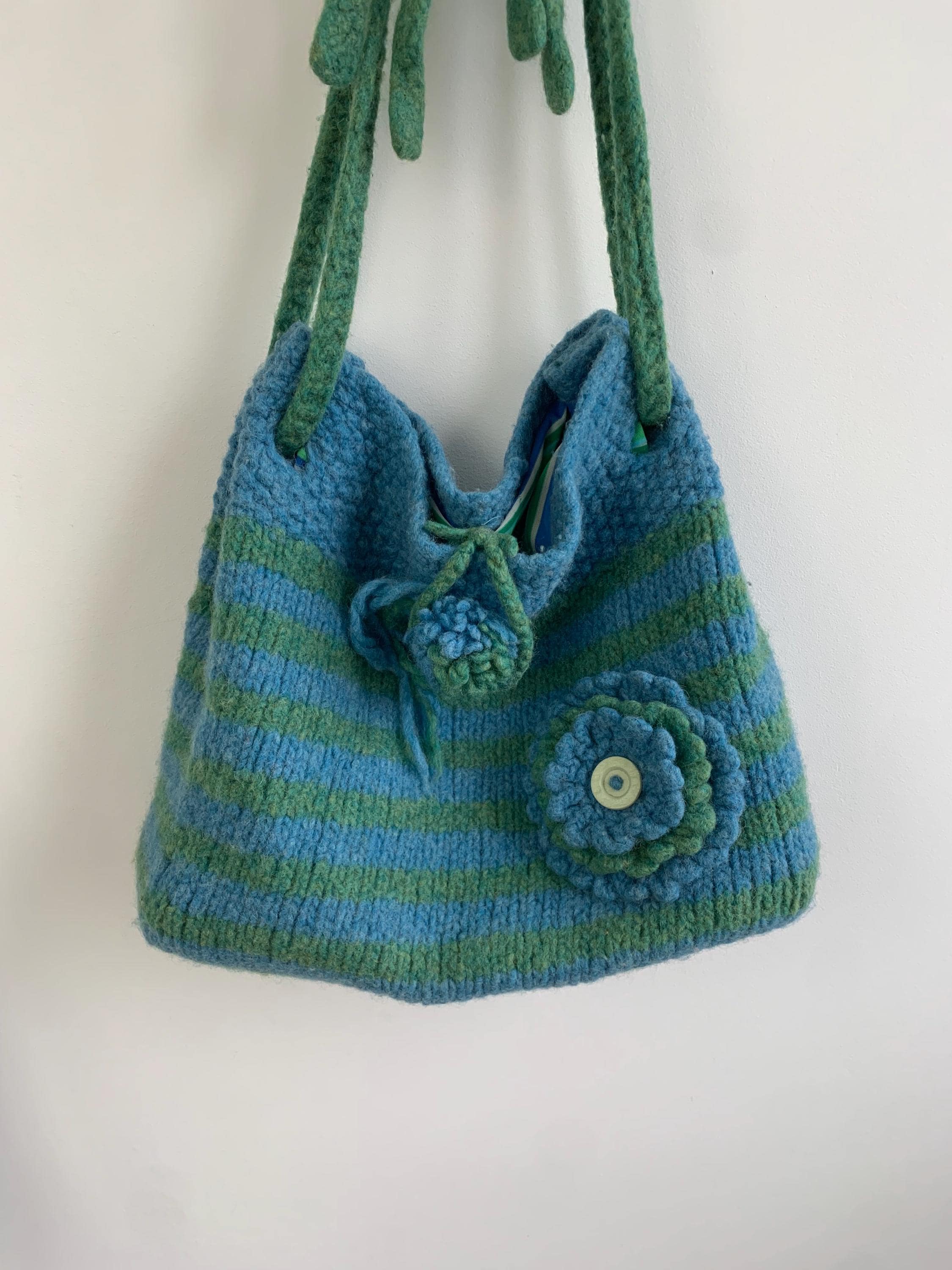 Expertly hand-knitted from thick wool yarn and then felted for an incredibly soft yet sturdy finish, this large boho shoulder bag has a wonderful, slouchy silhouette. The rich blue green color palette makes it a versatile companion for any season. The drawstring closure allows the top to cinch beautifully, creating the classic hobo shape while keeping your belongings secure. Use it as a large felted tote bag for your everyday essentials, a stylish wool project bag for knitting or crafting, or simply as a statement vintage knit purse that celebrates artisanal craftsmanship. It's an exceptional, high-quality accessory ready to become your favorite go-to bag.