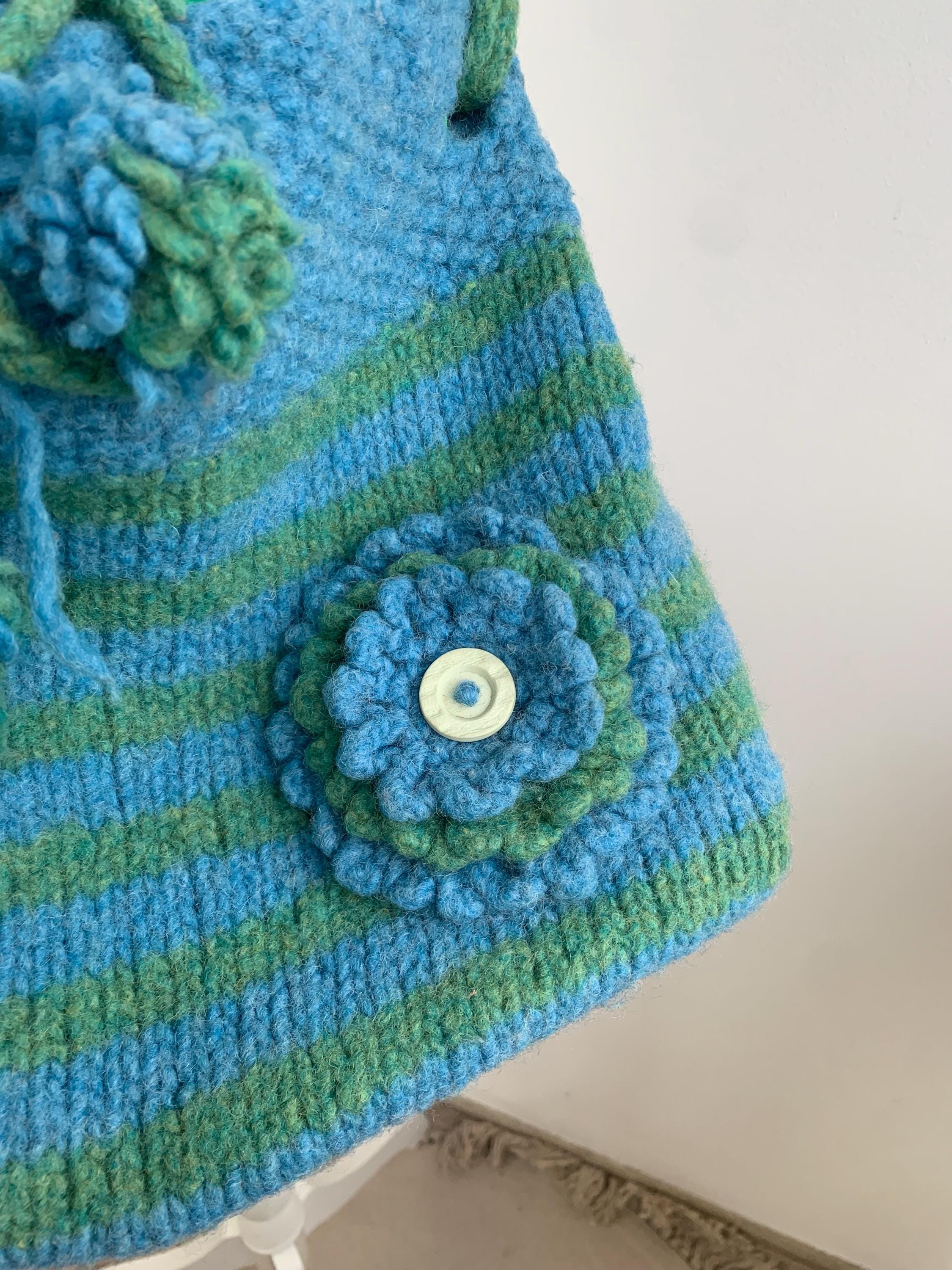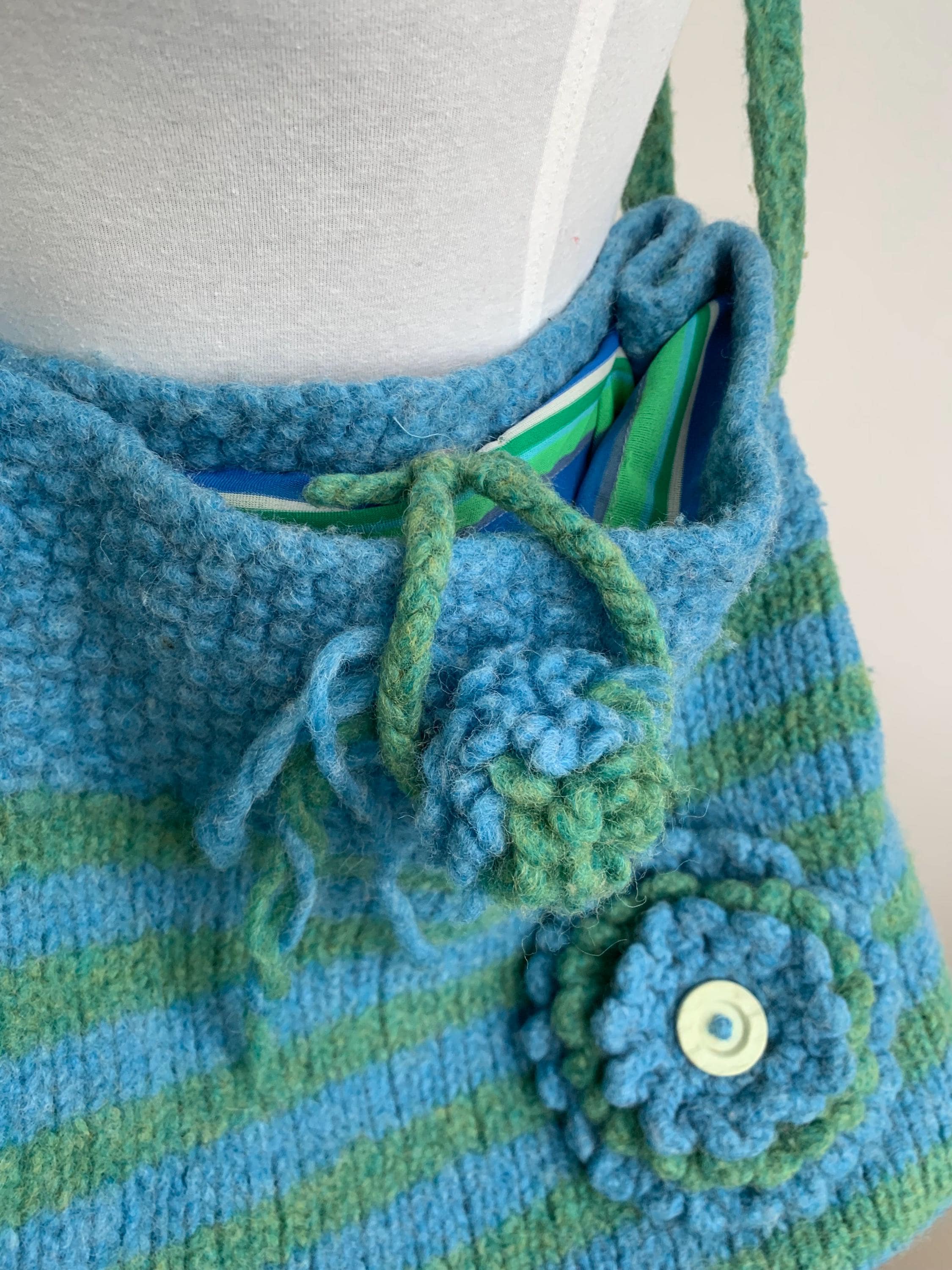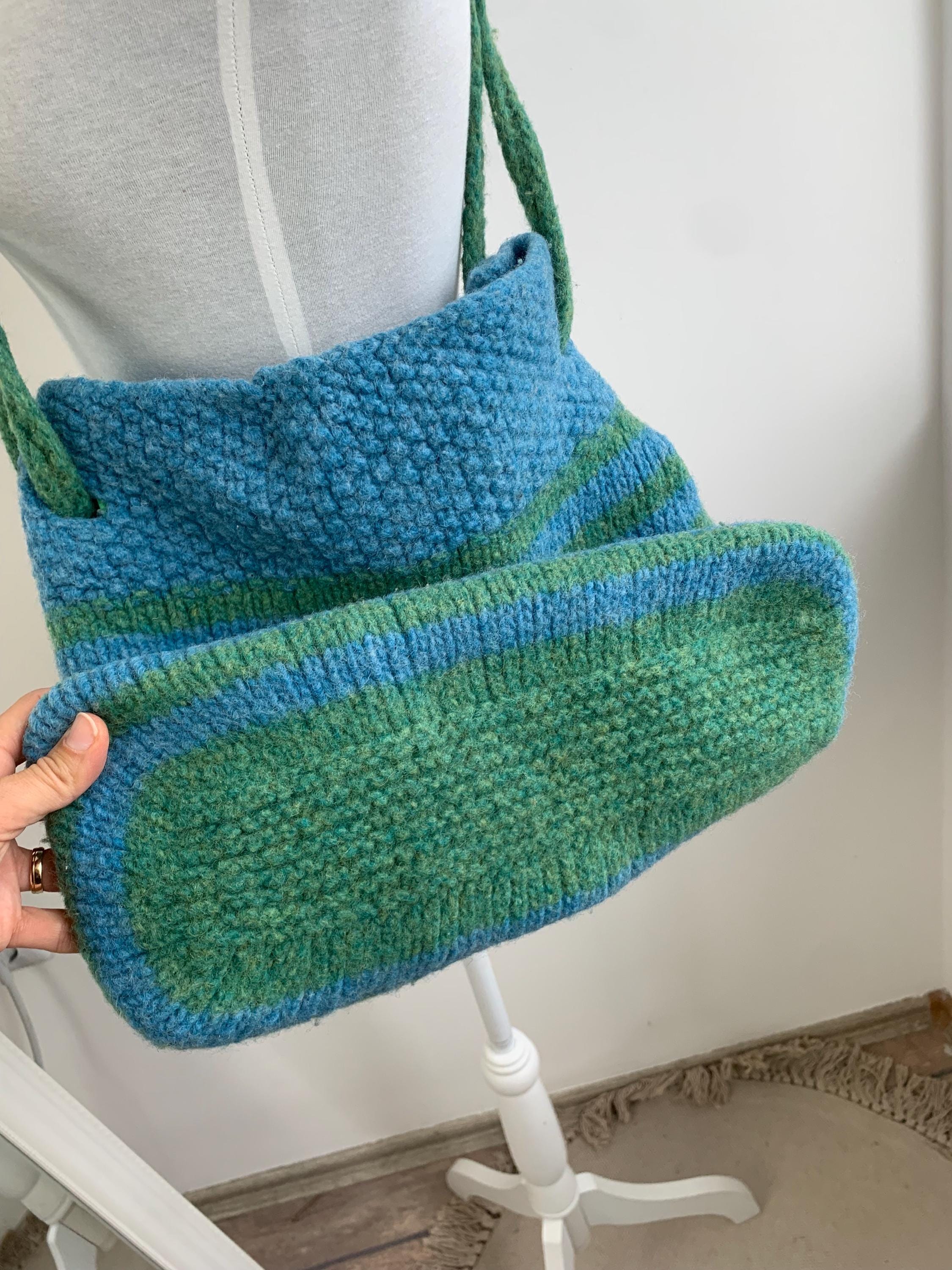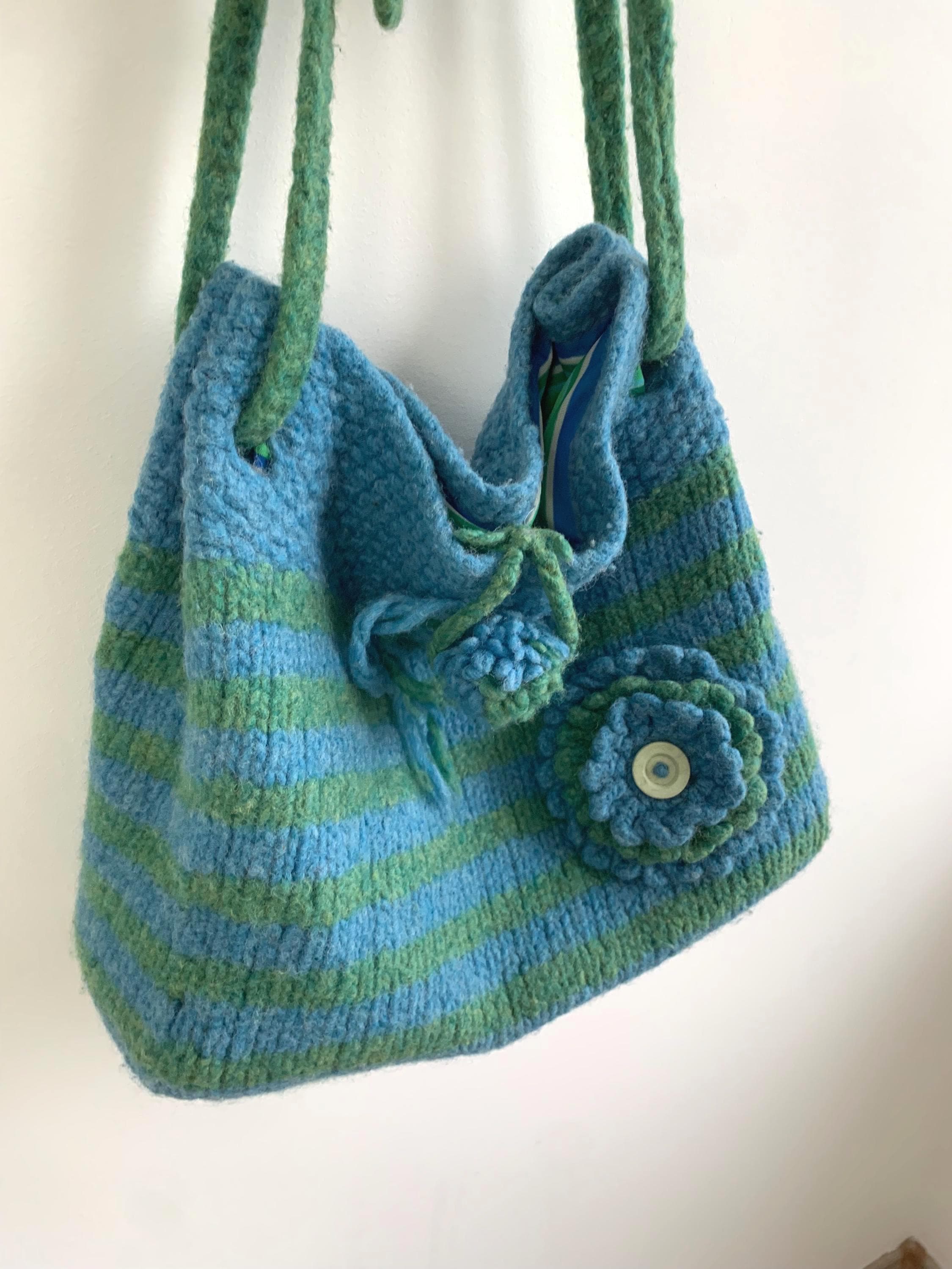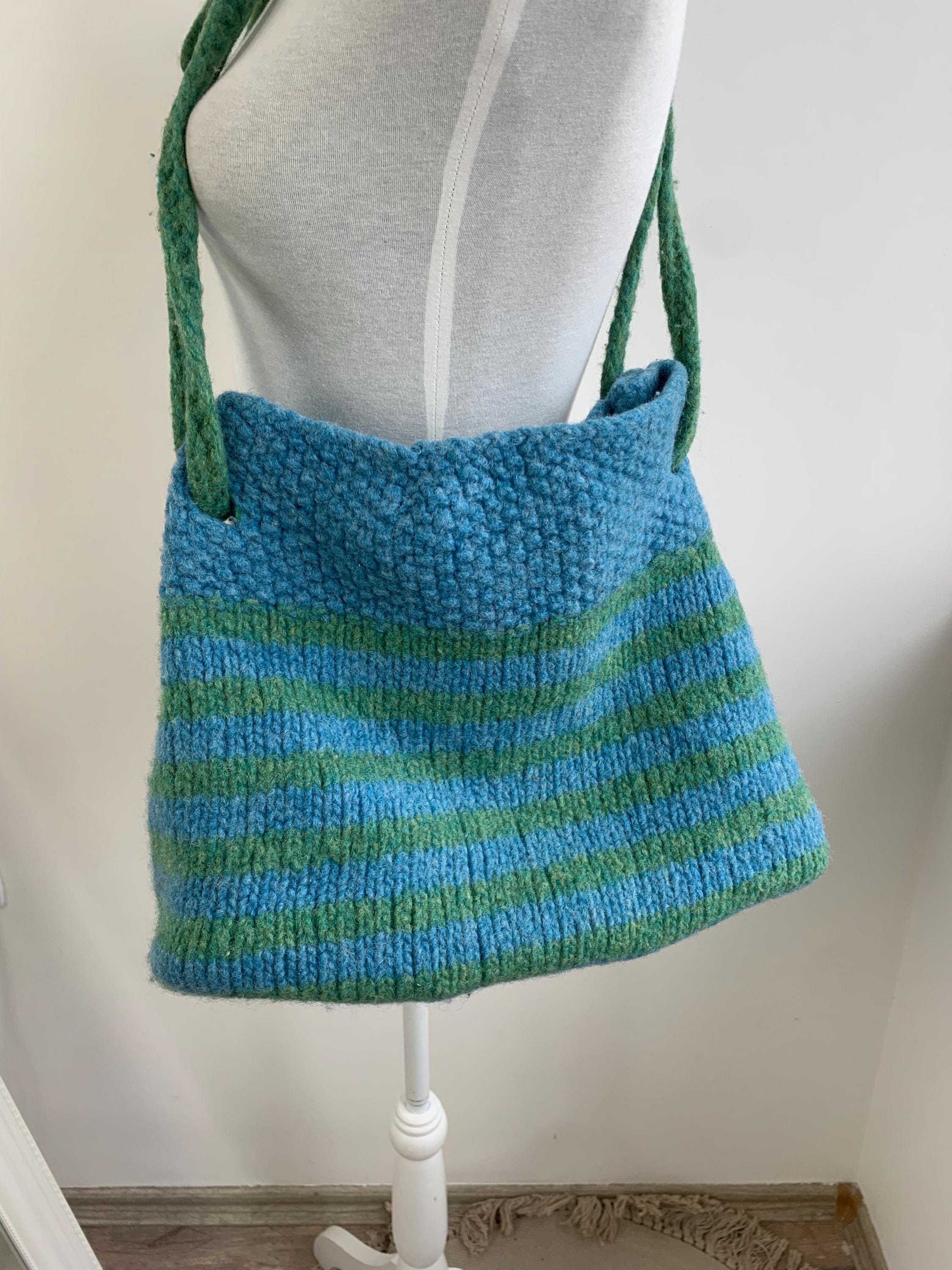 Expertly hand-knitted from thick wool yarn and then felted for an incredibly soft yet sturdy finish, this large boho shoulder bag has a wonderful, slouchy silhouette. The rich blue green color palette makes it a versatile companion for any season. The drawstring closure allows the top to cinch beautifully, creating the classic hobo shape while keeping your belongings secure. Use it as a large felted tote bag for your everyday essentials, a stylish wool project bag for knitting or crafting, or simply as a statement vintage knit purse that celebrates artisanal craftsmanship. It's an exceptional, high-quality accessory ready to become your favorite go-to bag.