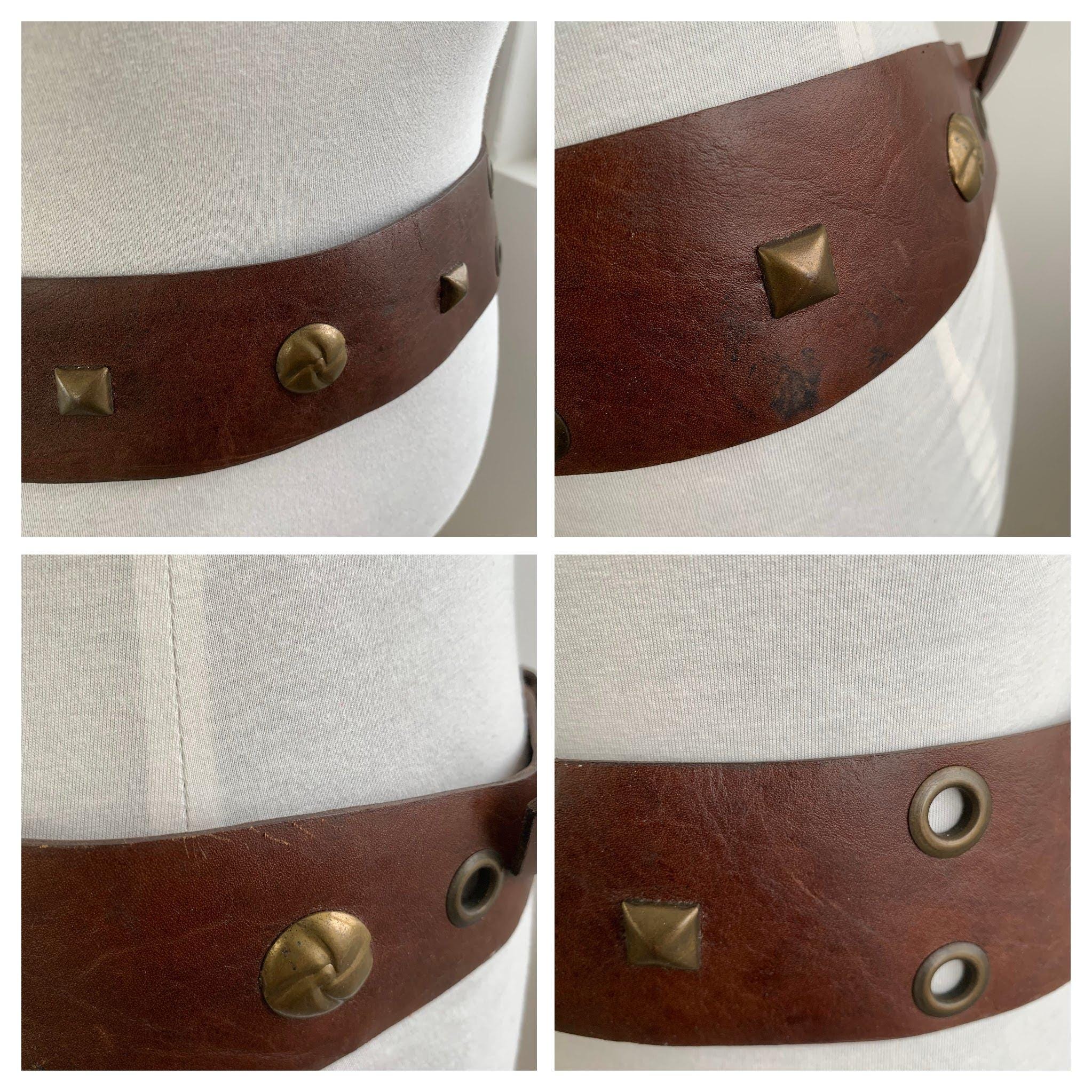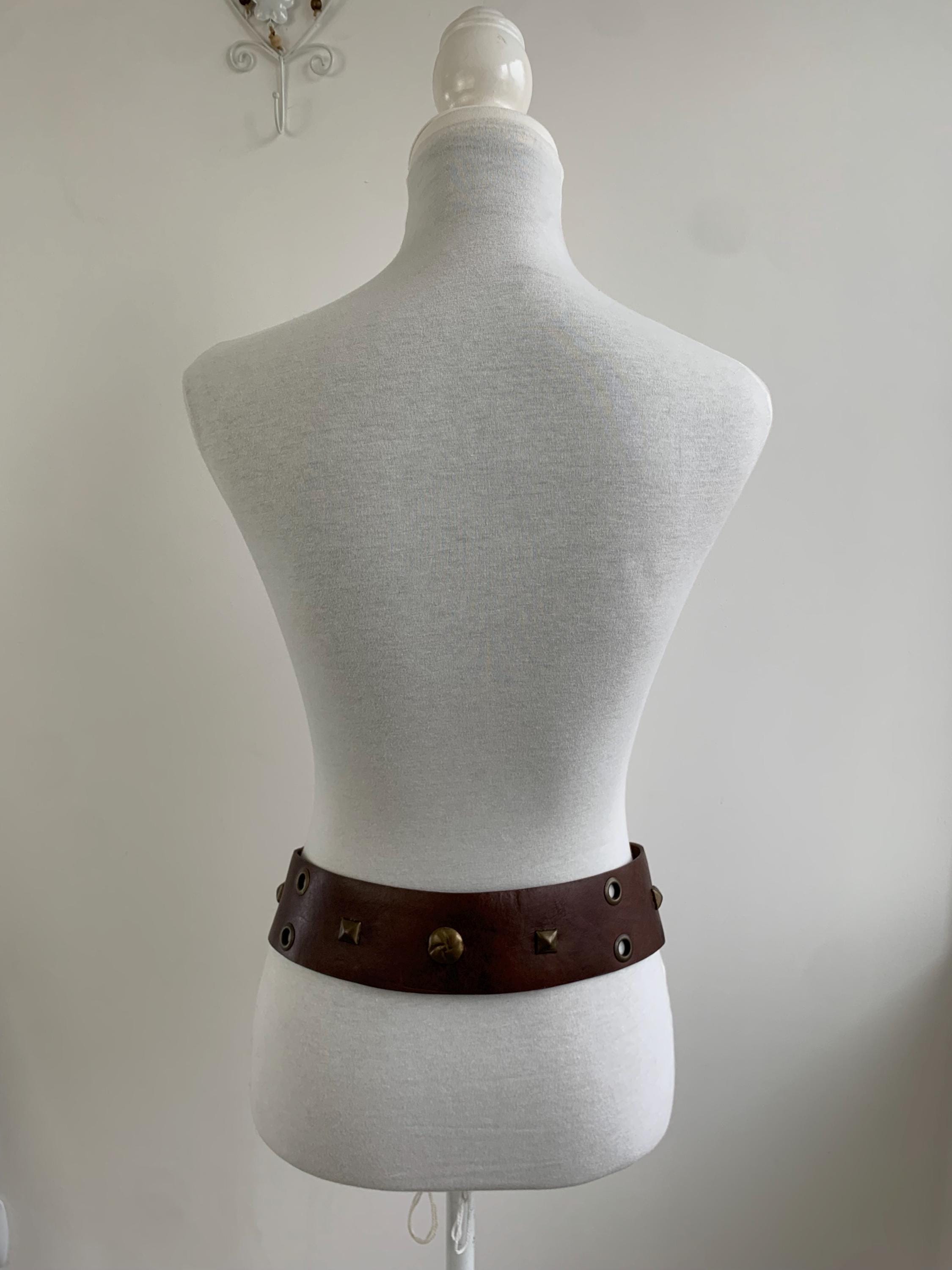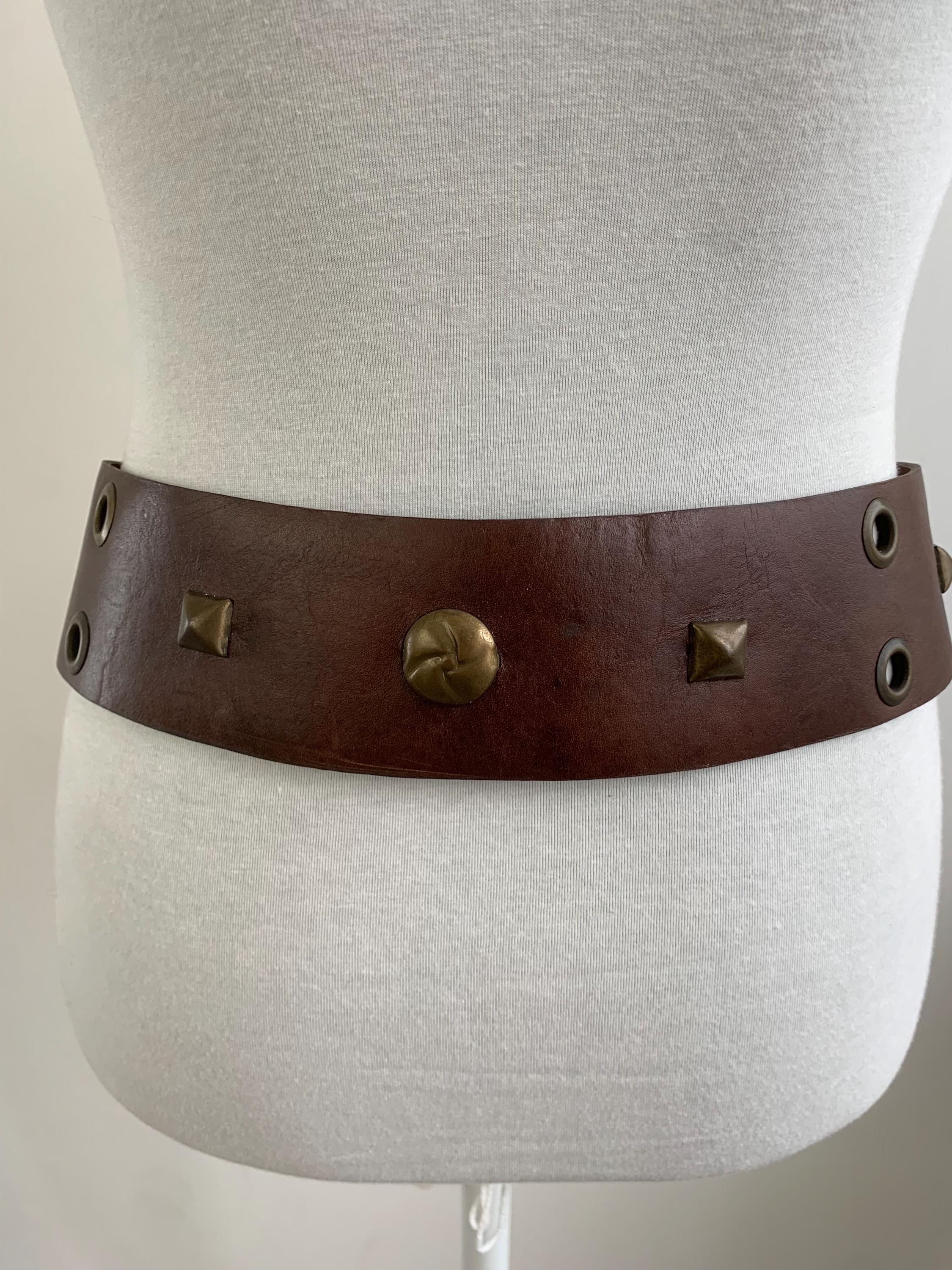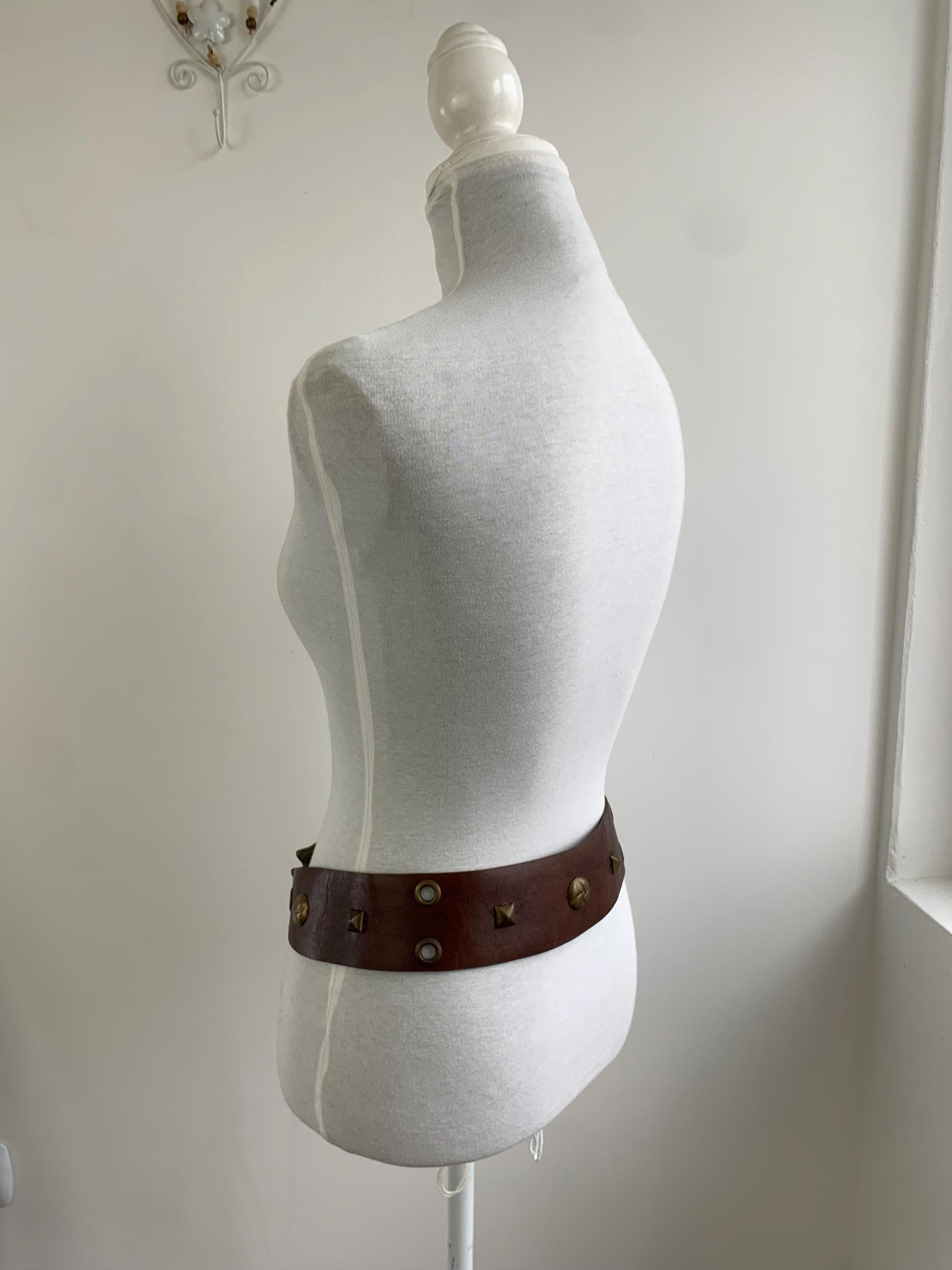 The belt strap is made from genuine, thick brown leather upper with faux leather lining and is heavily embellished with a repeated pattern of brass studs, adding texture and edge. The belt has an adjustable strap on the side, allowing you to wear it at the hip or cinch a coat or dress at the waist.