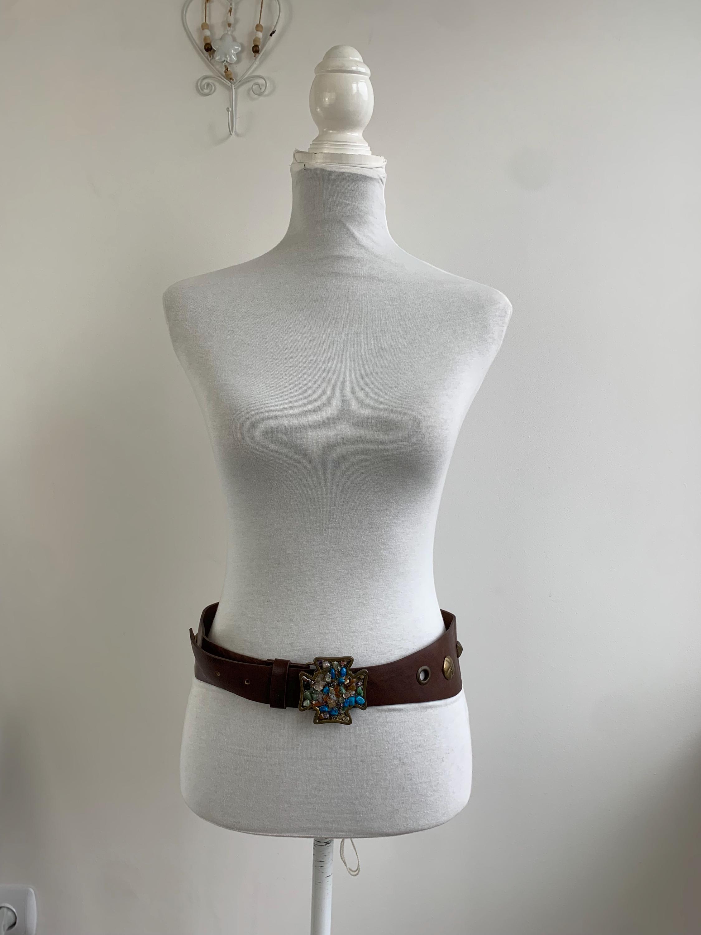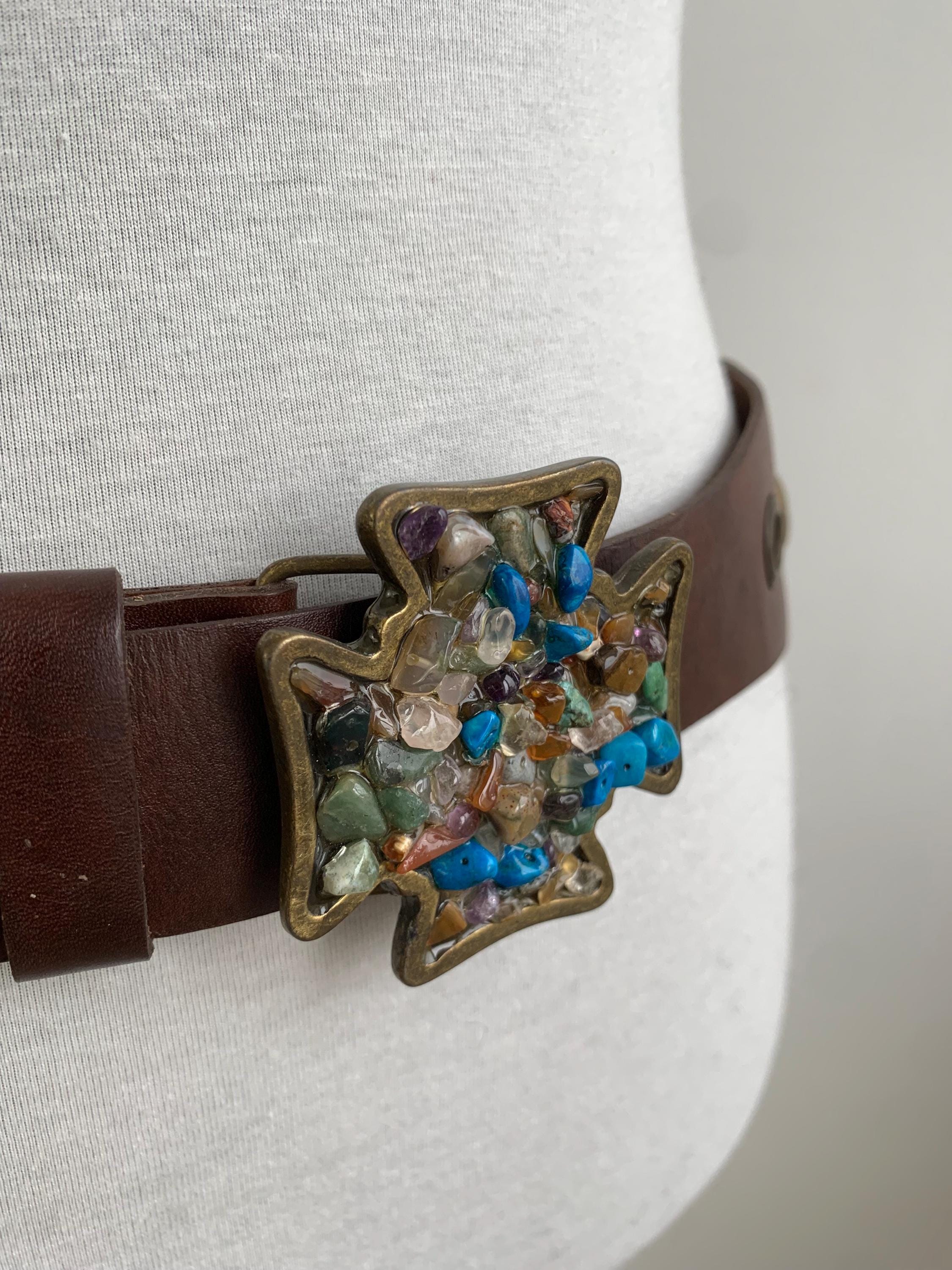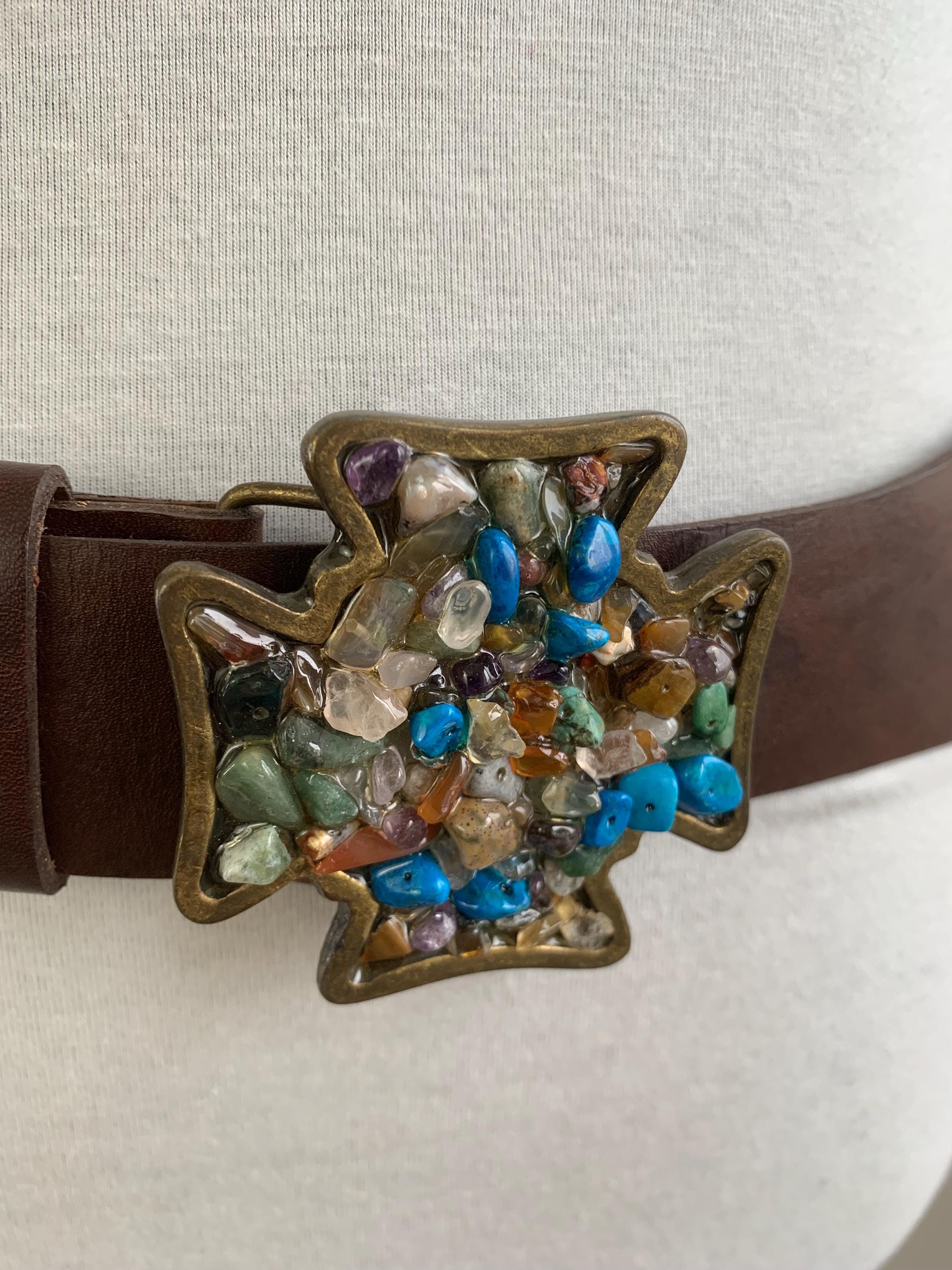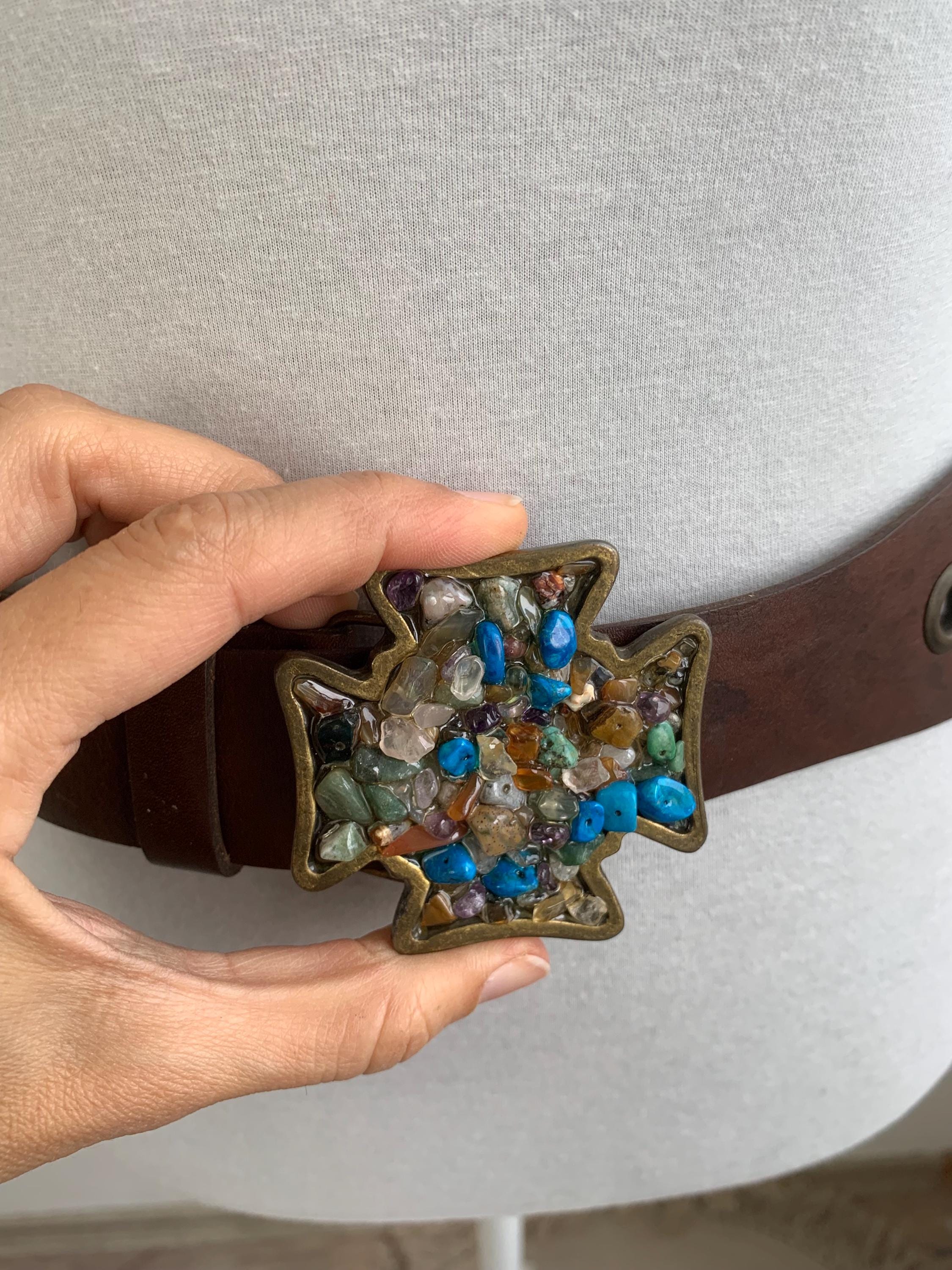 Make an immediate statement with this incredible vintage brown leather belt! This unique accessory is defined by its massive, eye-catching cross belt buckle, which features an intricate, colorful gemstone mosaic design. The buckle is chunky, substantial, and truly a piece of wearable art, giving off a bold Western, Southwestern, or even a subtle Gothic/Rocker vibe.