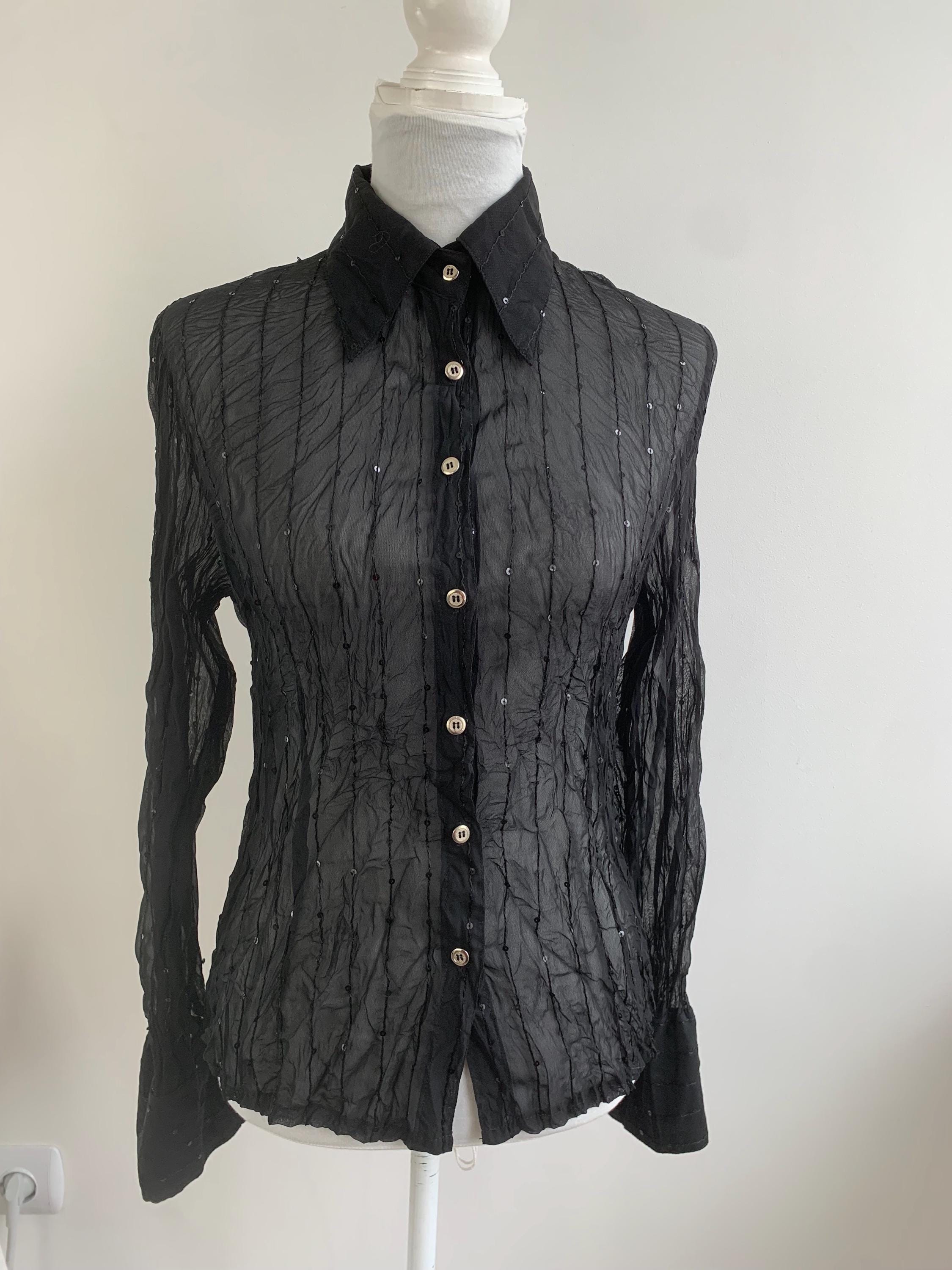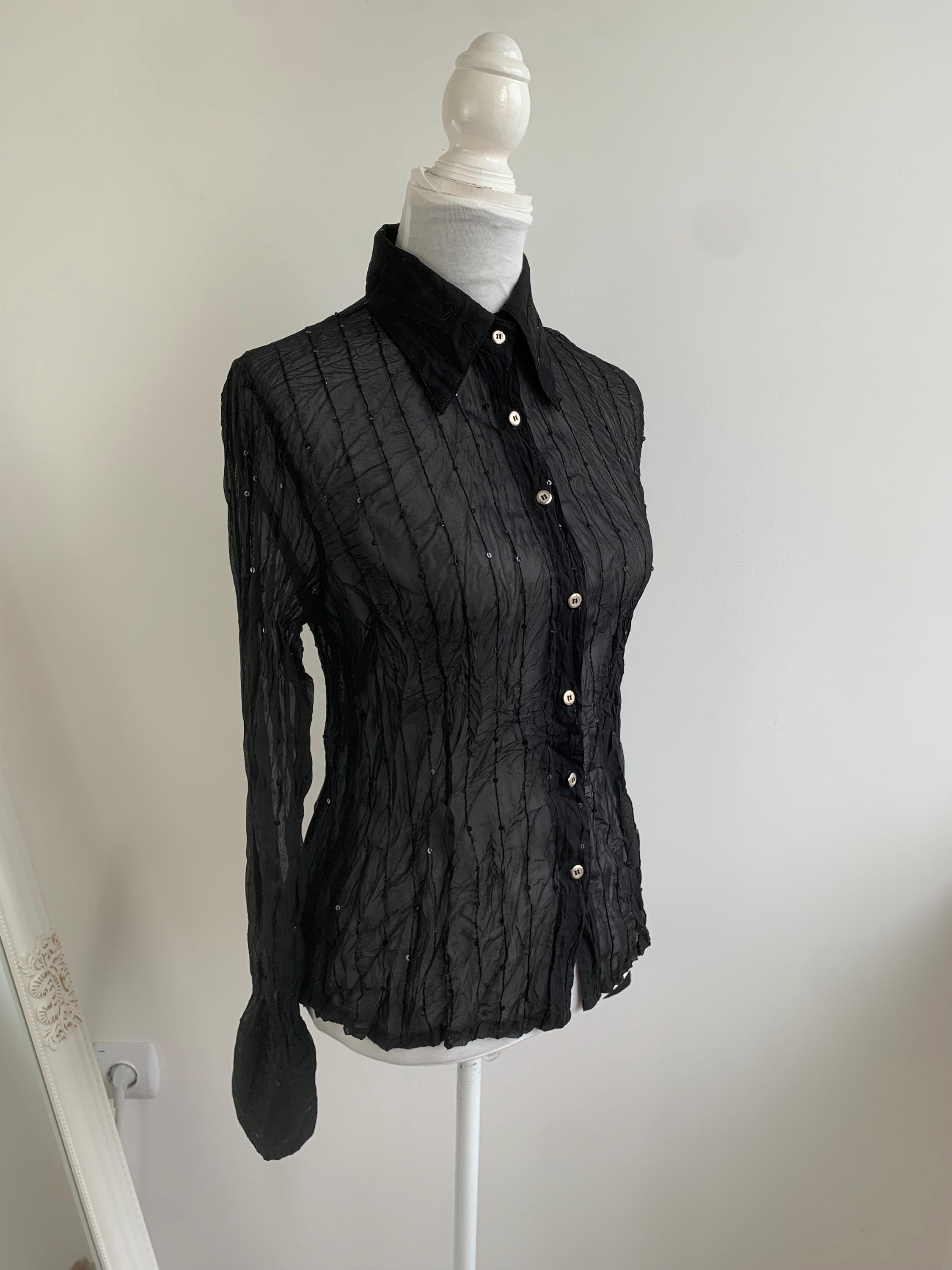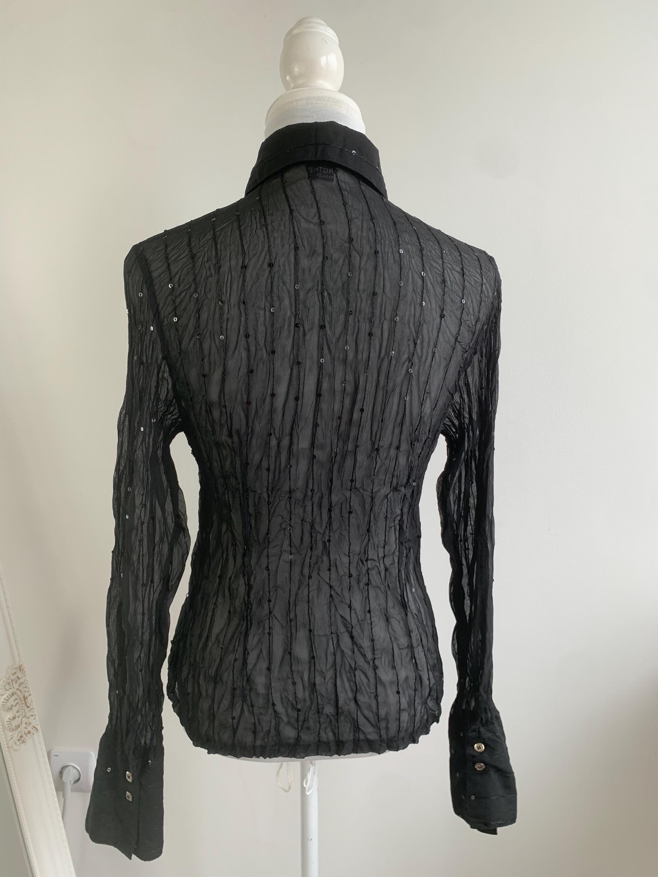 Step into the dramatic style of the late 90s and early Y2K era with this eye-catching vintage black sheer blouse. This isn't your average black top—it features an amazing crinkled texture across the entire body and sleeves, giving it a unique, edgy, and slightly rebellious look.