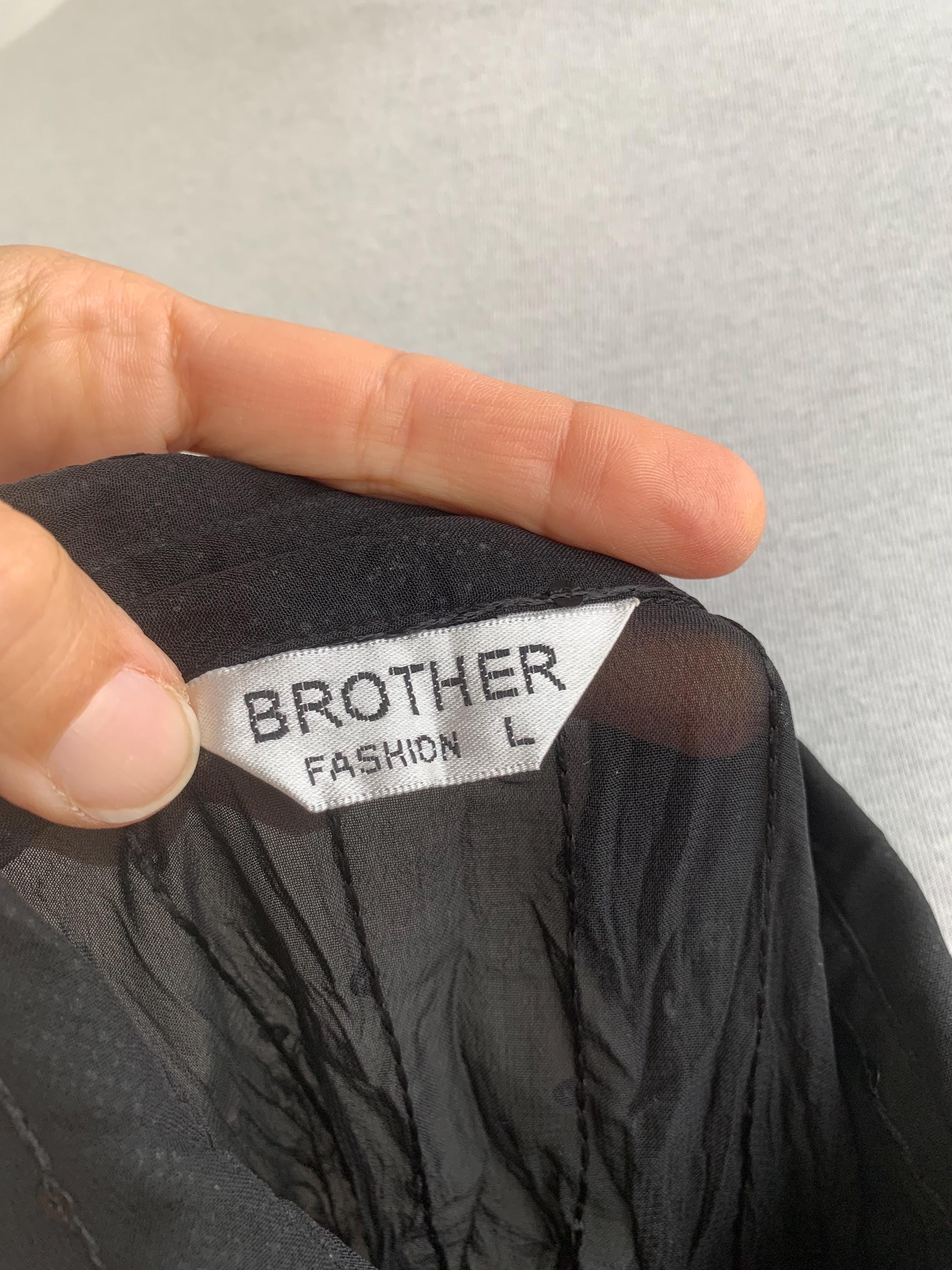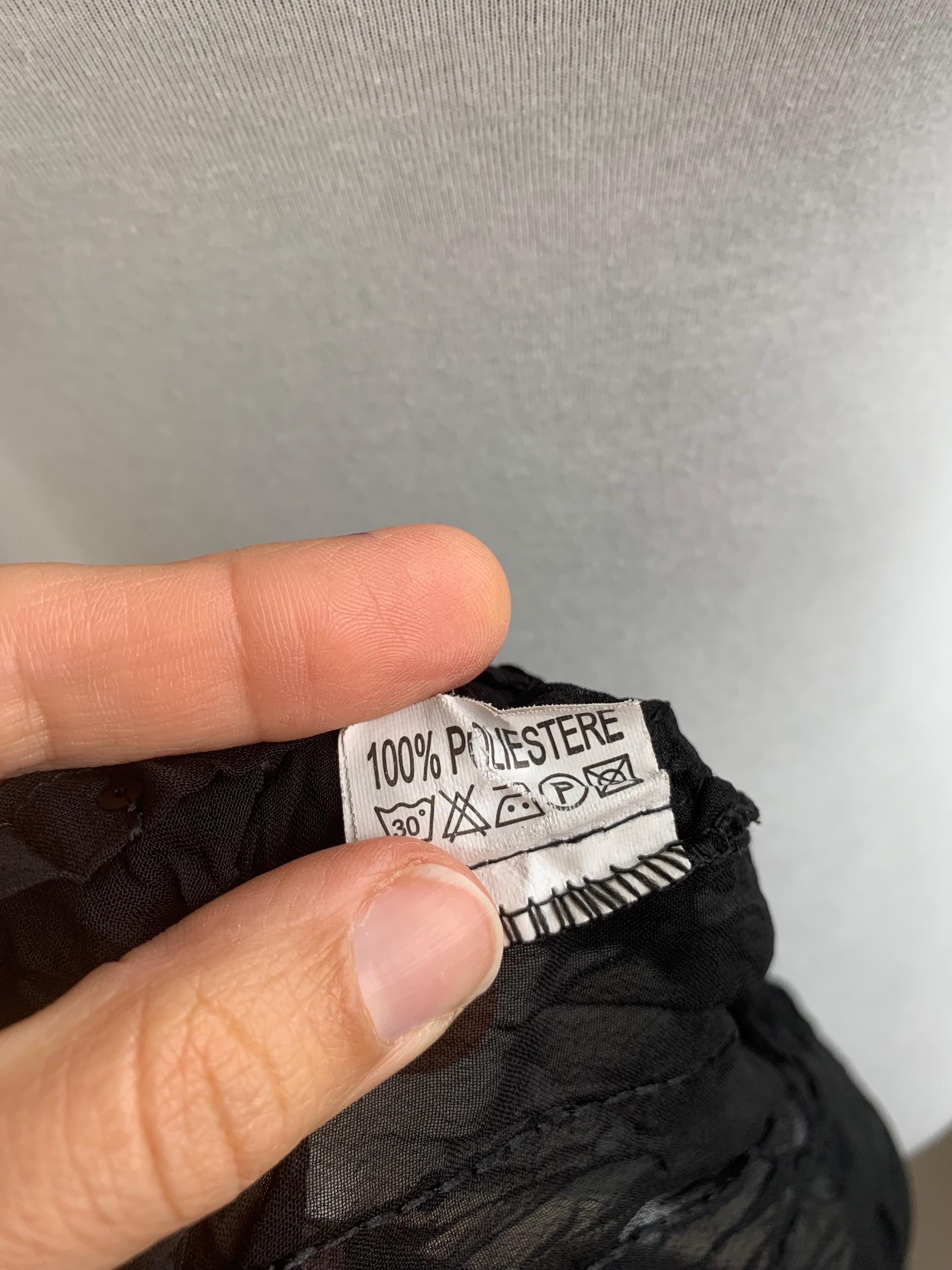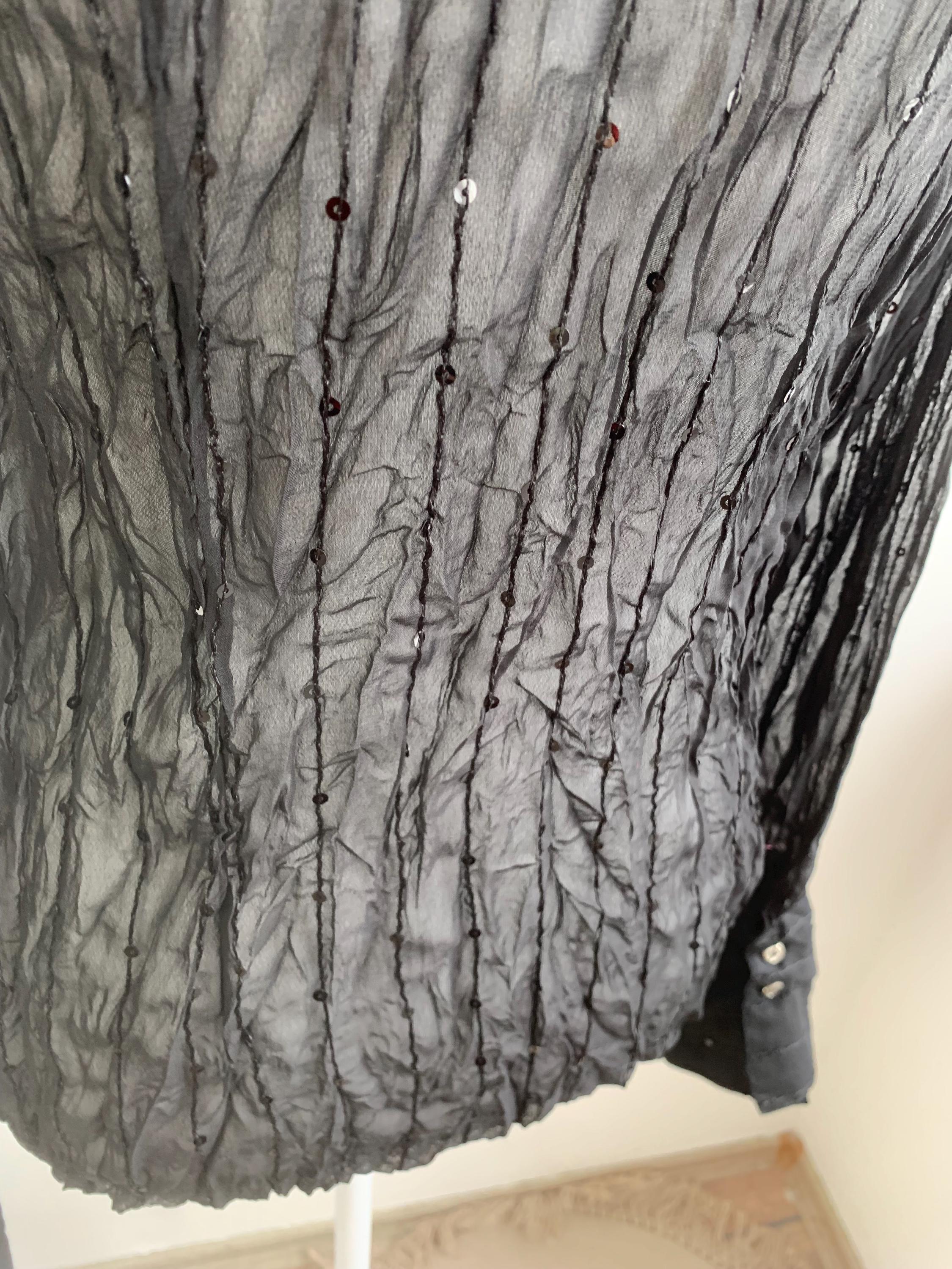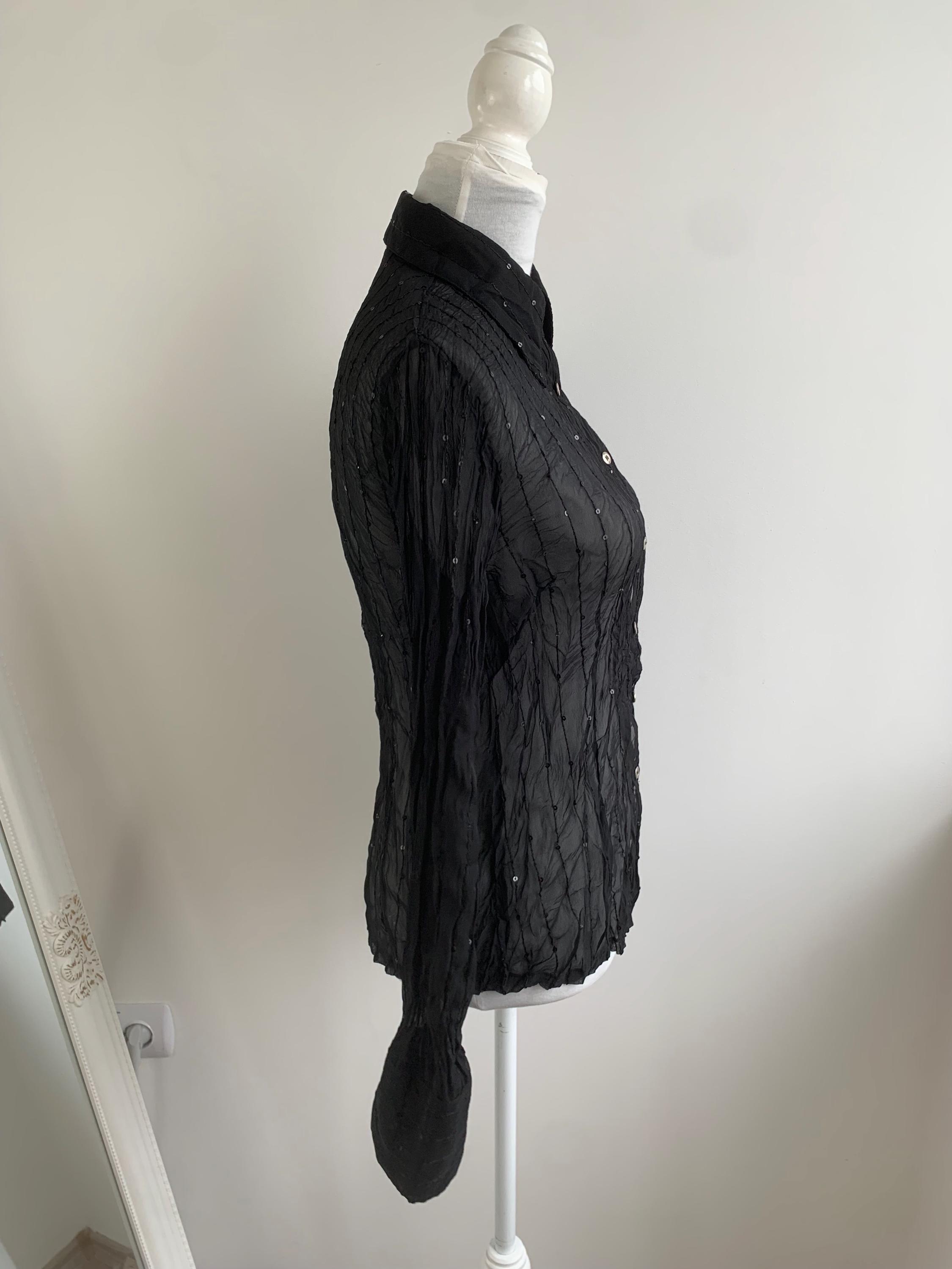 Step into the dramatic style of the late 90s and early Y2K era with this eye-catching vintage black sheer blouse. This isn't your average black top—it features an amazing crinkled texture across the entire body and sleeves, giving it a unique, edgy, and slightly rebellious look.