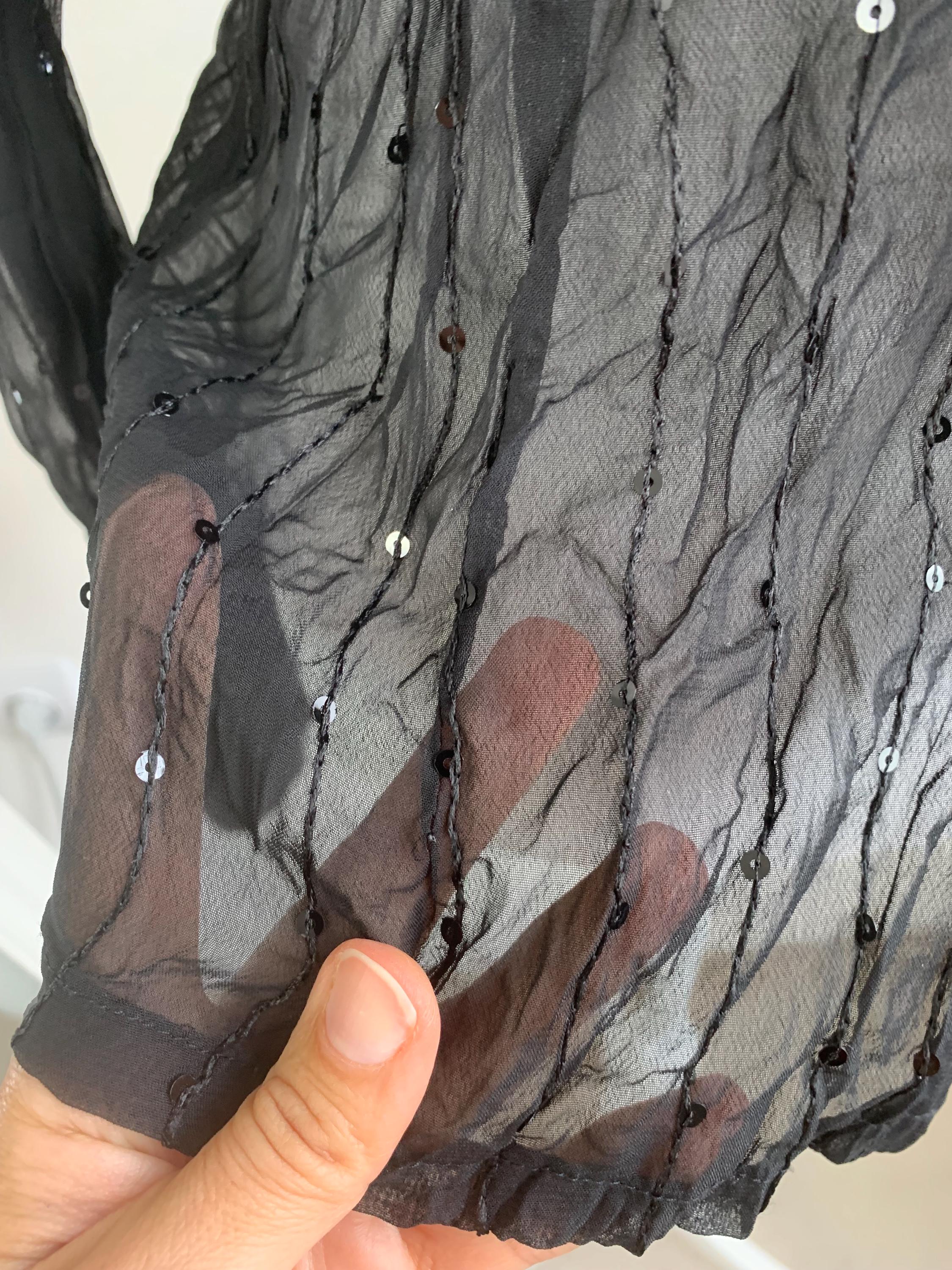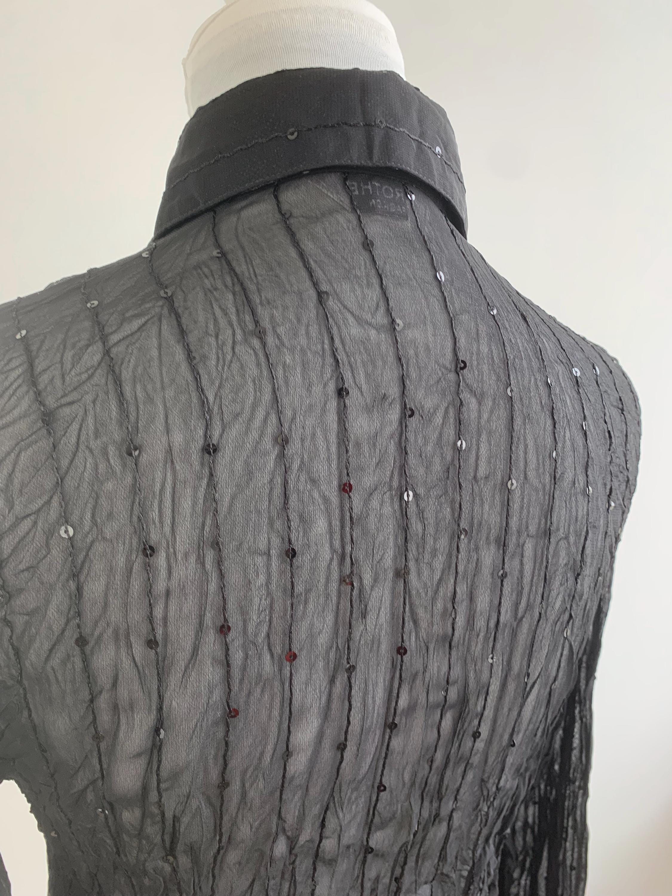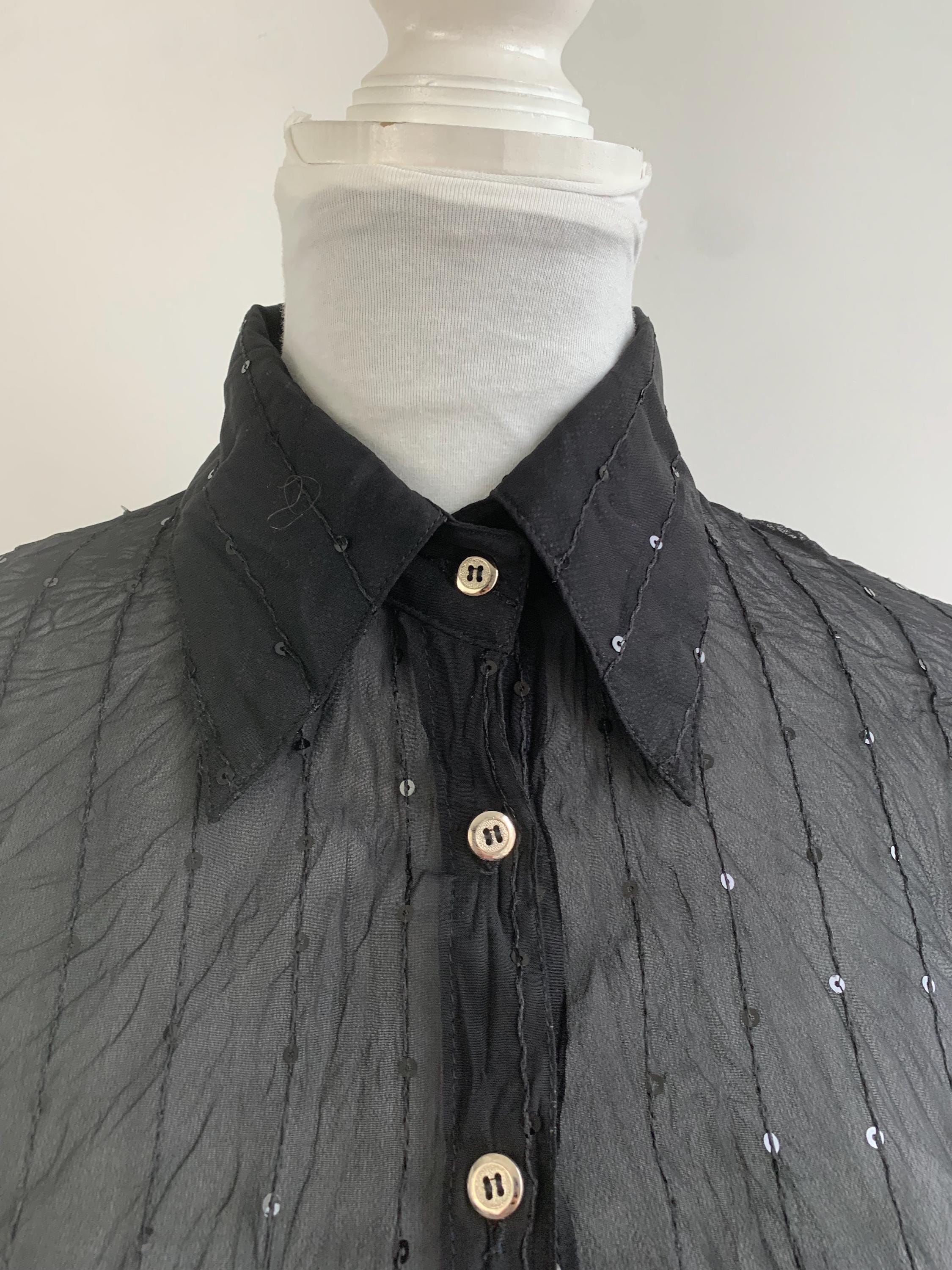 The lightweight, sheer fabric is adorned with delicate vertical rows of tiny, scattered shimmering black sequins, adding just the right amount of sparkle and grunge-glam flair. The blouse is designed in a classic button-up style with a pointed collar, making it versatile for both evening wear and layered casual looks. The smocking allows for comfortable stretch, hugging the body beautifully.